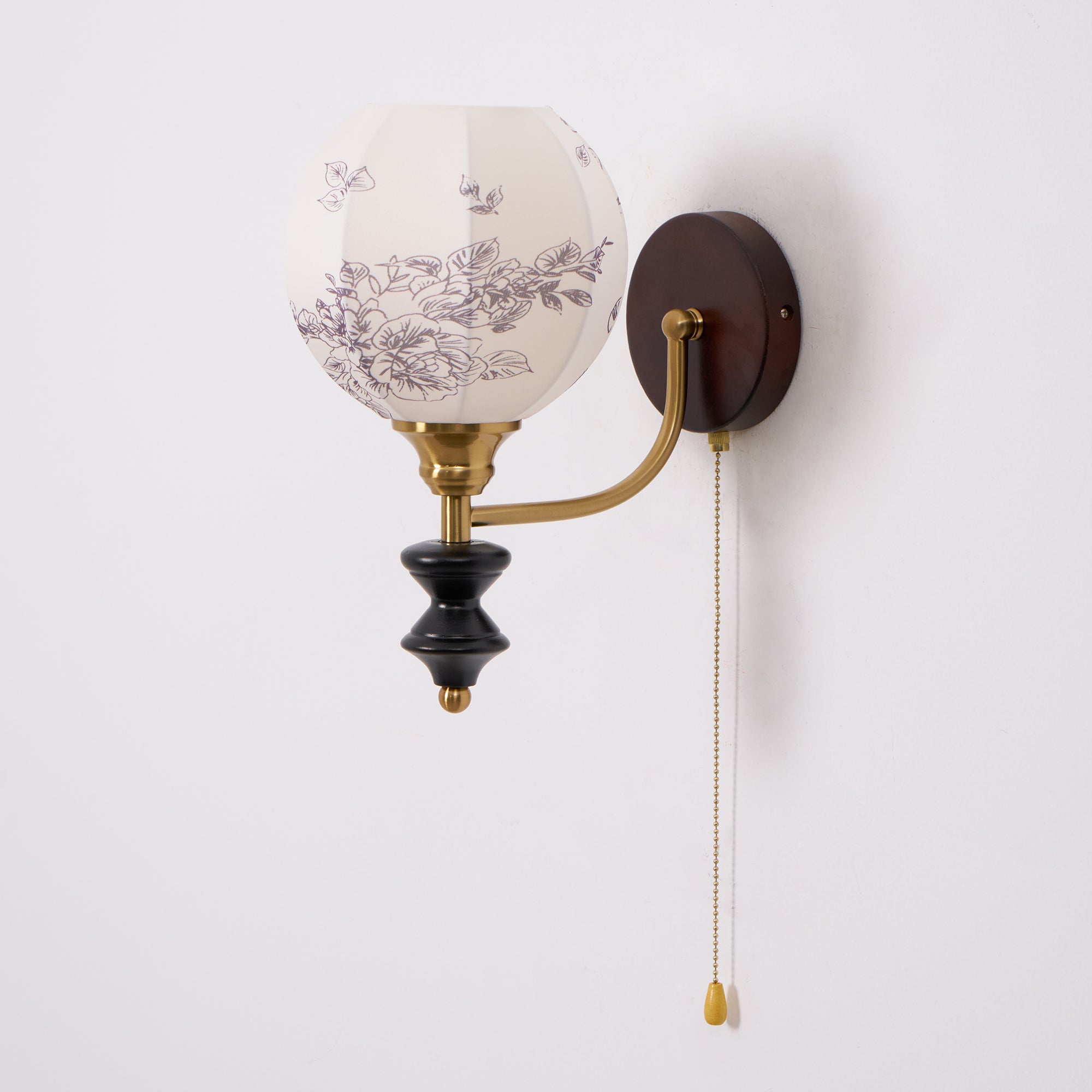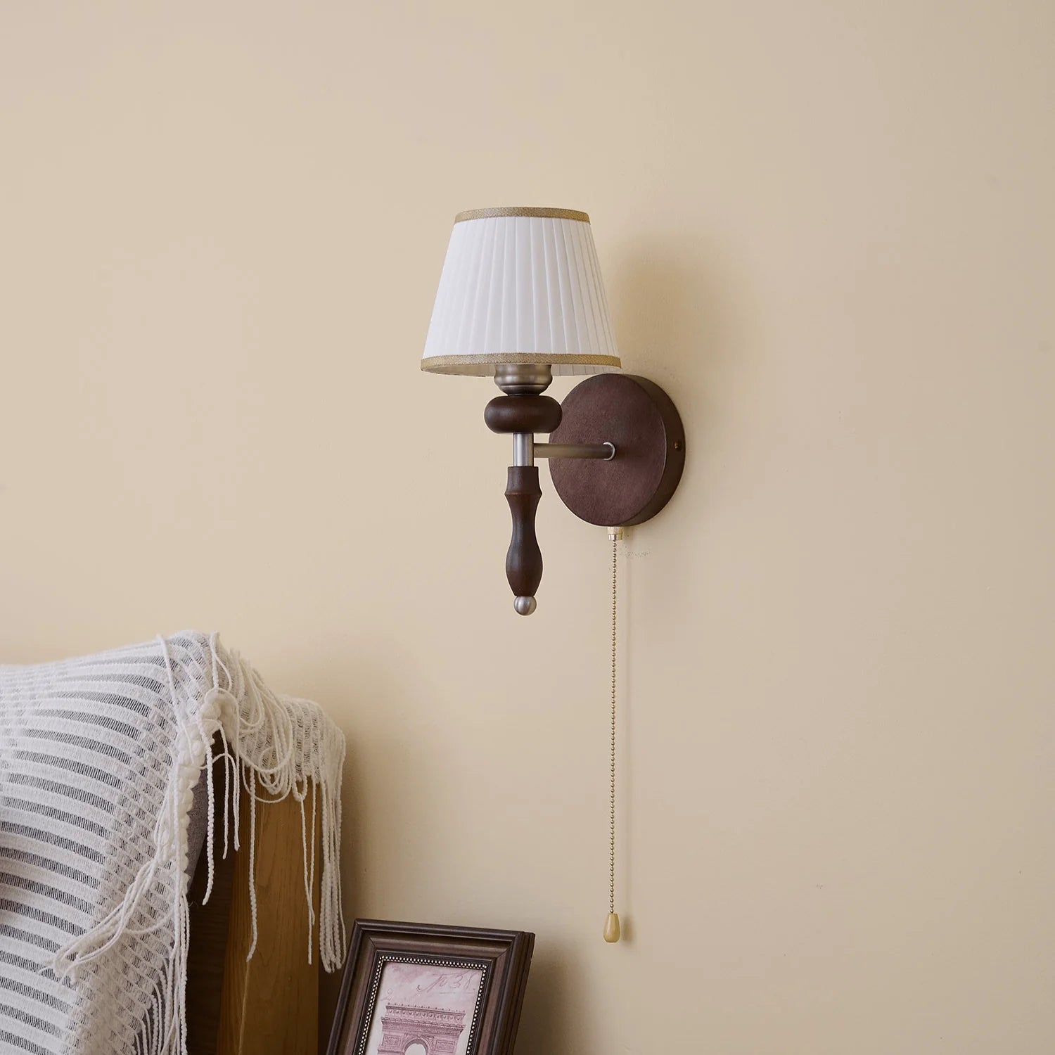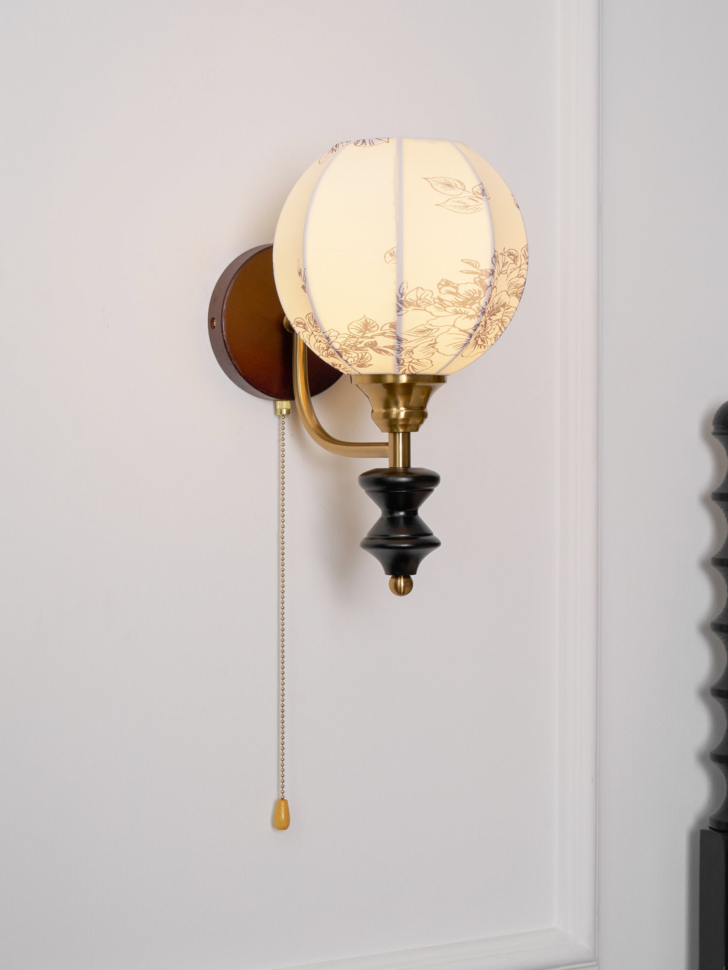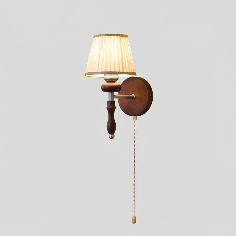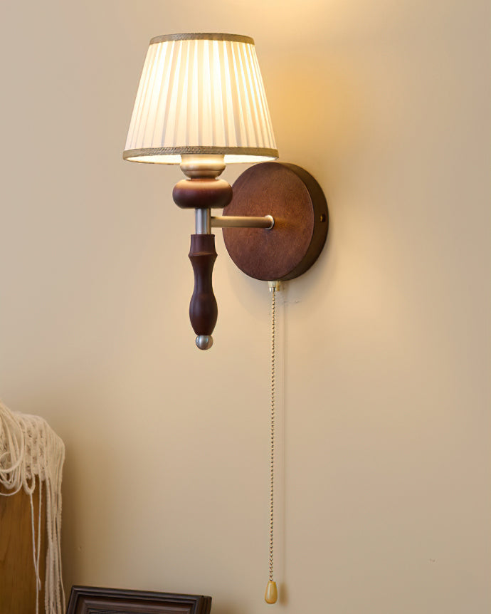Indulge in the classic elegance of the Celine Vintage Wall Lamp from Mooijane. Crafted from natural solid wood in a rich walnut color, its fine texture and fabric lampshade create a soft, evenly distributed light. The pull-cord switch adds a touch of practical beauty to this exquisite and exclusive piece.