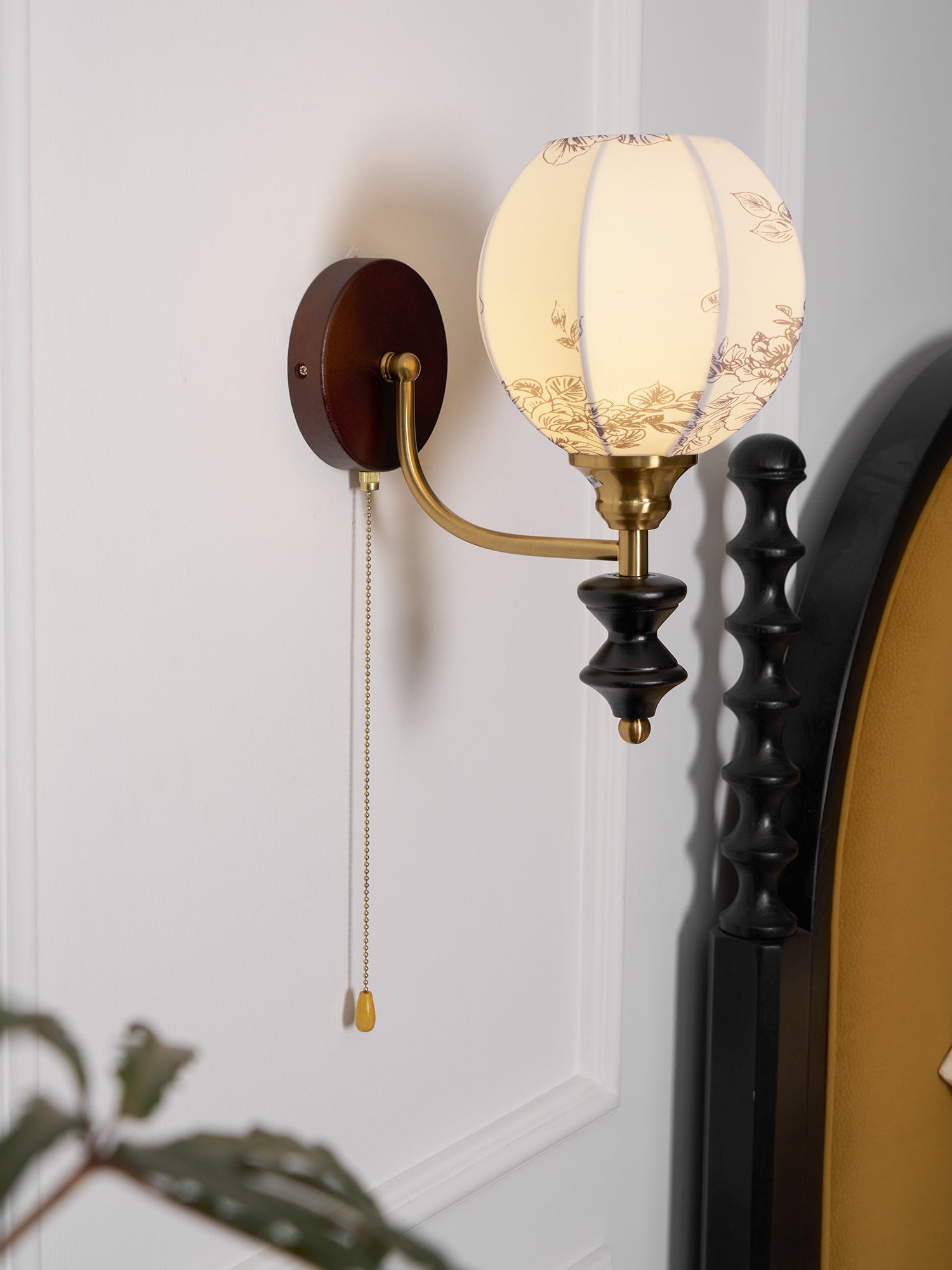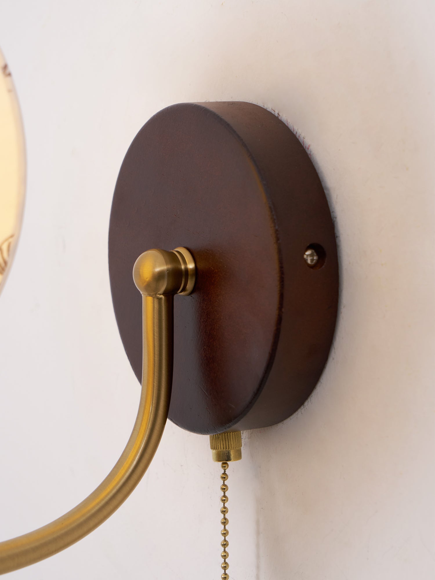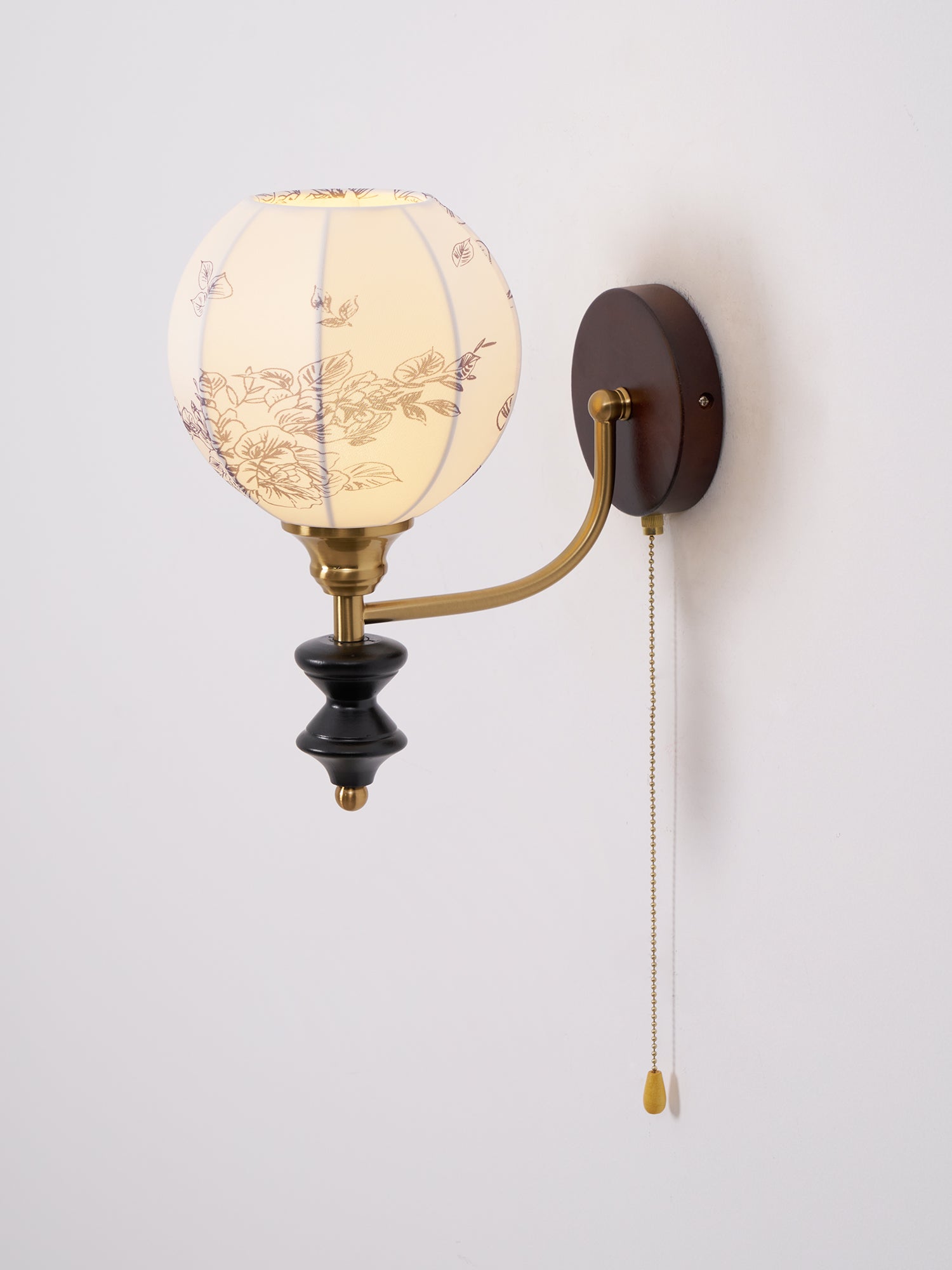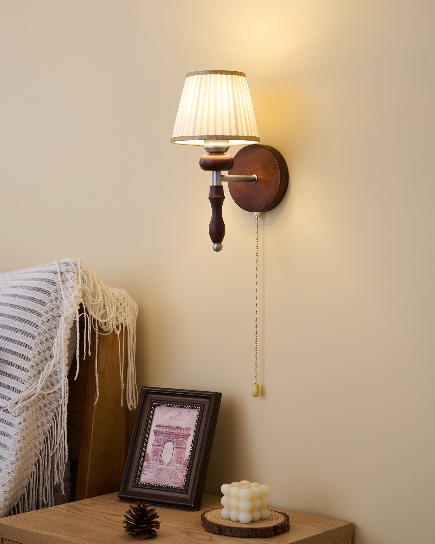 Indulge in the classic elegance of the Celine Vintage Wall Lamp from Mooijane. Crafted from natural solid wood in a rich walnut color, its fine texture and fabric lampshade create a soft, evenly distributed light. The pull-cord switch adds a touch of practical beauty to this exquisite and exclusive piece.