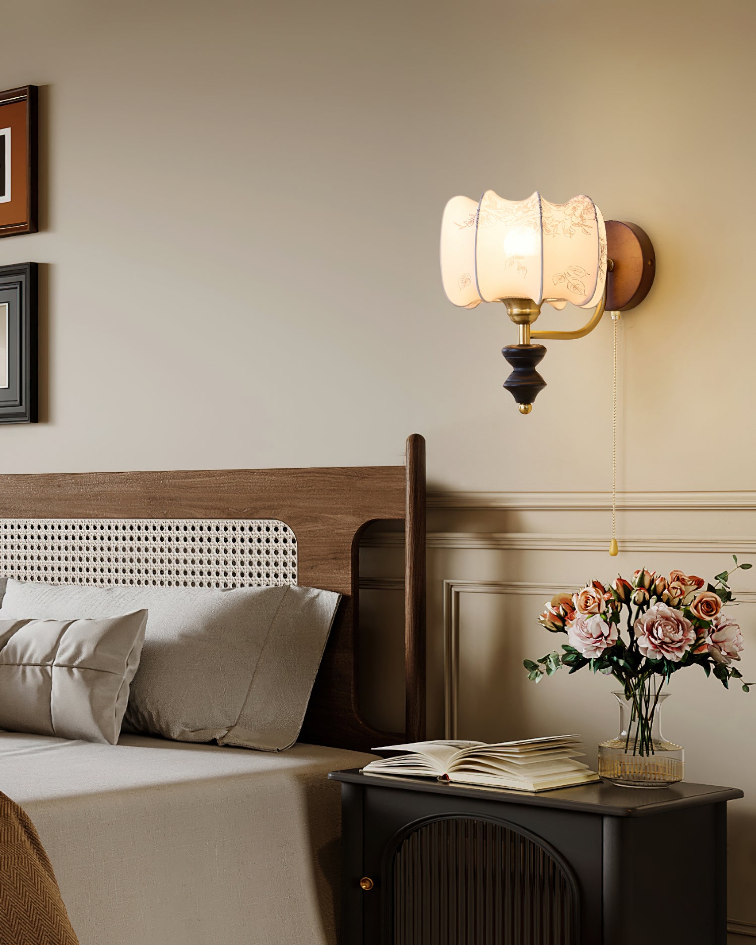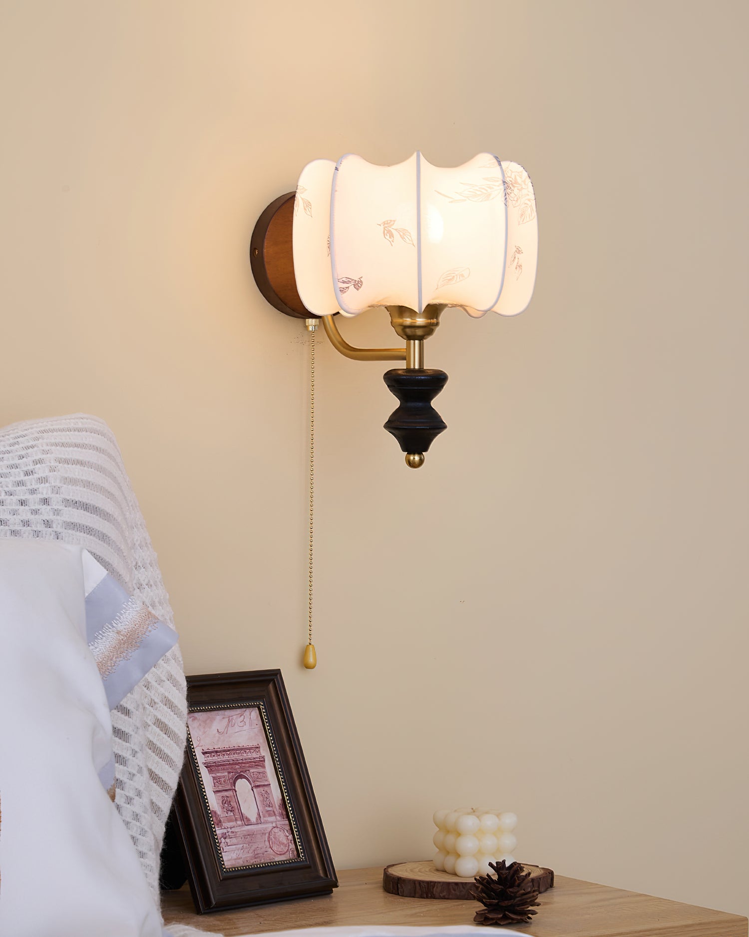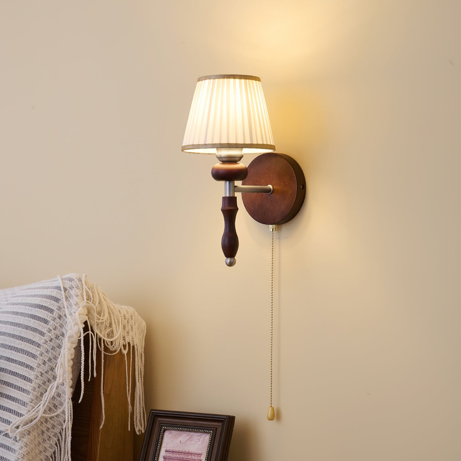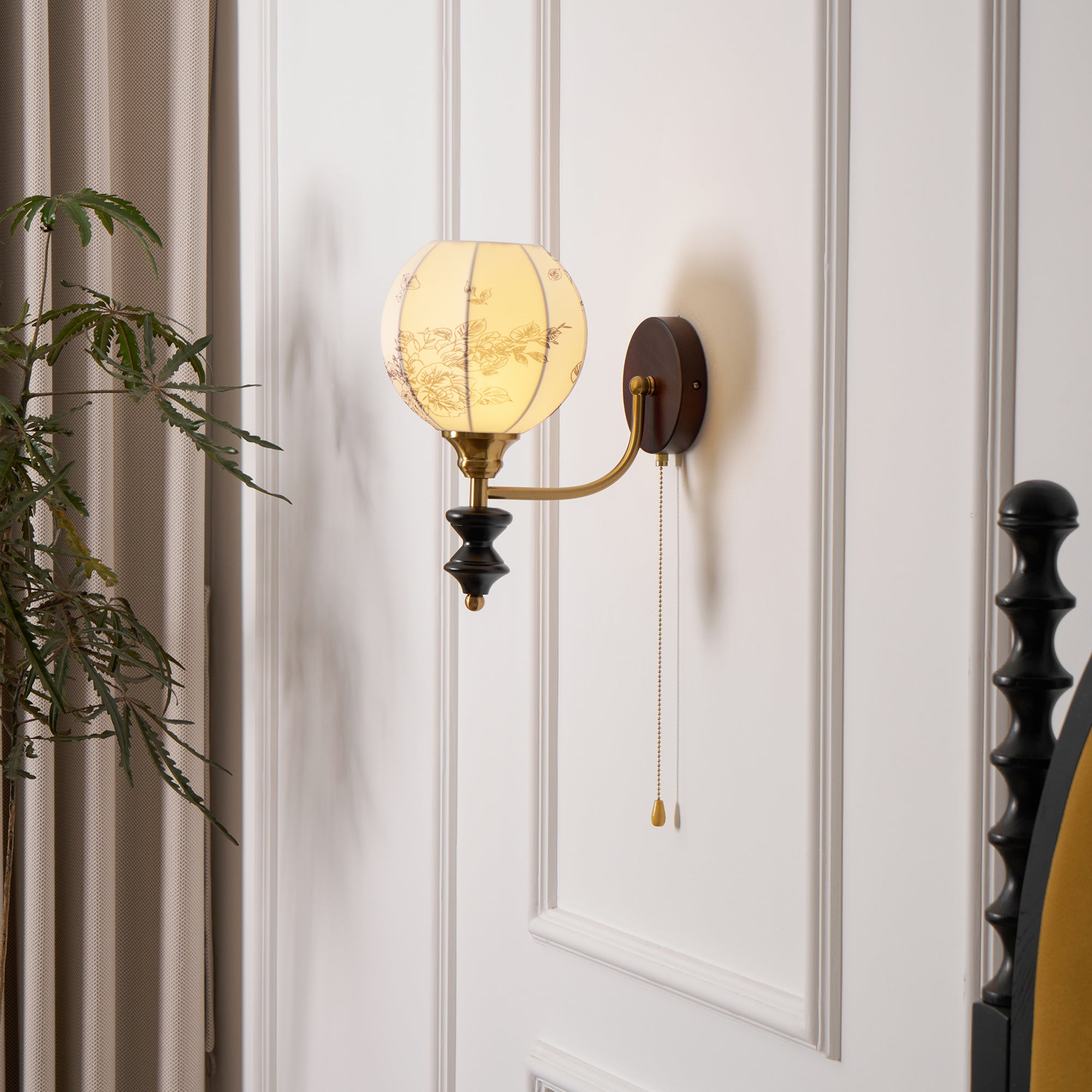 Indulge in the classic elegance of the Celine Vintage Wall Lamp from Mooijane. Crafted from natural solid wood in a rich walnut color, its fine texture and fabric lampshade create a soft, evenly distributed light. The pull-cord switch adds a touch of practical beauty to this exquisite and exclusive piece.