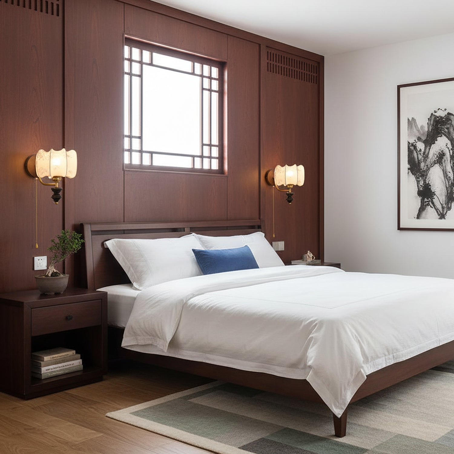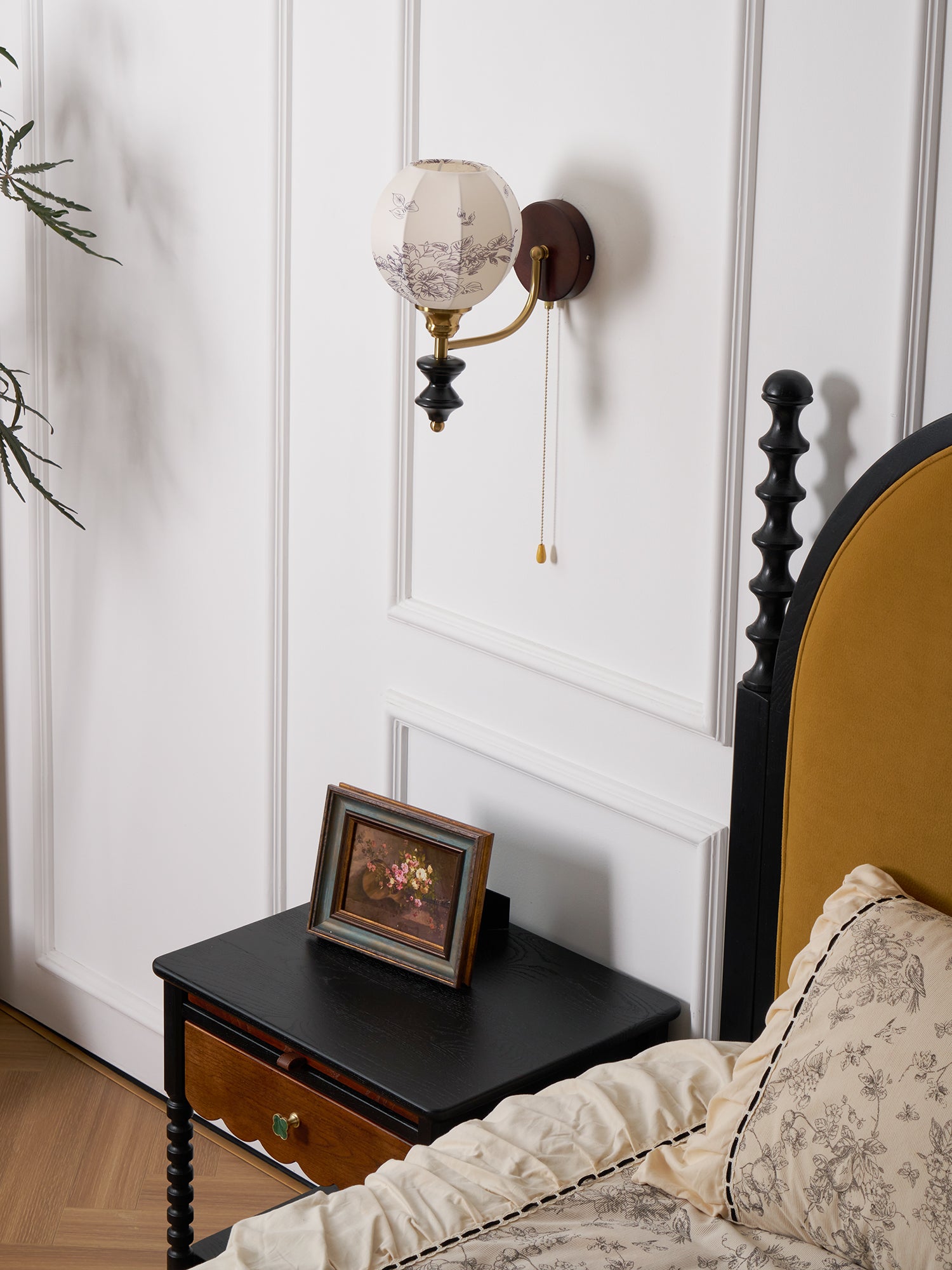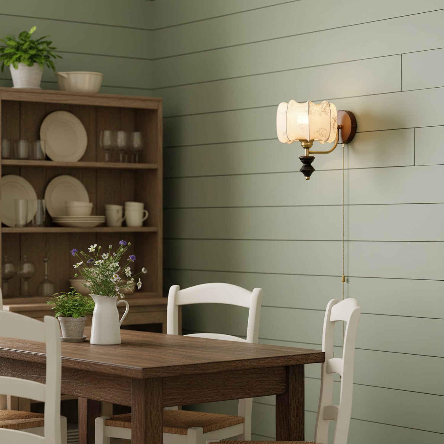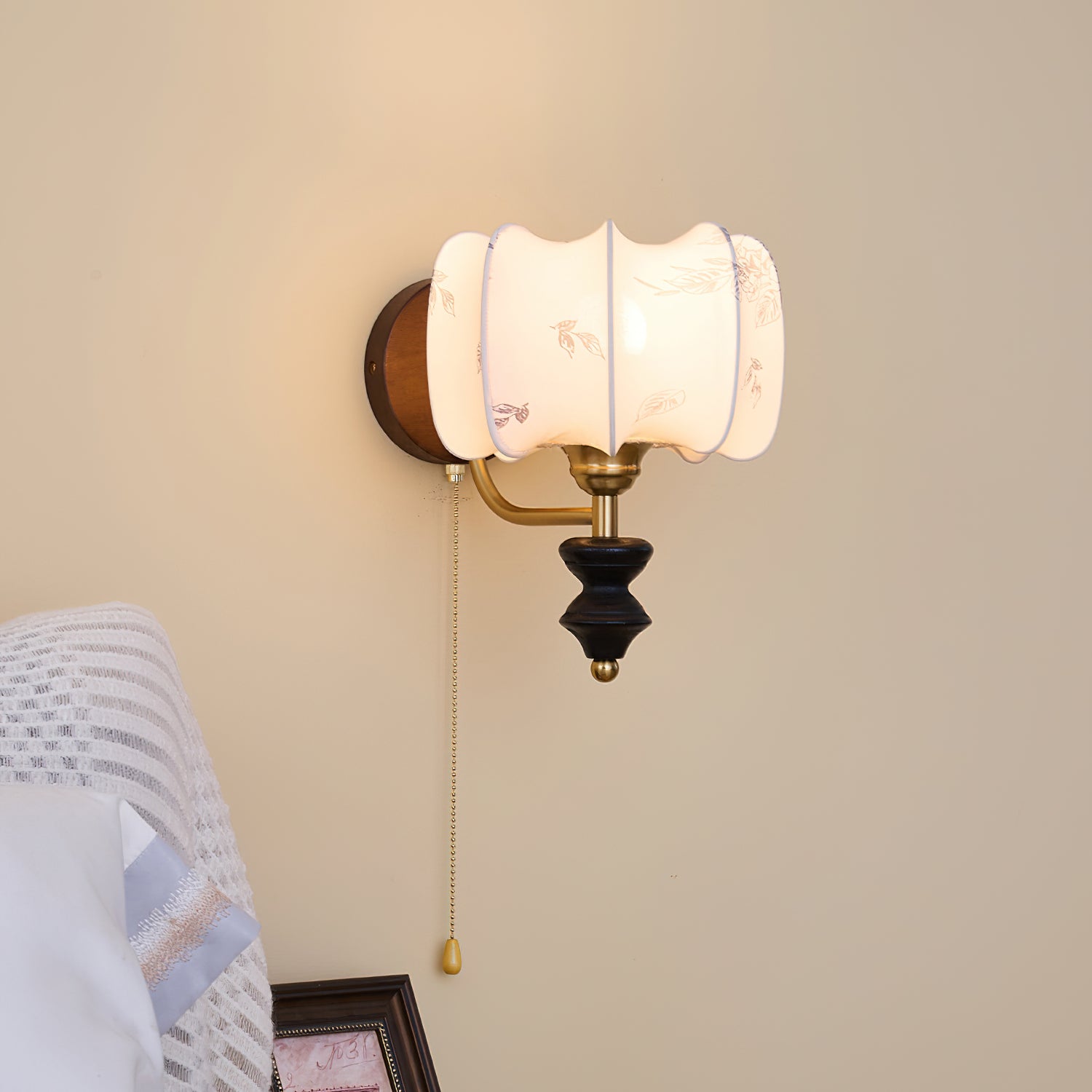 Indulge in the classic elegance of the Celine Vintage Wall Lamp from Mooijane. Crafted from natural solid wood in a rich walnut color, its fine texture and fabric lampshade create a soft, evenly distributed light. The pull-cord switch adds a touch of practical beauty to this exquisite and exclusive piece.