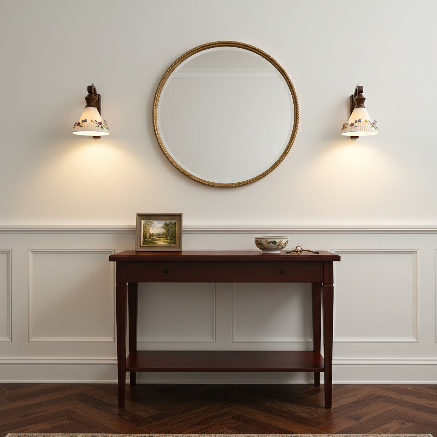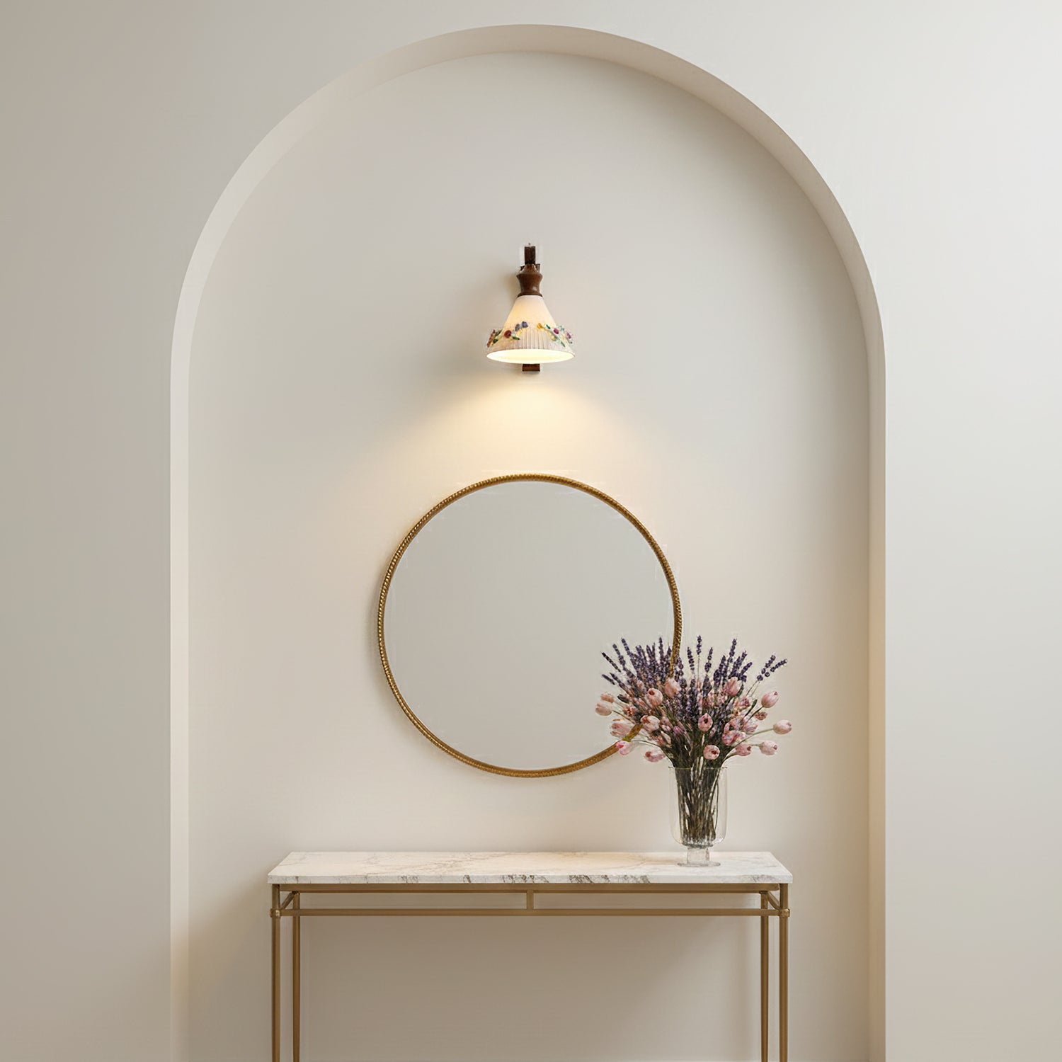 The Celiora Wall Lamp by Mooijane blends refined craftsmanship with romantic elegance. Crafted from solid wood and fine ceramic, it features a gracefully curved arm supporting a fluted shade adorned with delicately hand-painted floral details. Soft light filters through the ceramic surface, creating a warm, inviting glow.