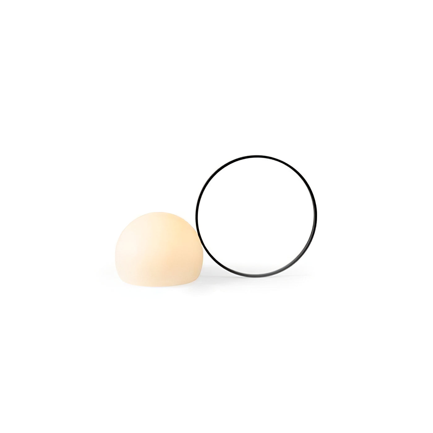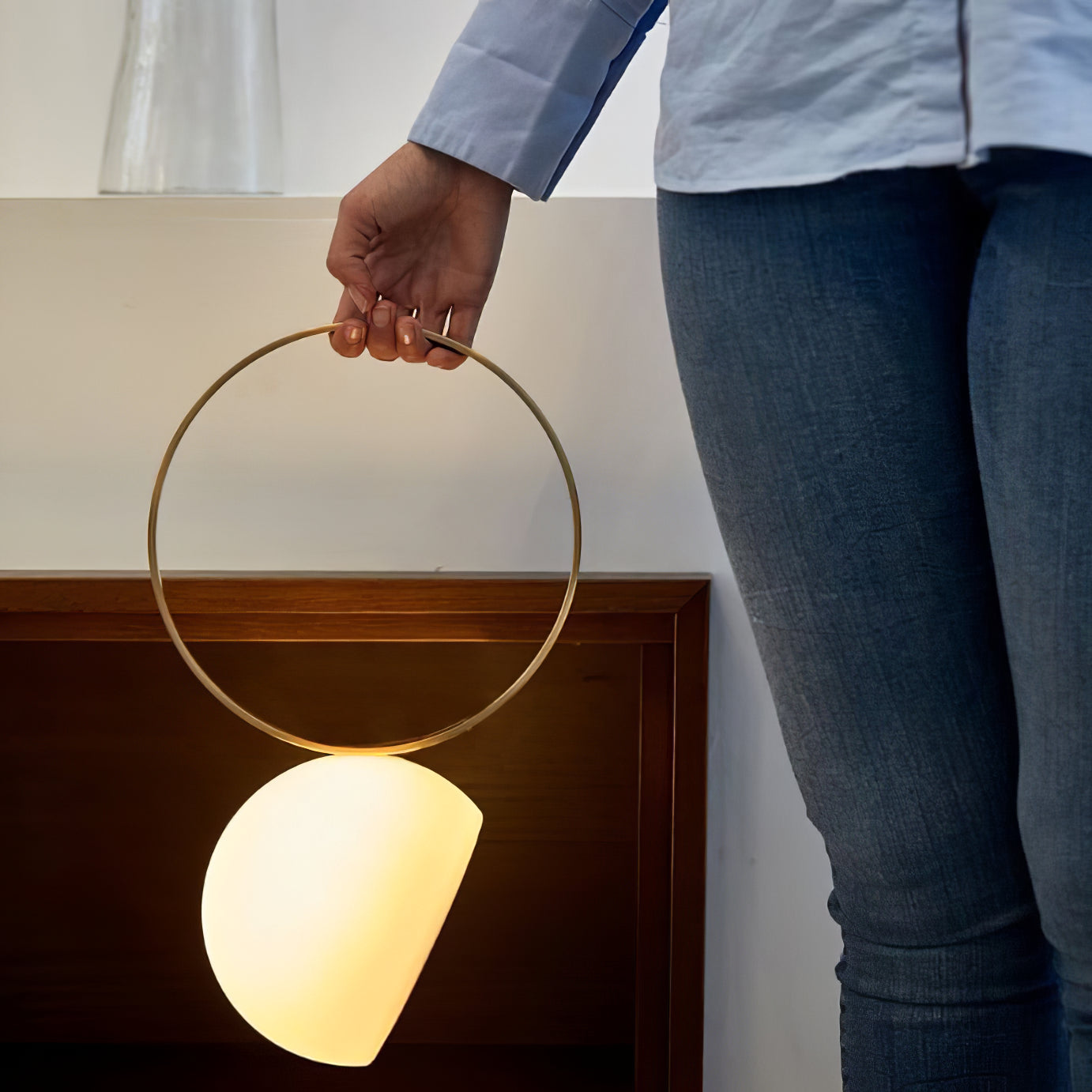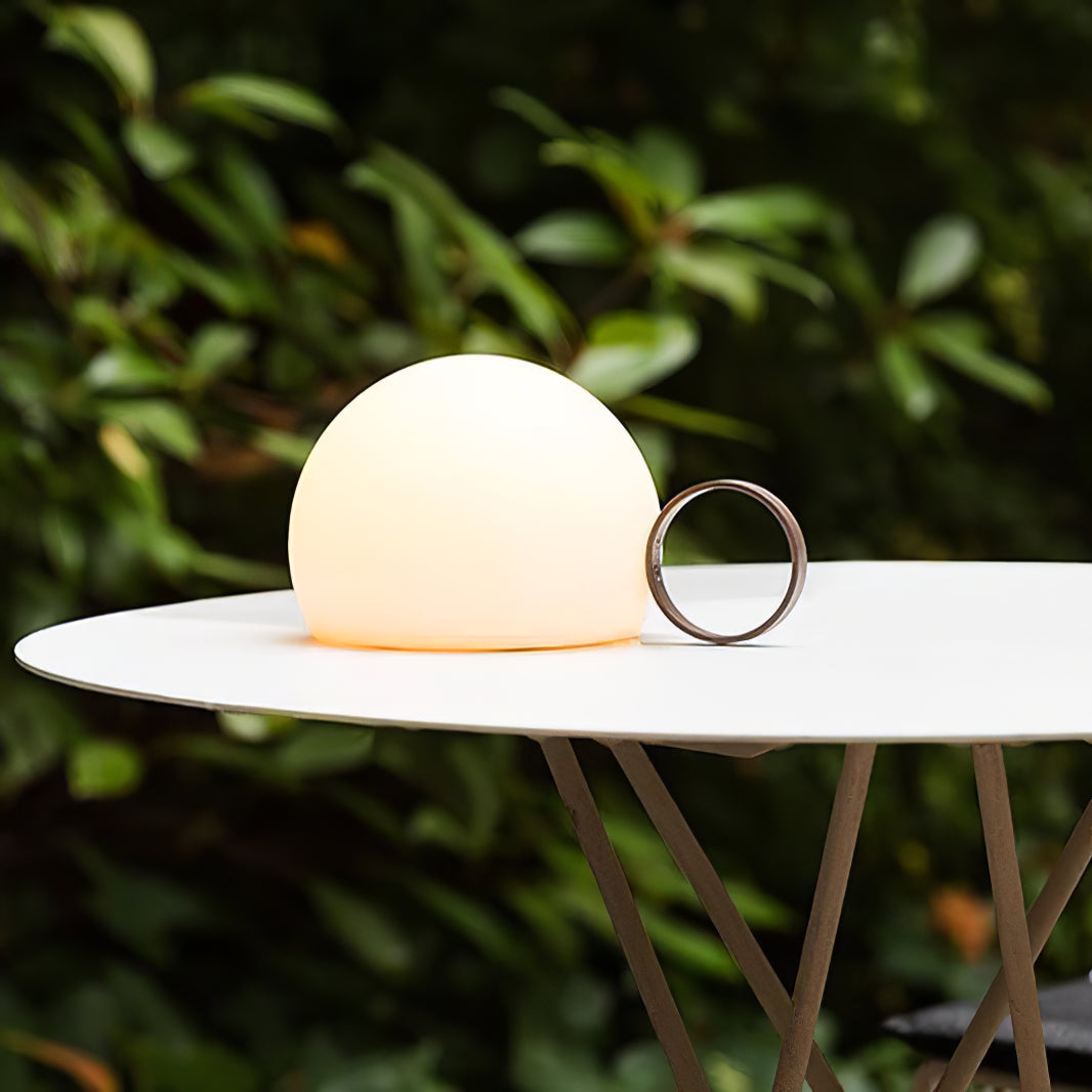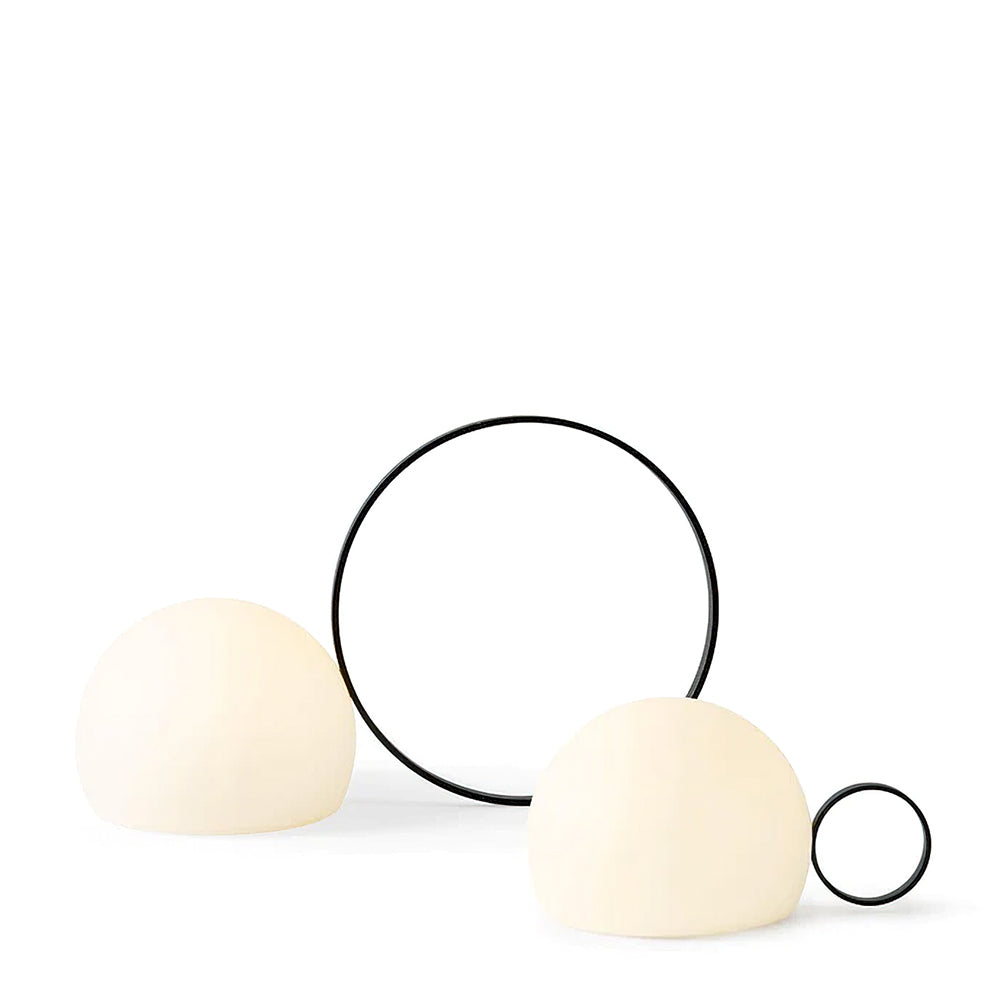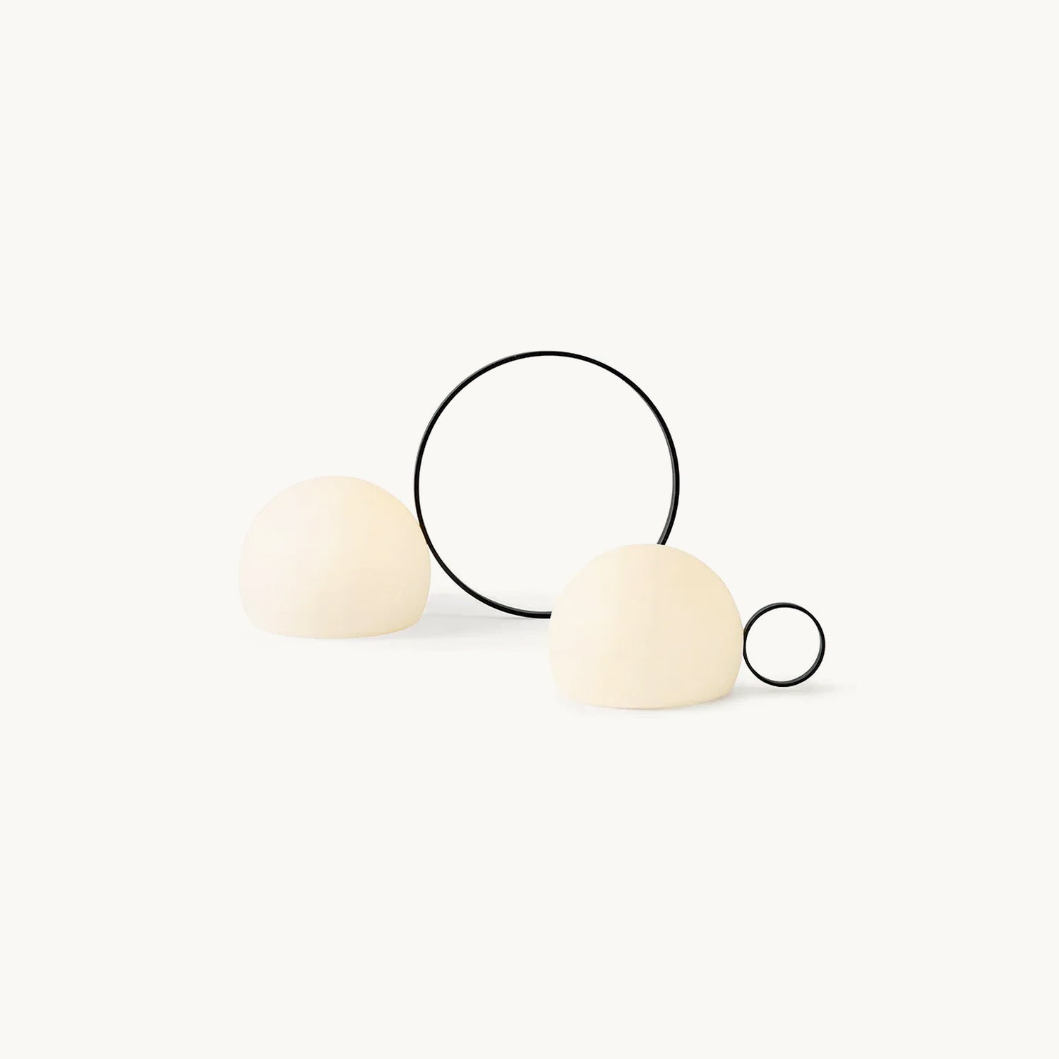 Balanced asymmetry defines these glowing hemispheres that light up an evening. A metal ring is both carrying handle and support for this portable, battery-operated light.