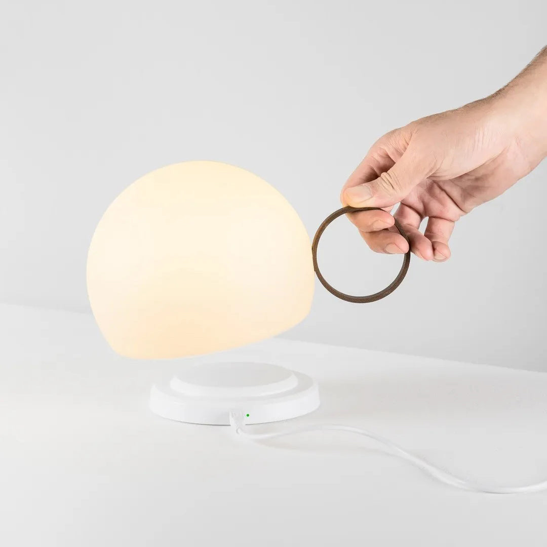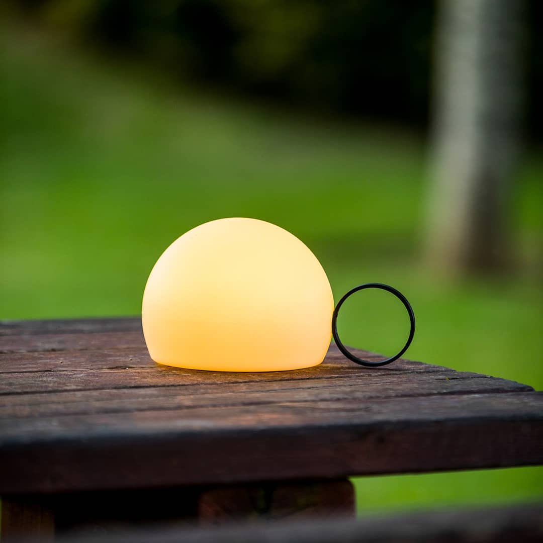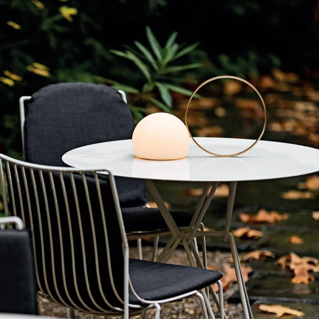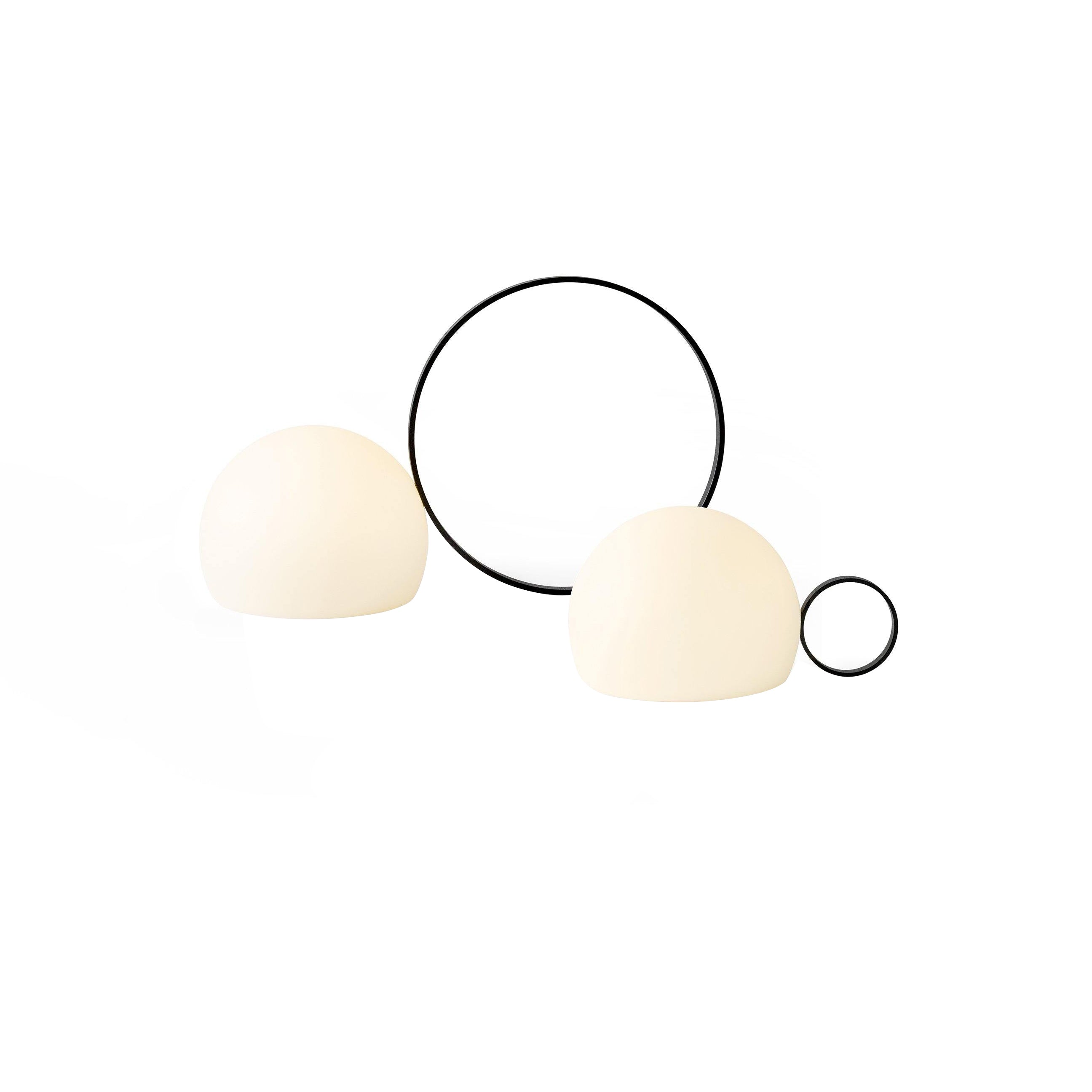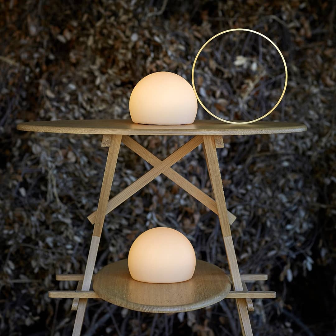 Balanced asymmetry defines these glowing hemispheres that light up an evening. A metal ring is both carrying handle and support for this portable, battery-operated light.