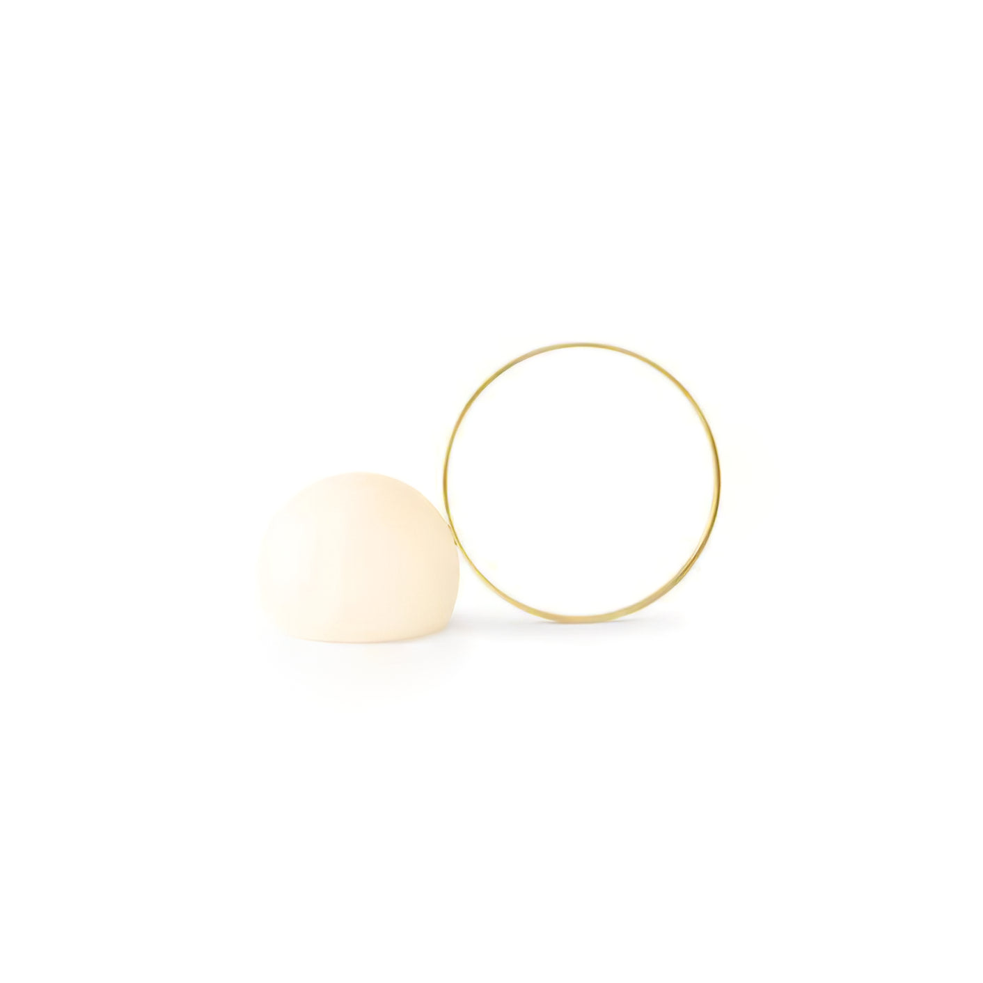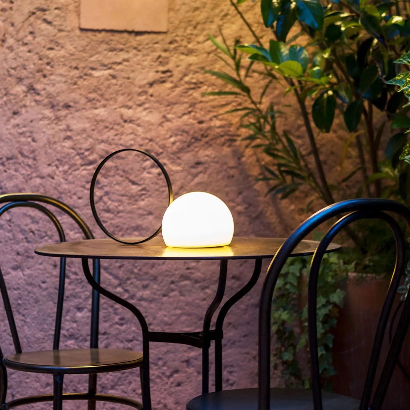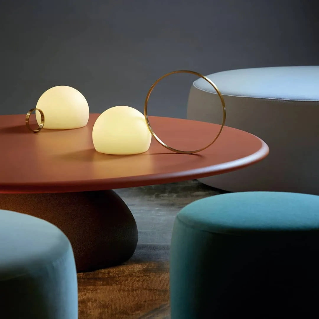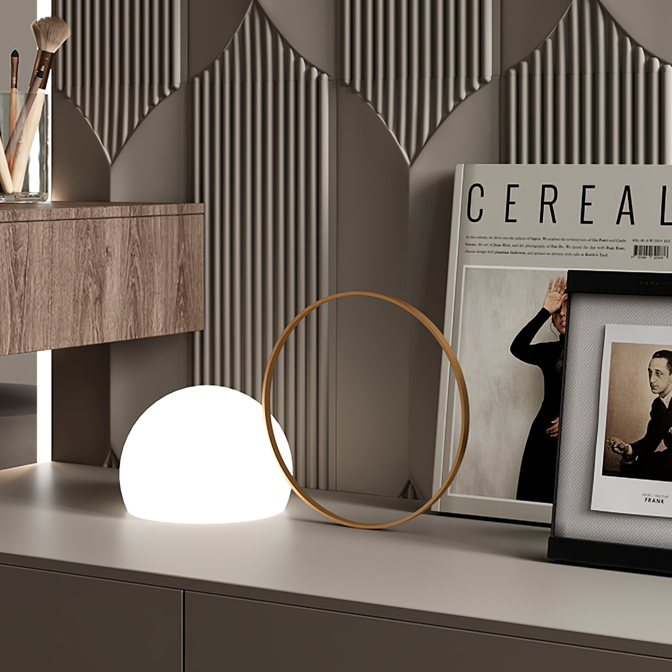 Balanced asymmetry defines these glowing hemispheres that light up an evening. A metal ring is both carrying handle and support for this portable, battery-operated light.