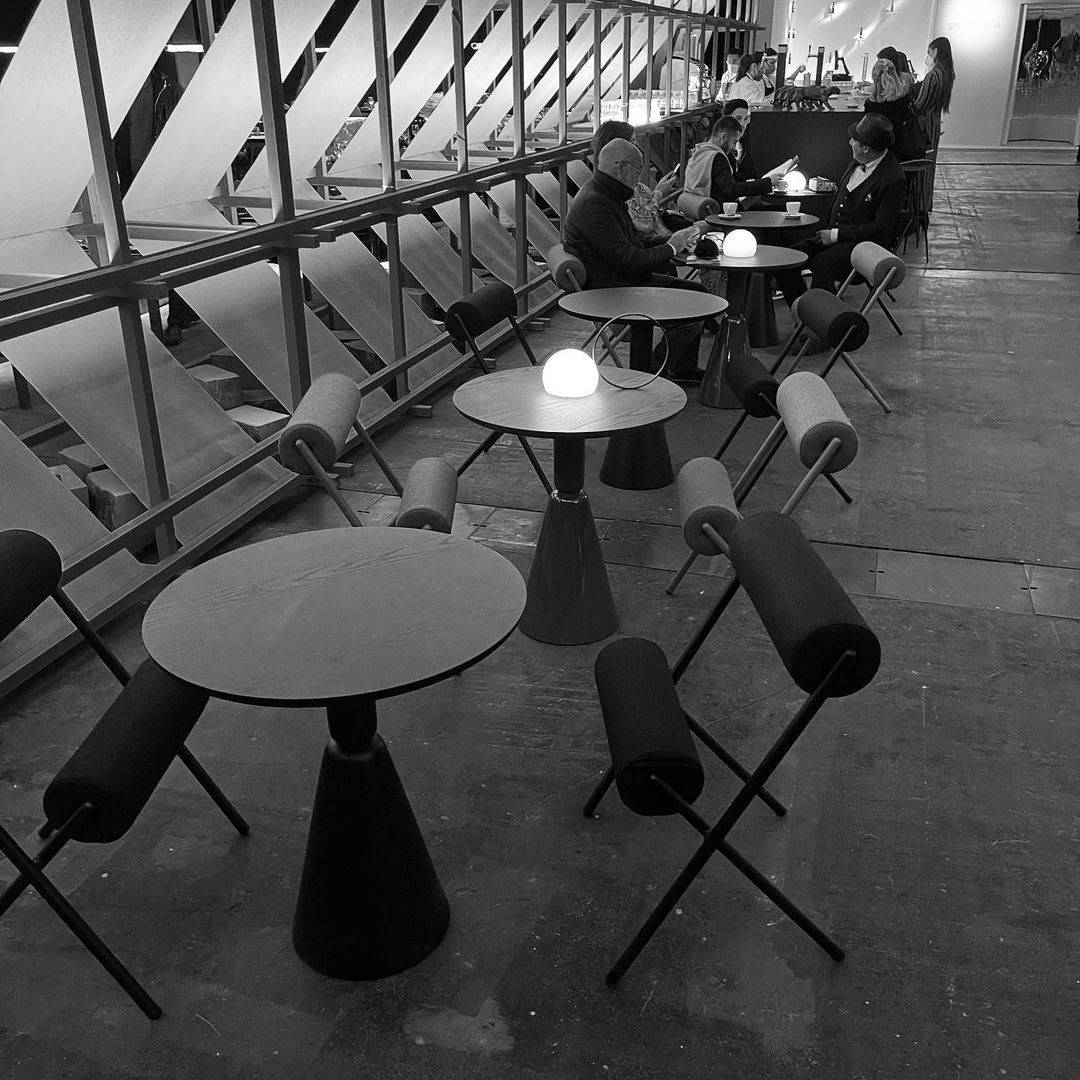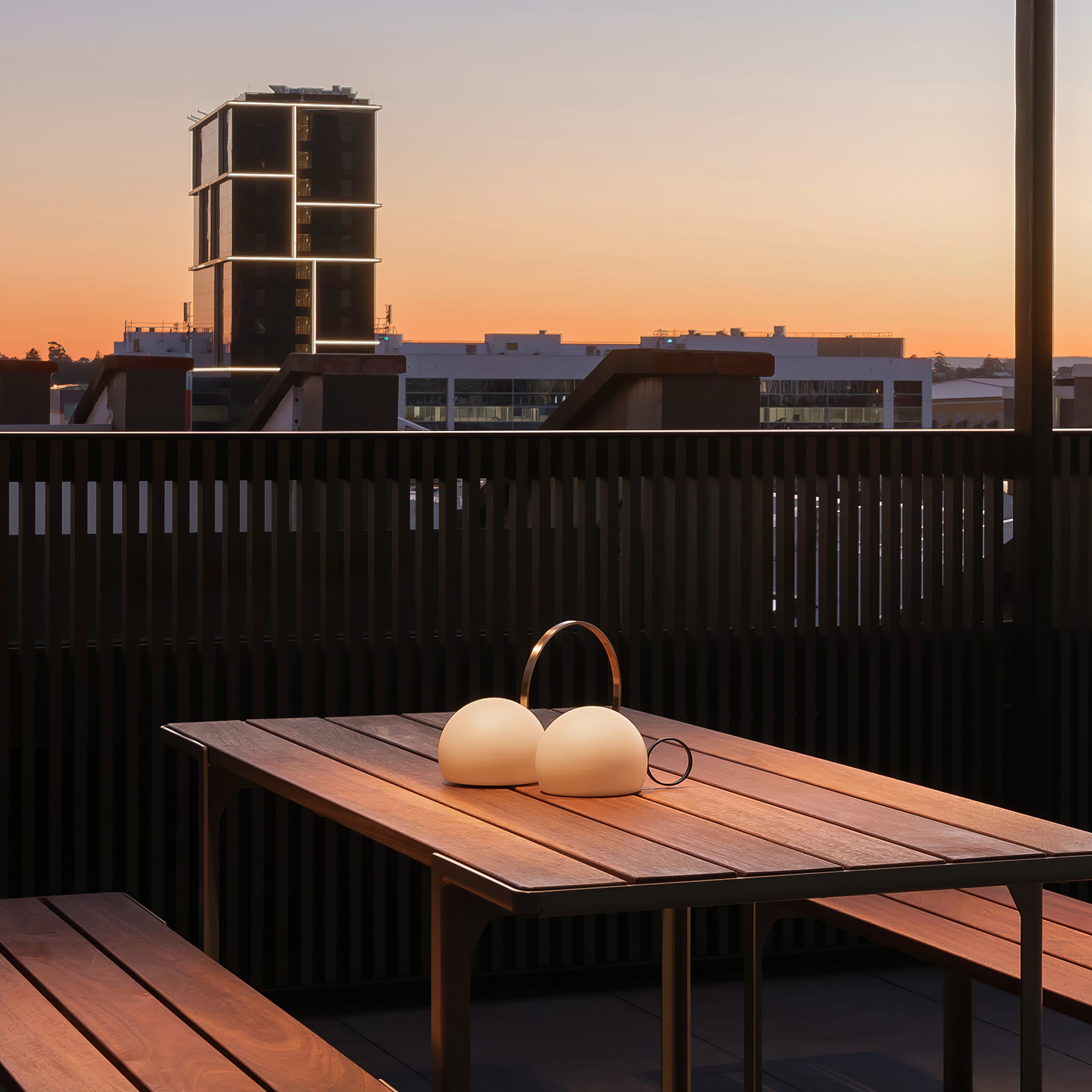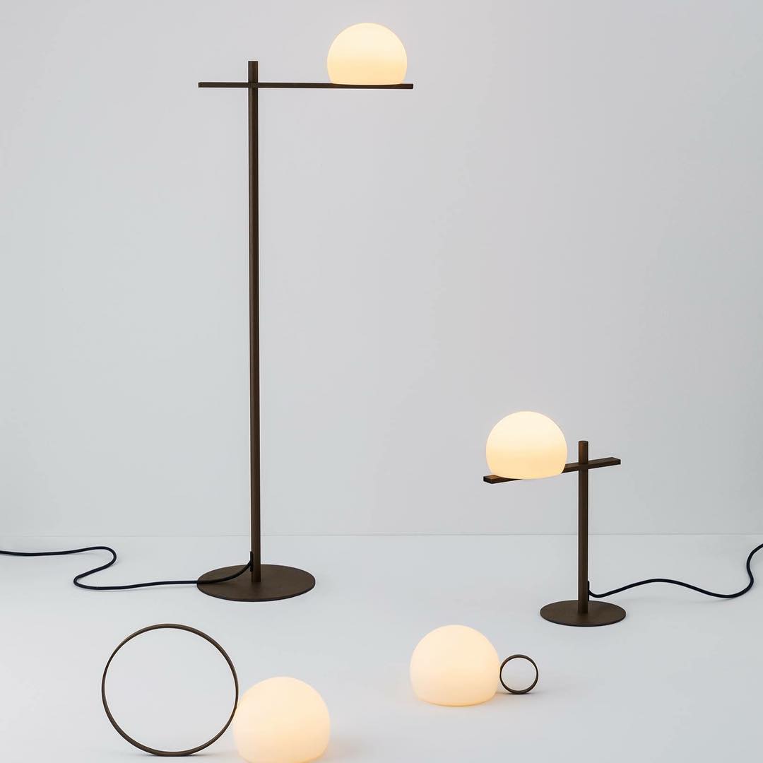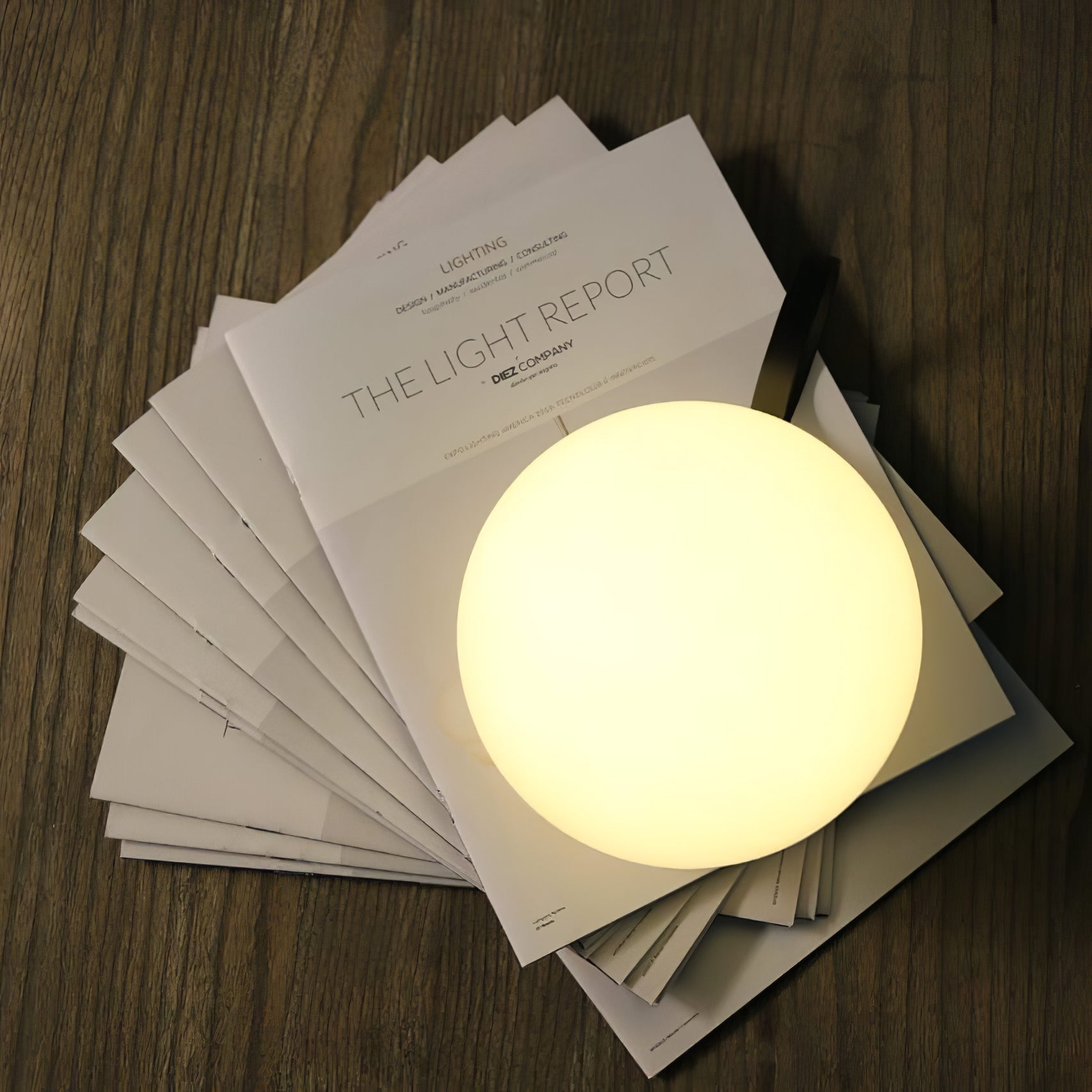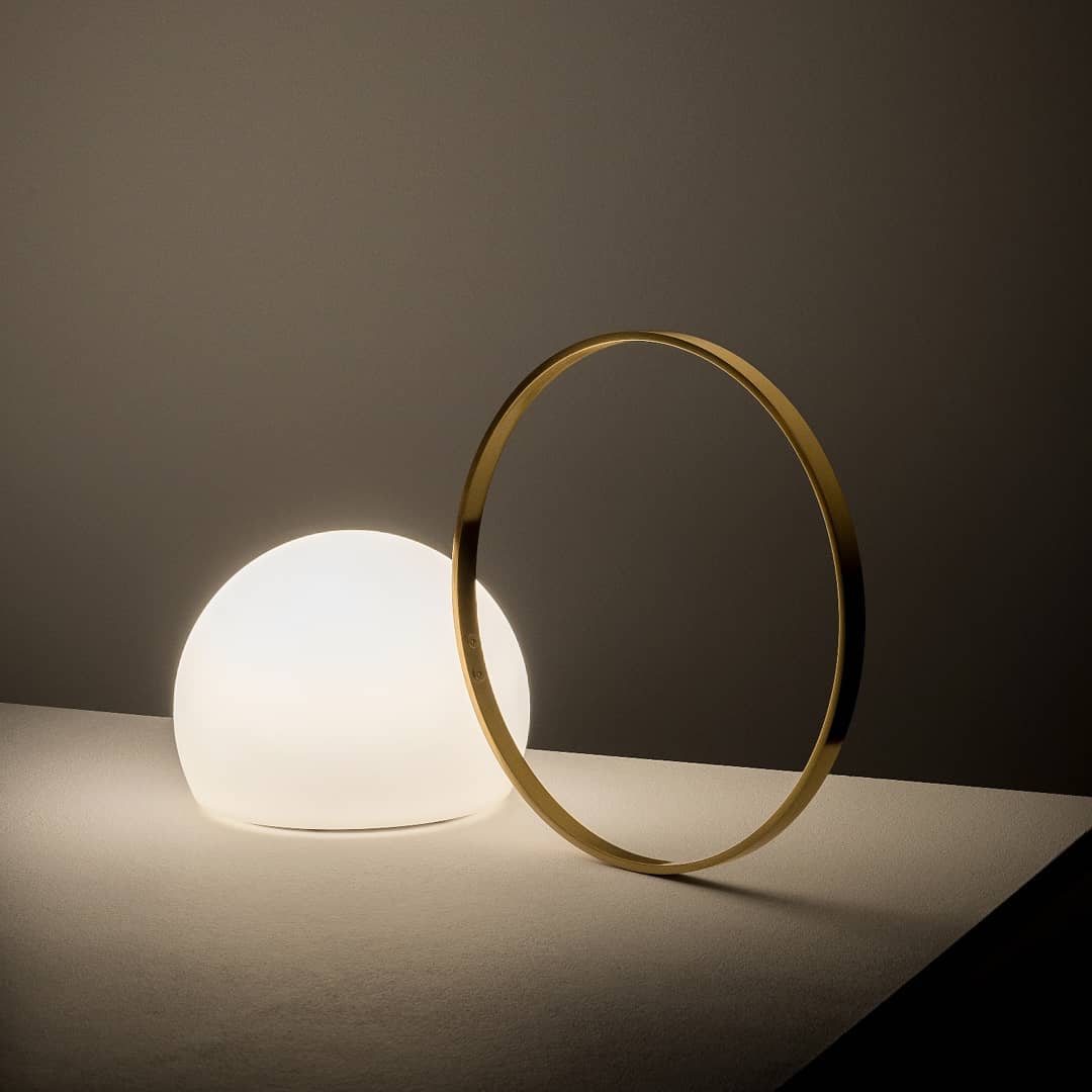 Balanced asymmetry defines these glowing hemispheres that light up an evening. A metal ring is both carrying handle and support for this portable, battery-operated light.