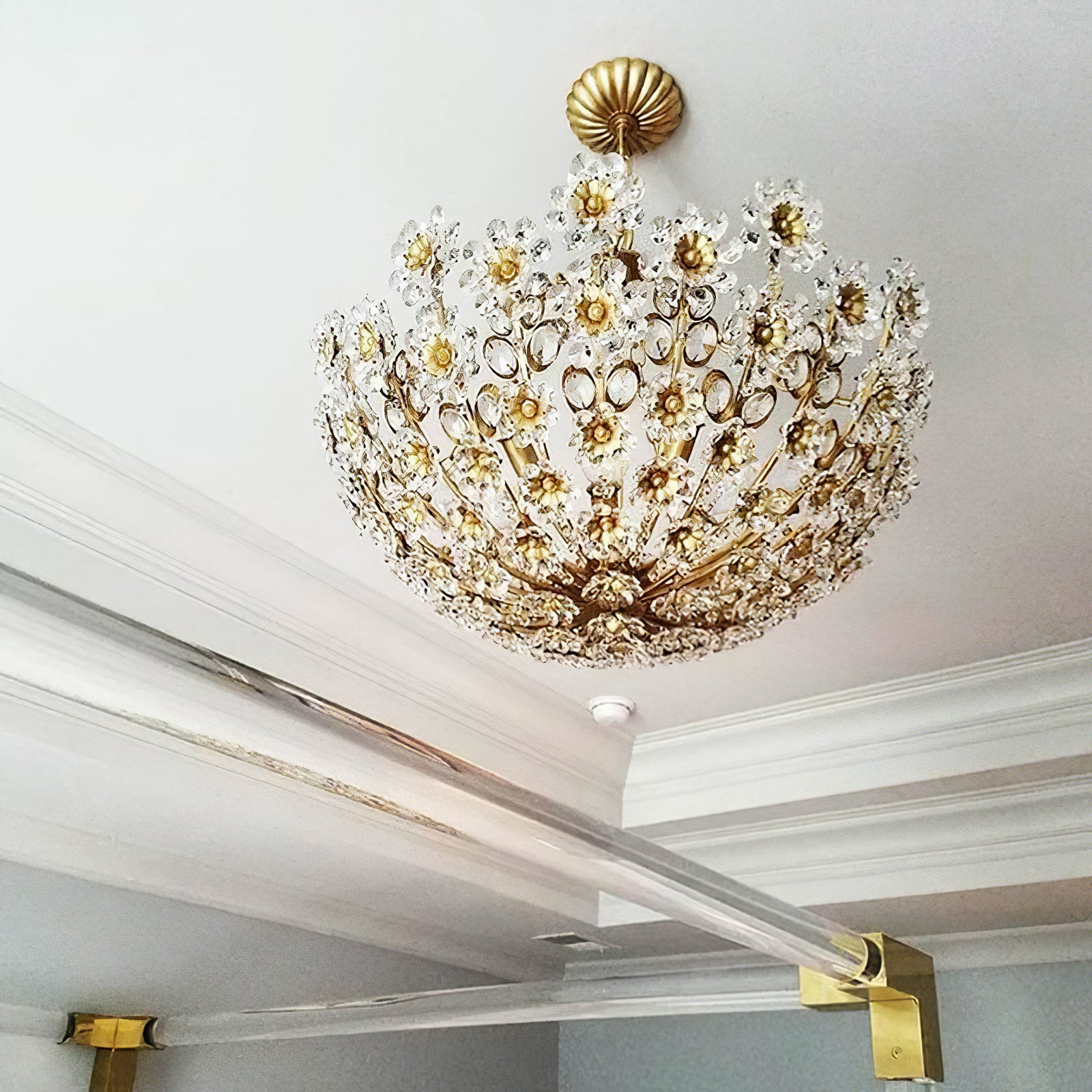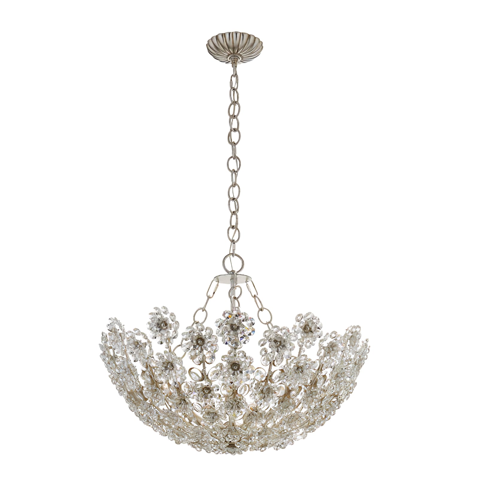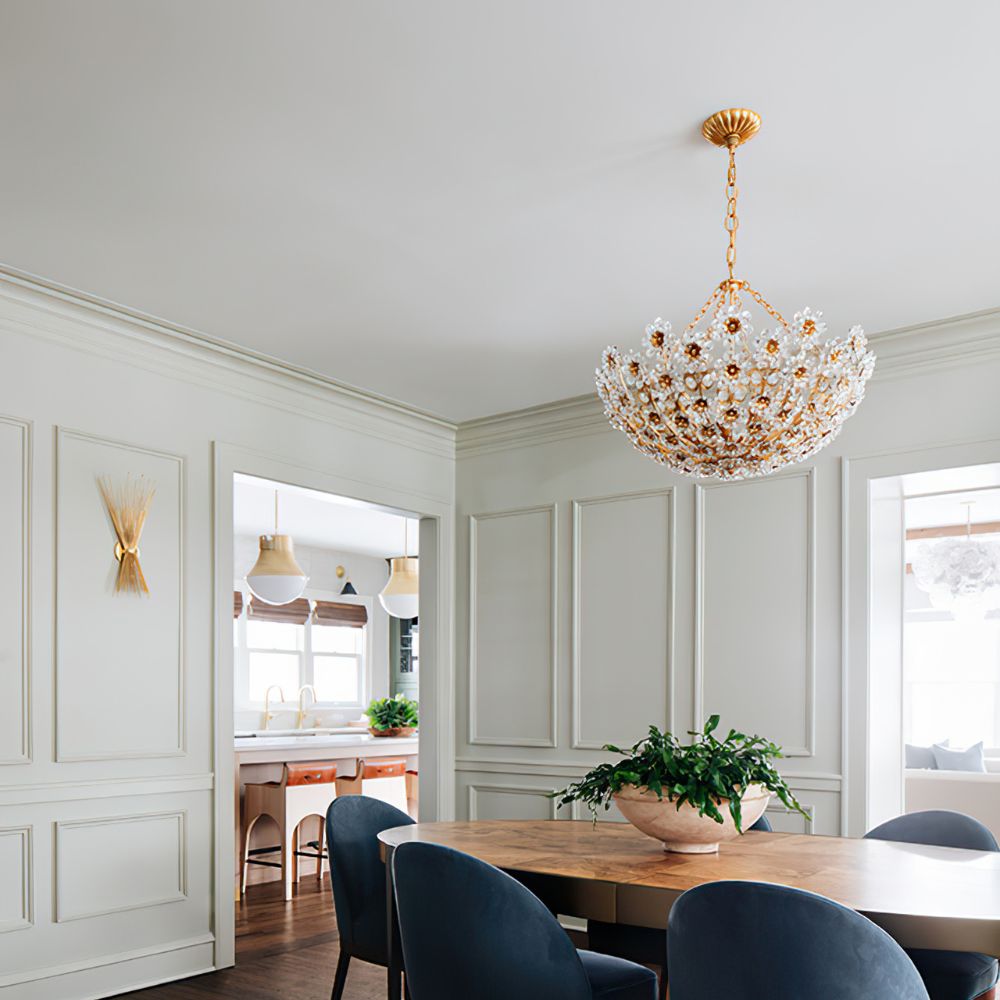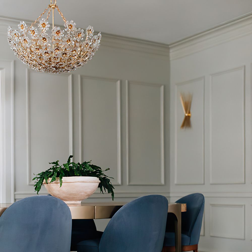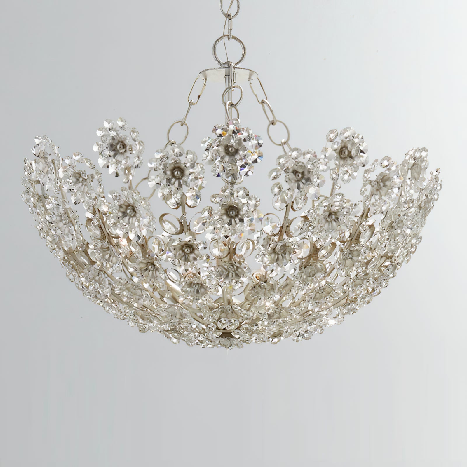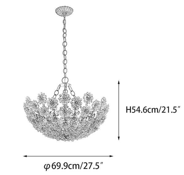 Claret Crystal Flower Basket Chandelier is a chandelier full of exquisite elegance. Its design is inspired by the classic flower basket shape, adding a touch of romance and magnificence to the space. The lamp body adopts a silver metal frame, presenting a noble luster, and is connected to the ceiling by an exquisite chain, enhancing the overall sense of balance and visual impact.