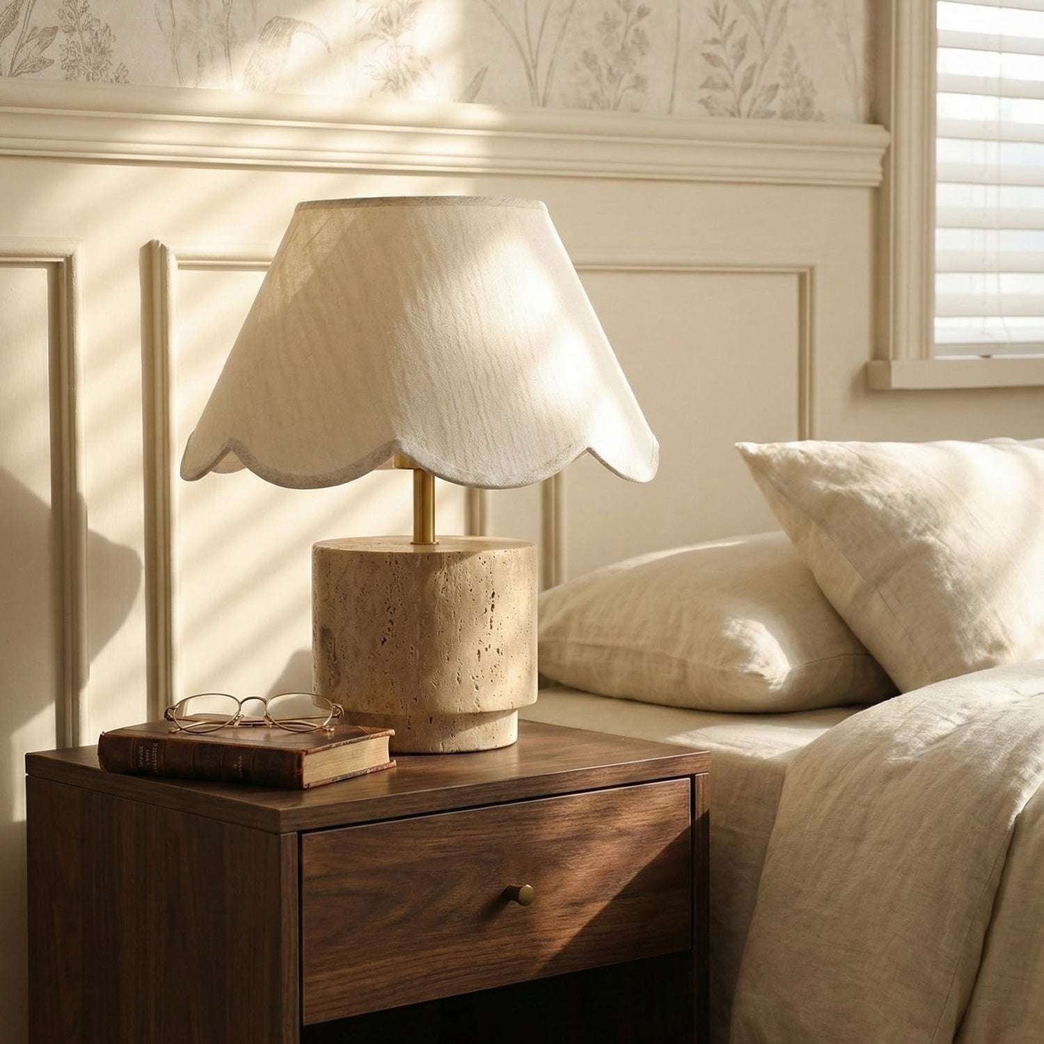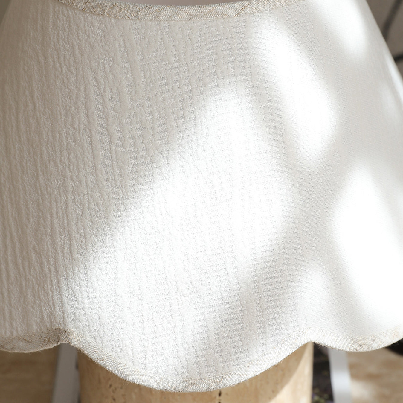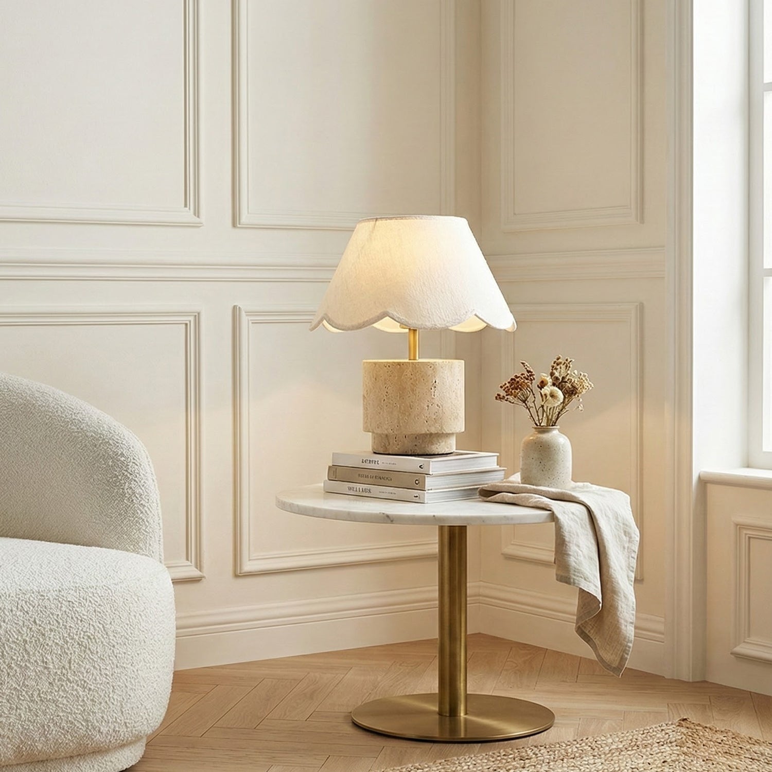 The Clarissa Table Lamp by Mooijane combines the natural elegance of travertine stone with the soft texture of fabric for a timeless yet contemporary design. The solid stone base features smooth, rounded contours in subtle earthy tones, complementing a variety of interior styles. The scalloped fabric lampshade diffuses light gently, creating a warm, inviting atmosphere.