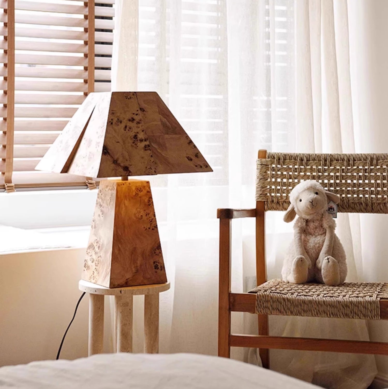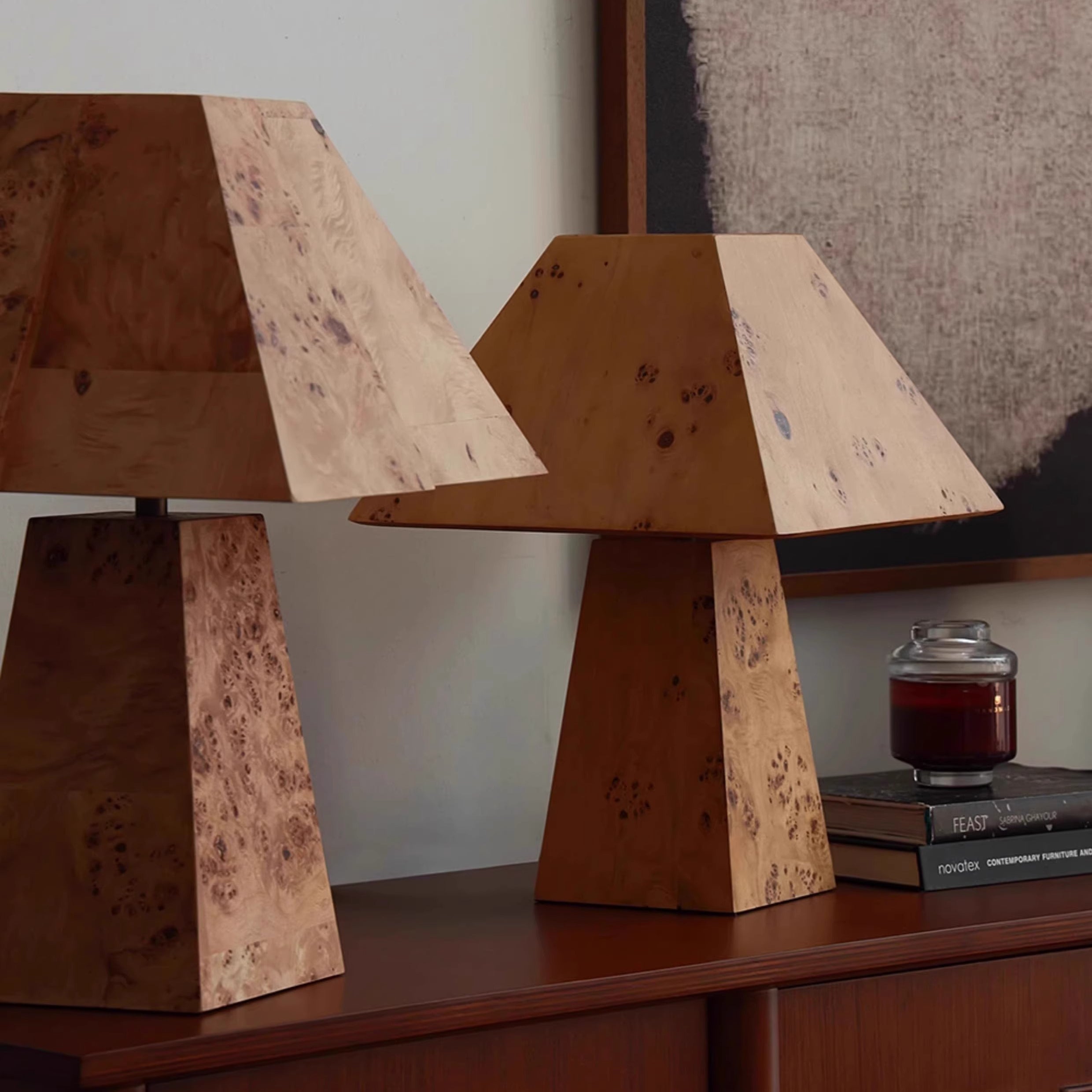The Clburl Burl Wood Table Lamp by Mooijane is crafted from a rare Burl Wood veneer known for its unique grain and rich depth of tone. Its faceted base and angled shade create a striking geometric silhouette that blends natural warmth with modern sophistication. Ideal for a gallery console, a sophisticated bedroom or a collector's room, this lamp is both functional lighting and an artistic centerpiece. It is the perfect blend of craftsmanship, unique character and timeless design.