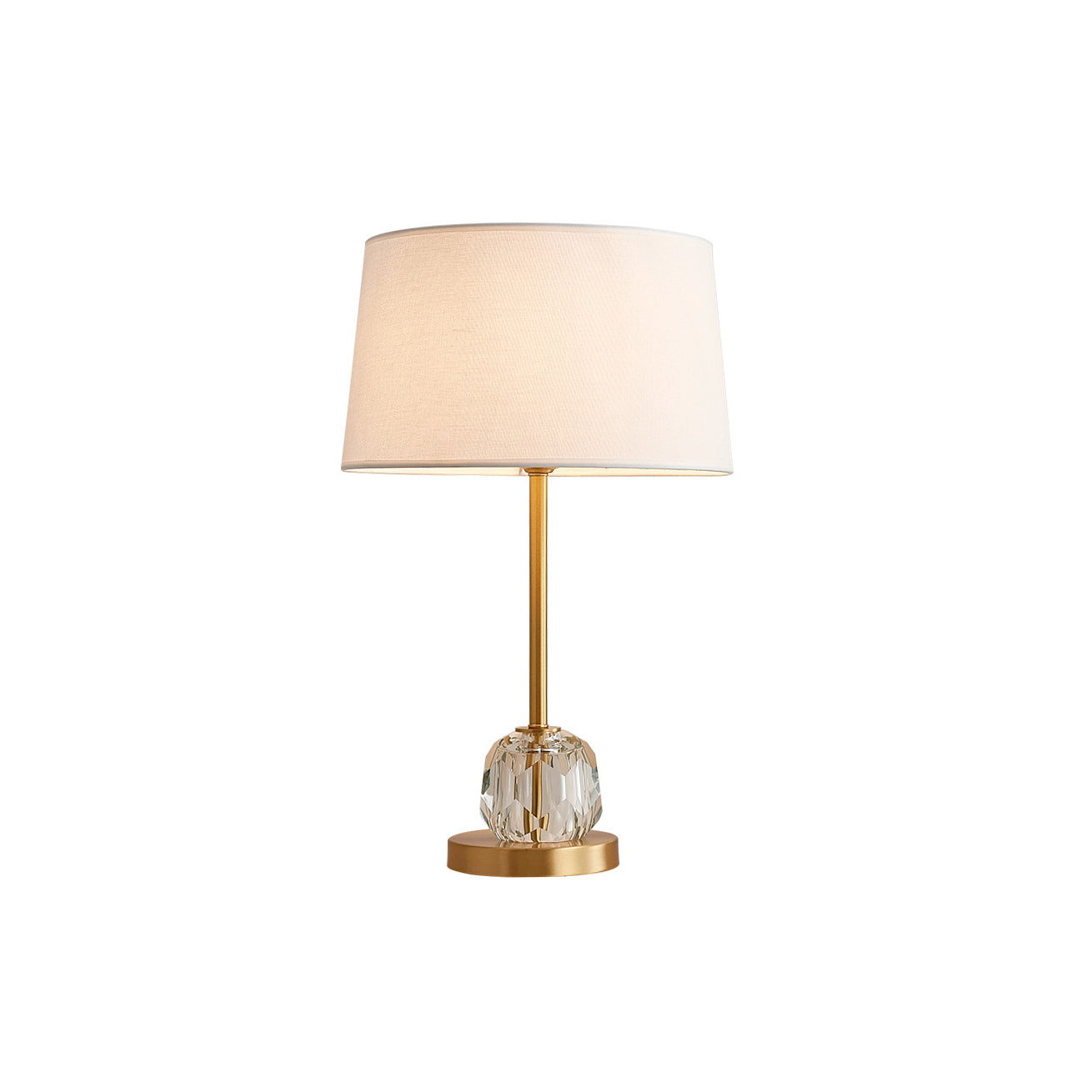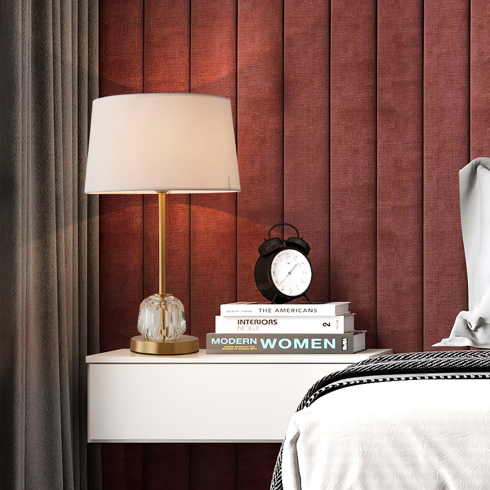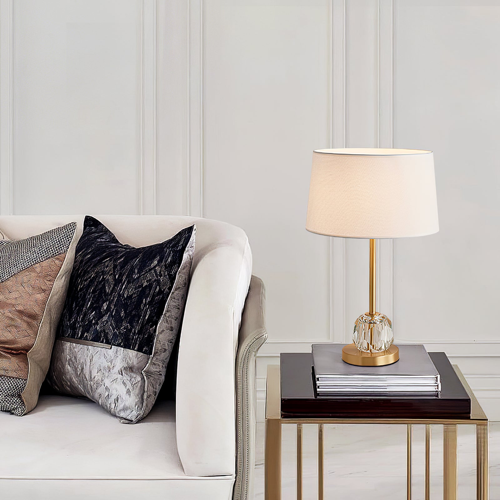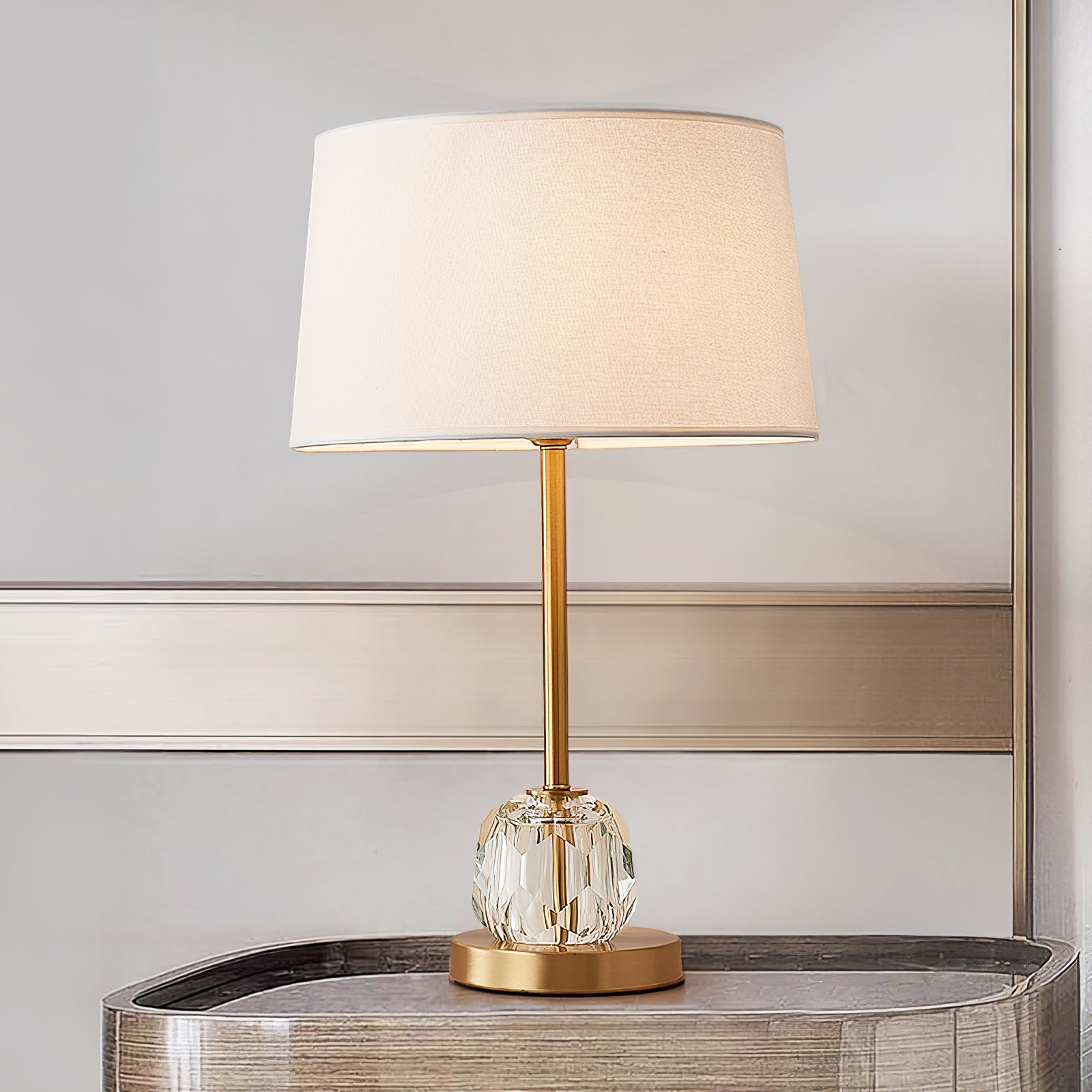 Square-type cotton shade is ultra-chic with a stunning crystal base and brass gold finish, This table lamp set works beautifully by the bedside on a nightstand, console table, in the home office, living room, or dining area.