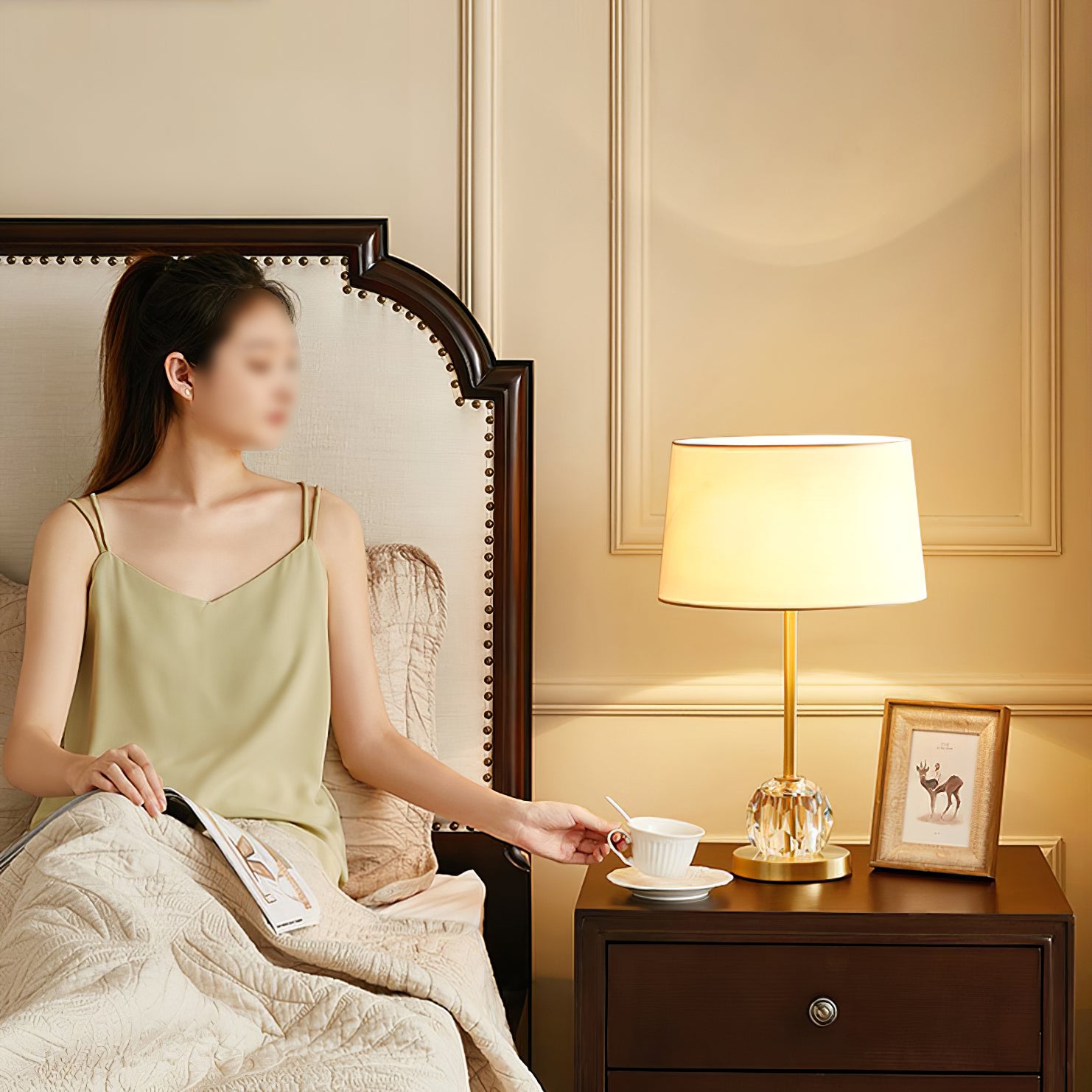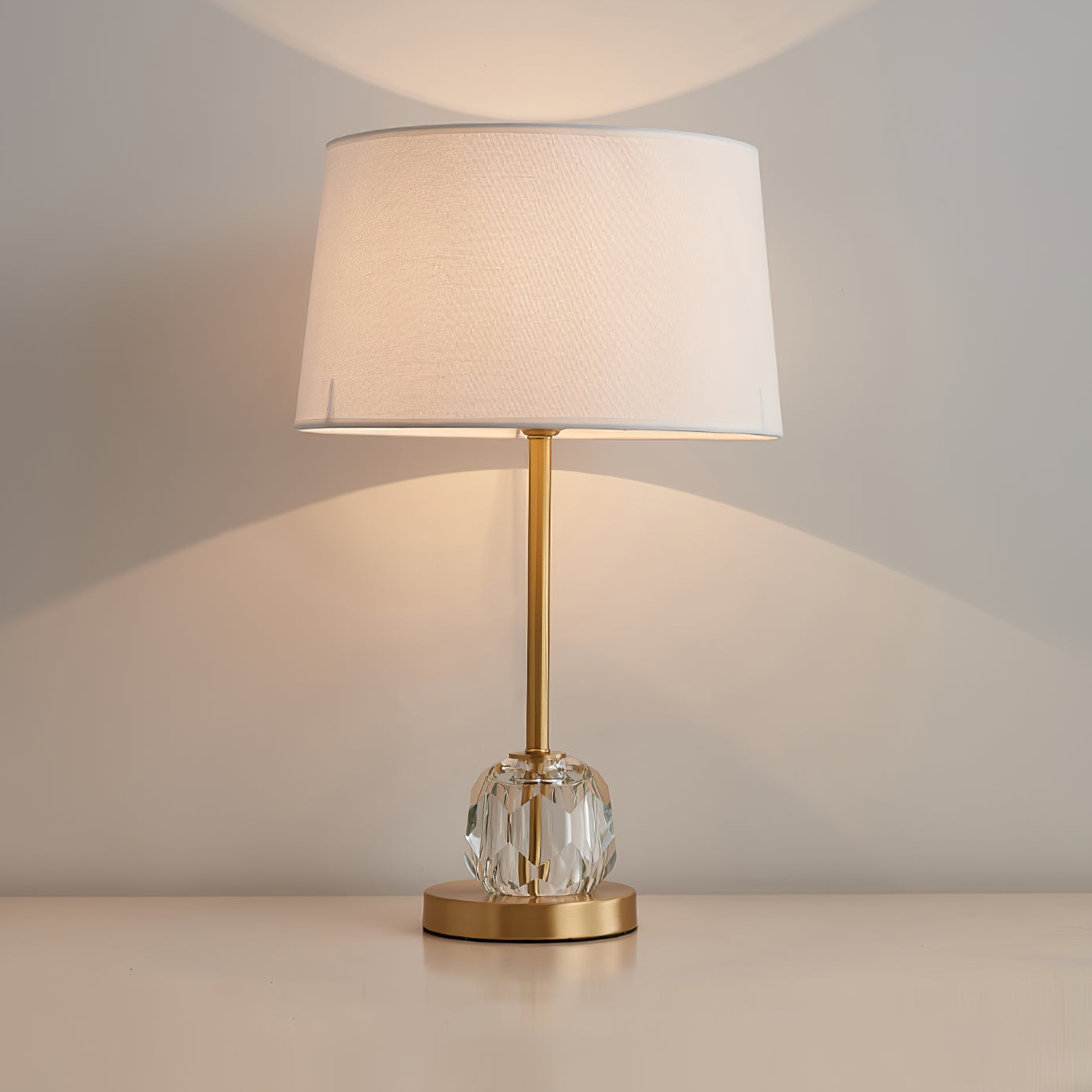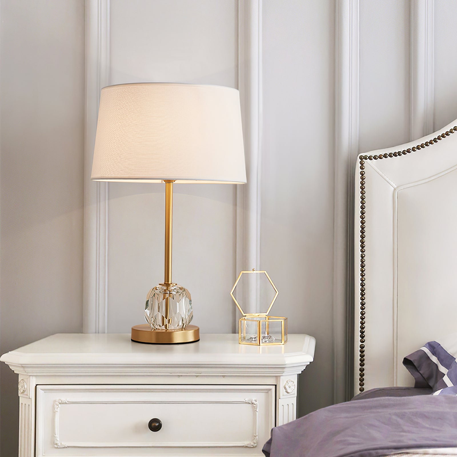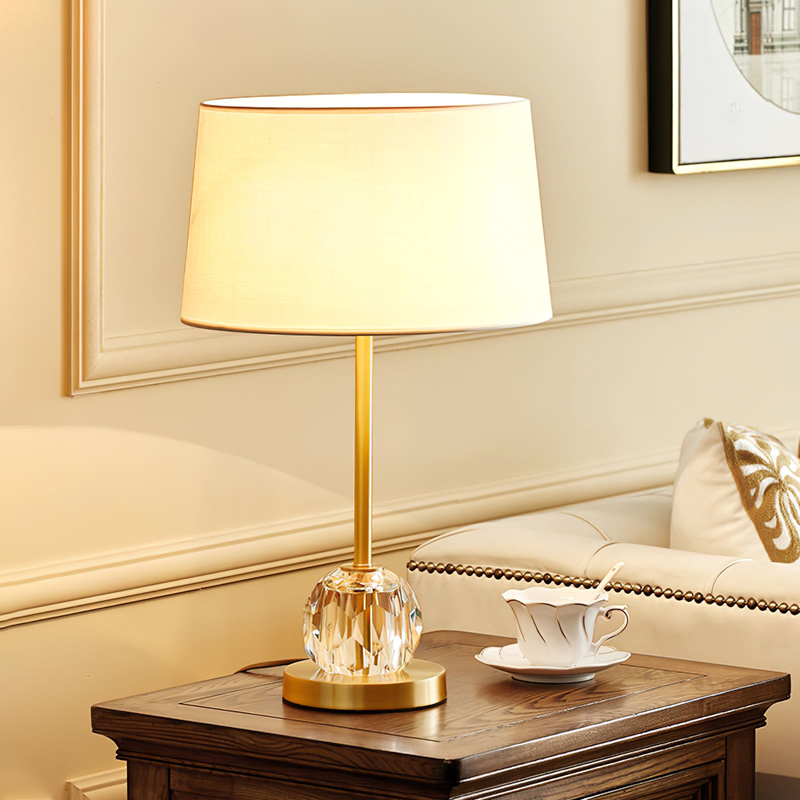 Square-type cotton shade is ultra-chic with a stunning crystal base and brass gold finish, This table lamp set works beautifully by the bedside on a nightstand, console table, in the home office, living room, or dining area.