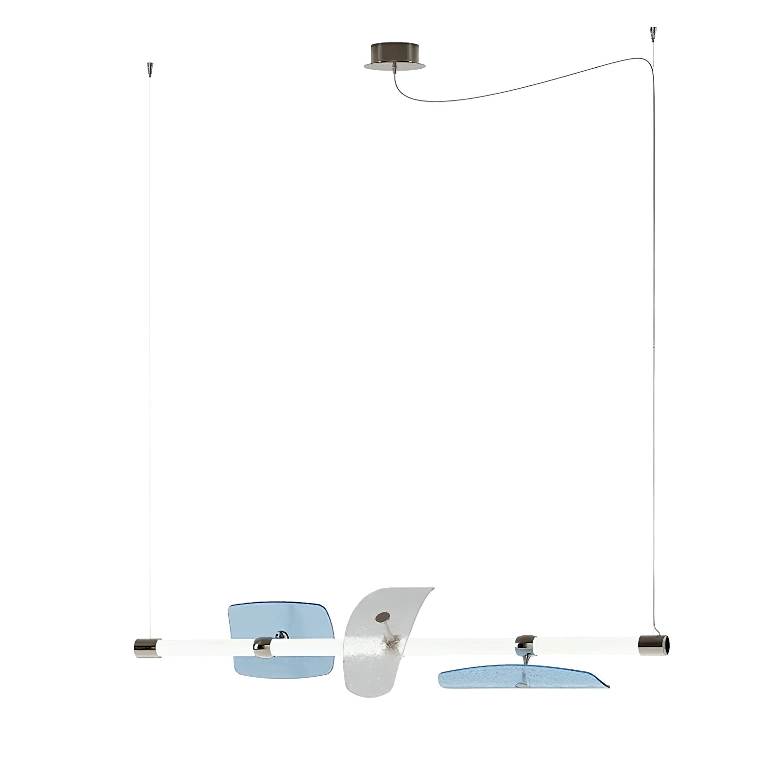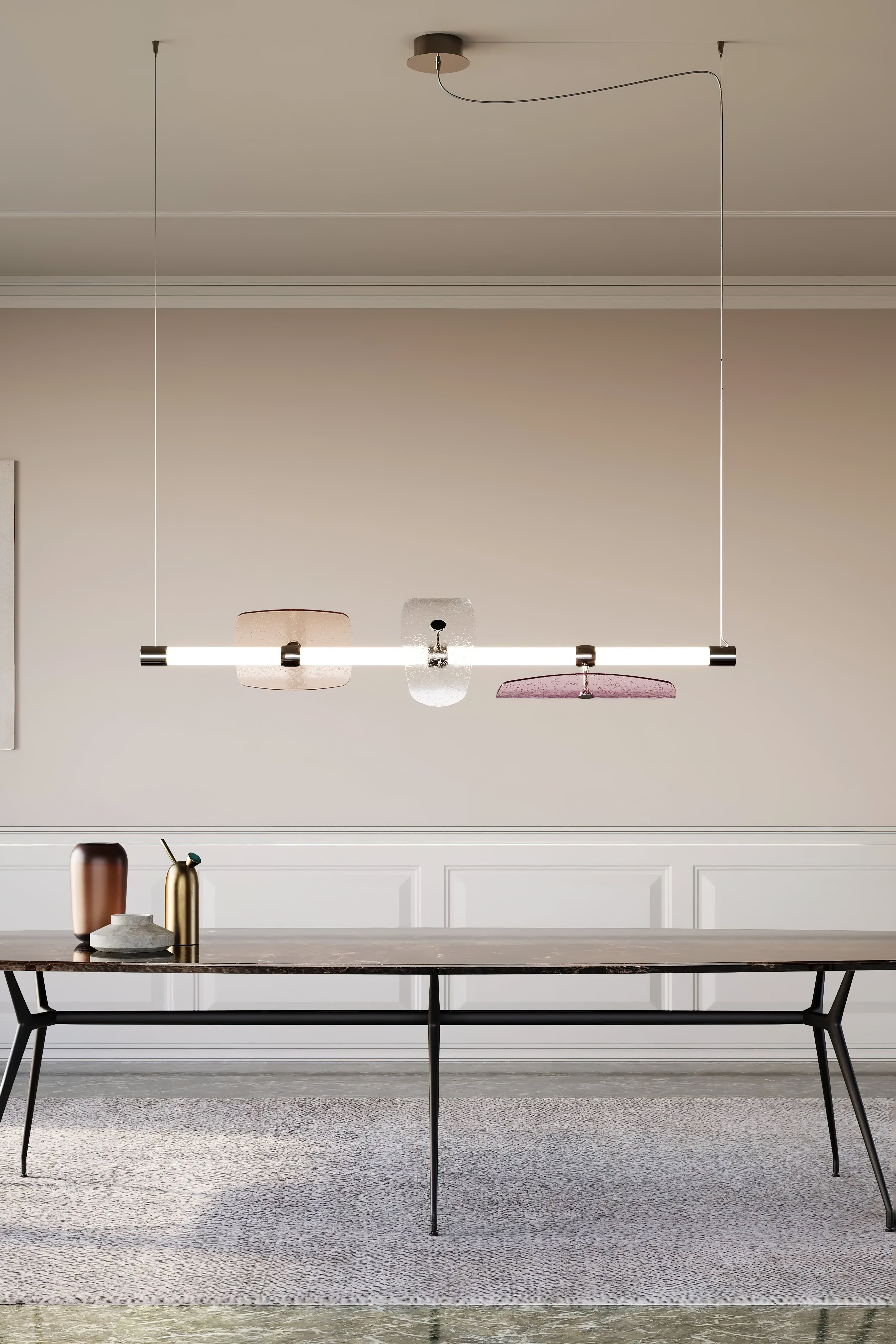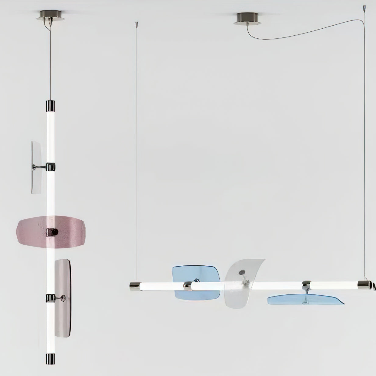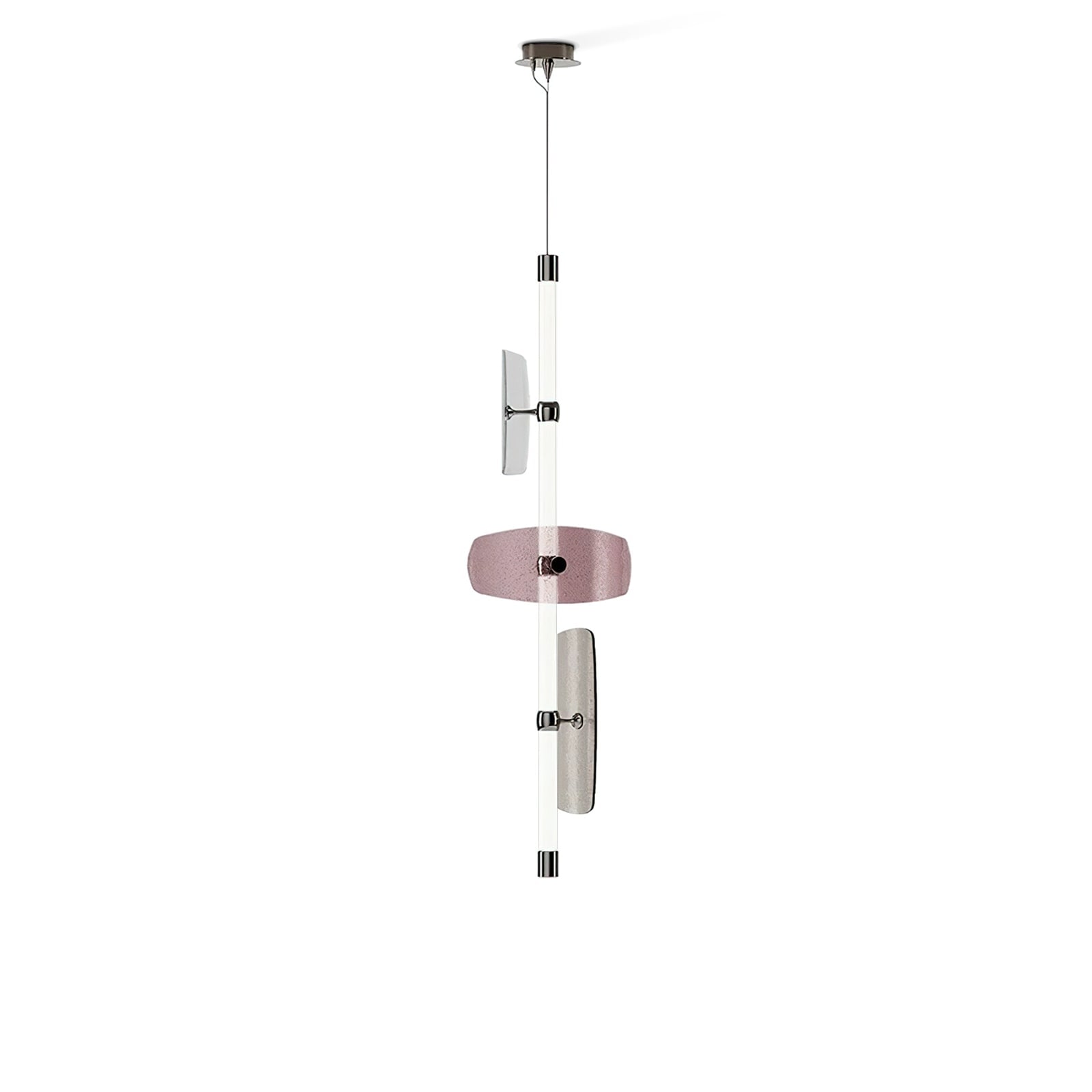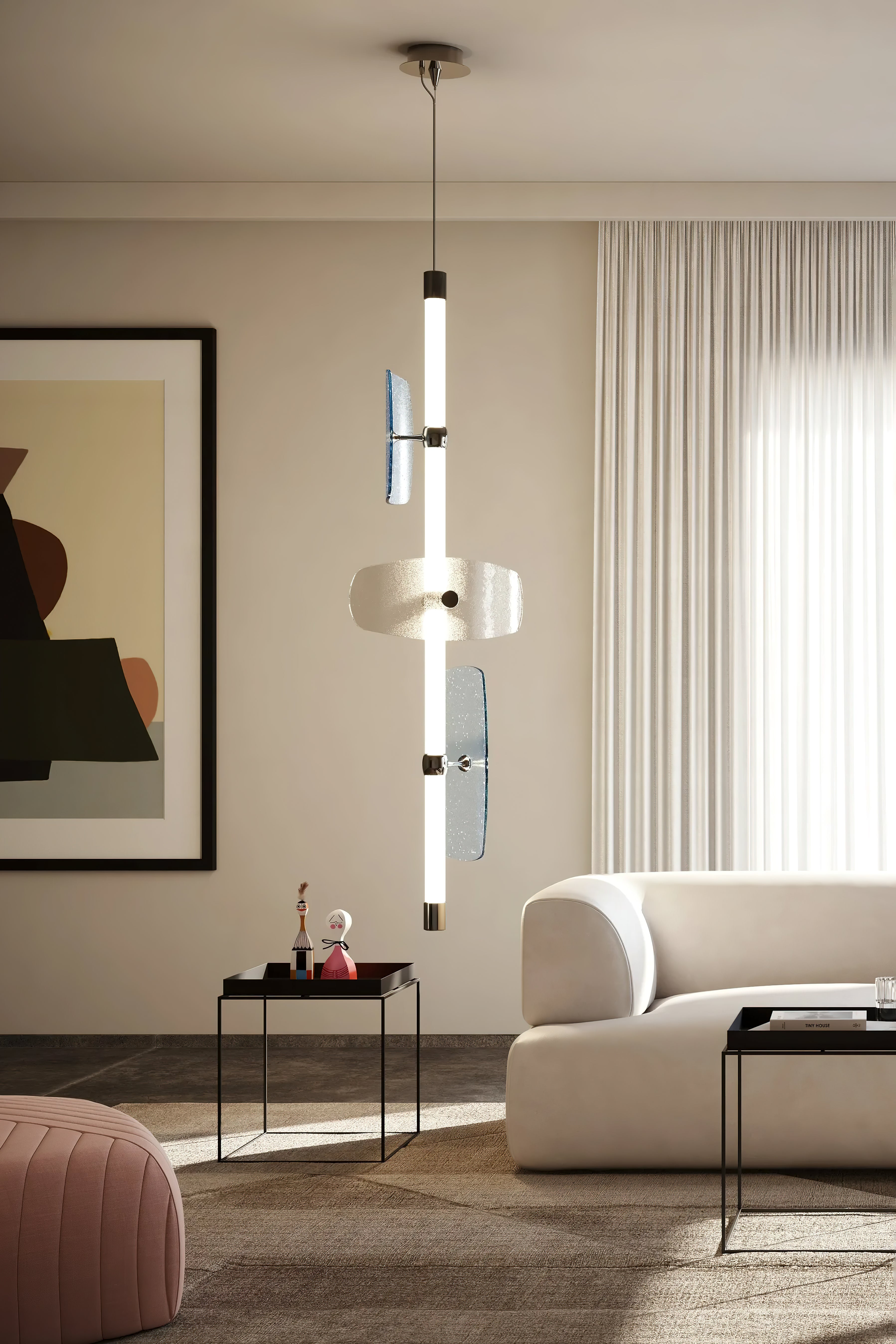 The Colorful Pendant Lamp is a statement piece with a "retro-futuristic" aesthetic. Crafted with white borosilicate glass, it features an LED light source surrounded by metal elements and colorful art glass components. The curved texture of the glass filters the light while creating a stunning design around its central element.