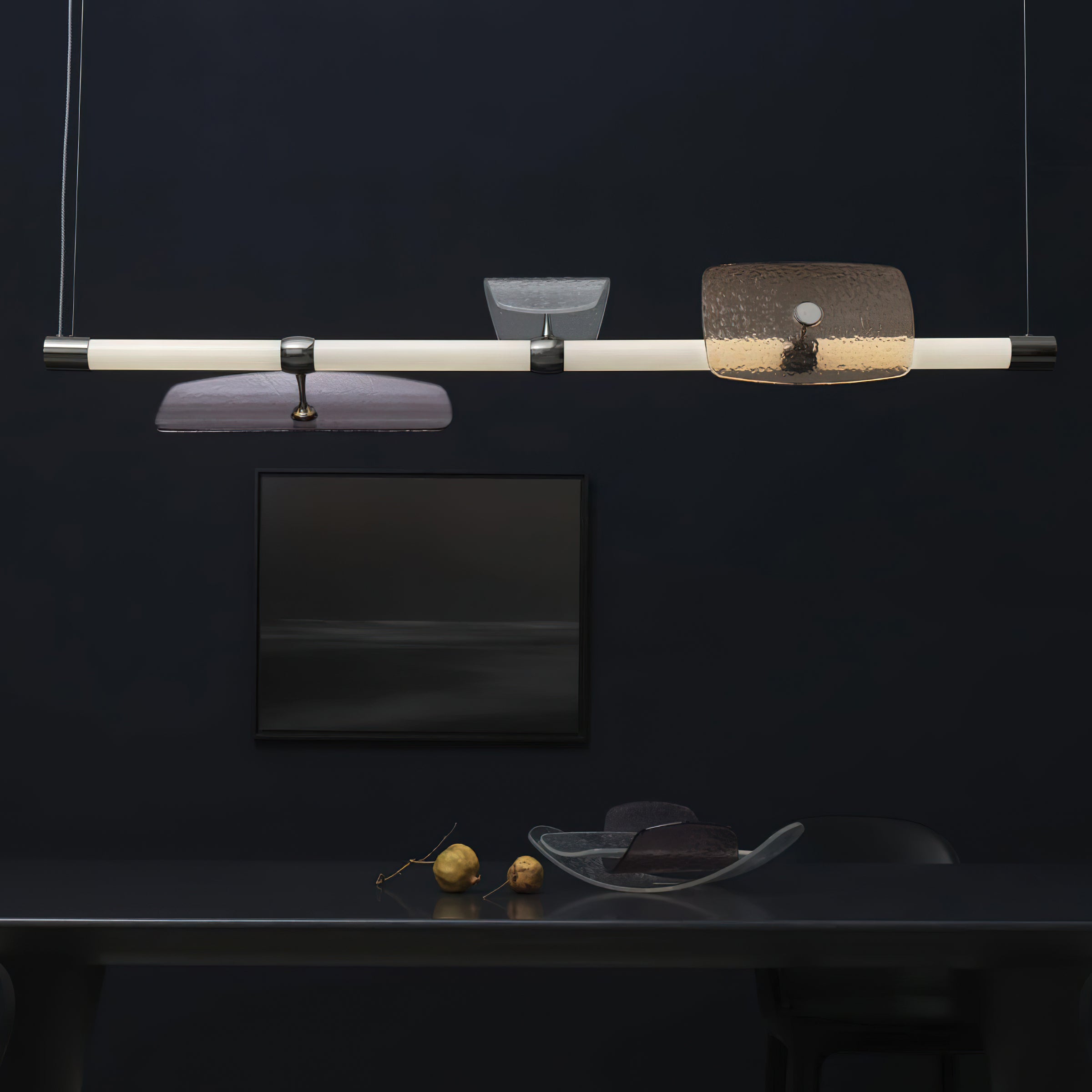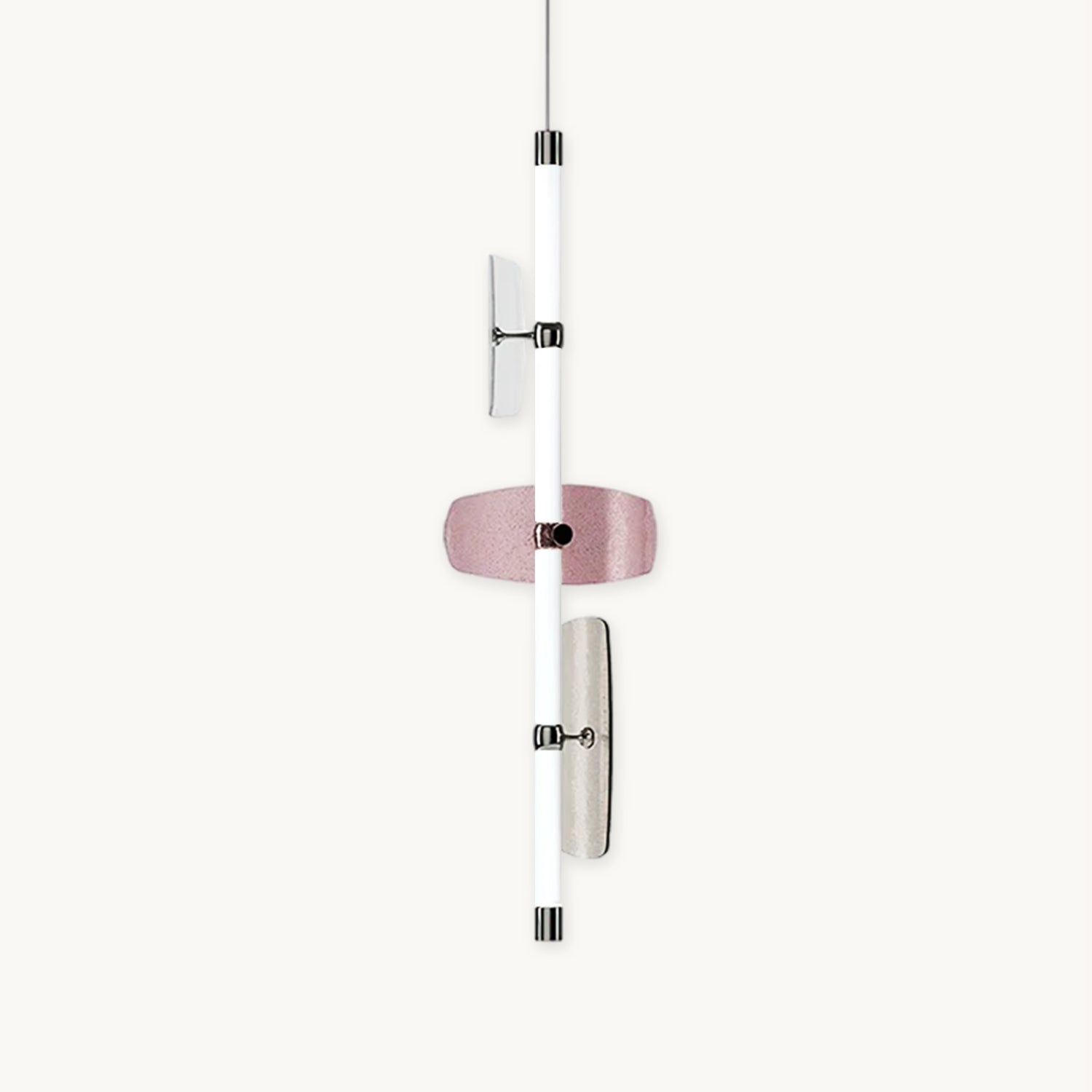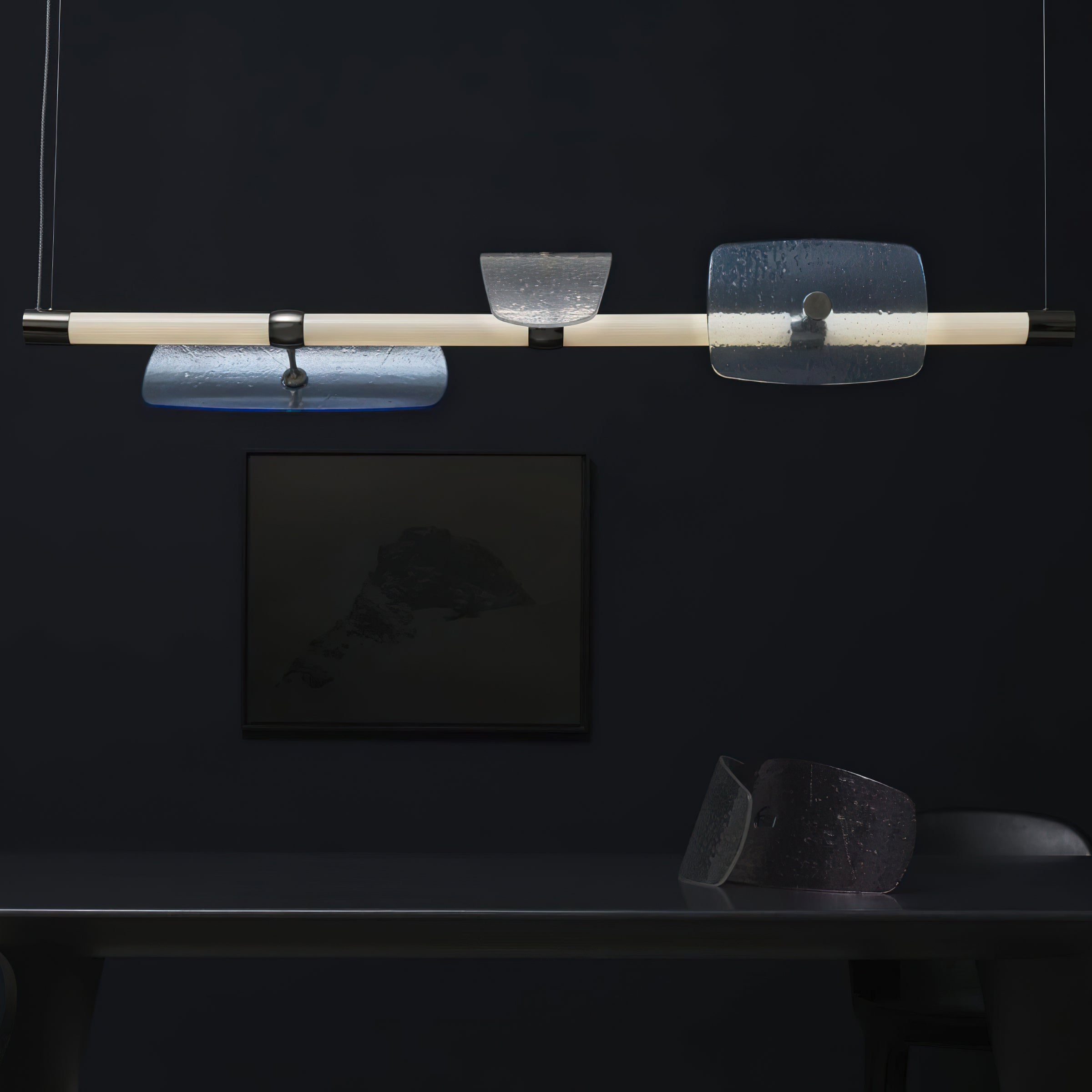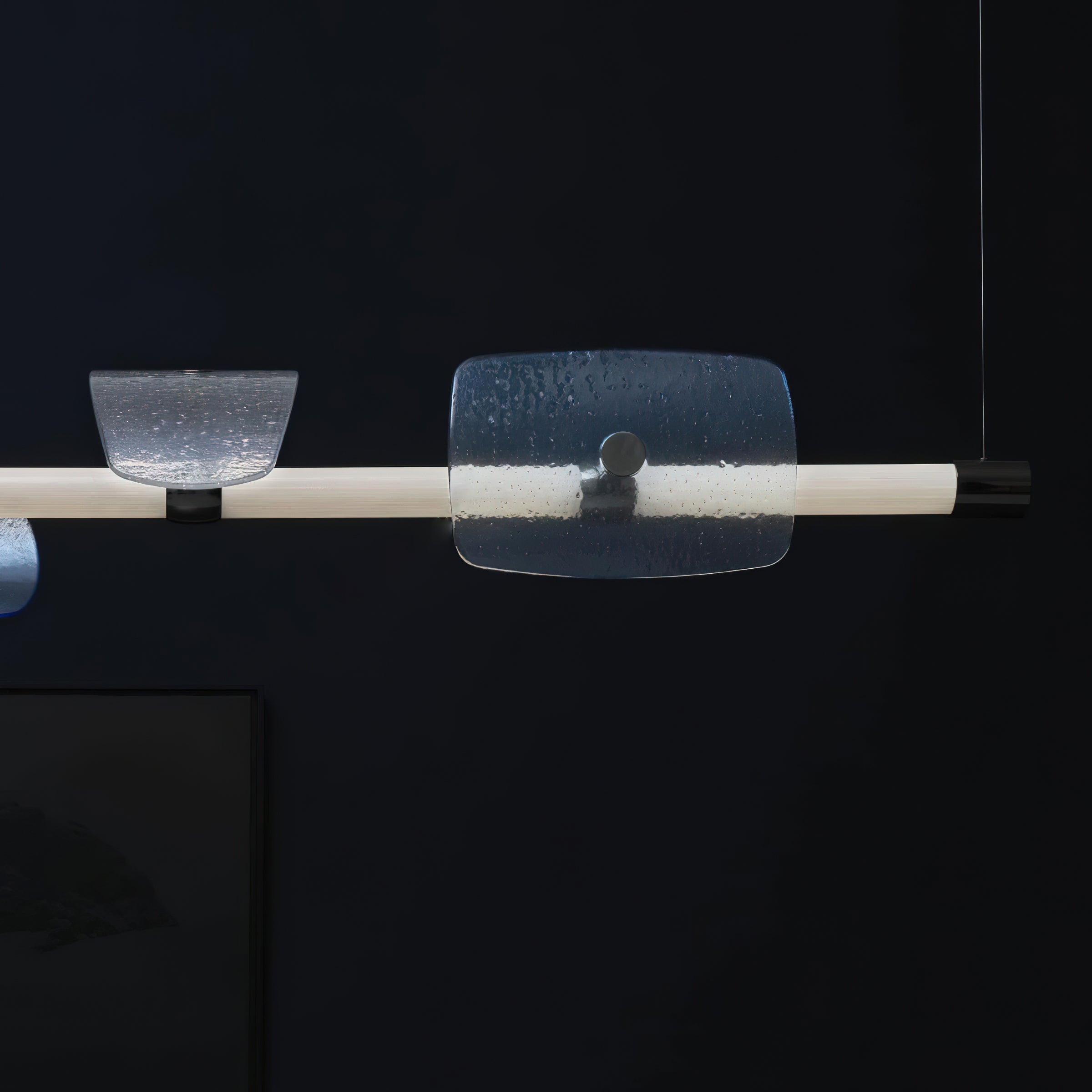 The Colorful Pendant Lamp is a statement piece with a "retro-futuristic" aesthetic. Crafted with white borosilicate glass, it features an LED light source surrounded by metal elements and colorful art glass components. The curved texture of the glass filters the light while creating a stunning design around its central element.