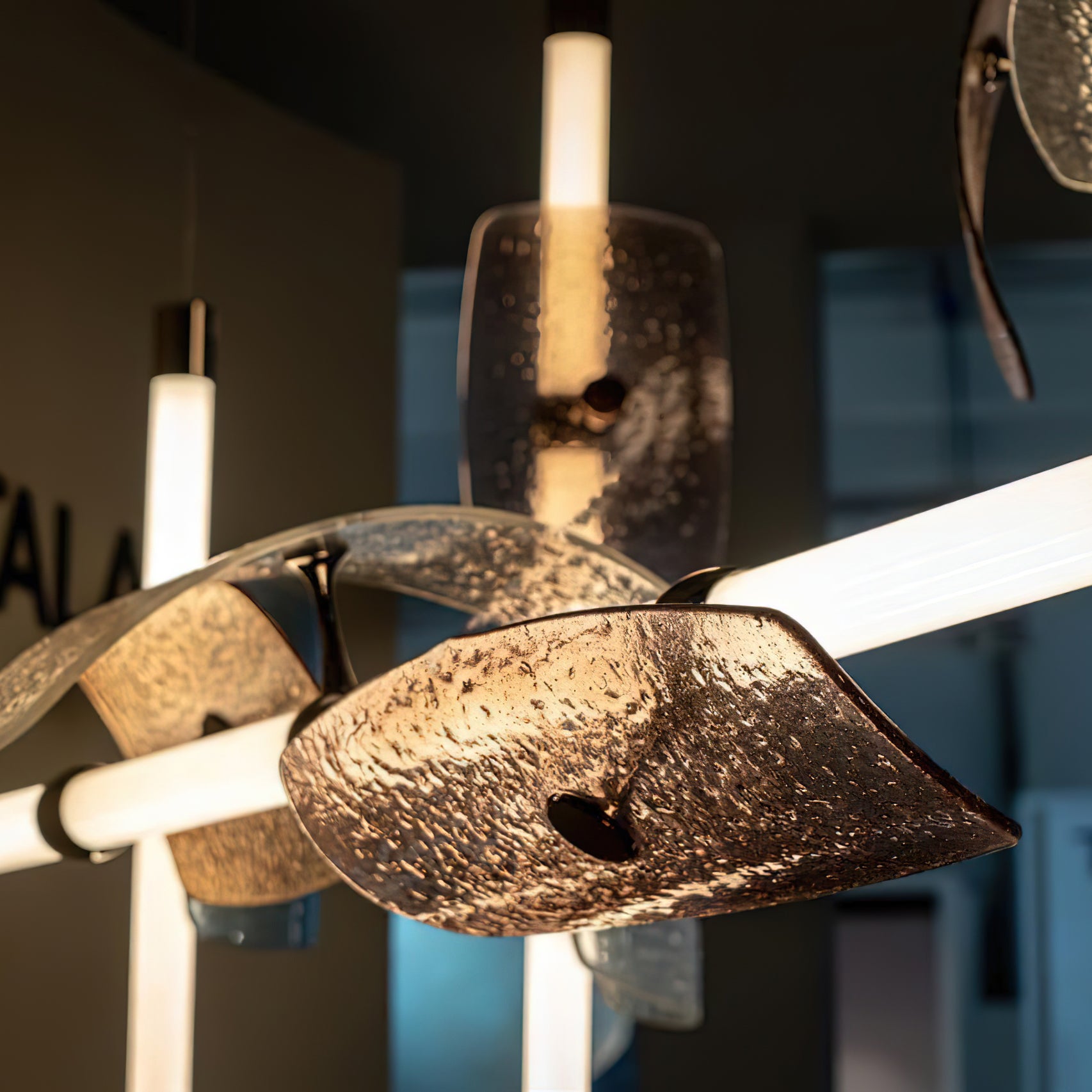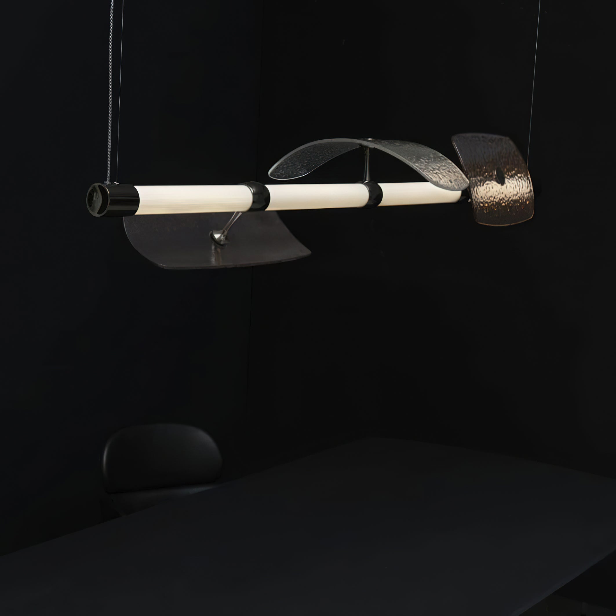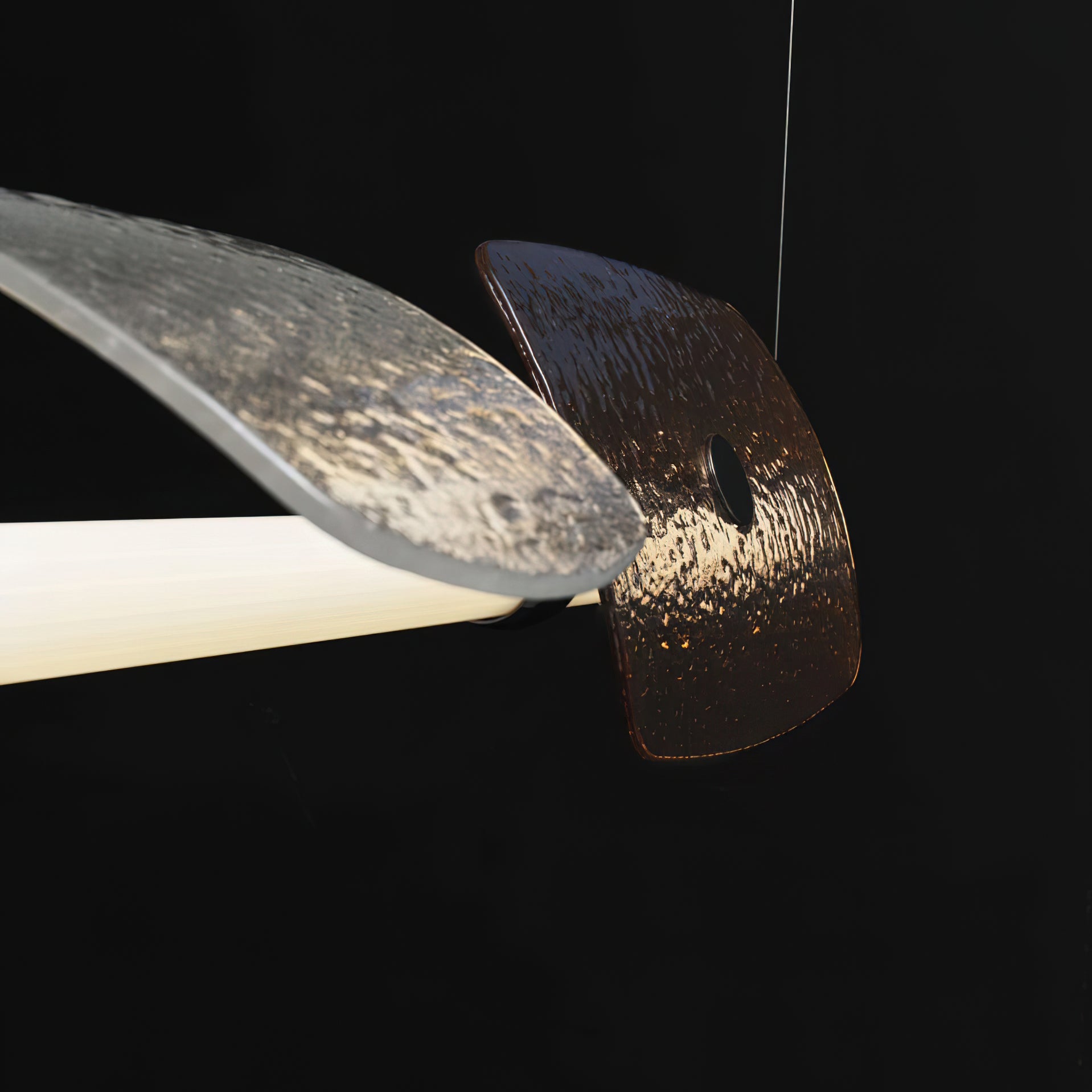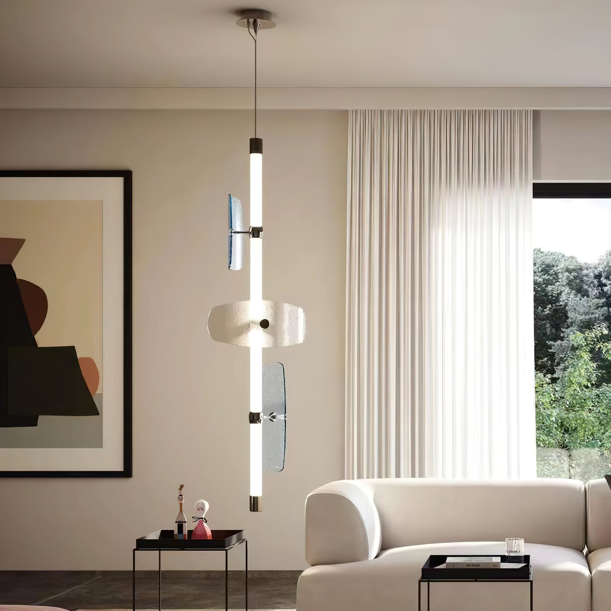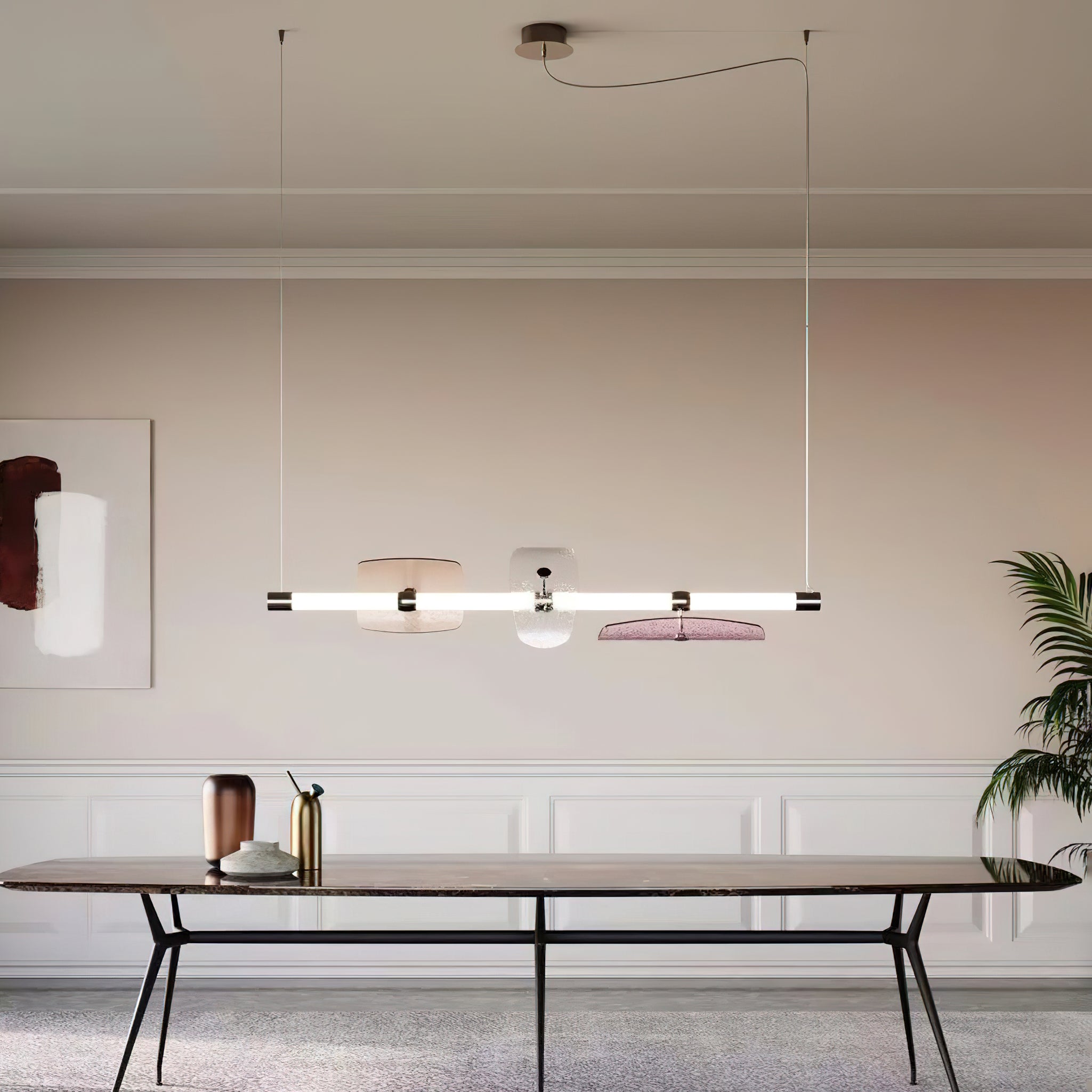 The Colorful Pendant Lamp is a statement piece with a "retro-futuristic" aesthetic. Crafted with white borosilicate glass, it features an LED light source surrounded by metal elements and colorful art glass components. The curved texture of the glass filters the light while creating a stunning design around its central element.