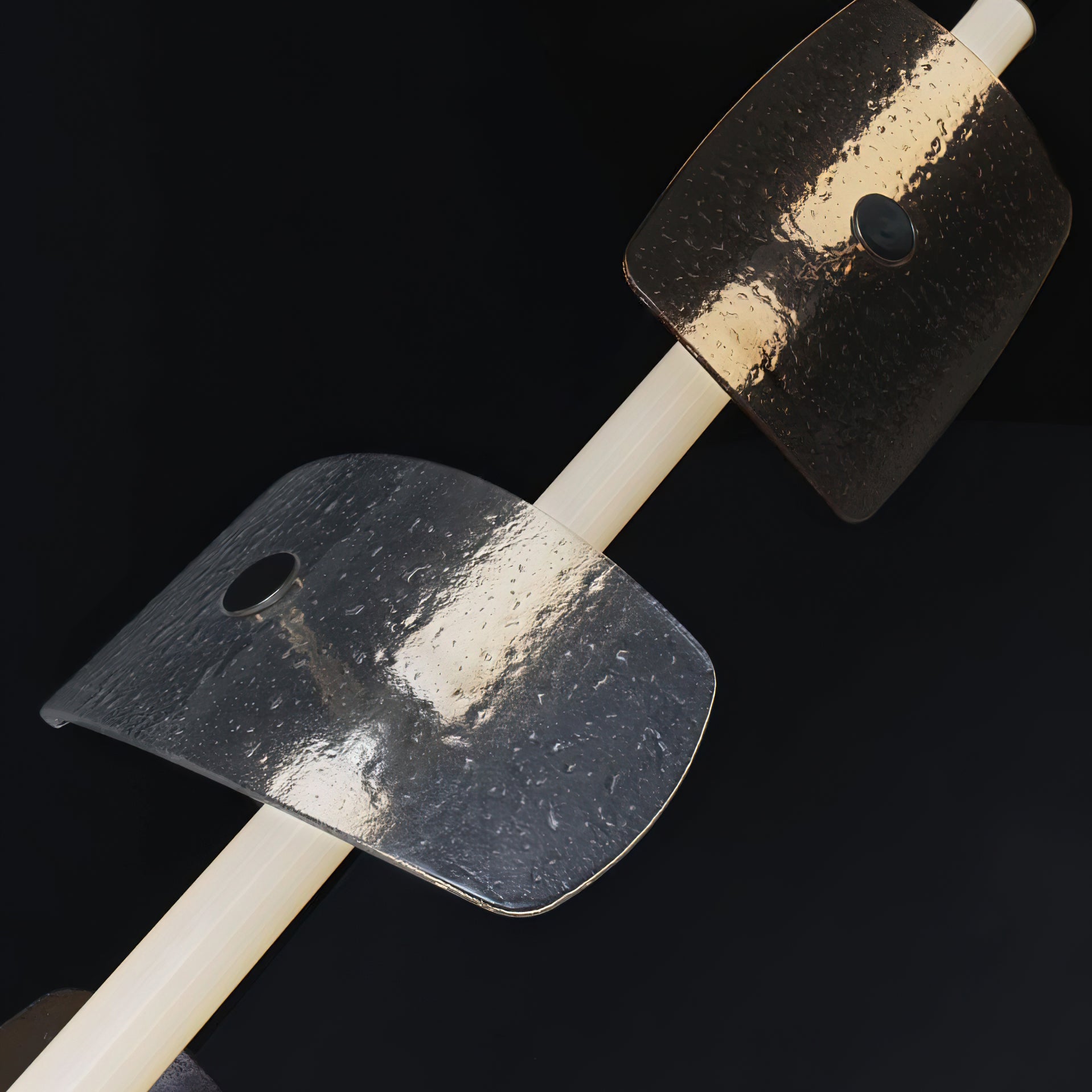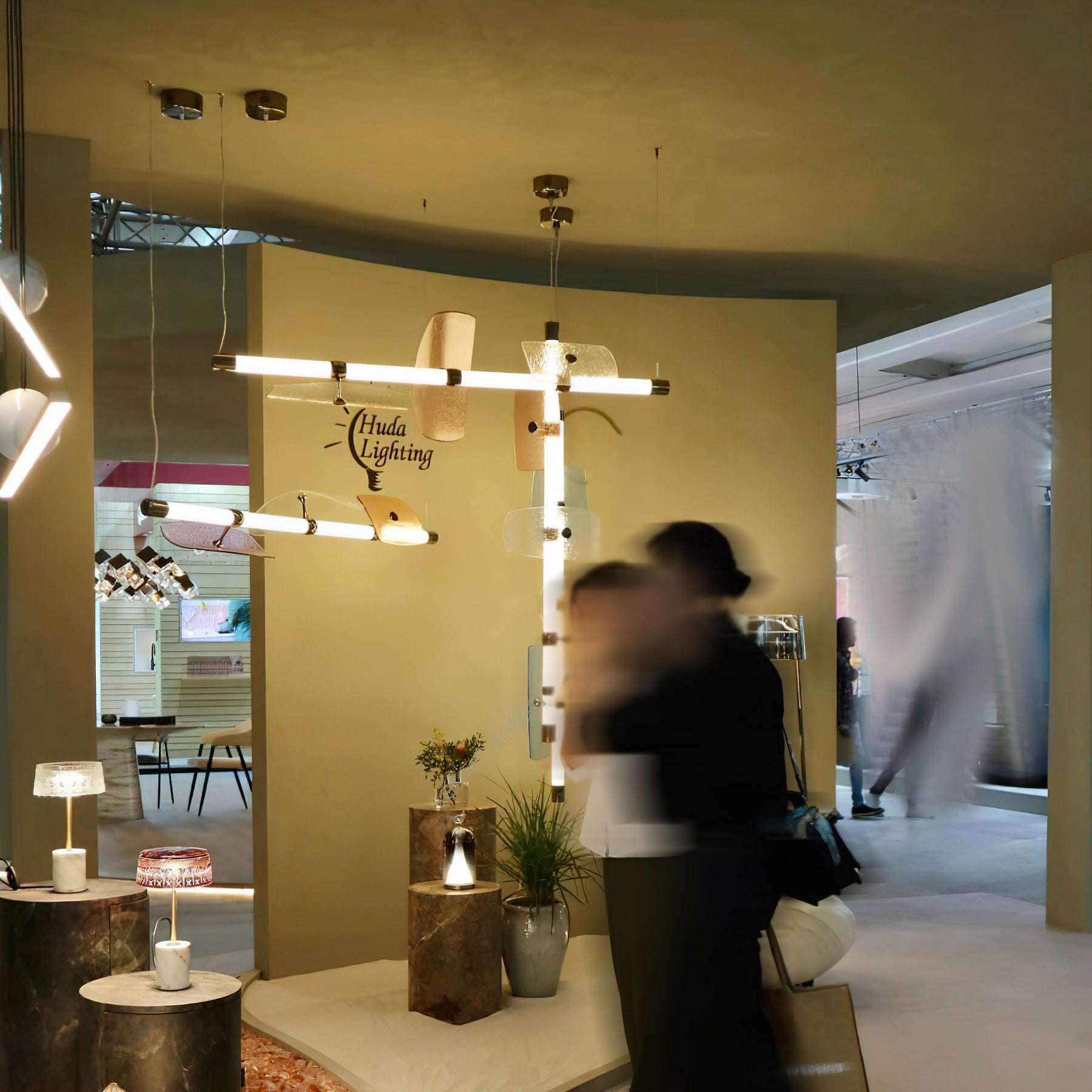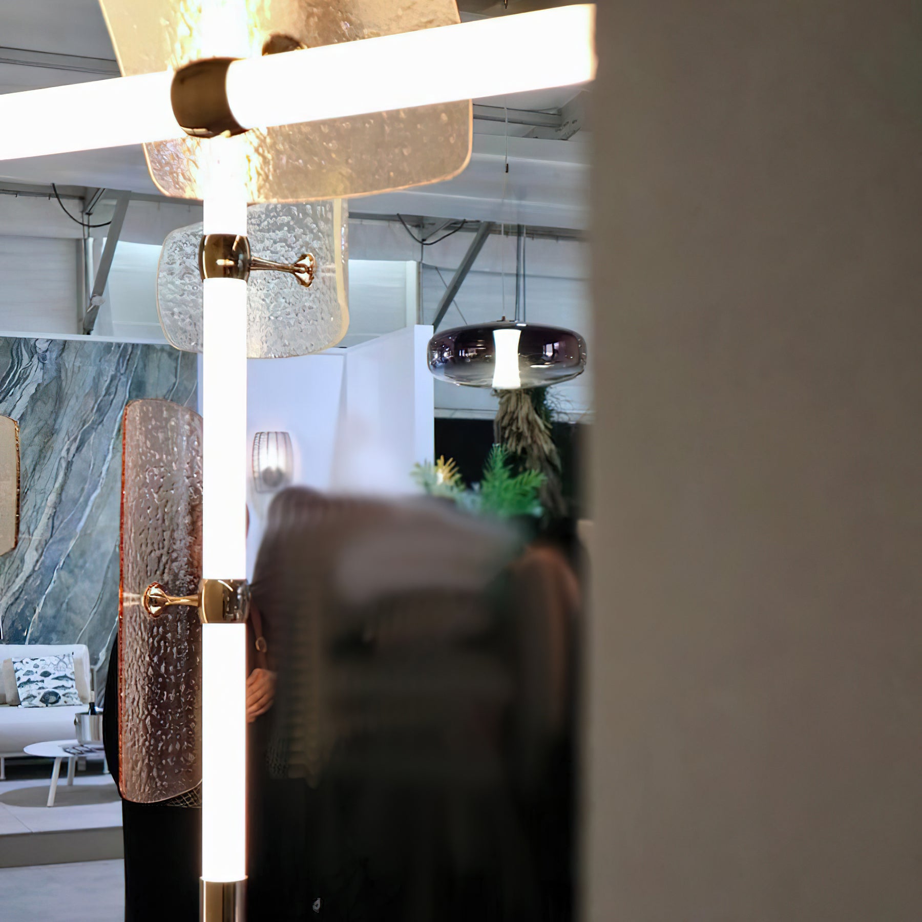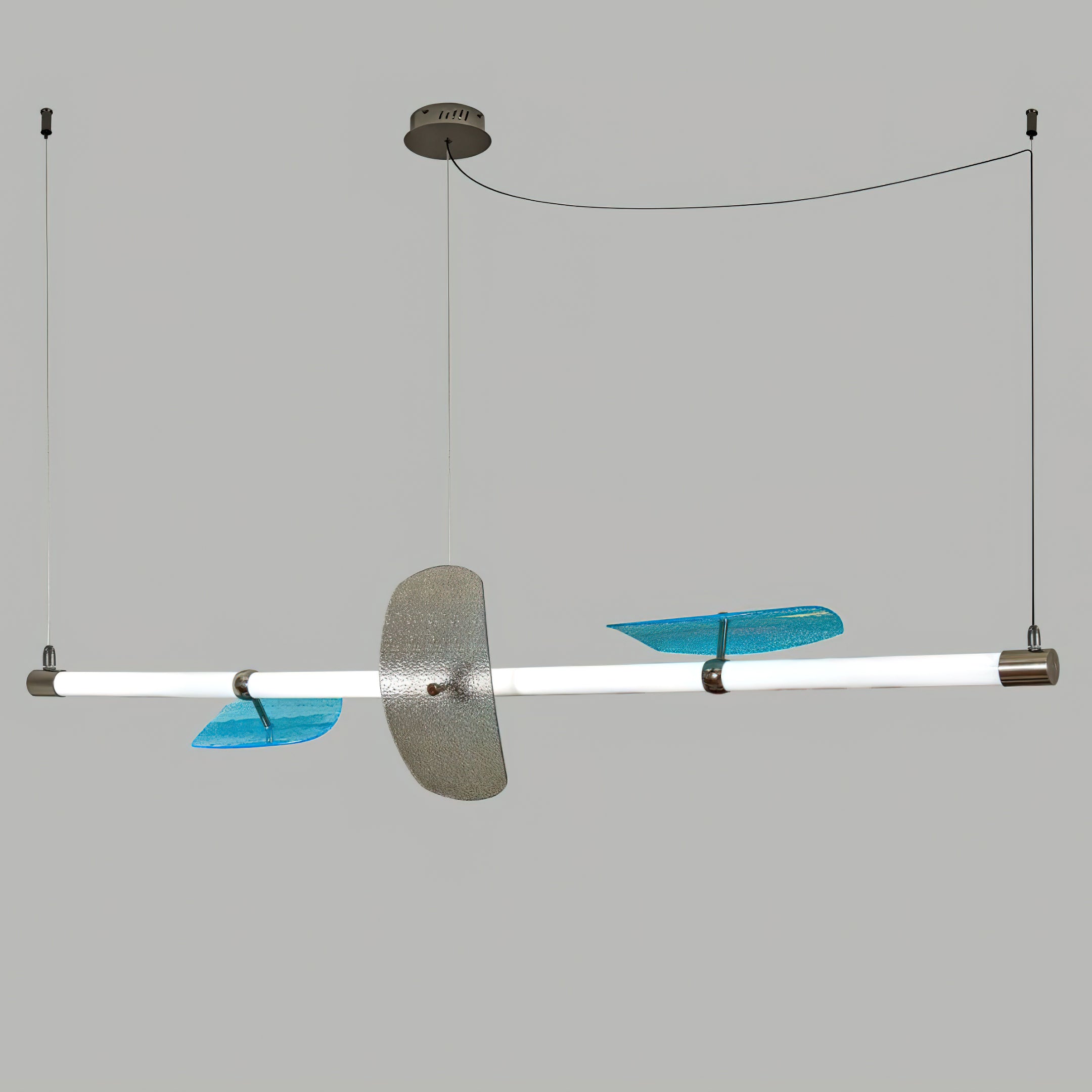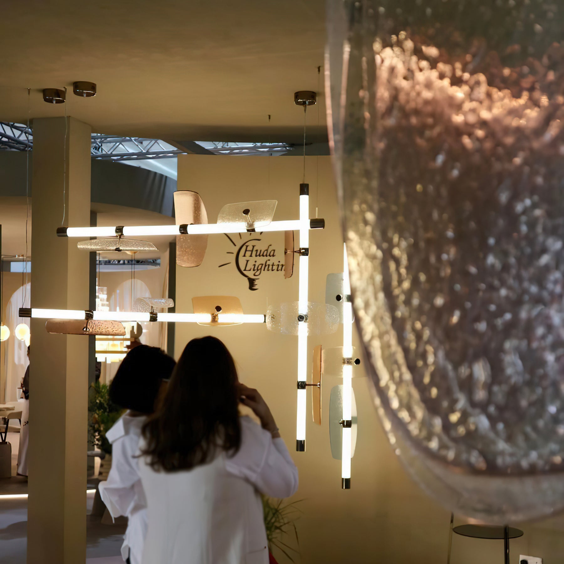 The Colorful Pendant Lamp is a statement piece with a "retro-futuristic" aesthetic. Crafted with white borosilicate glass, it features an LED light source surrounded by metal elements and colorful art glass components. The curved texture of the glass filters the light while creating a stunning design around its central element.