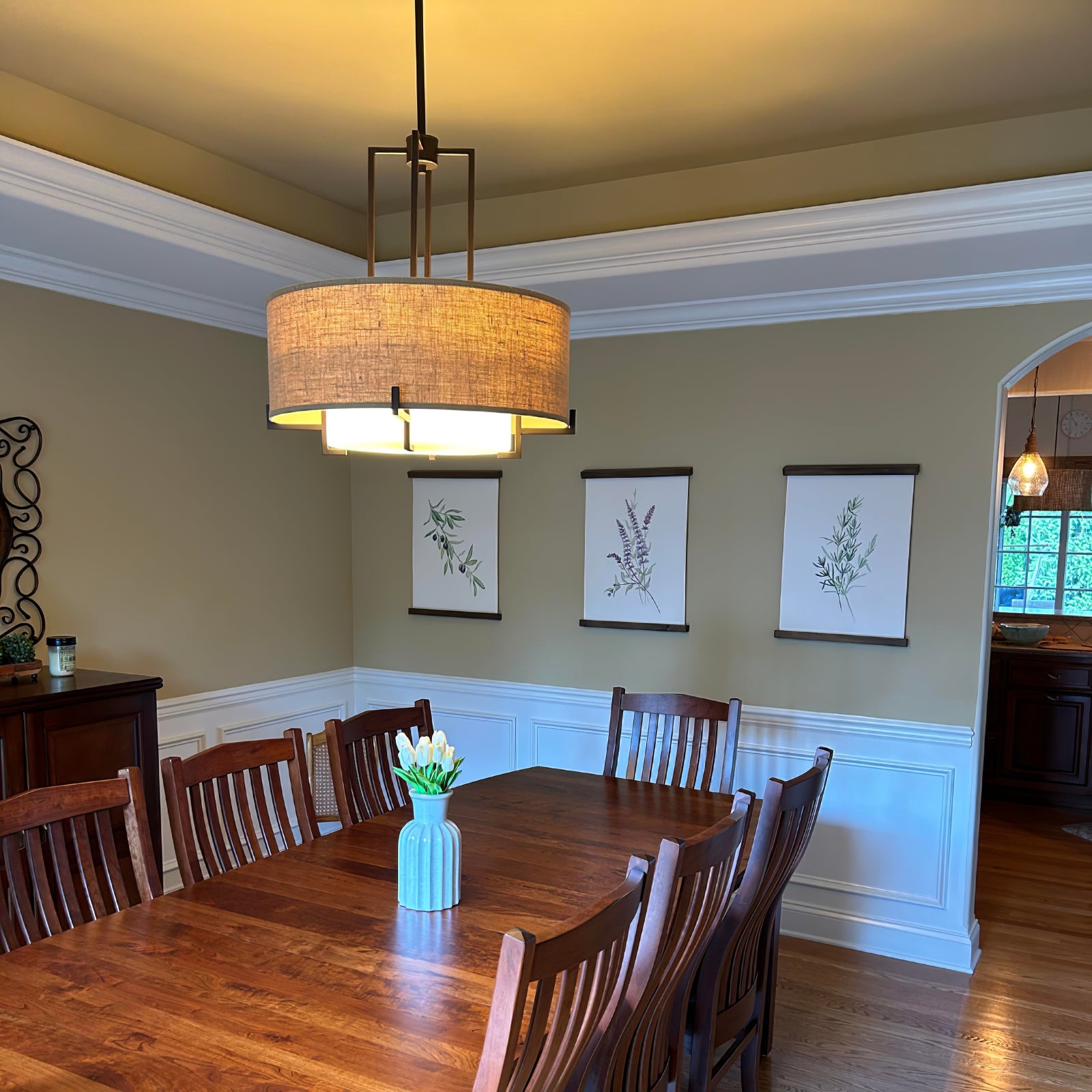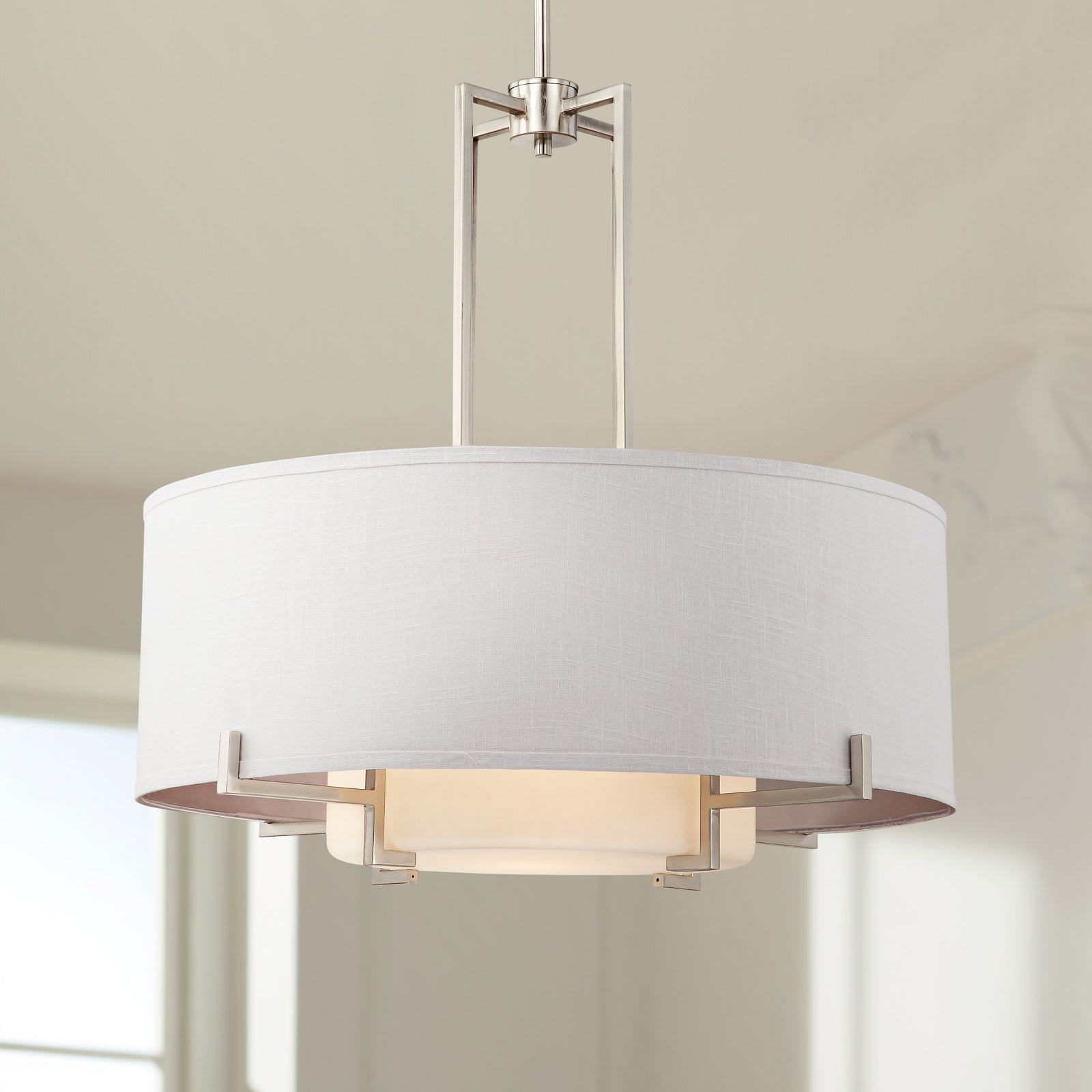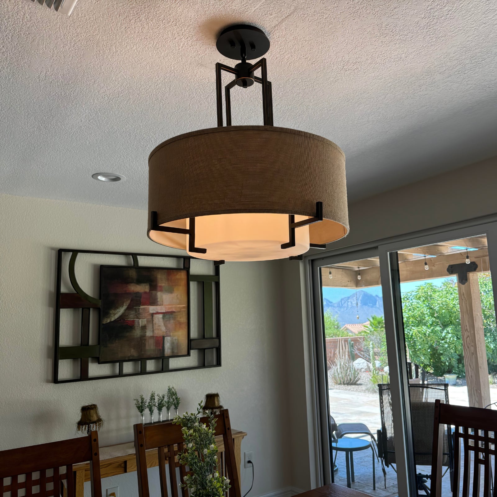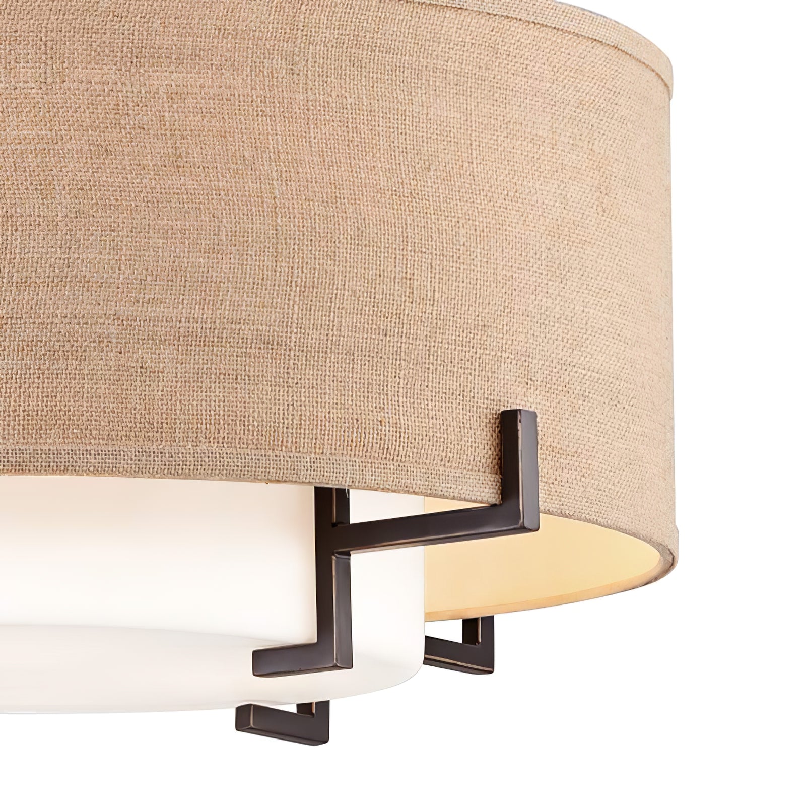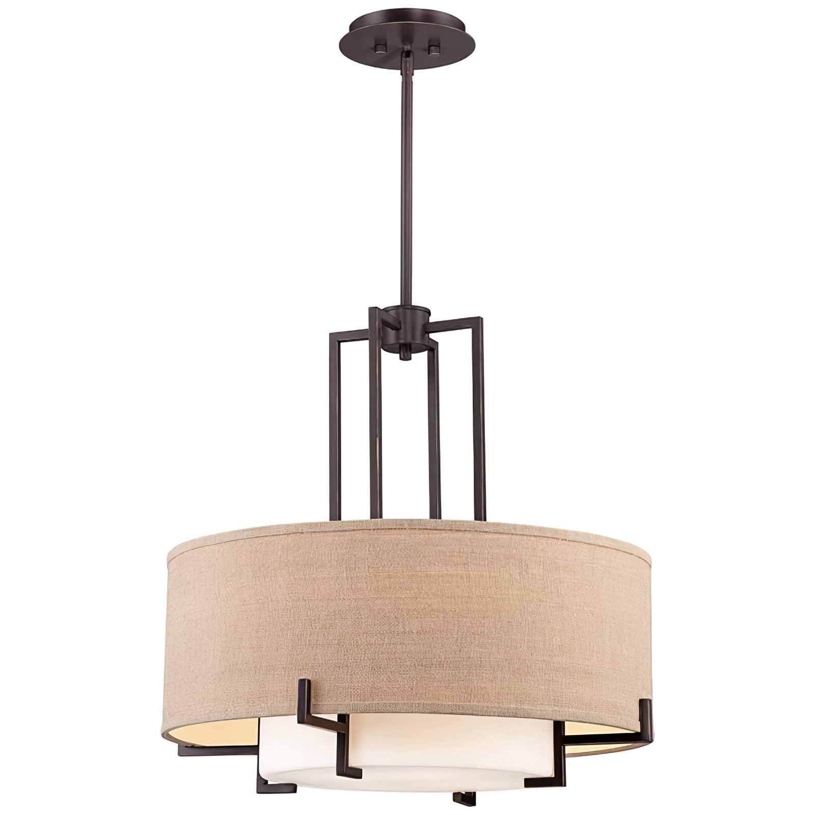 This Concentric Shade Layered Fabric Pendant Lamp showcases a harmonious blend of modern elegance and rustic charm. The design features a layered structure with a fabric drum shade in a natural beige tone, supported by a geometric metal frame in a deep bronze or blackened finish. The inner diffuser adds a soft, warm glow, ensuring even light distribution while minimizing glare, creating a cozy and inviting ambiance.