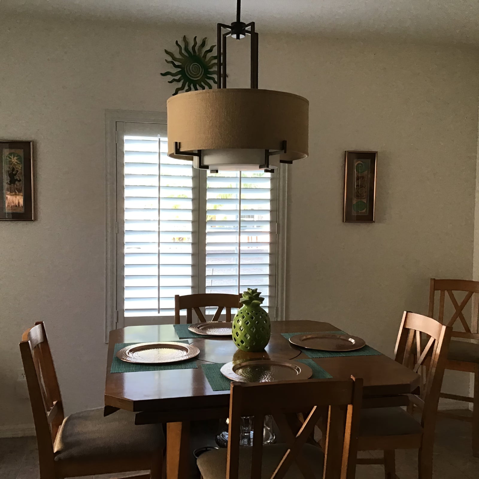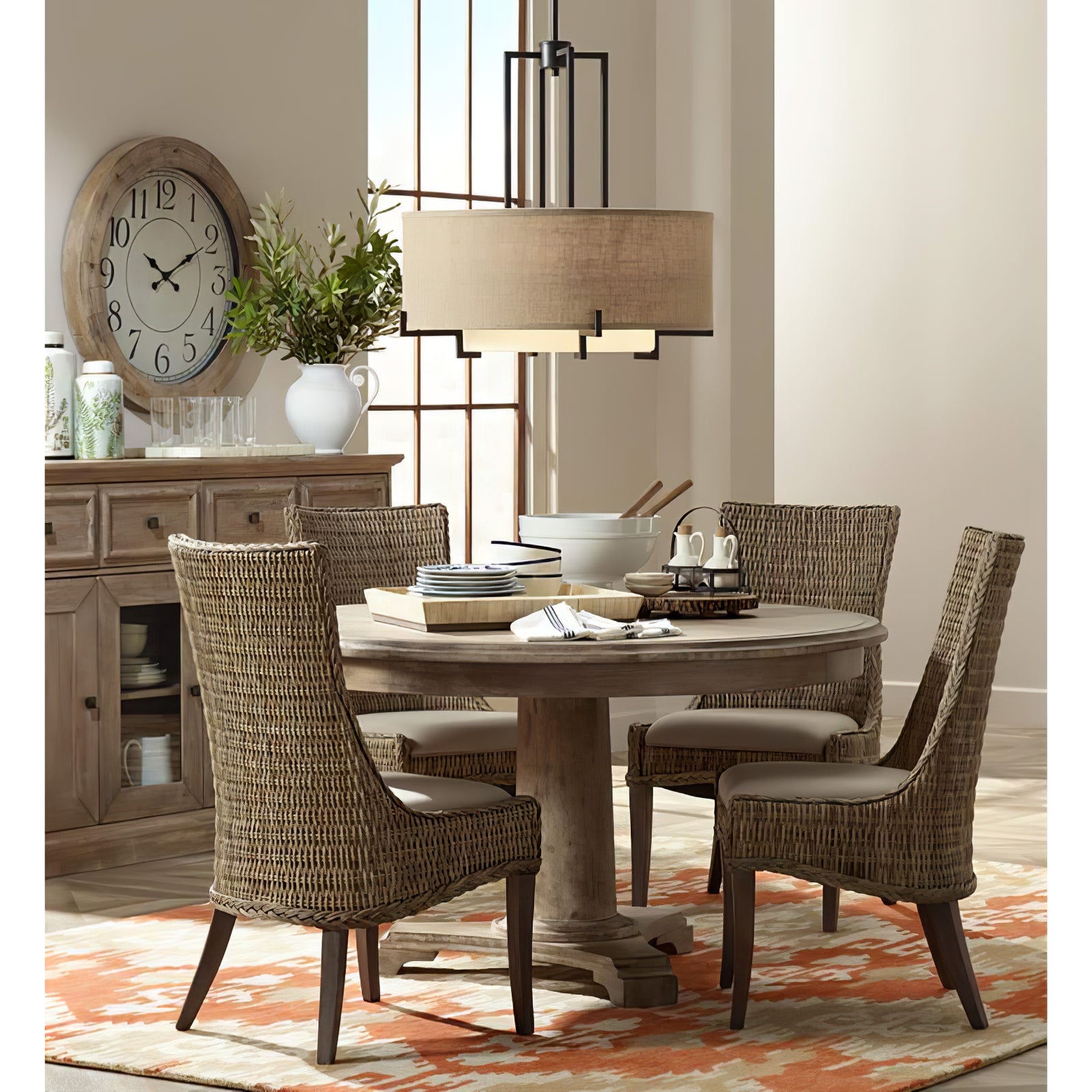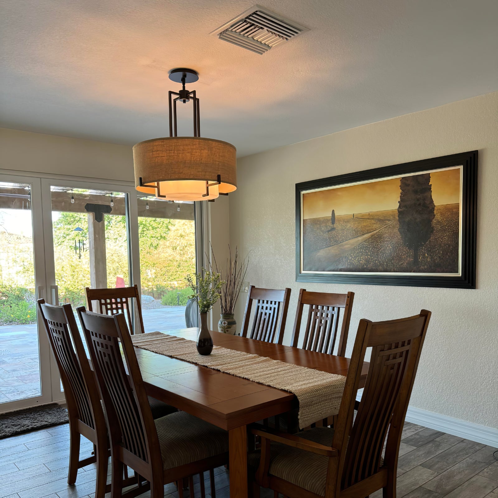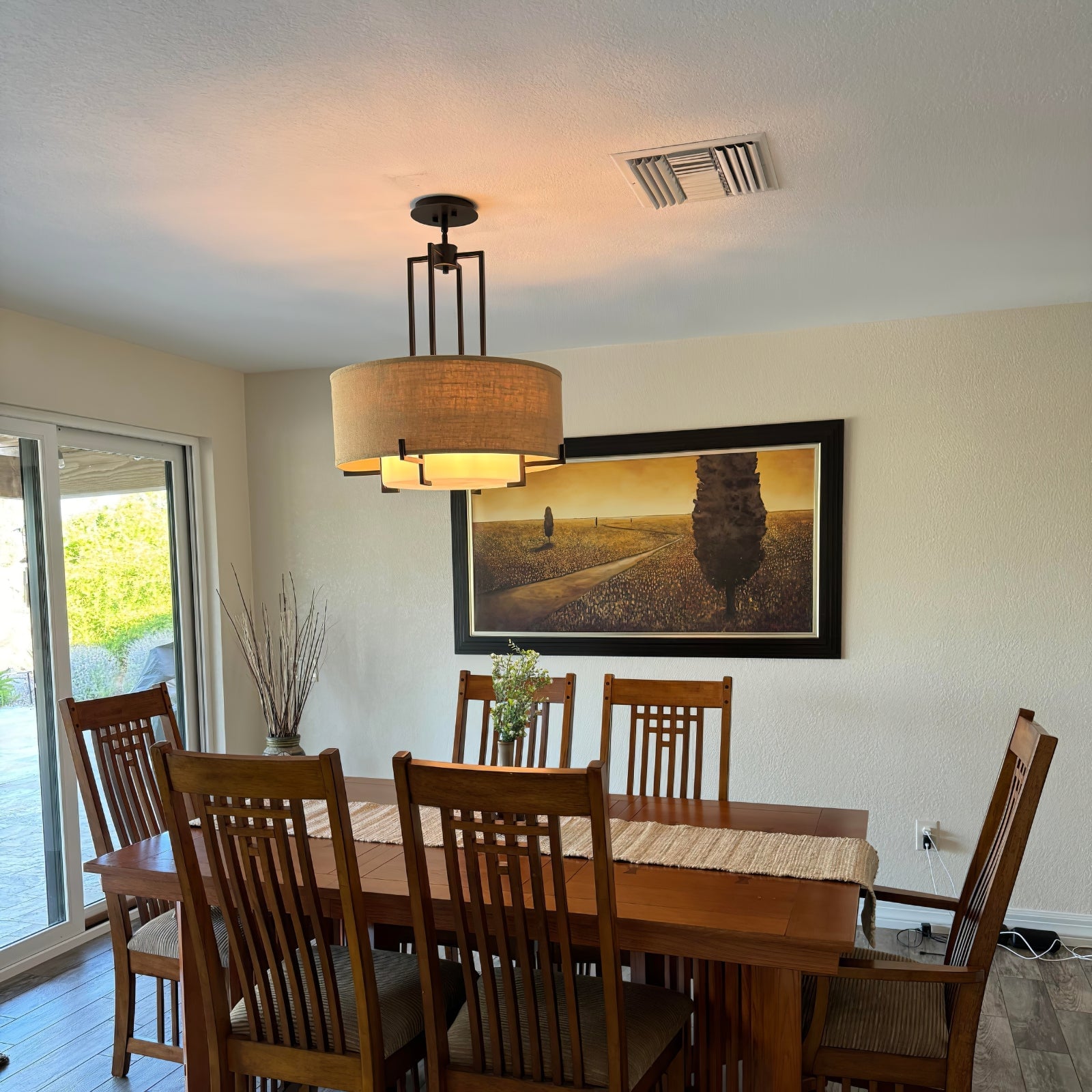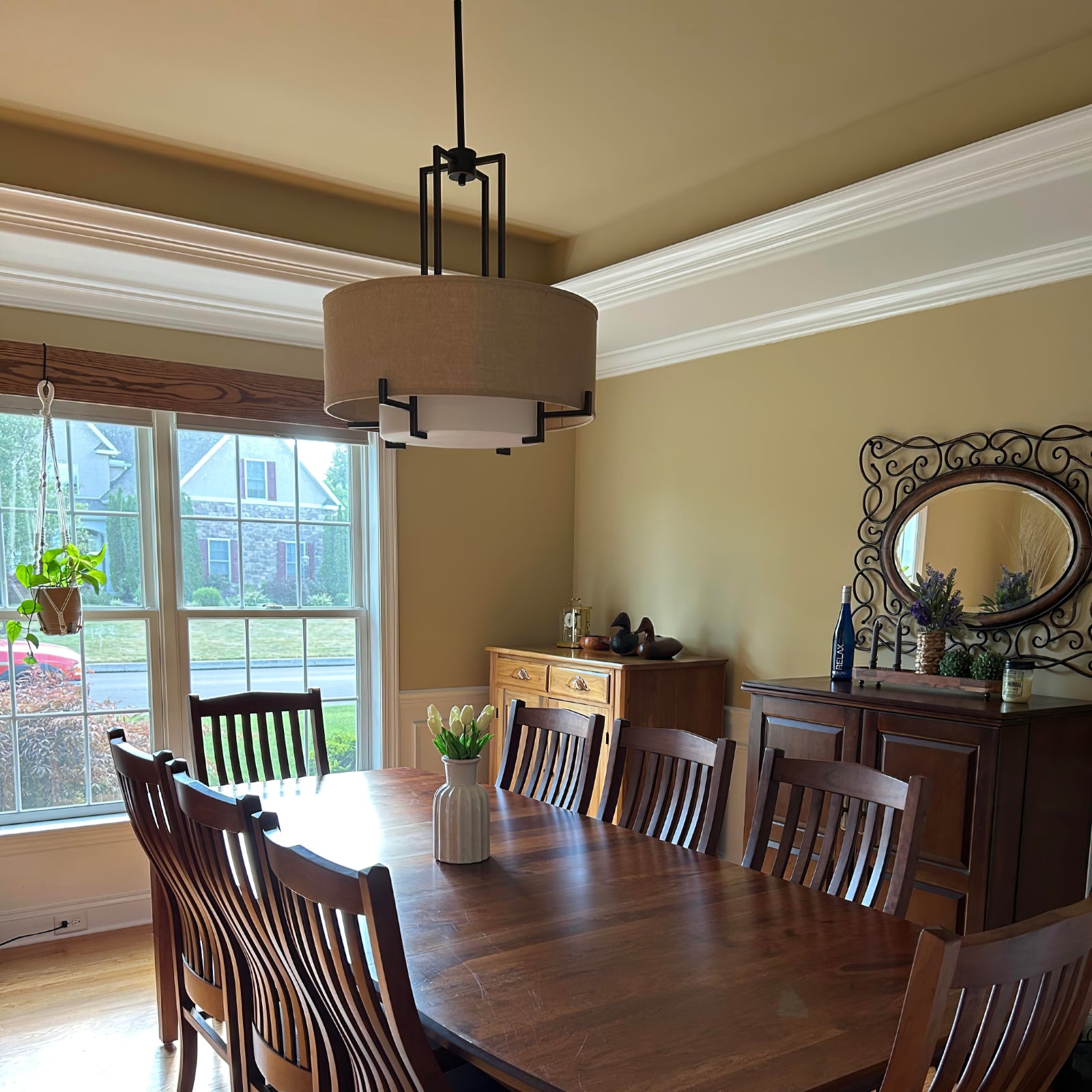 This Concentric Shade Layered Fabric Pendant Lamp showcases a harmonious blend of modern elegance and rustic charm. The design features a layered structure with a fabric drum shade in a natural beige tone, supported by a geometric metal frame in a deep bronze or blackened finish. The inner diffuser adds a soft, warm glow, ensuring even light distribution while minimizing glare, creating a cozy and inviting ambiance.