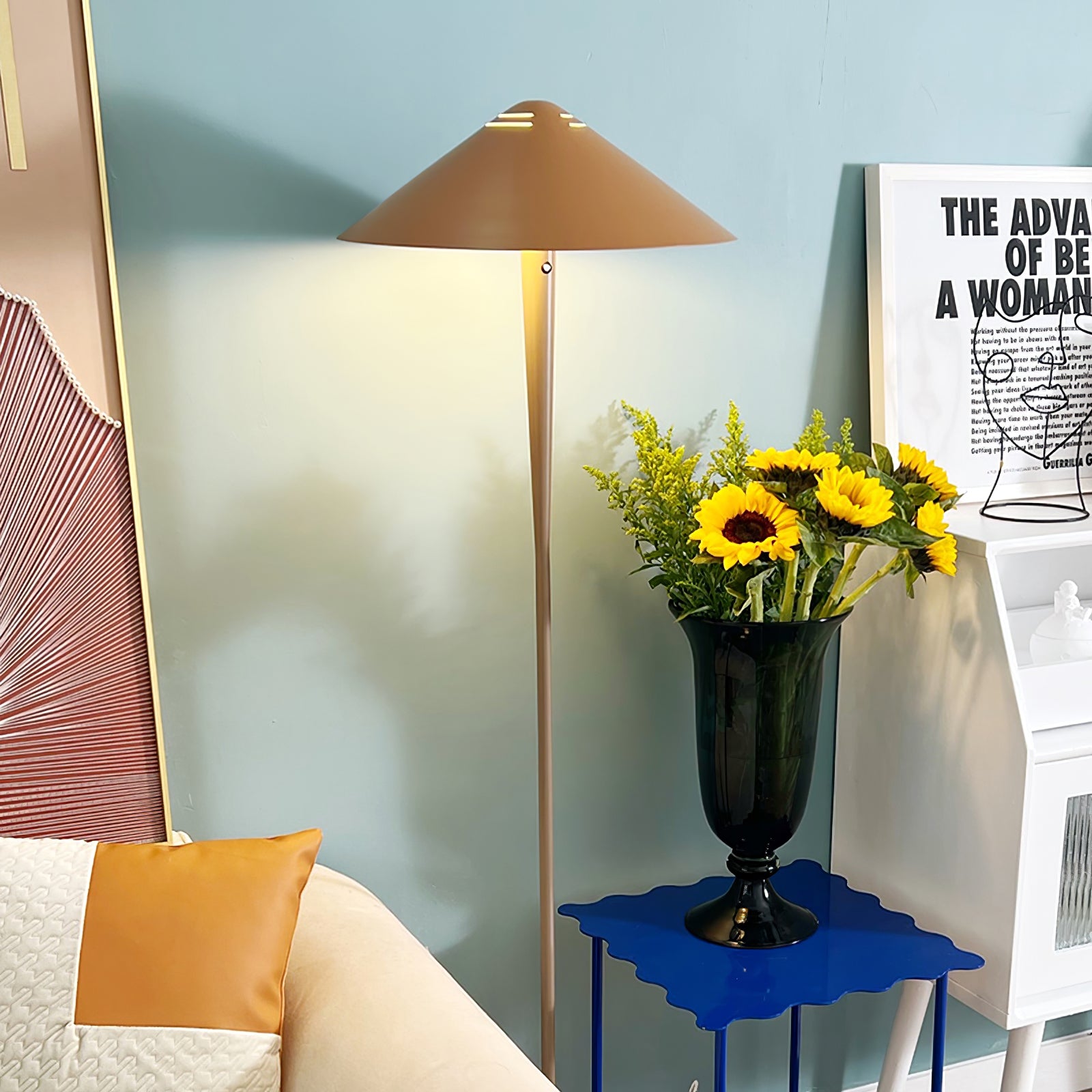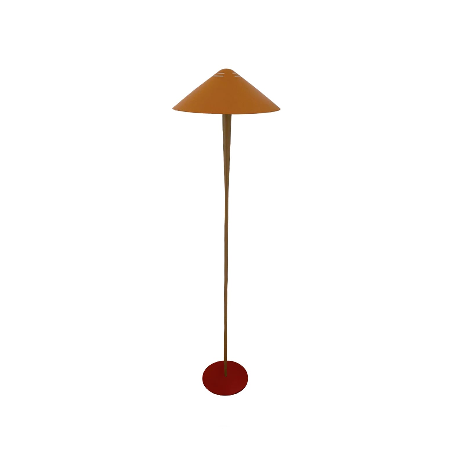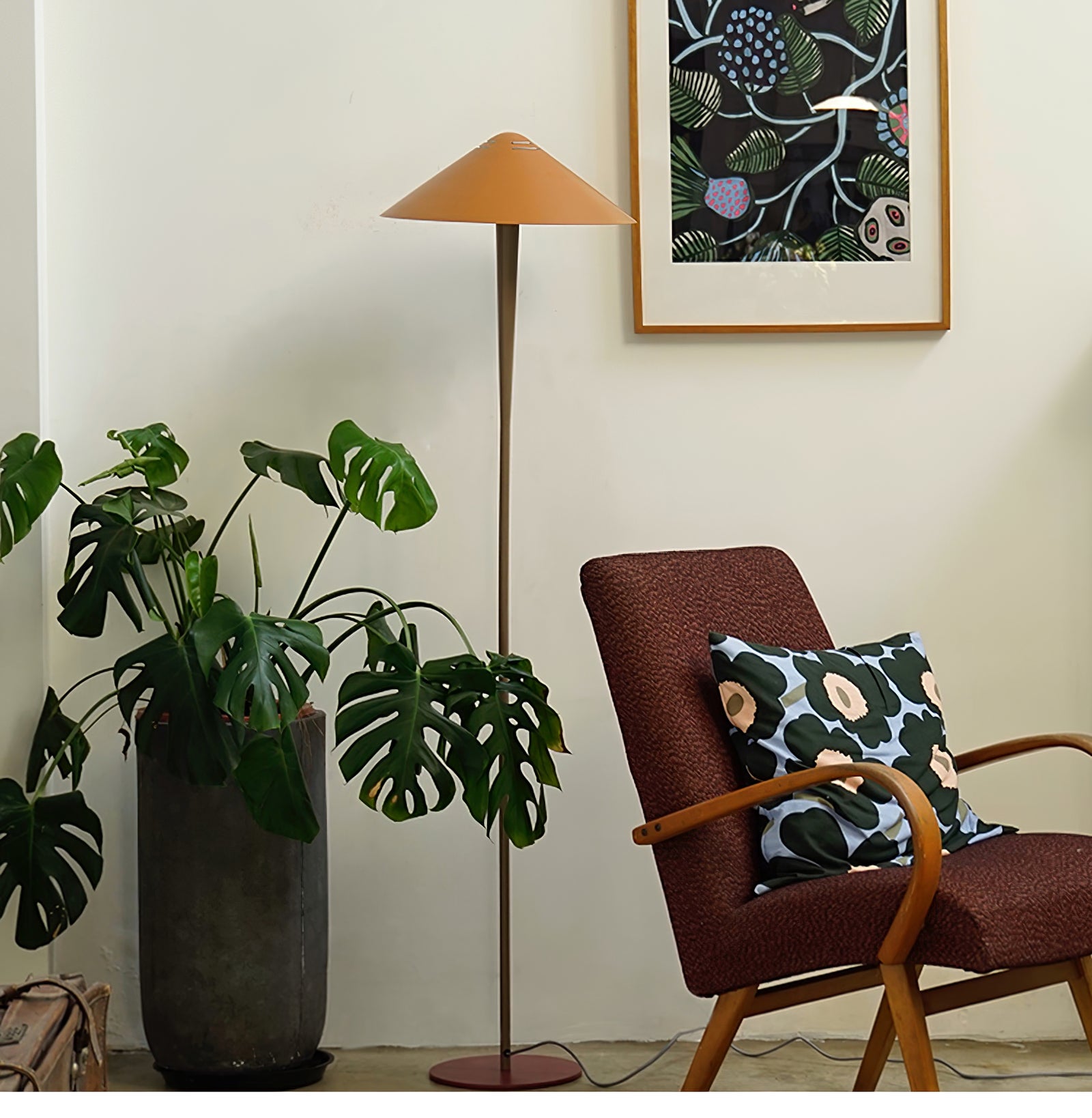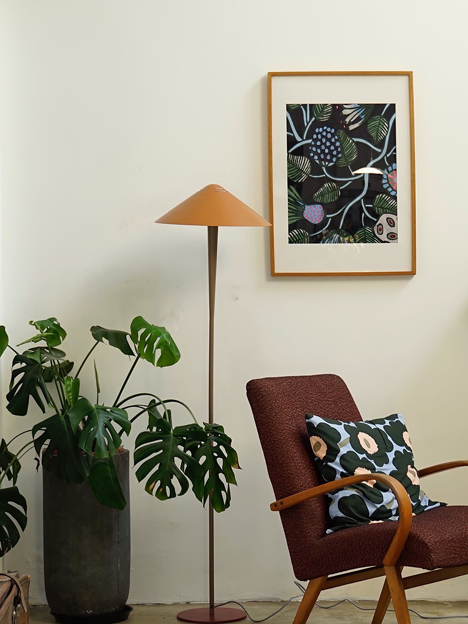 This Cone Shade Modern Floor Lamp features a sleek, minimalist design with a distinctive conical shade in a warm amber hue, adding a touch of retro charm. The slender pole subtly tapers as it reaches the shade, creating a balanced and elegant silhouette. A circular, red base provides a sturdy foundation while adding a bold pop of color that complements the shade. This floor lamp is ideal for modern or mid-century inspired interiors, where its clean lines and vibrant colors bring both functionality and a stylish accent to living rooms, bedrooms, or reading corners. The warm, diffused light from the cone shade adds a cozy ambiance to any space.