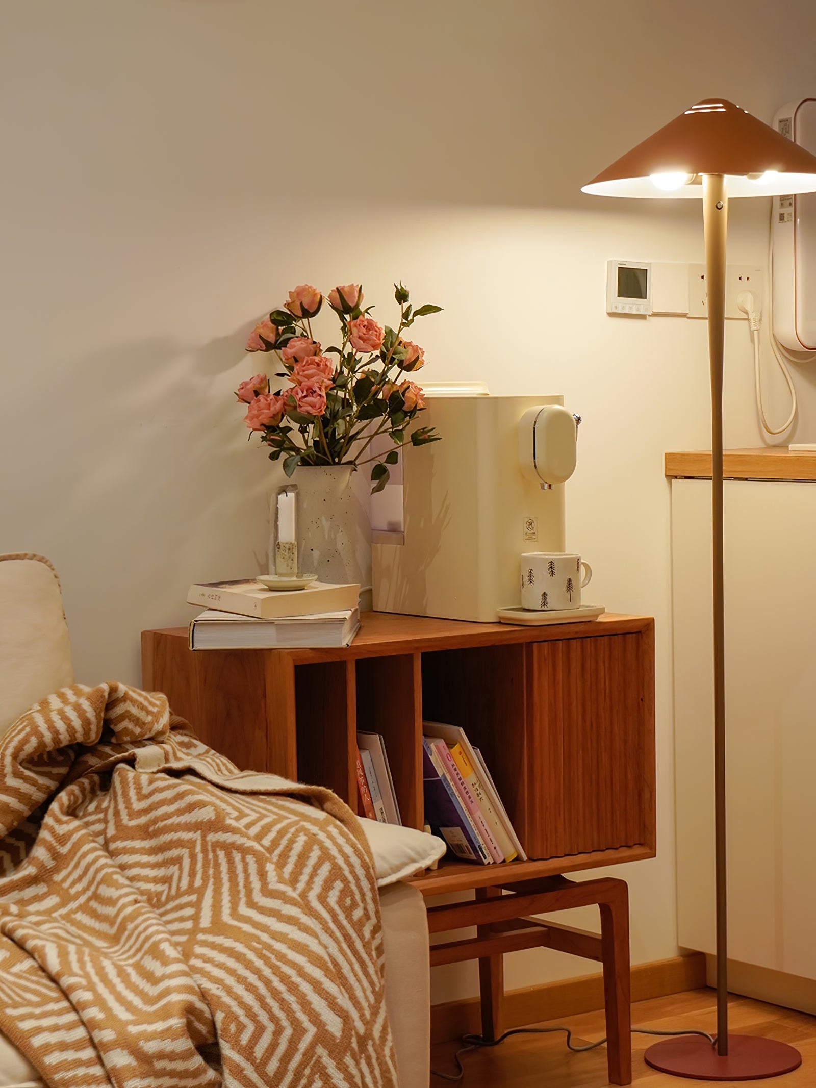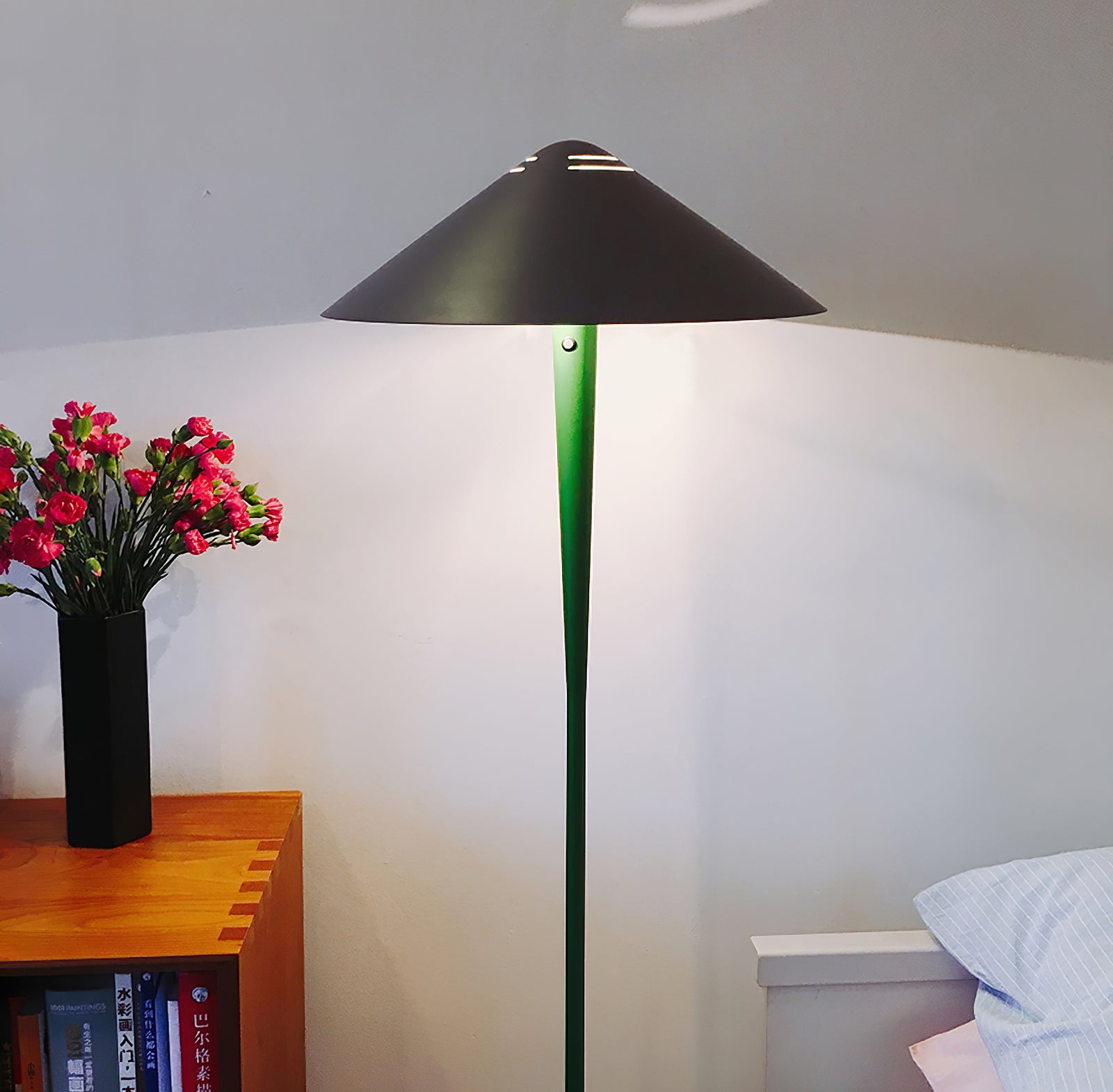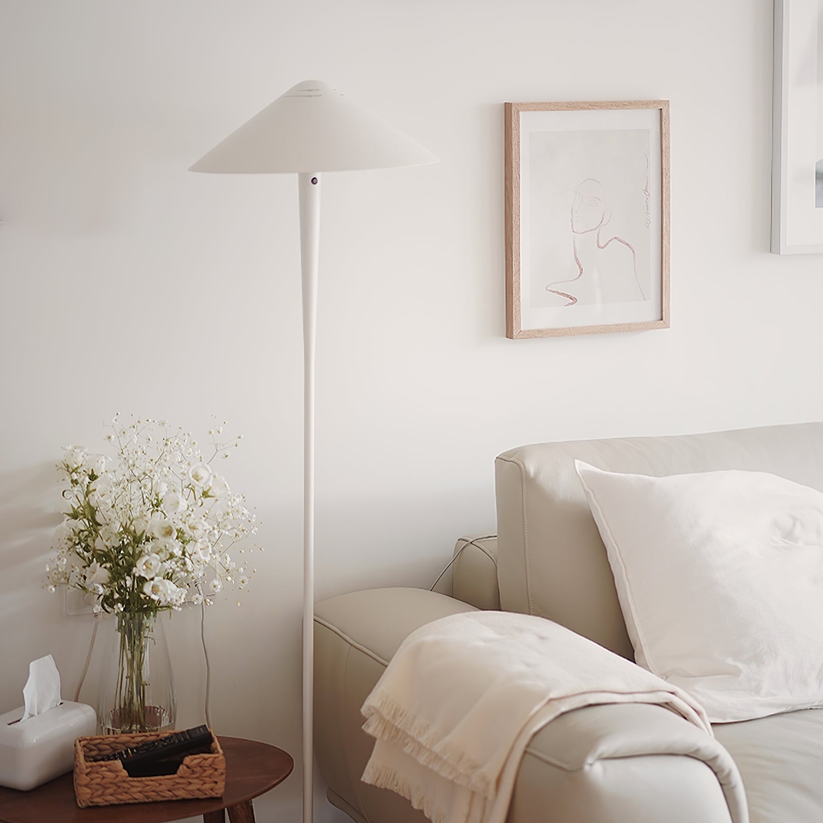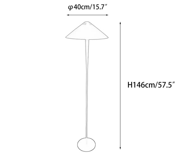 This Cone Shade Modern Floor Lamp features a sleek, minimalist design with a distinctive conical shade in a warm amber hue, adding a touch of retro charm. The slender pole subtly tapers as it reaches the shade, creating a balanced and elegant silhouette. A circular, red base provides a sturdy foundation while adding a bold pop of color that complements the shade. This floor lamp is ideal for modern or mid-century inspired interiors, where its clean lines and vibrant colors bring both functionality and a stylish accent to living rooms, bedrooms, or reading corners. The warm, diffused light from the cone shade adds a cozy ambiance to any space.