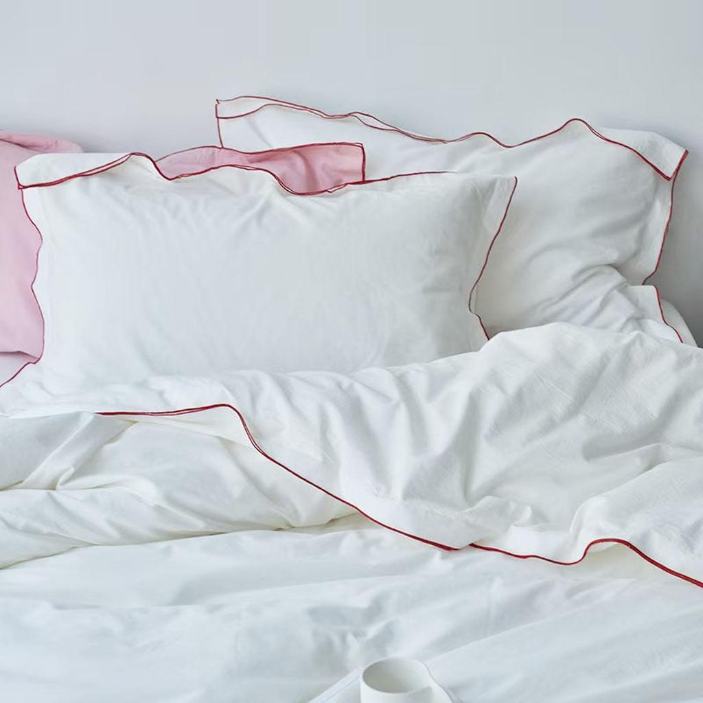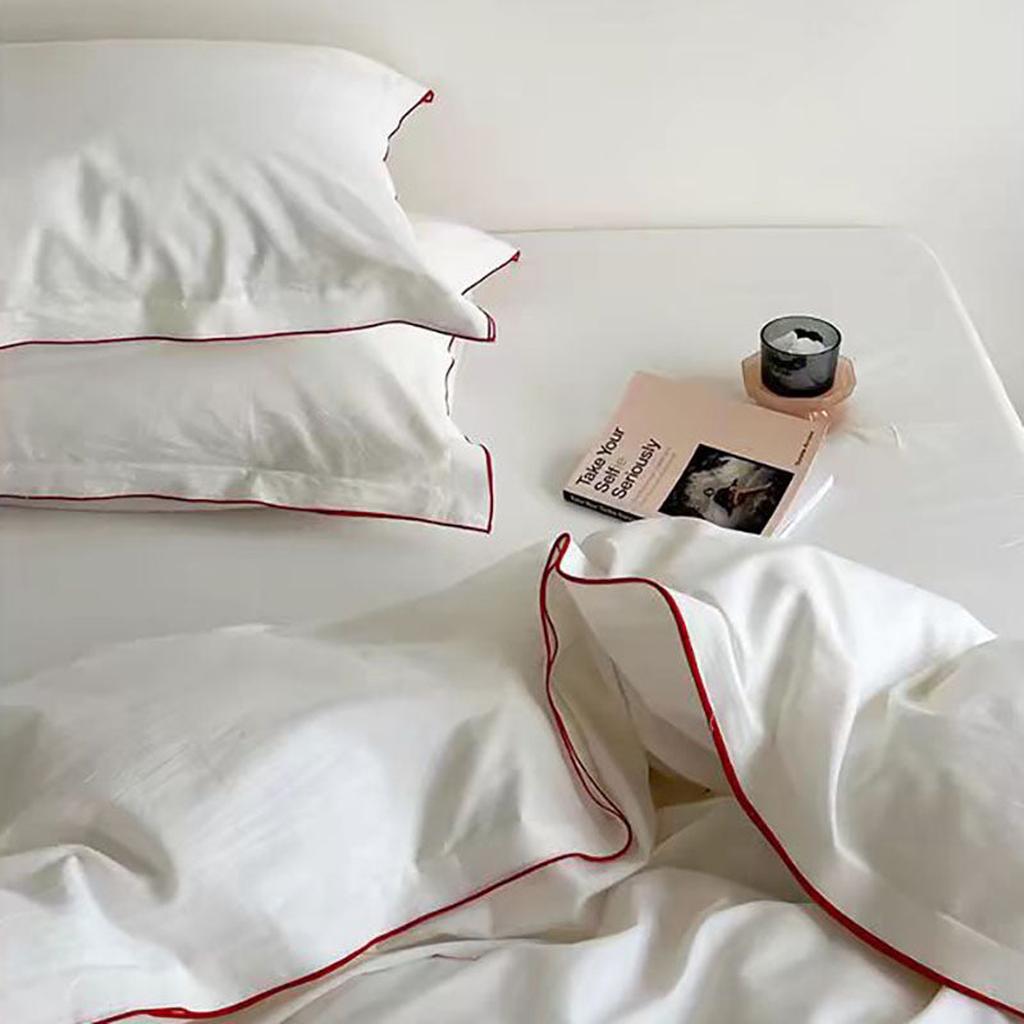Designed with a nod to timeless elegance, this bedding set redefines simplicity with a bold twist. The crisp white base is finished with a bold red edge, adding just the right pop of retro style. Made from 100% cotton, it's soft, breathable, and perfect for everyday comfort. We love how it keeps things clean and classic, with that nice touch to make it stand out!