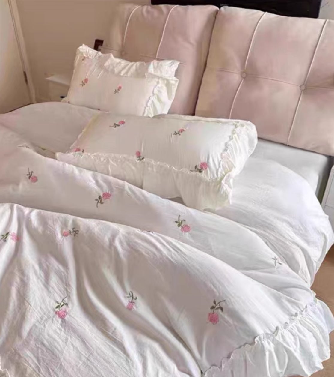 Transform your bedroom into a dreamy, coquette-inspired space with this Rose Bedding Set, crafted with a romantic double gauze cotton blend. The delicate pink floral duvet cover and pillowcases feature elegant rose embroidery and soft ruffles, creating a perfect mix of cottagecore and vintage charm.