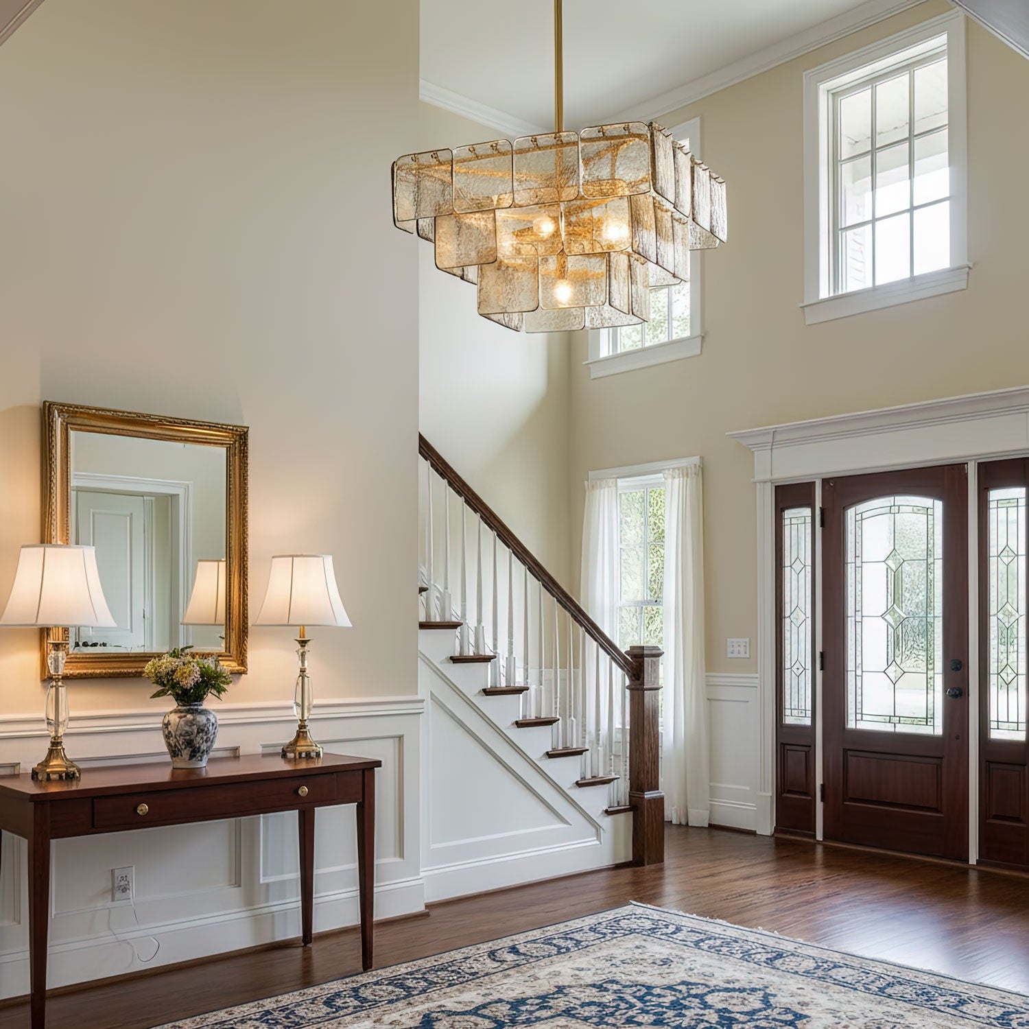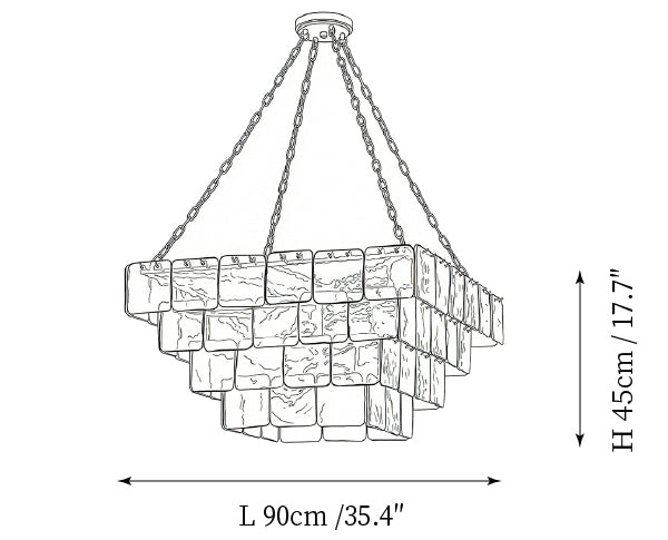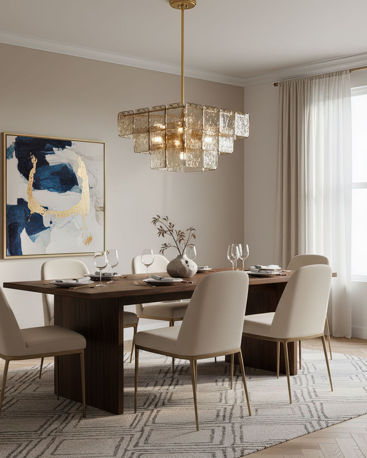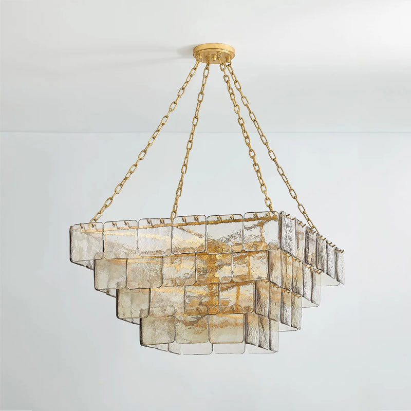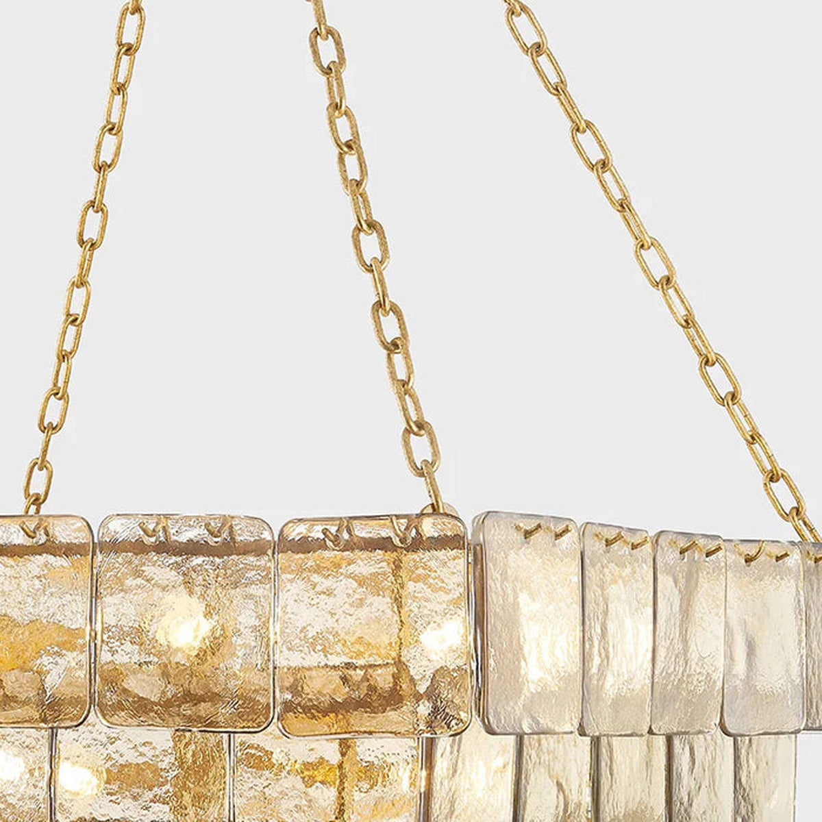 The Corbett Chandelier by Mooijane features three tiers of dark champagne piastre glass panels that shimmer with icy radiance. The textured glass and smoky hue create a captivating visual display, making it a striking focal point for dining rooms, living spaces, or entryways. Elegant, enchanting, and timeless.