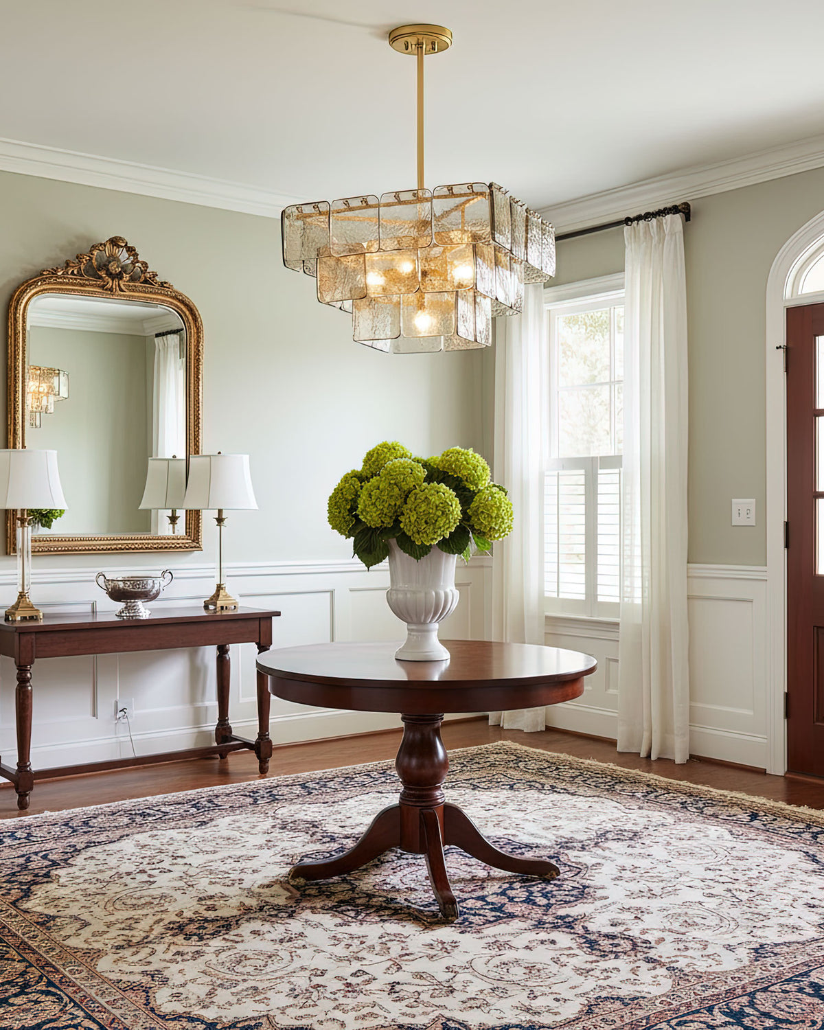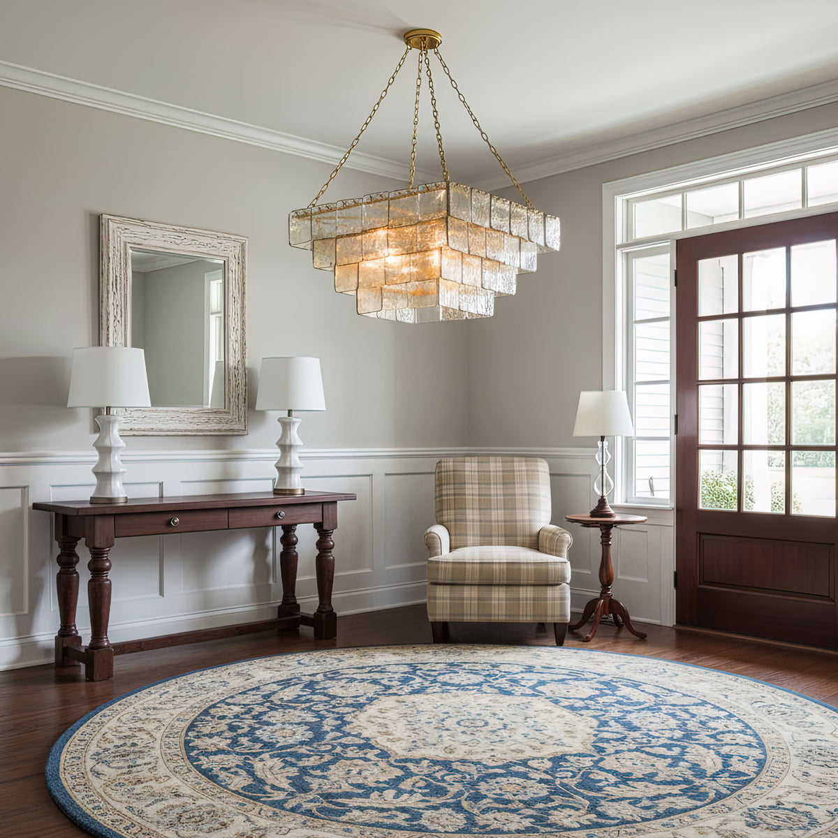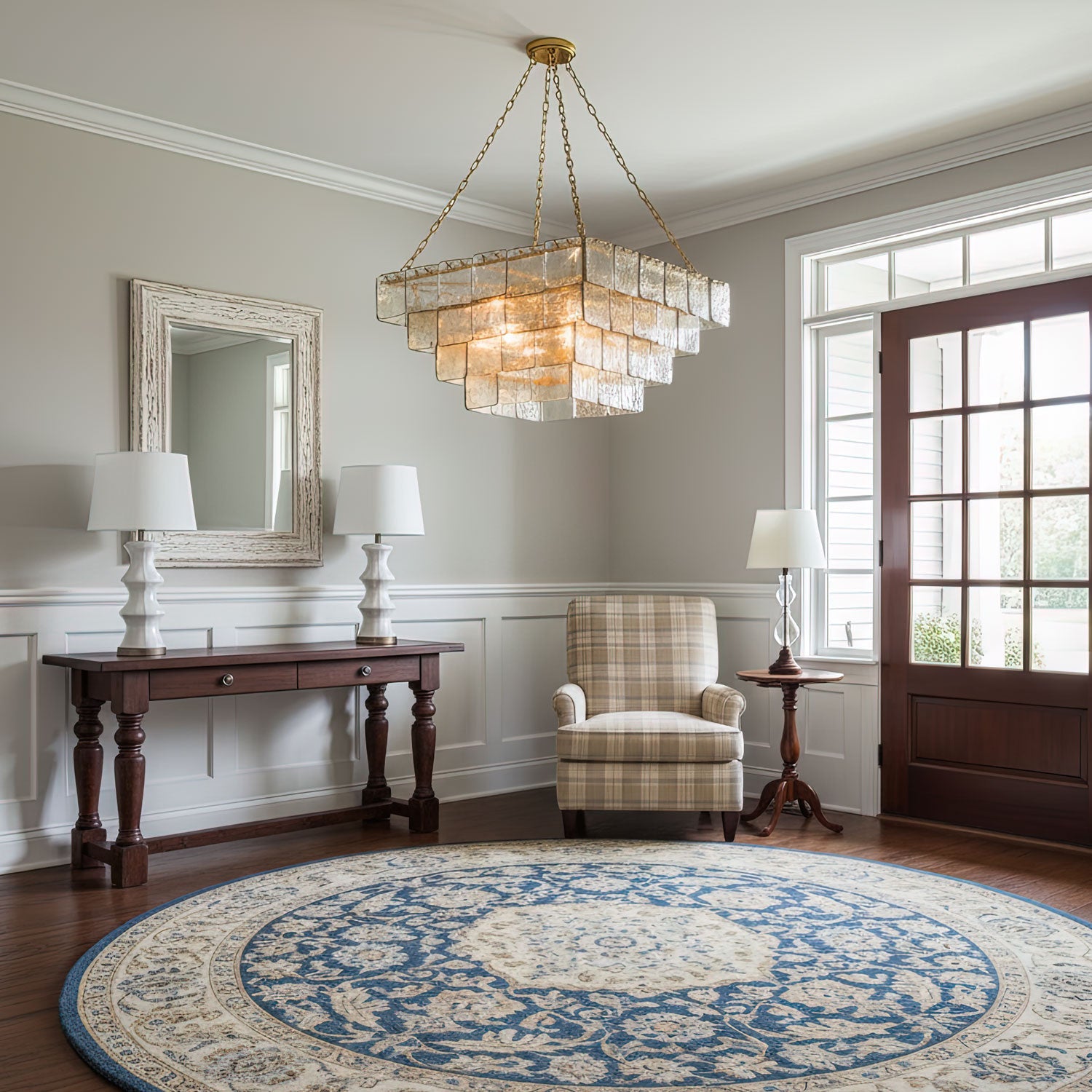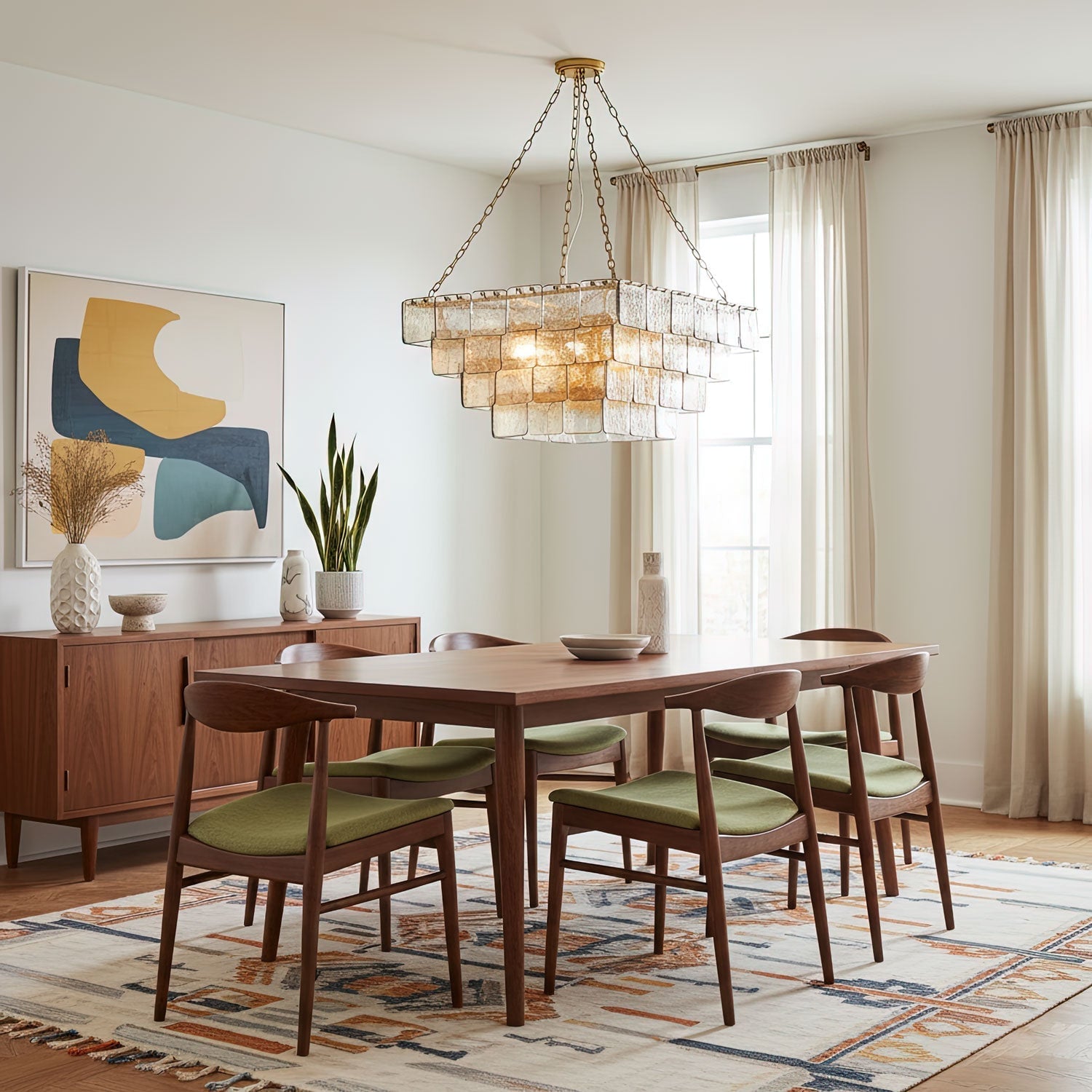 The Corbett Chandelier by Mooijane features three tiers of dark champagne piastre glass panels that shimmer with icy radiance. The textured glass and smoky hue create a captivating visual display, making it a striking focal point for dining rooms, living spaces, or entryways. Elegant, enchanting, and timeless.