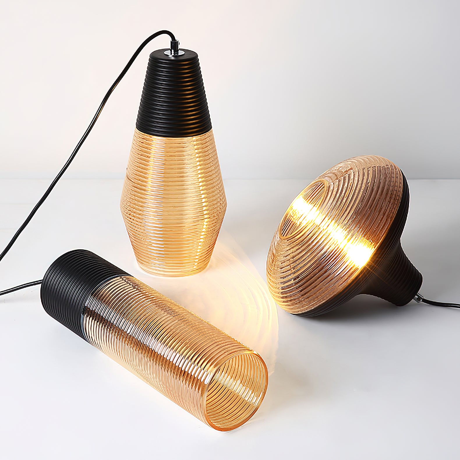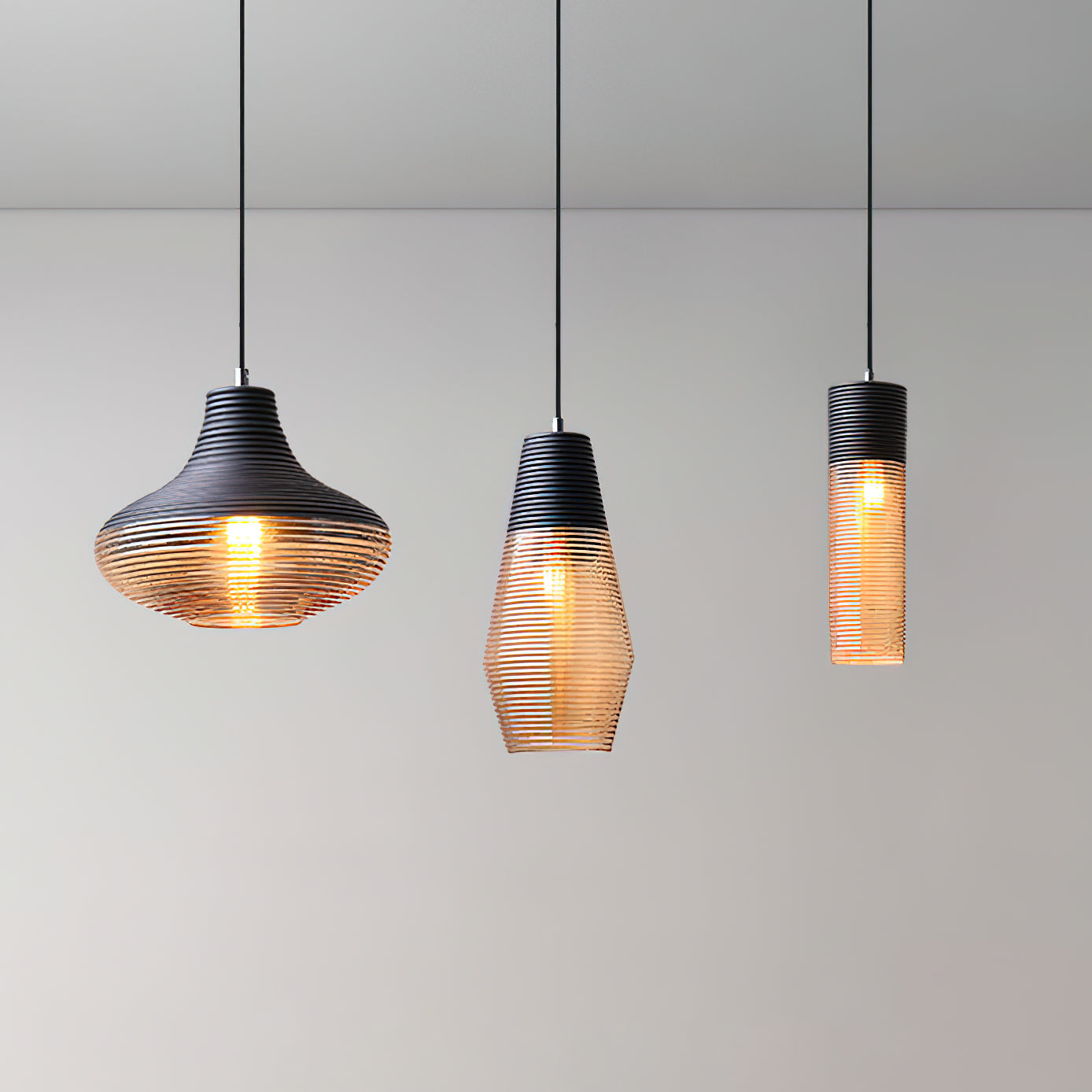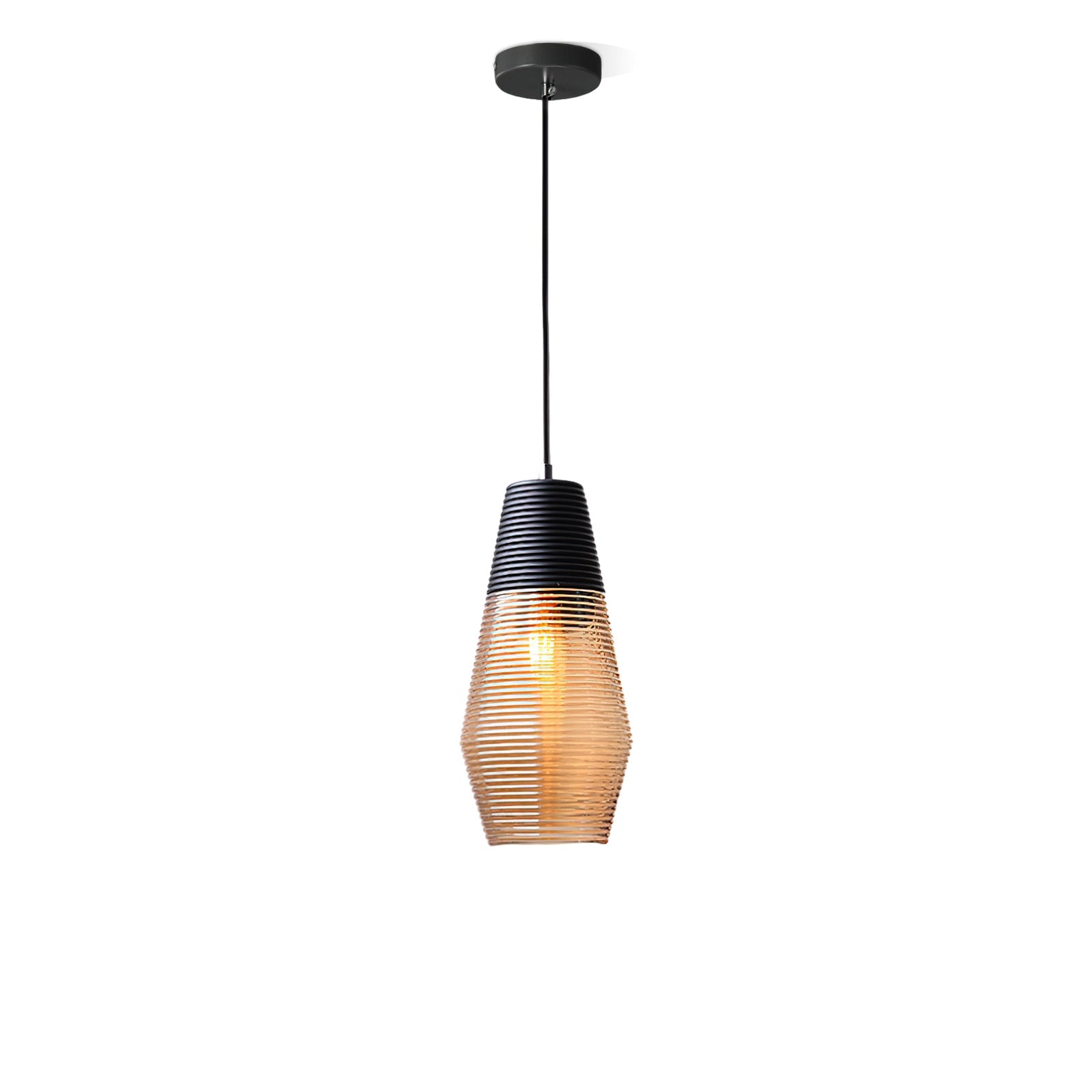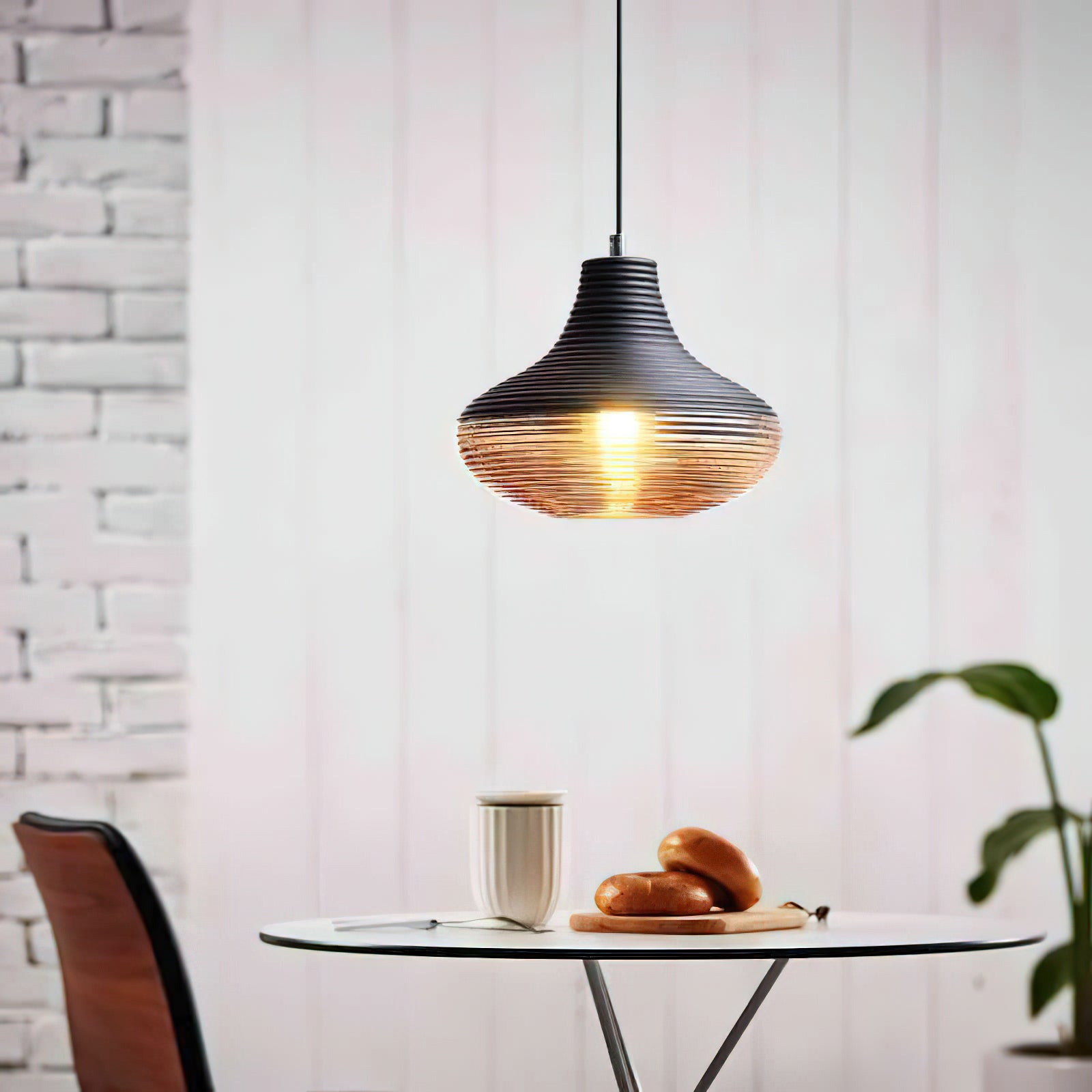 Create a luxurious atmosphere with this Corrugated Pendant Lamp. Its creative spiral pattern creates a unique display and its artificially blown glass cover creates a soft, artistic beauty. The combination of the simple design and brown tones is perfect for adding a fashionable touch of nature and agility to any home.