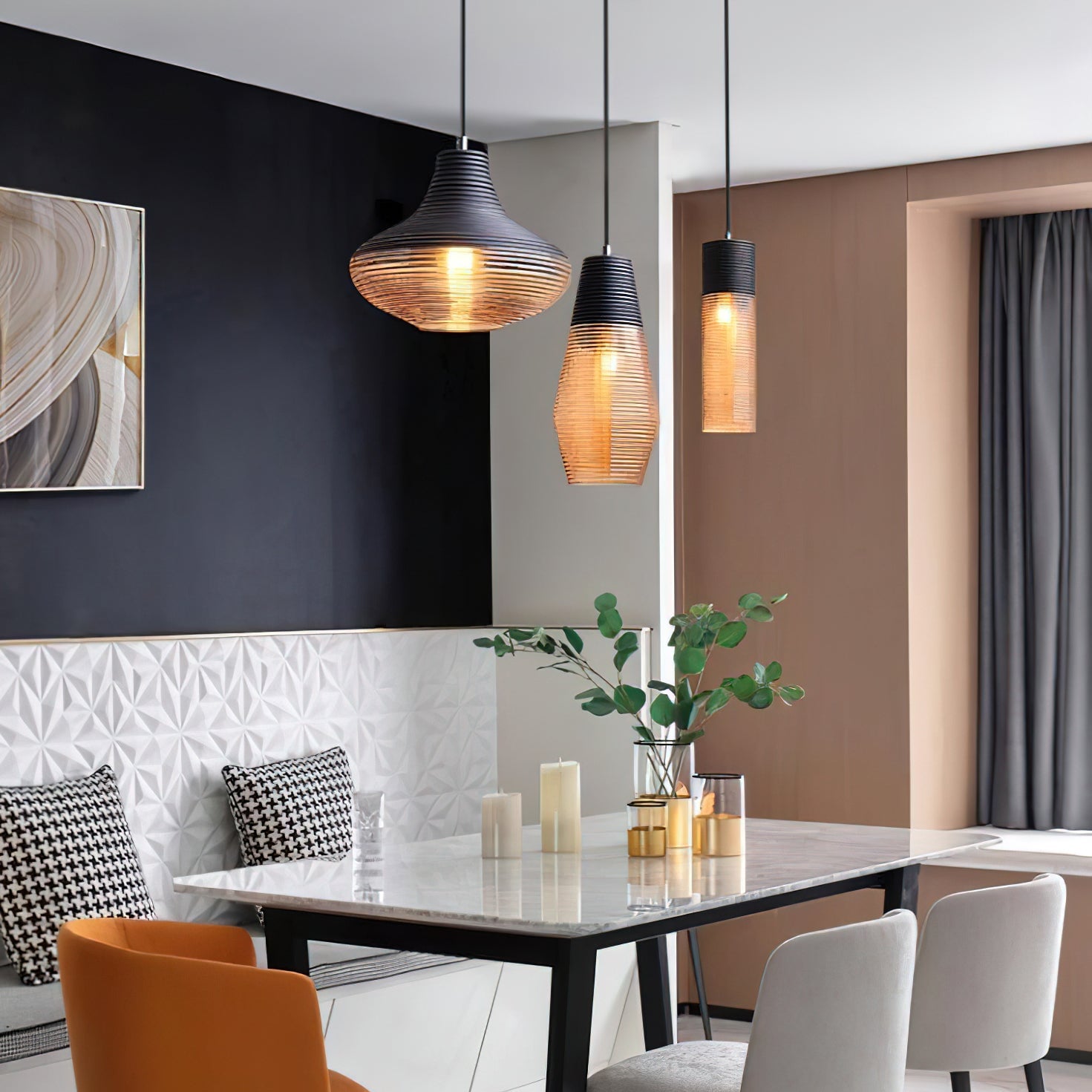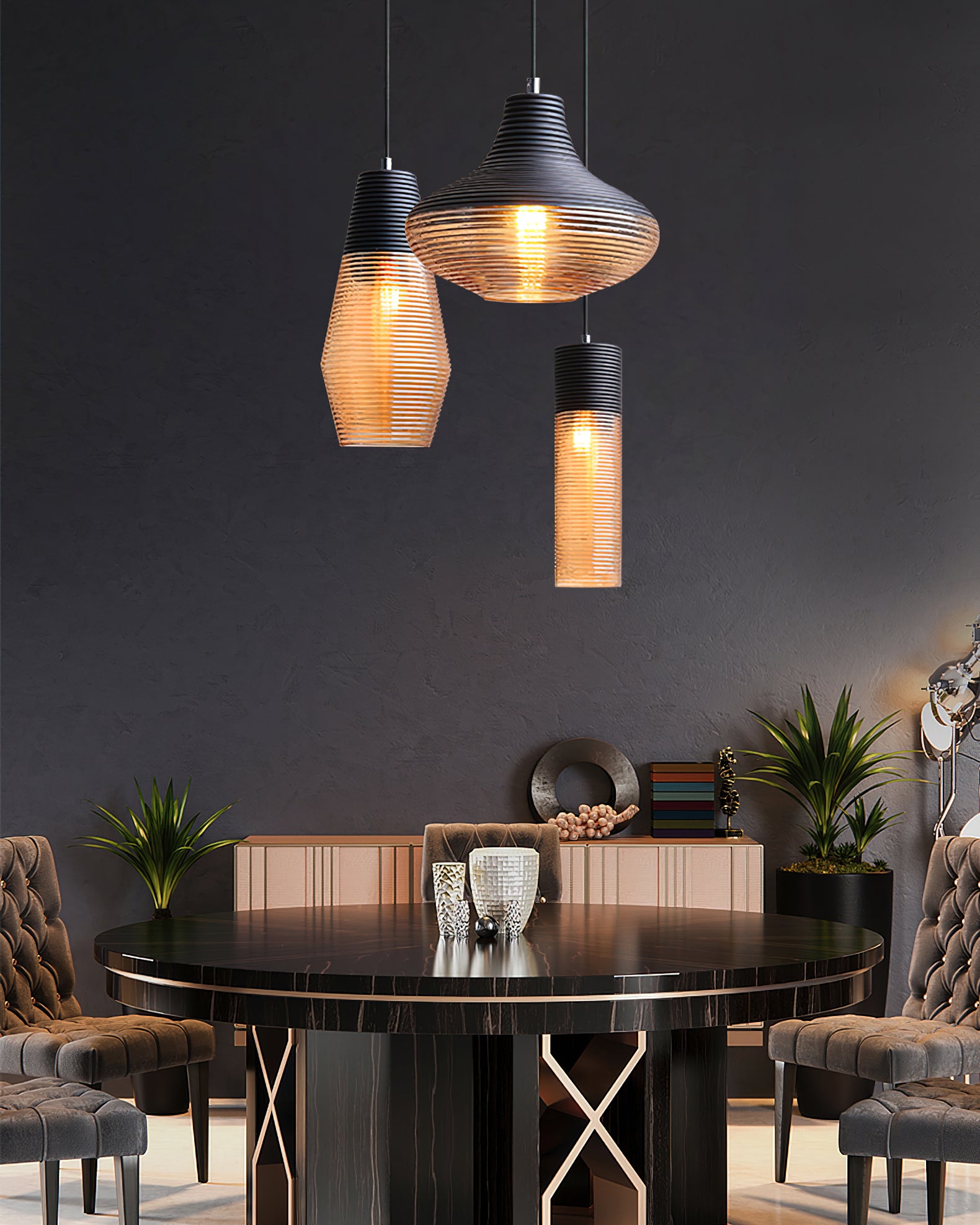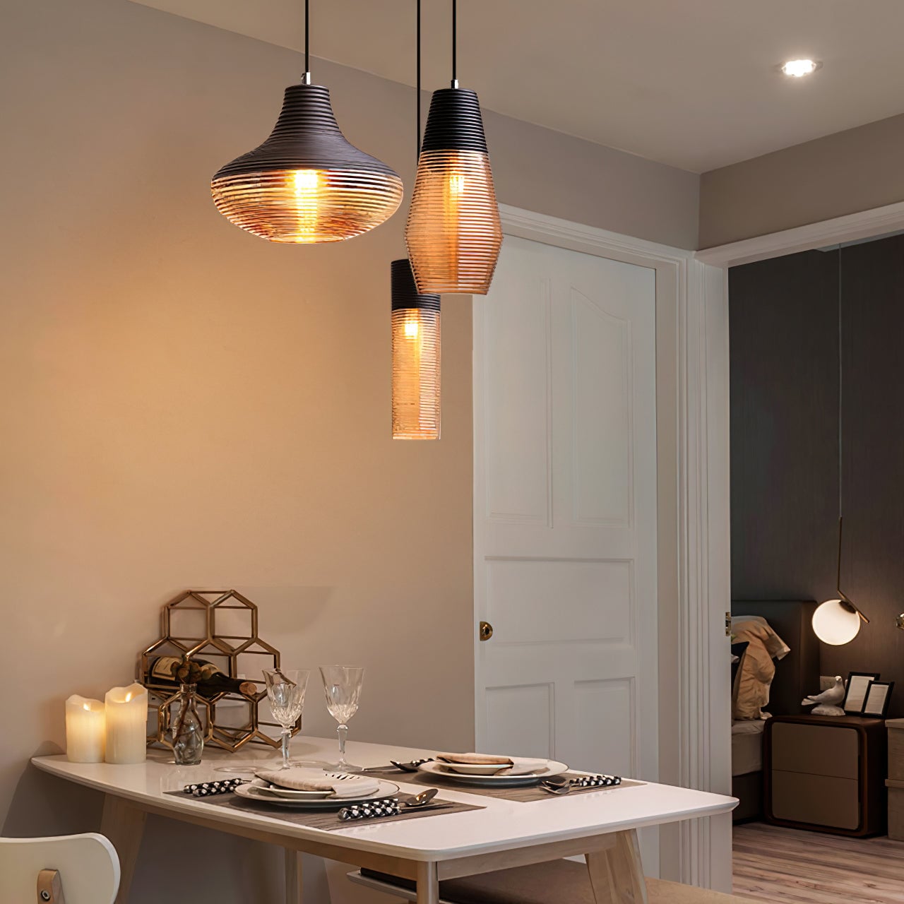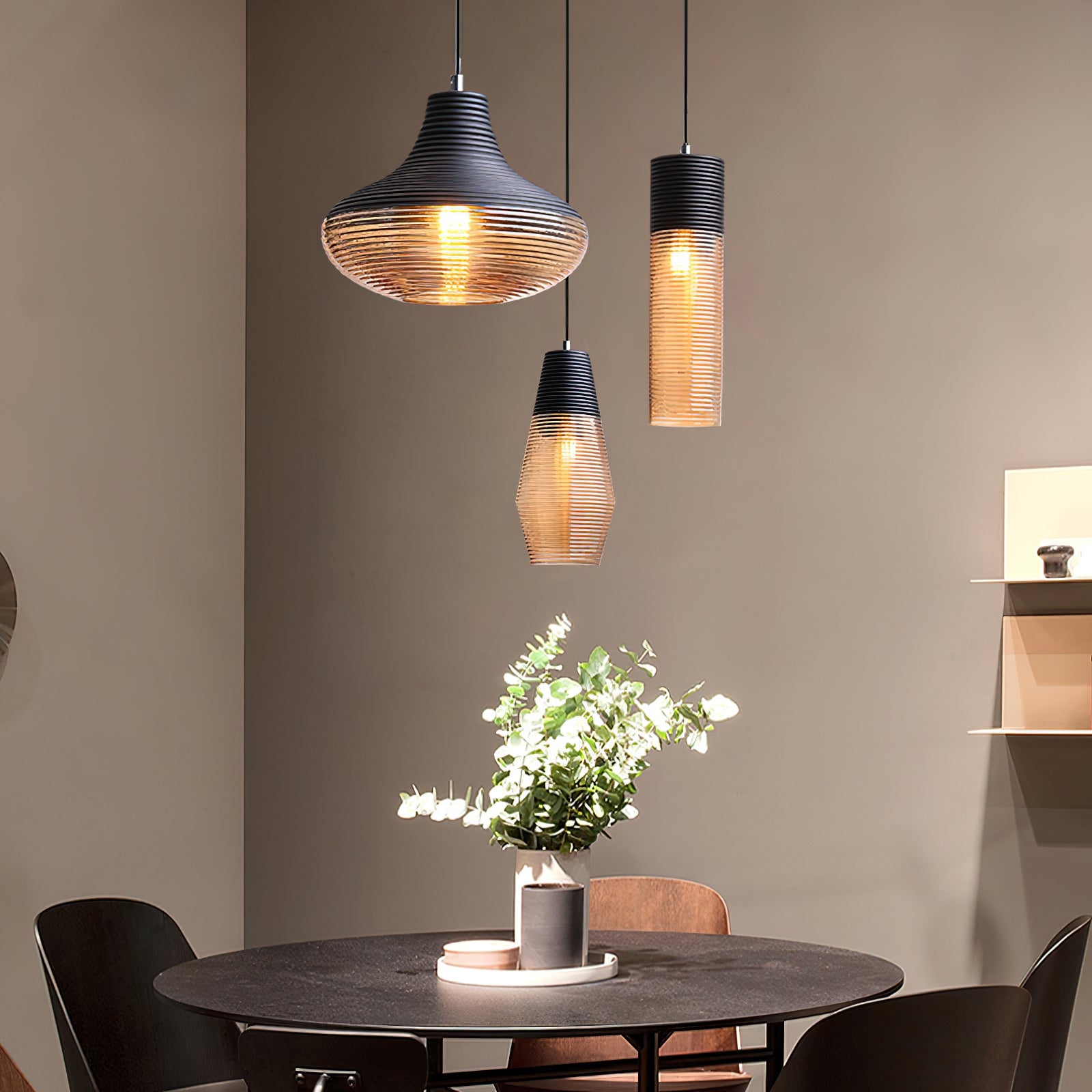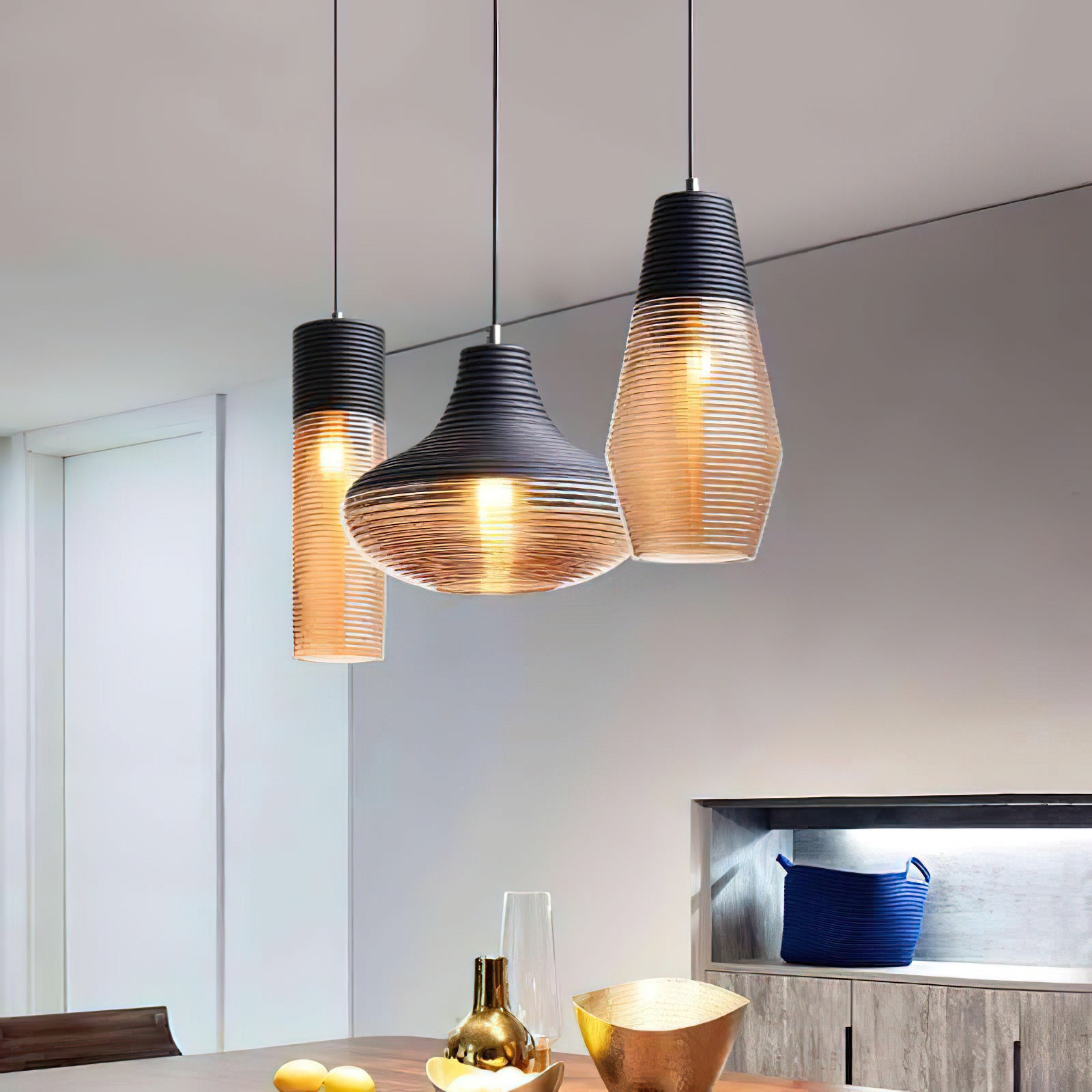 Create a luxurious atmosphere with this Corrugated Pendant Lamp. Its creative spiral pattern creates a unique display and its artificially blown glass cover creates a soft, artistic beauty. The combination of the simple design and brown tones is perfect for adding a fashionable touch of nature and agility to any home.