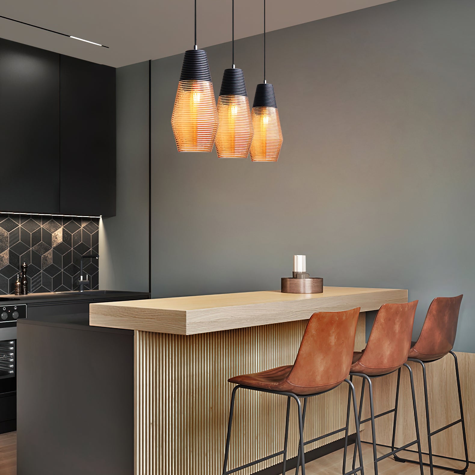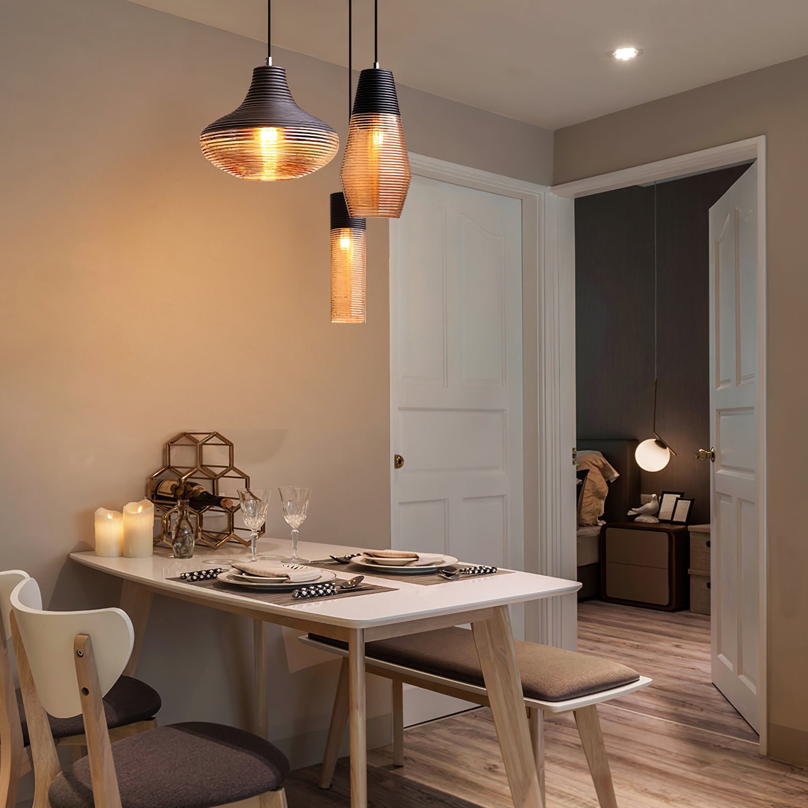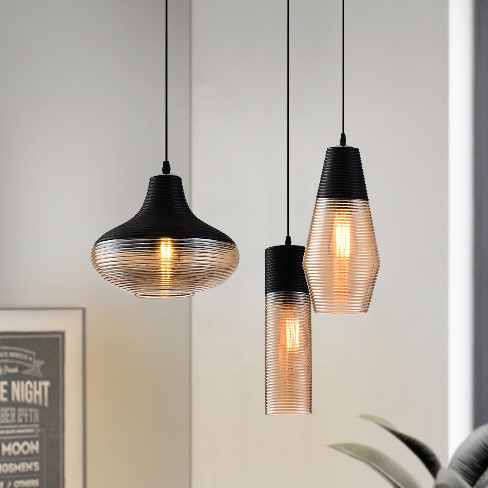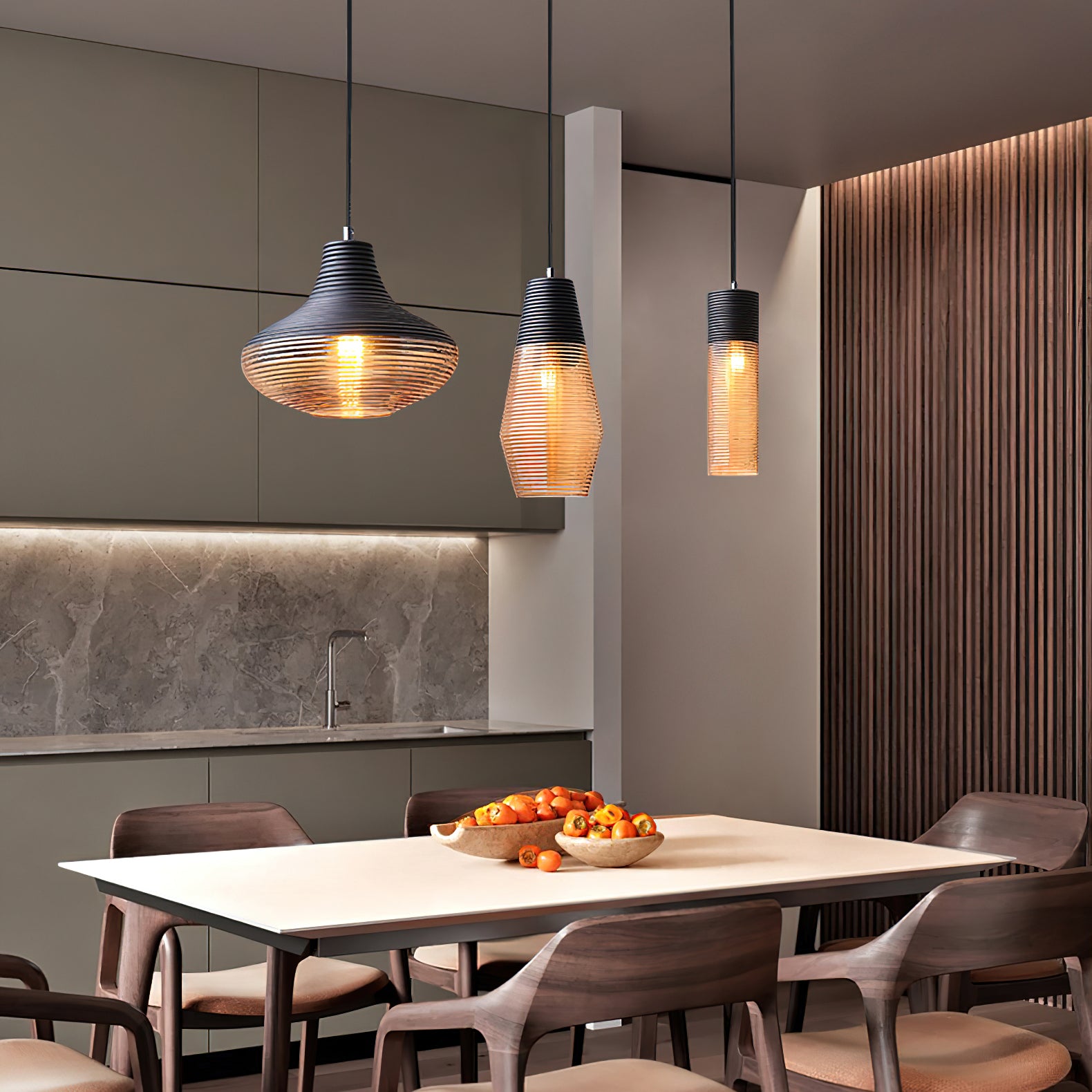 Create a luxurious atmosphere with this Corrugated Pendant Lamp. Its creative spiral pattern creates a unique display and its artificially blown glass cover creates a soft, artistic beauty. The combination of the simple design and brown tones is perfect for adding a fashionable touch of nature and agility to any home.