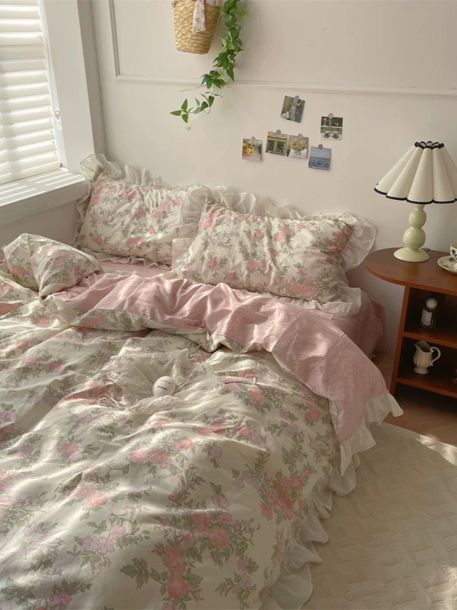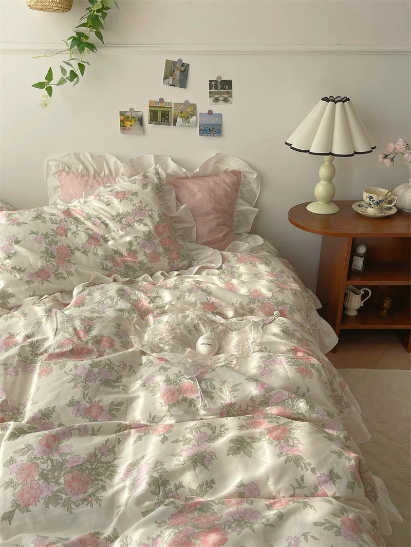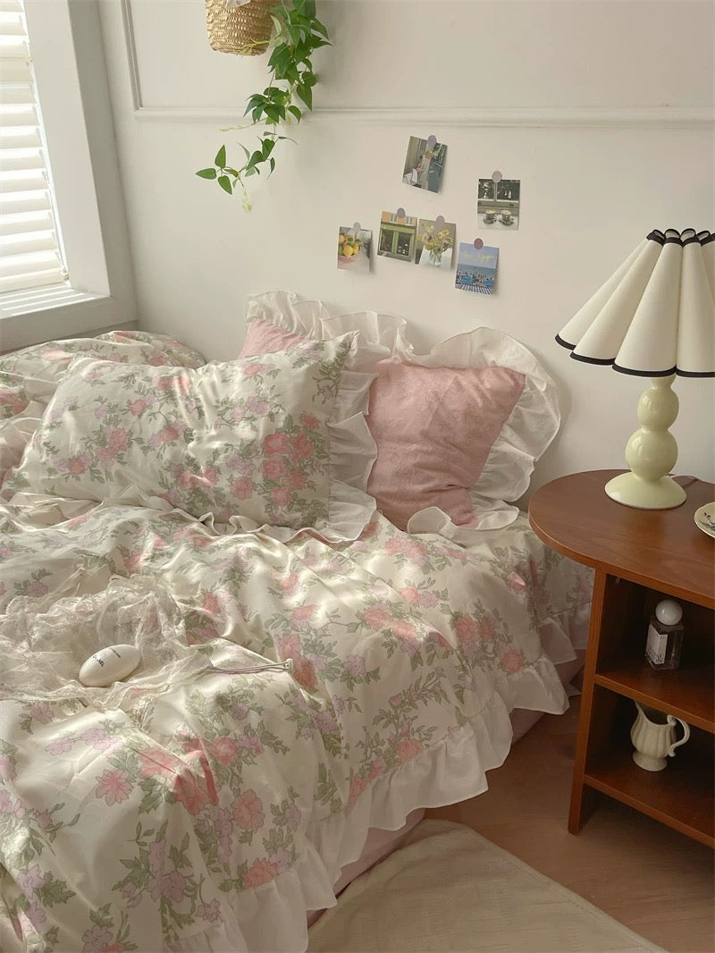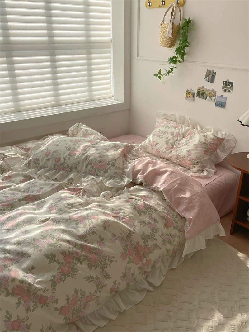 Transform your bedroom into a dreamy sanctuary with this romantic floral ruffled cotton bedding set. Designed with delicate lace ruffles and soft pastel blooms, it’s the ultimate statement piece for cottagecore bedrooms, coquette dorm rooms, French country interiors, shabby chic apartments, and Pinterest-worthy spaces.