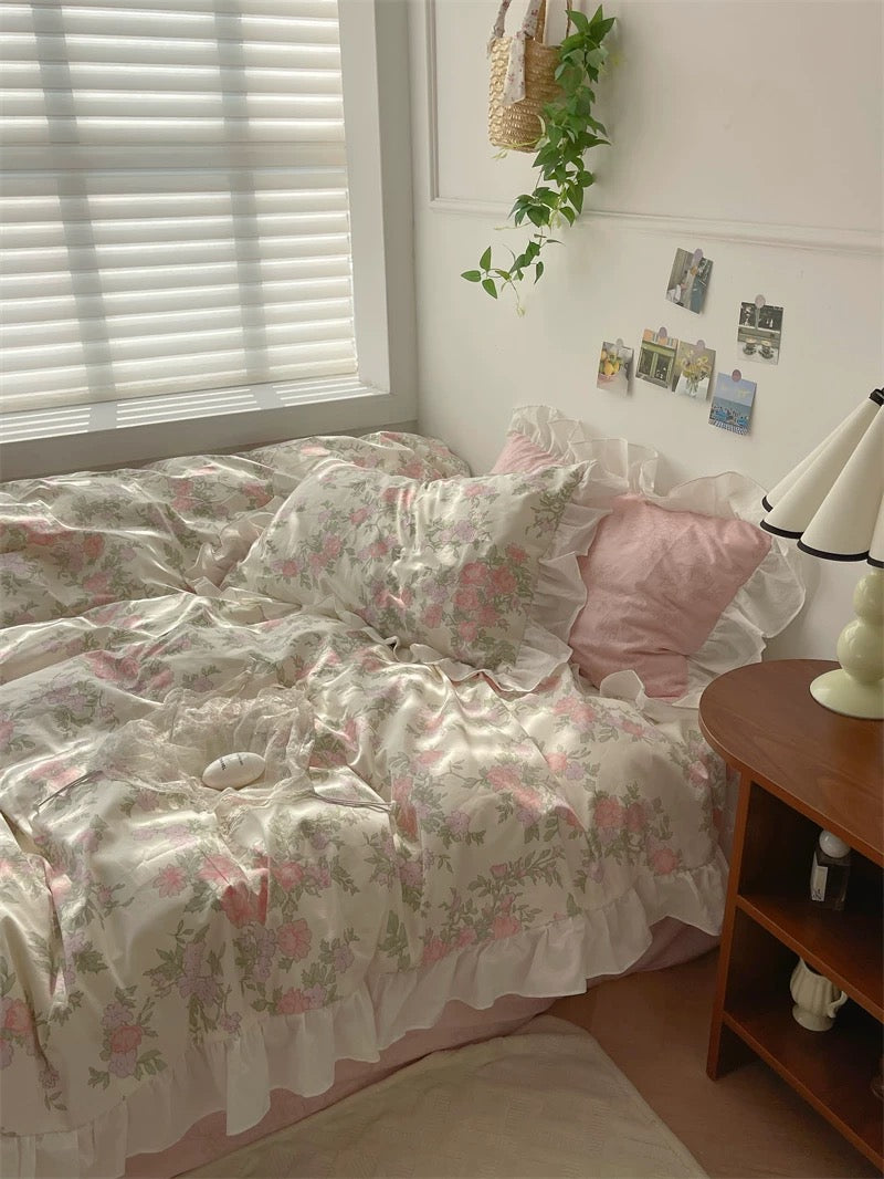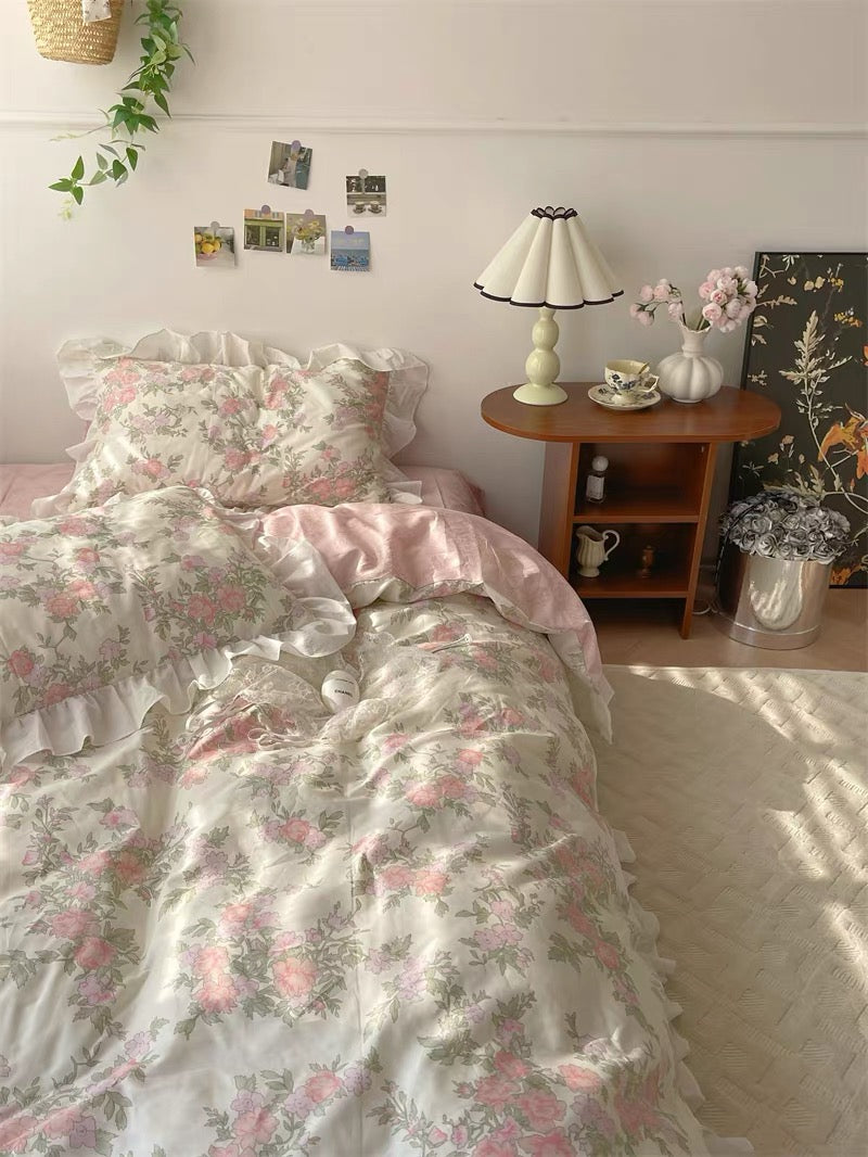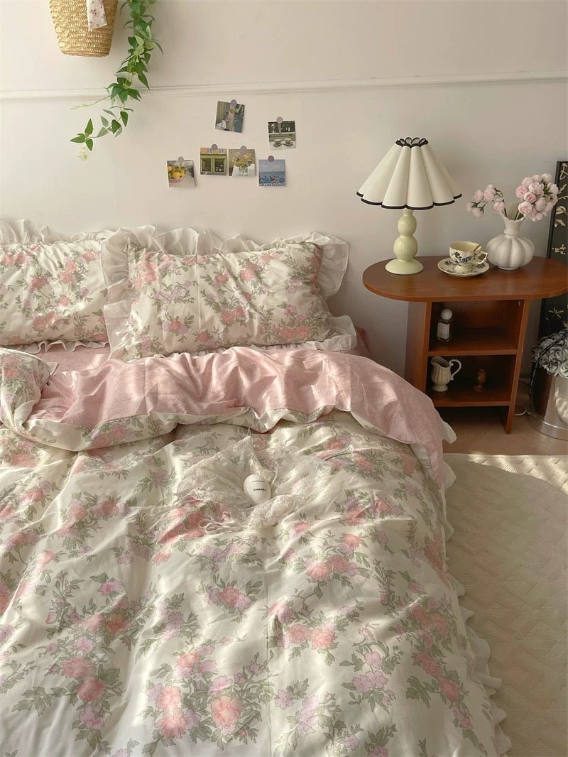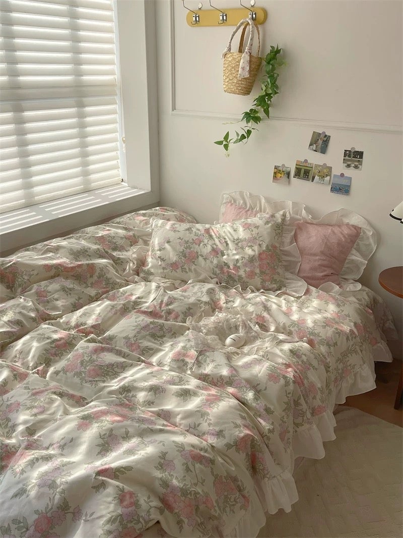 Transform your bedroom into a dreamy sanctuary with this romantic floral ruffled cotton bedding set. Designed with delicate lace ruffles and soft pastel blooms, it’s the ultimate statement piece for cottagecore bedrooms, coquette dorm rooms, French country interiors, shabby chic apartments, and Pinterest-worthy spaces.