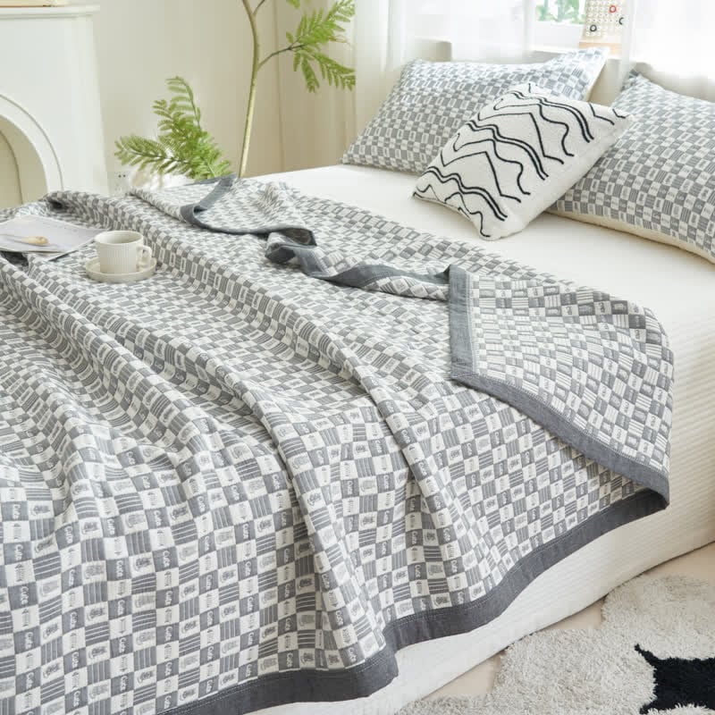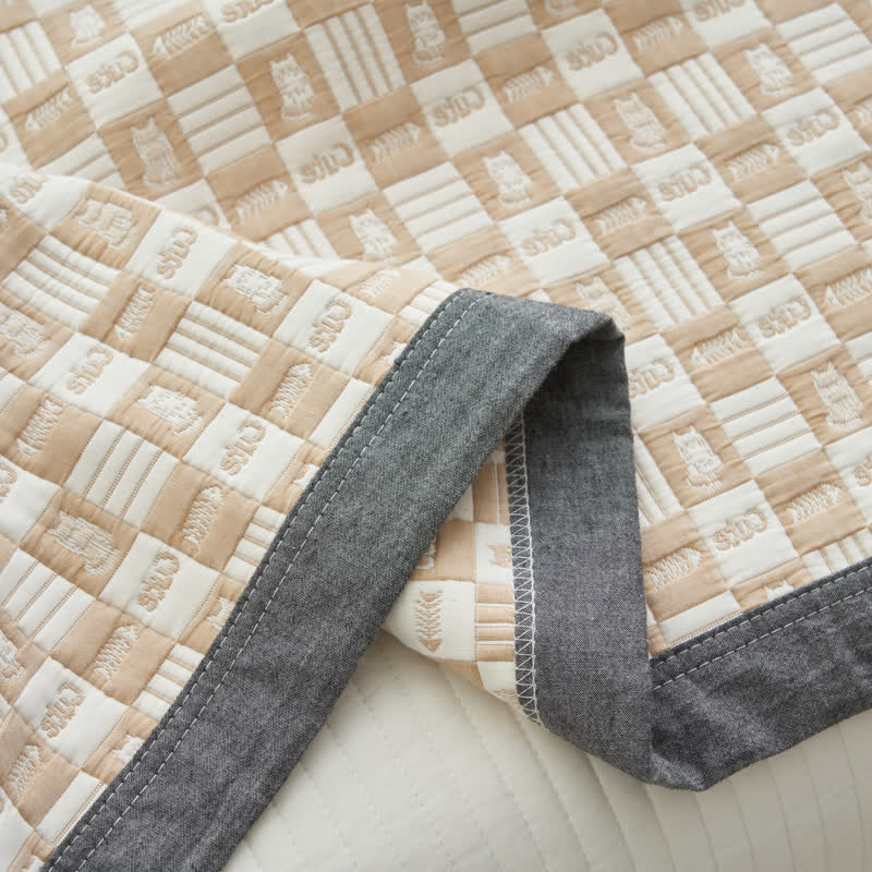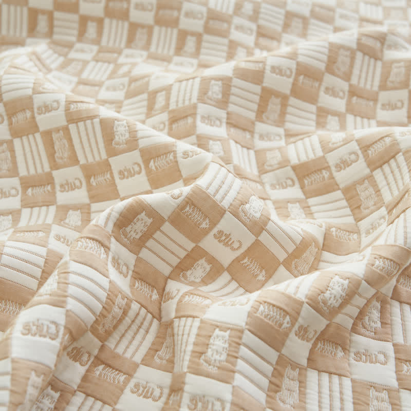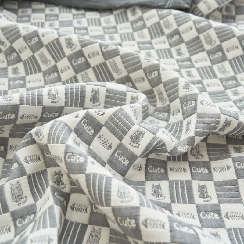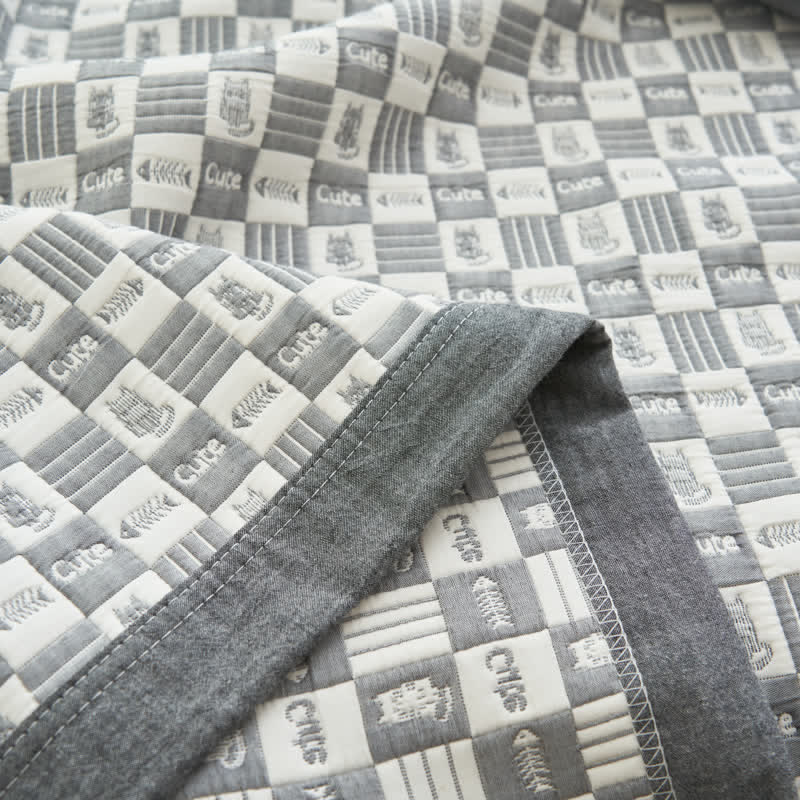 Exuding sophistication and depth, this quilt elevates the room's aesthetic with its textured look and tactile cartoon cat and fishbone patterns. Made from pure cotton with three gauze layers, this bedding ensures a comfortable temperature balance, preventing overheating on warmer nights and providing cozy warmth in cooler seasons.