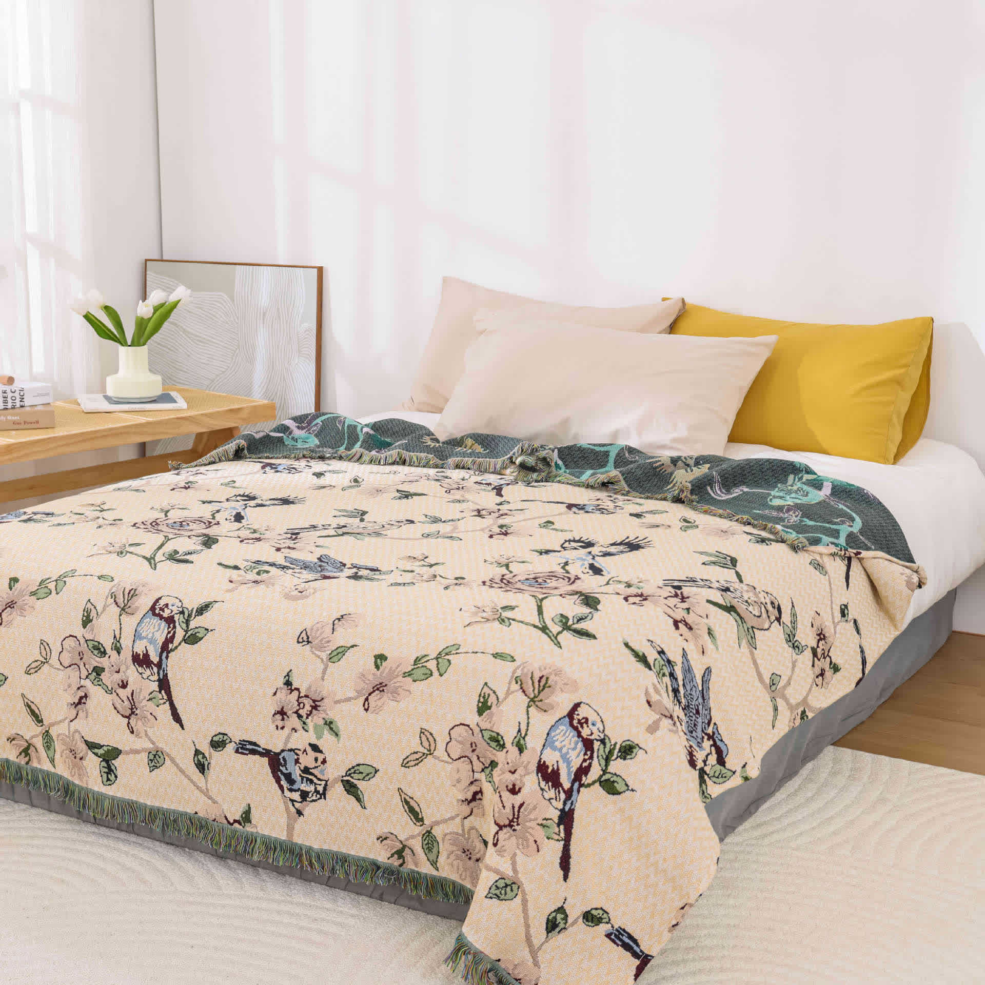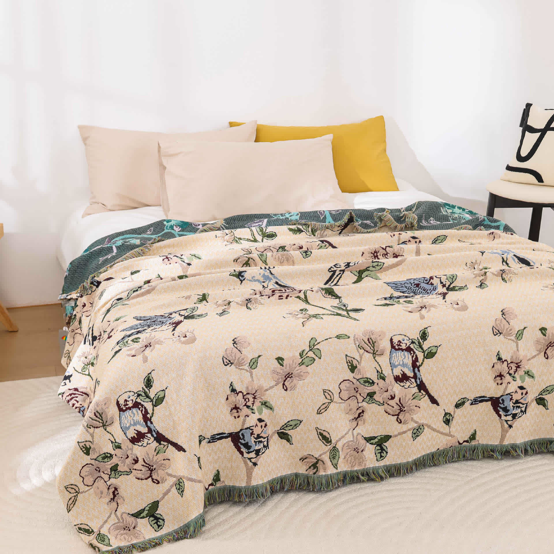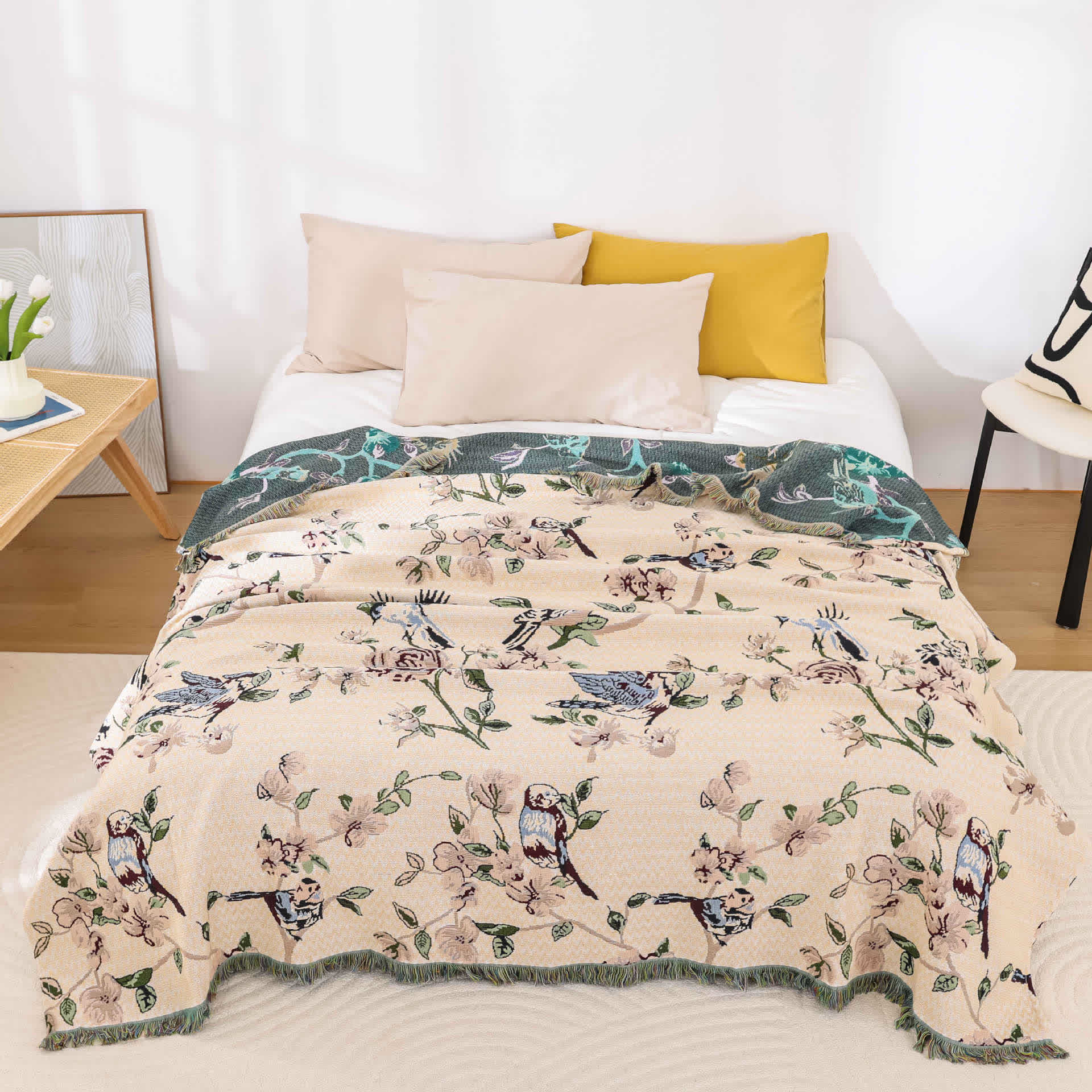 Cotton Gauze Pastoral Bird & Flower Tassel Quilt