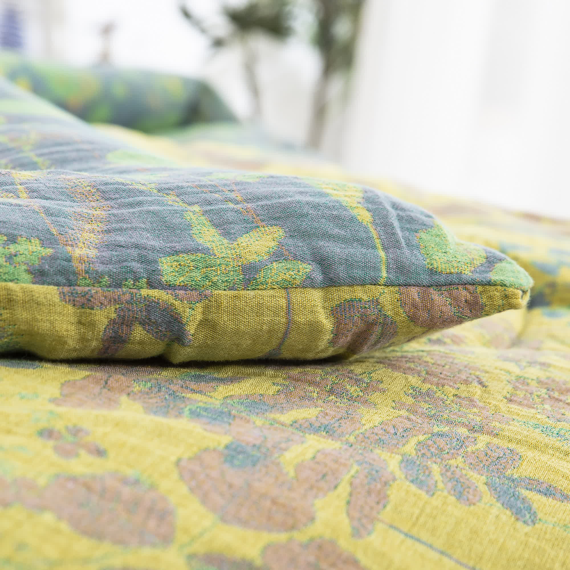 Crafted with meticulous care using fine pure cotton and featuring double layers of gauze, this bedding set guarantees a night of tranquility due to its wonderfully soft feel. Enhanced by an elegant jacquard weave, these components exude a luxurious and classic charm, offering a lasting feeling of opulence and sophistication.