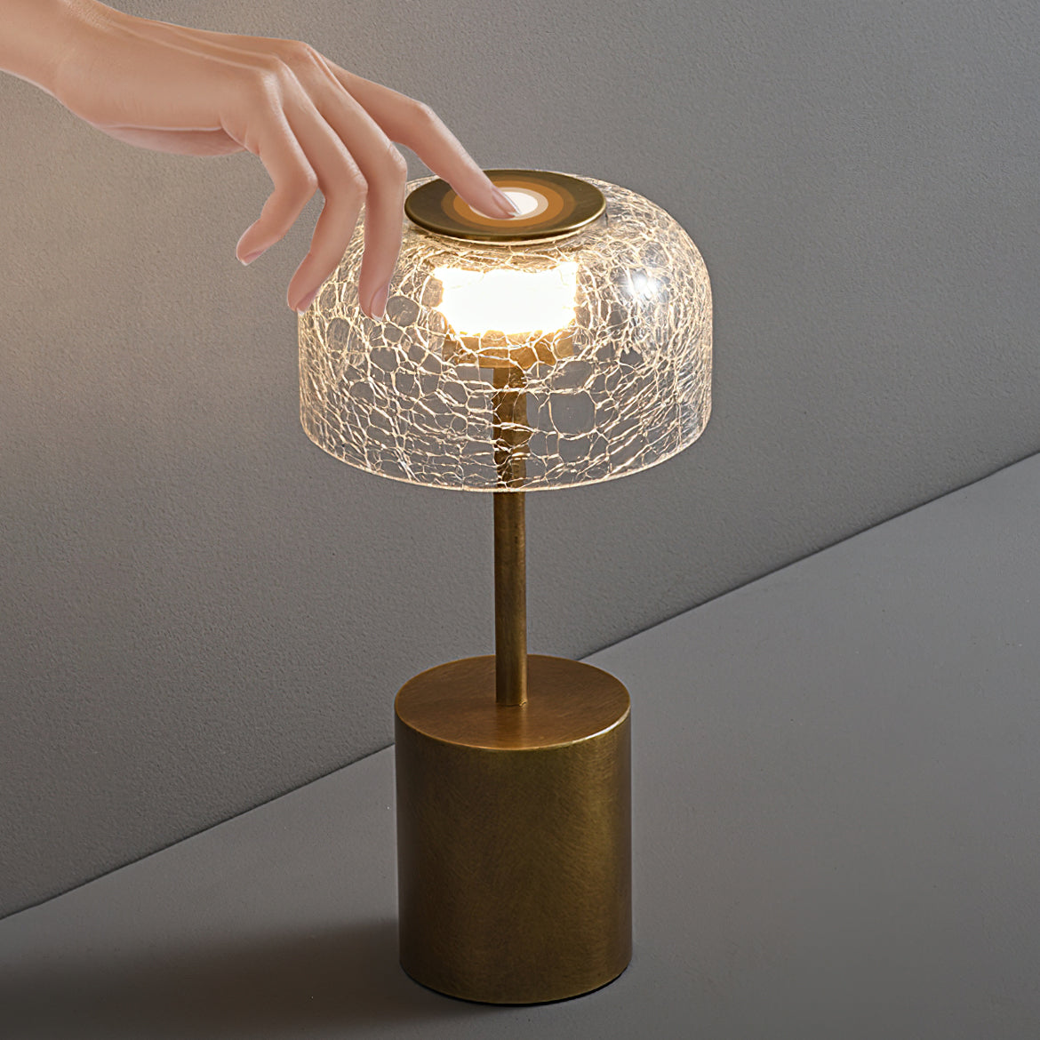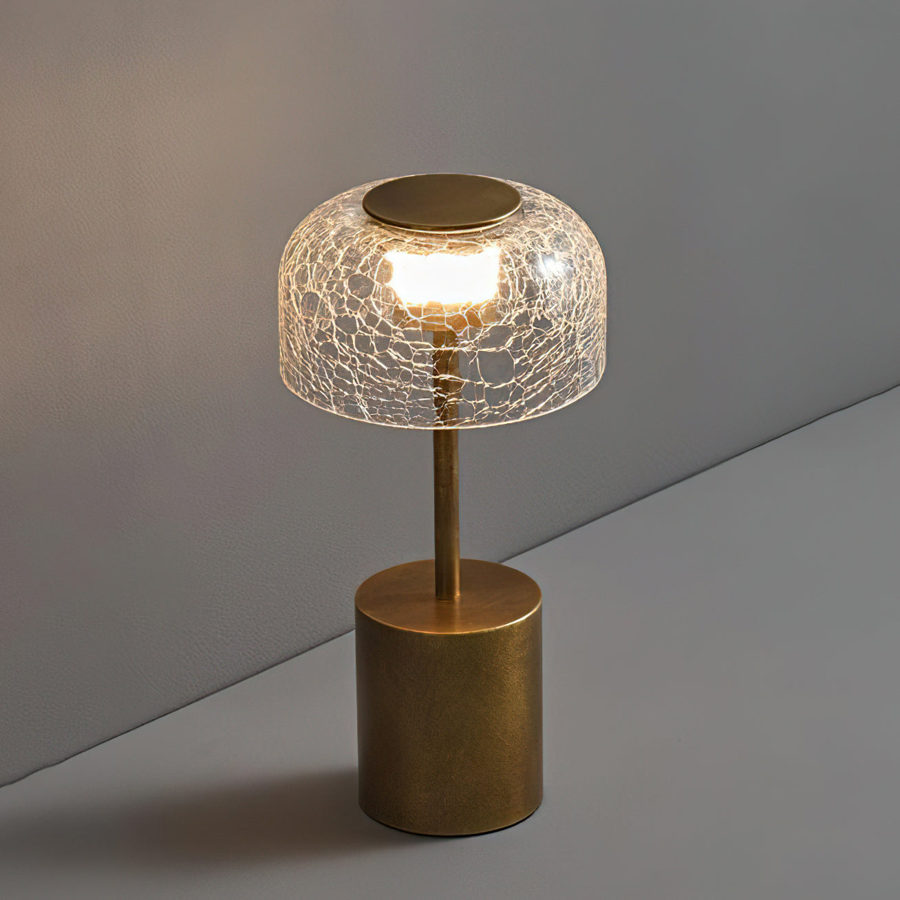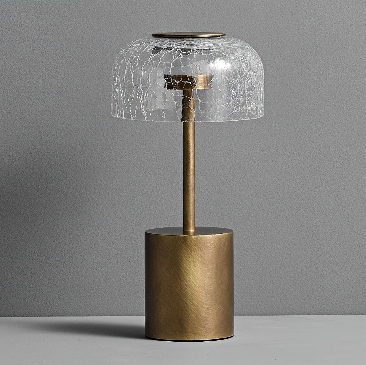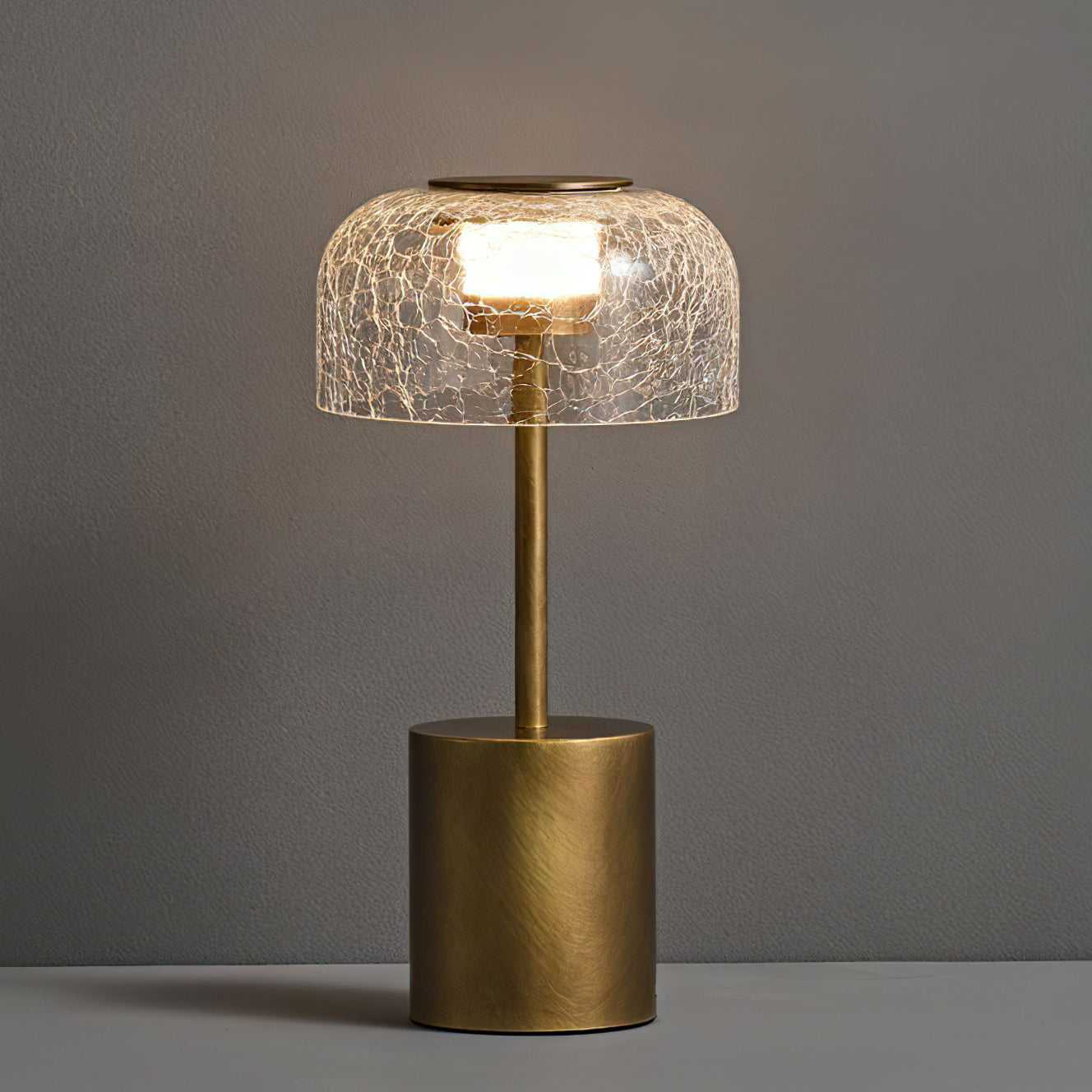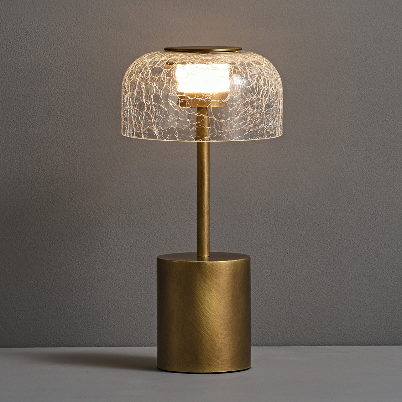 Illuminate your space with the Crackle Built-in Battery Table Lamp. The cracked glass lampshade elegantly refracts light, creating a mesmerizing display of ice and fire. The textured brushed lamp body adds a delicate touch to your home decor and allows you to adjust the lighting to create the perfect ambiance. Experience the enchantment of light and shadow interaction with this exquisite table lamp.
