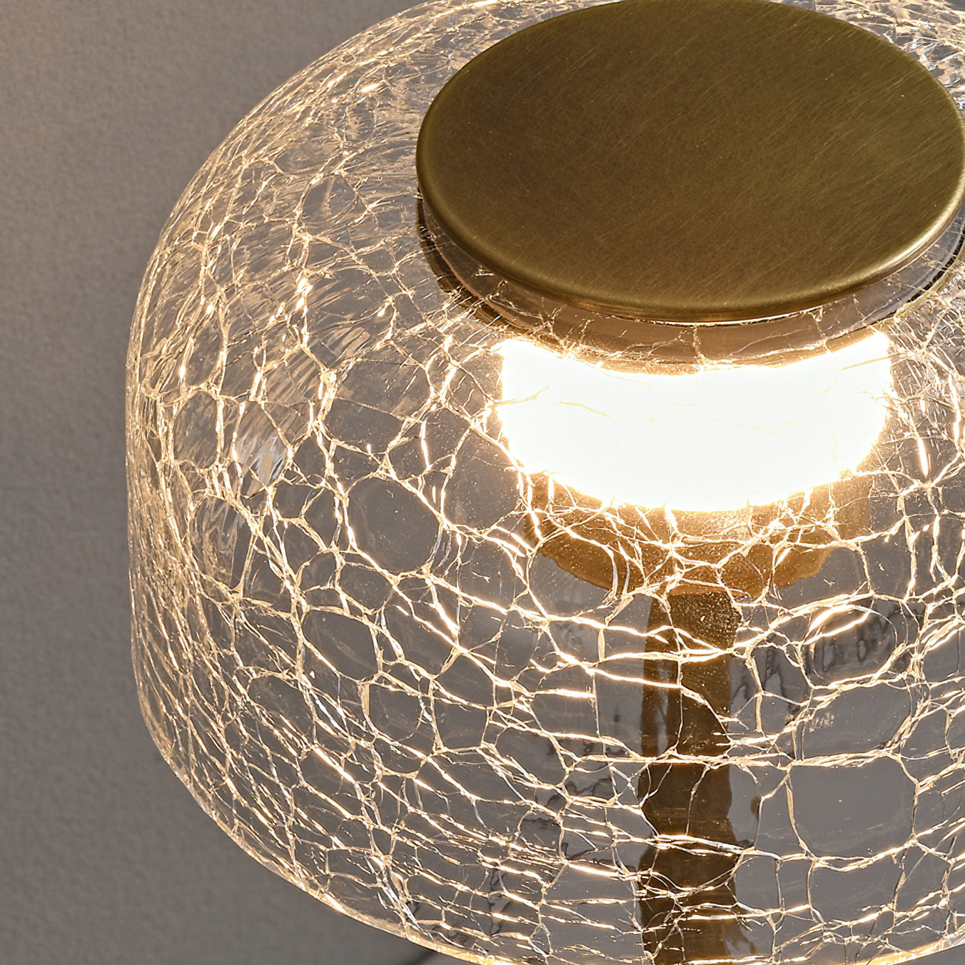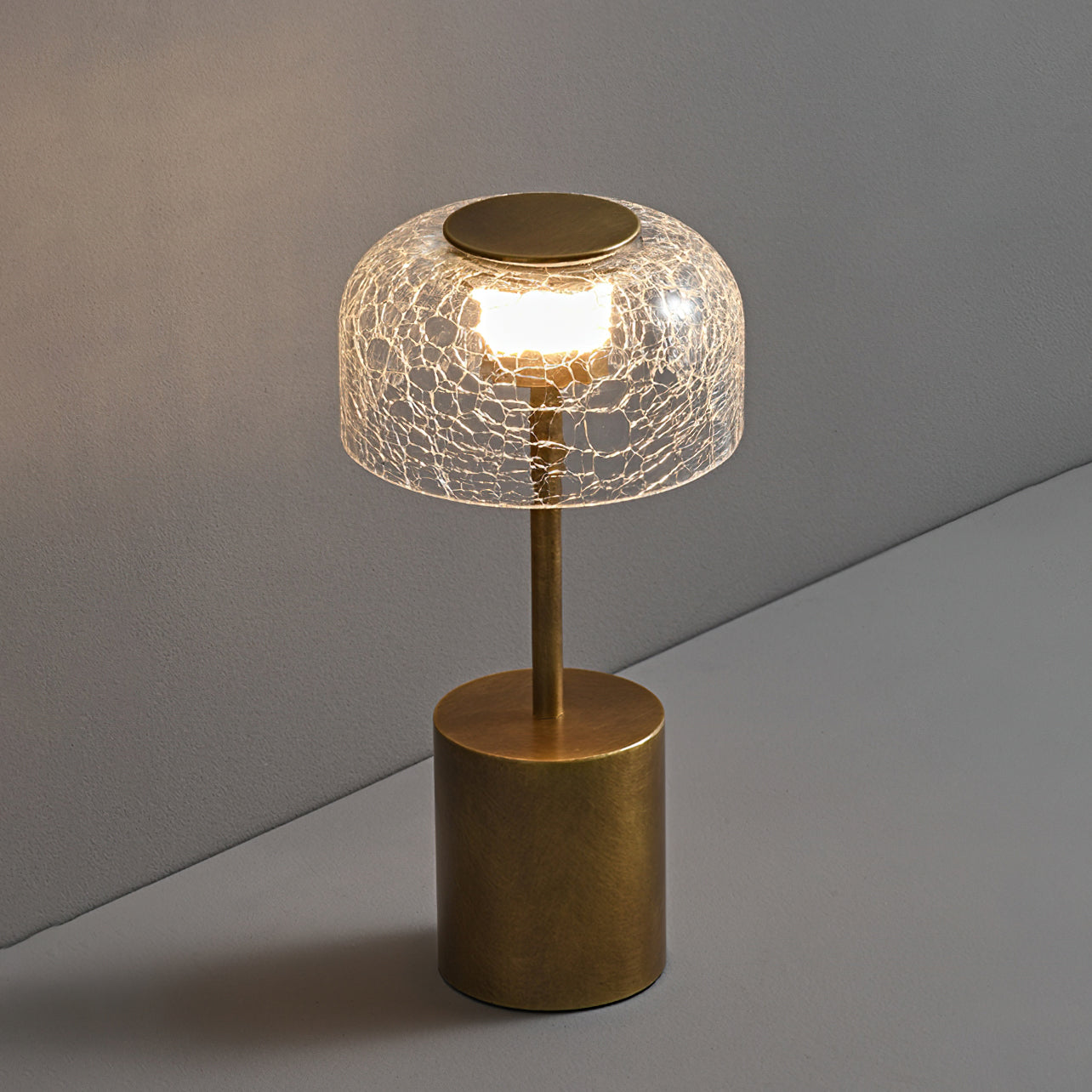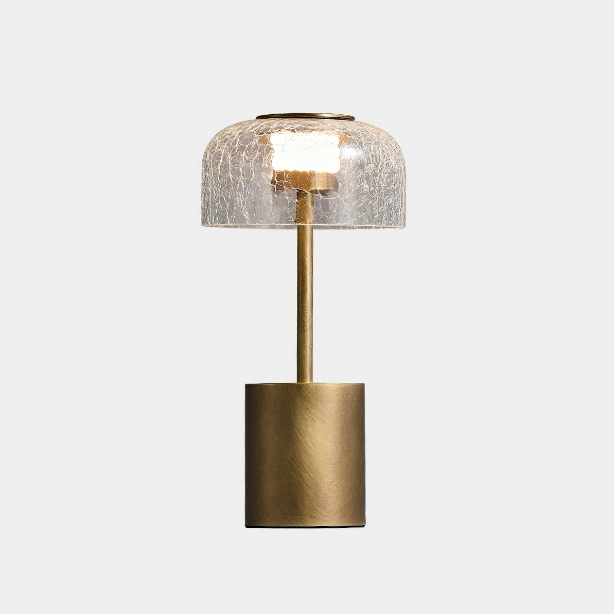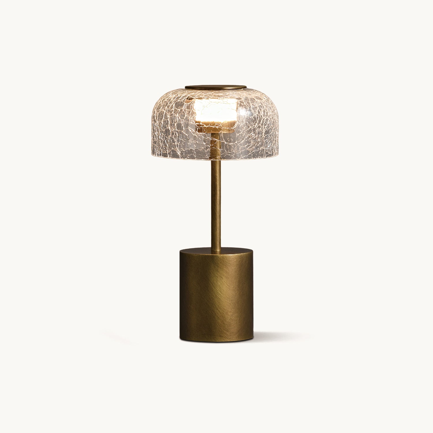 Illuminate your space with the Crackle Built-in Battery Table Lamp. The cracked glass lampshade elegantly refracts light, creating a mesmerizing display of ice and fire. The textured brushed lamp body adds a delicate touch to your home decor and allows you to adjust the lighting to create the perfect ambiance. Experience the enchantment of light and shadow interaction with this exquisite table lamp.