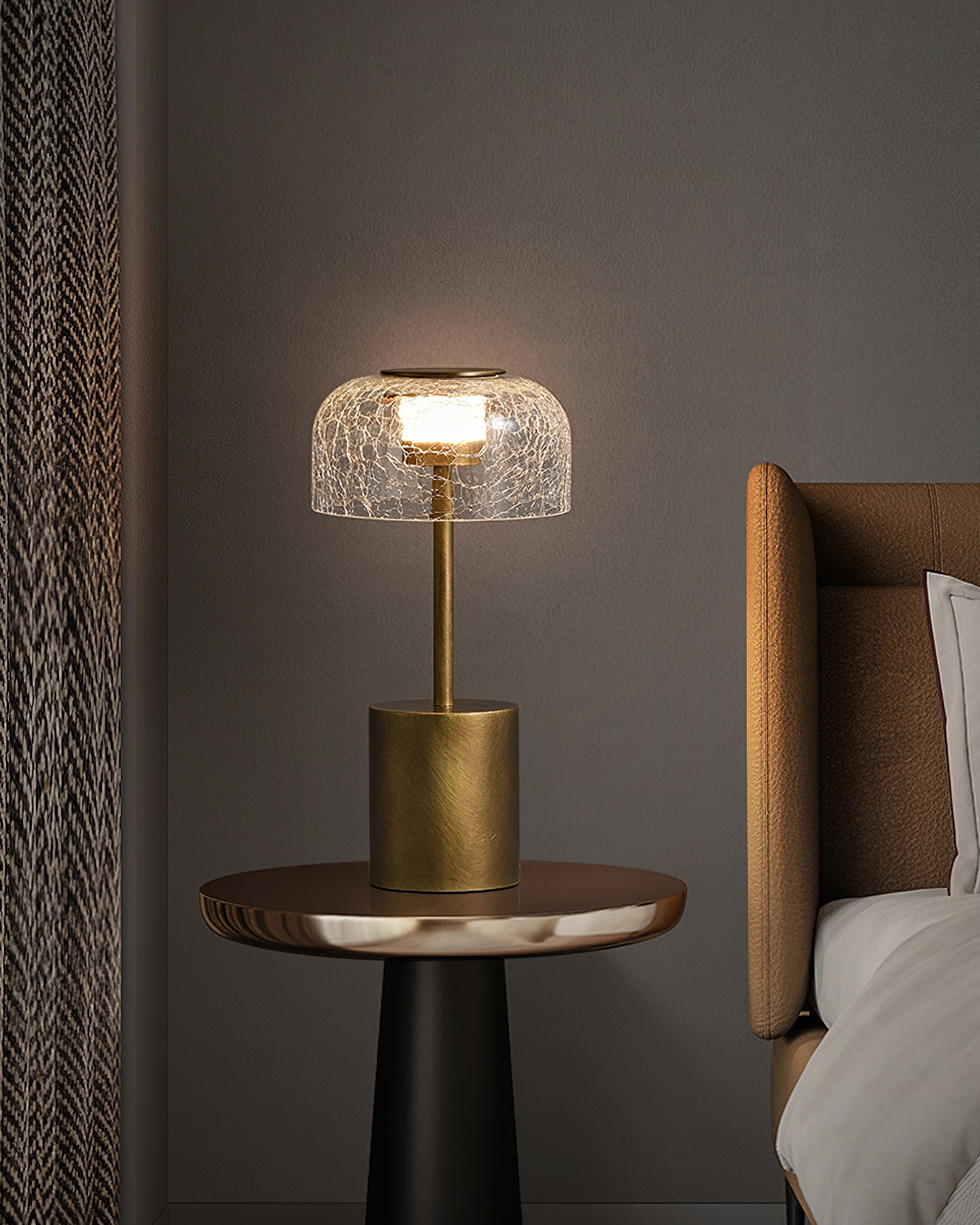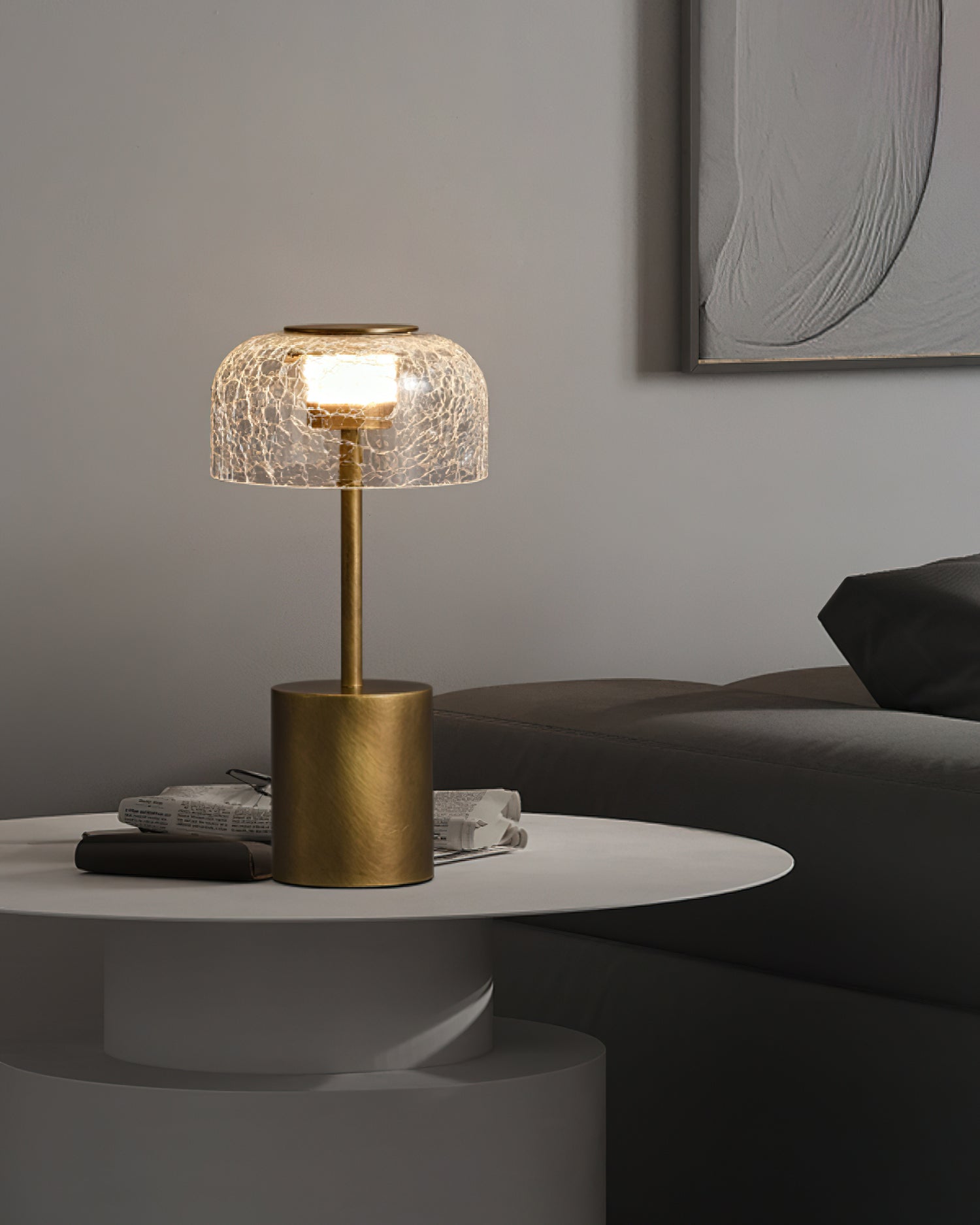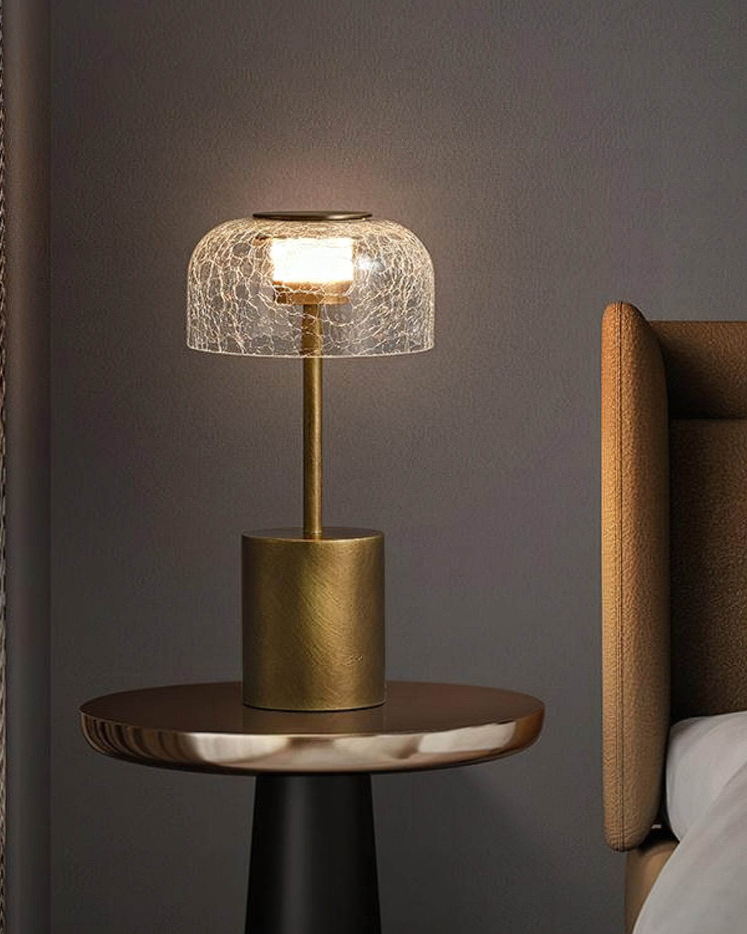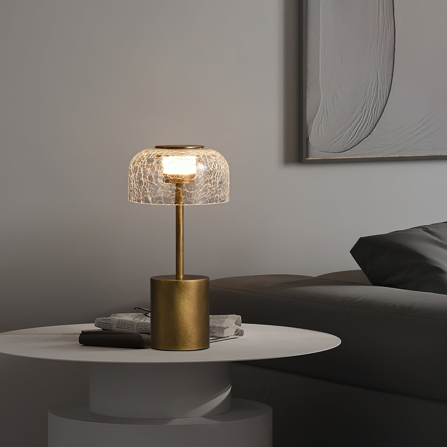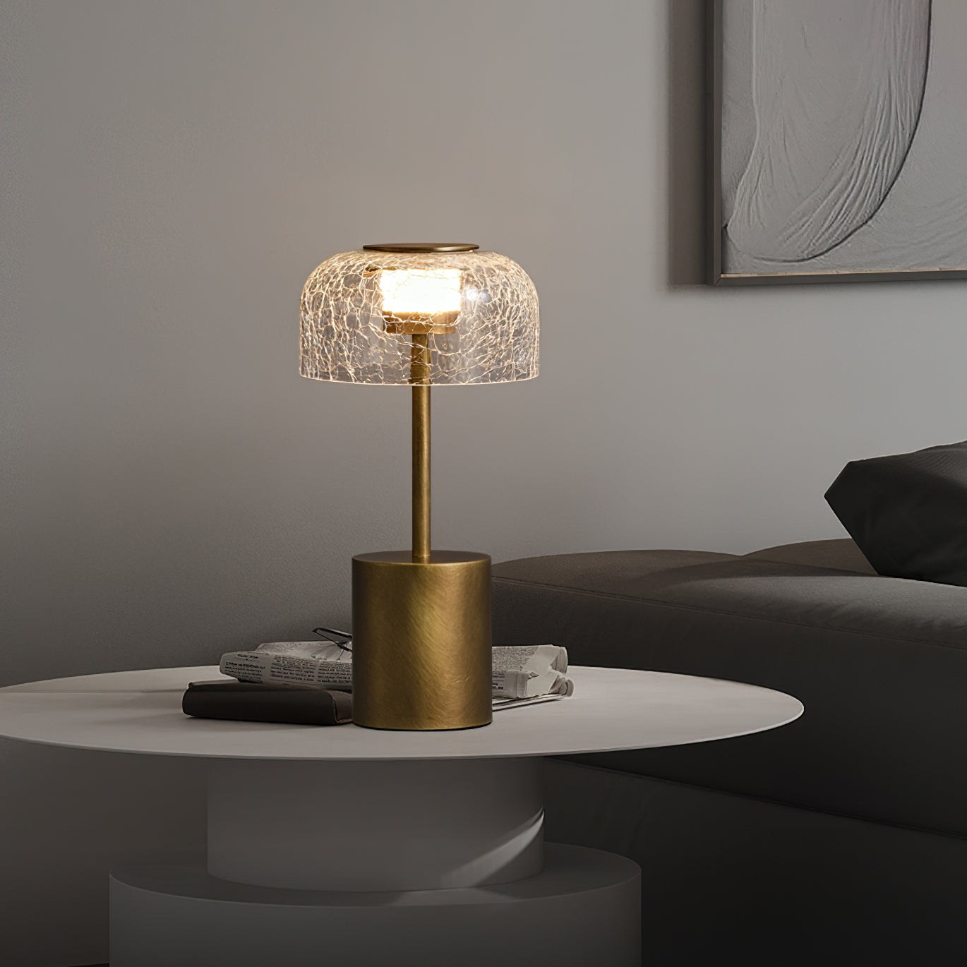 Illuminate your space with the Crackle Built-in Battery Table Lamp. The cracked glass lampshade elegantly refracts light, creating a mesmerizing display of ice and fire. The textured brushed lamp body adds a delicate touch to your home decor and allows you to adjust the lighting to create the perfect ambiance. Experience the enchantment of light and shadow interaction with this exquisite table lamp.