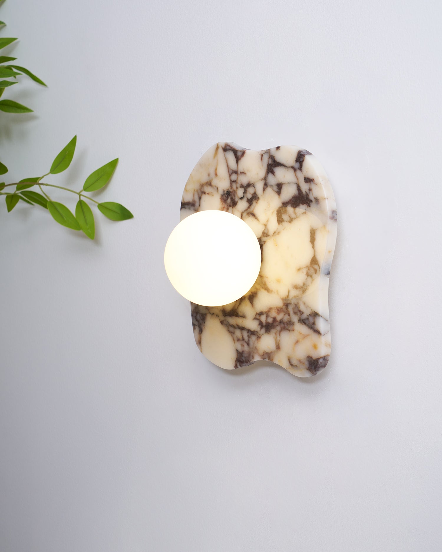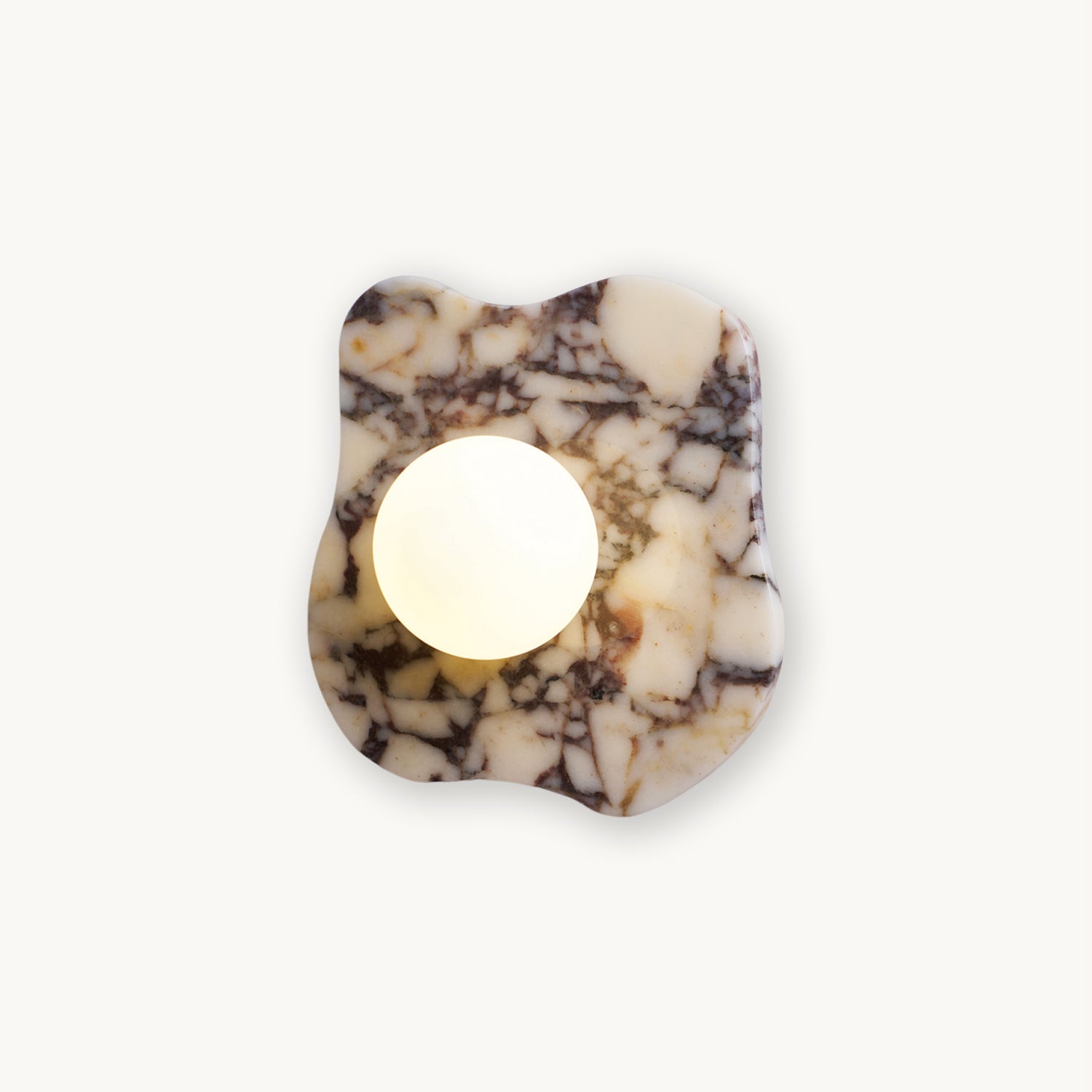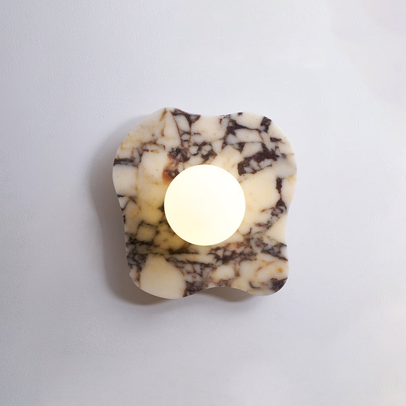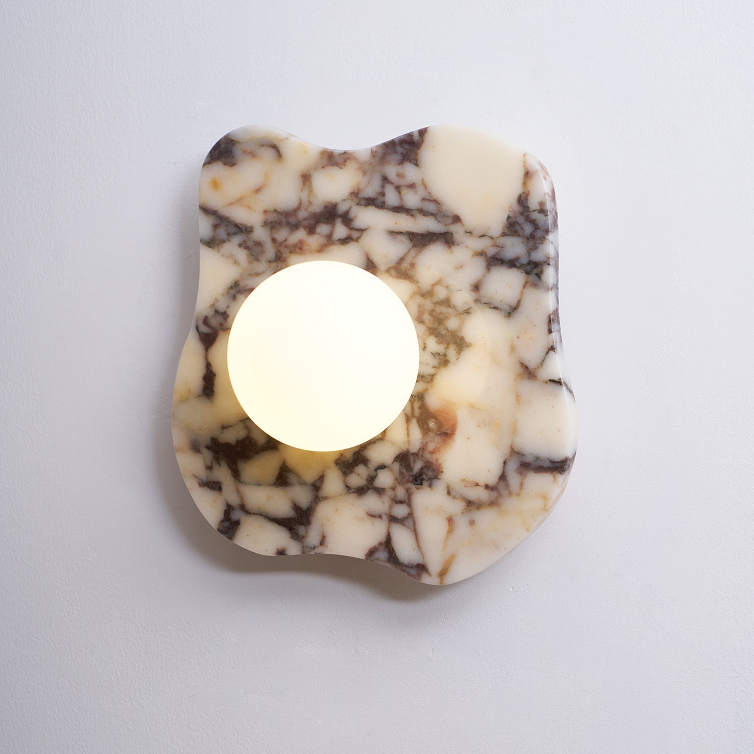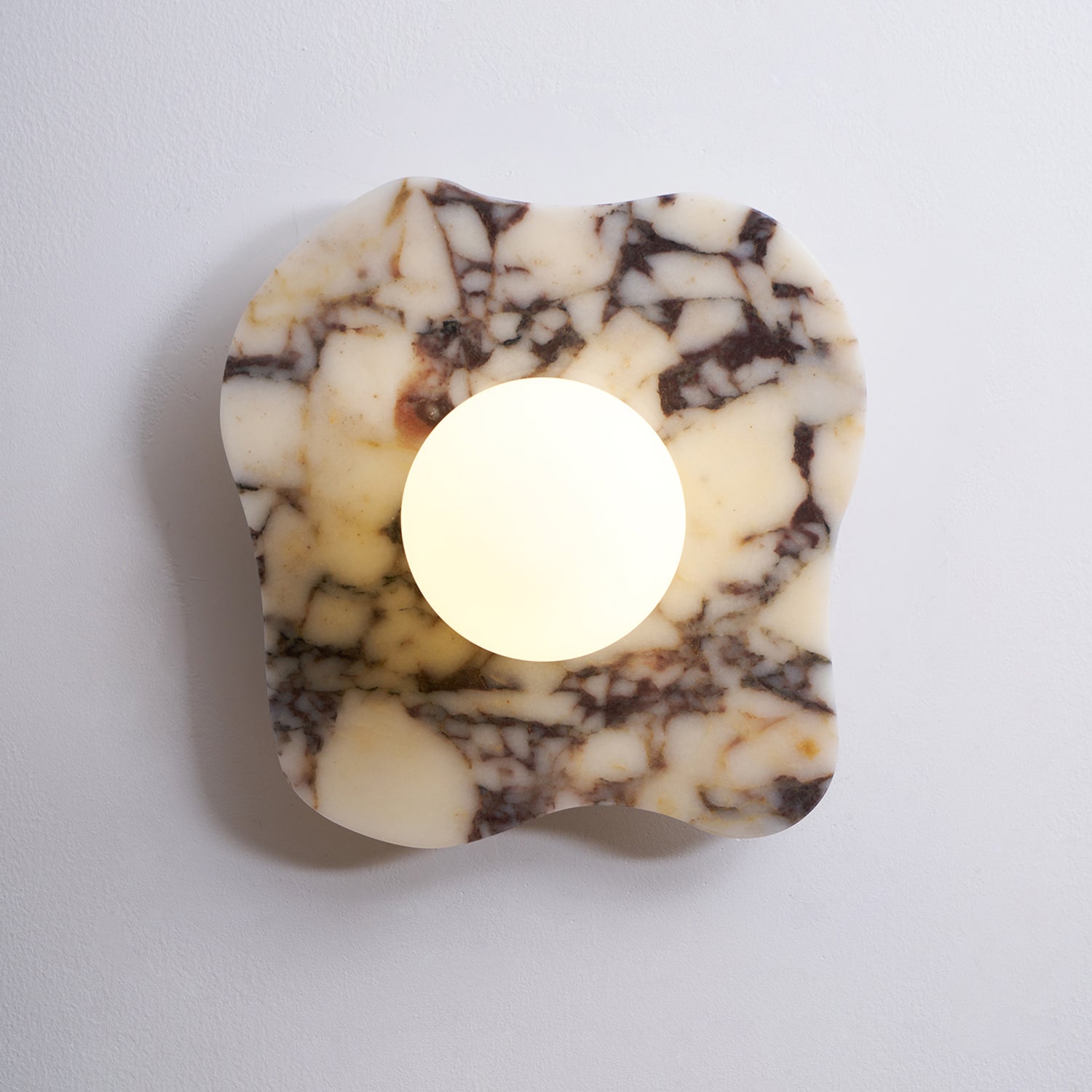 The Cristallo Wall Lamp by Mooijane showcases a striking asymmetrical form, blending natural artistry with contemporary design. Crafted from Bulgari purple iron marble, each piece reveals unique purple-brown veining across a milky white stone base—like a painting shaped by nature. A central circular light source softly illuminates the surface, casting warm, layered shadows. Both functional and sculptural, Cristallo is ideal for entryways, hallways, bedsides, or artful interiors seeking texture and elegance.