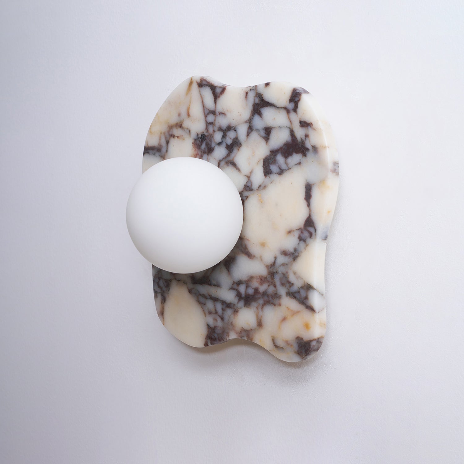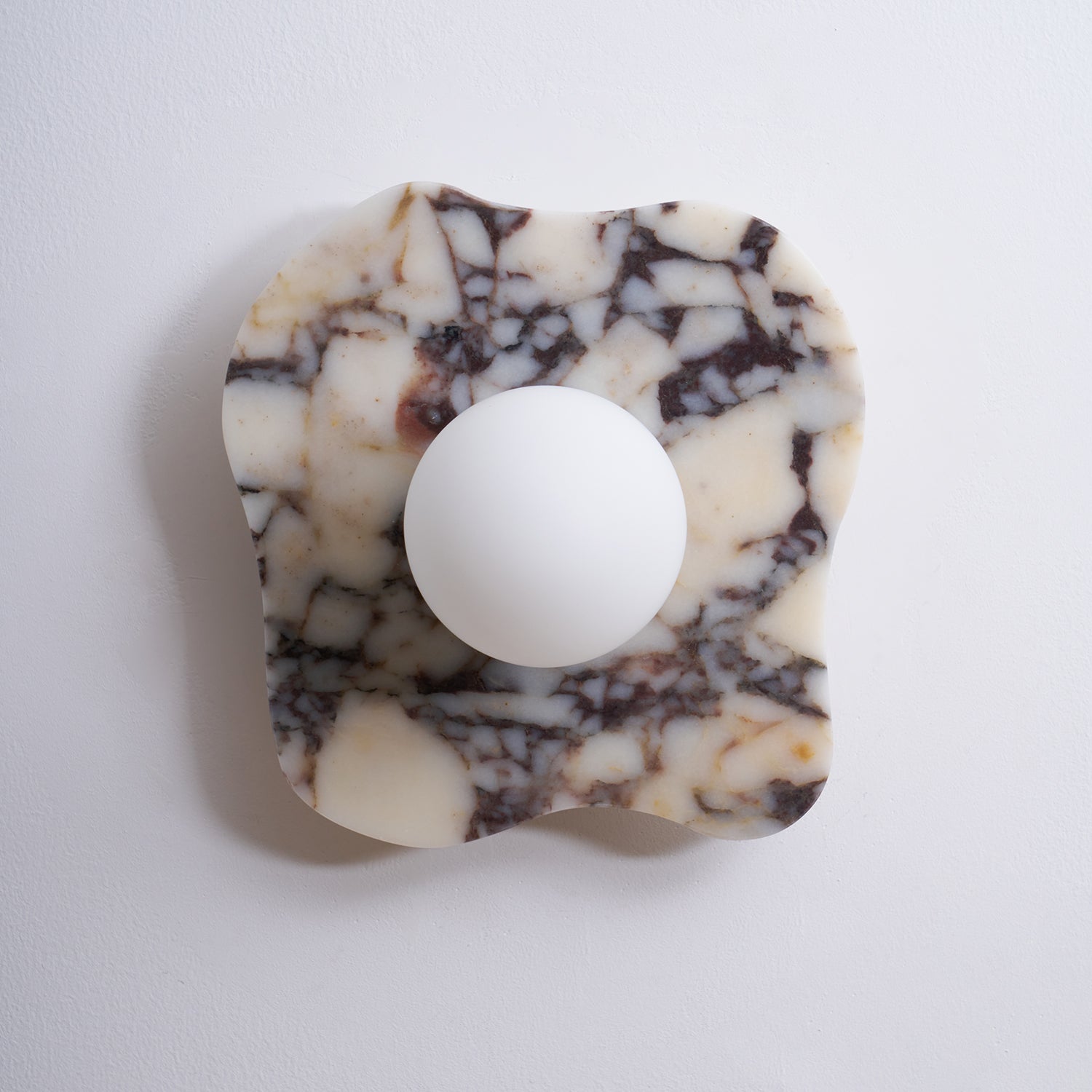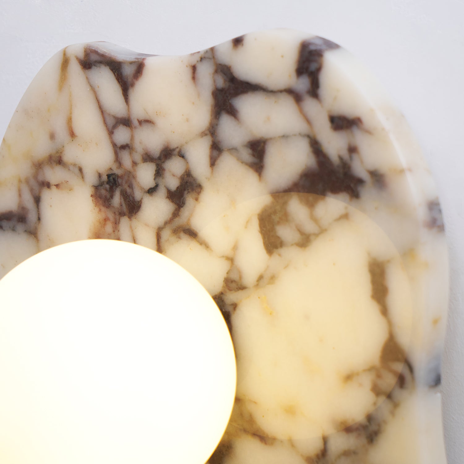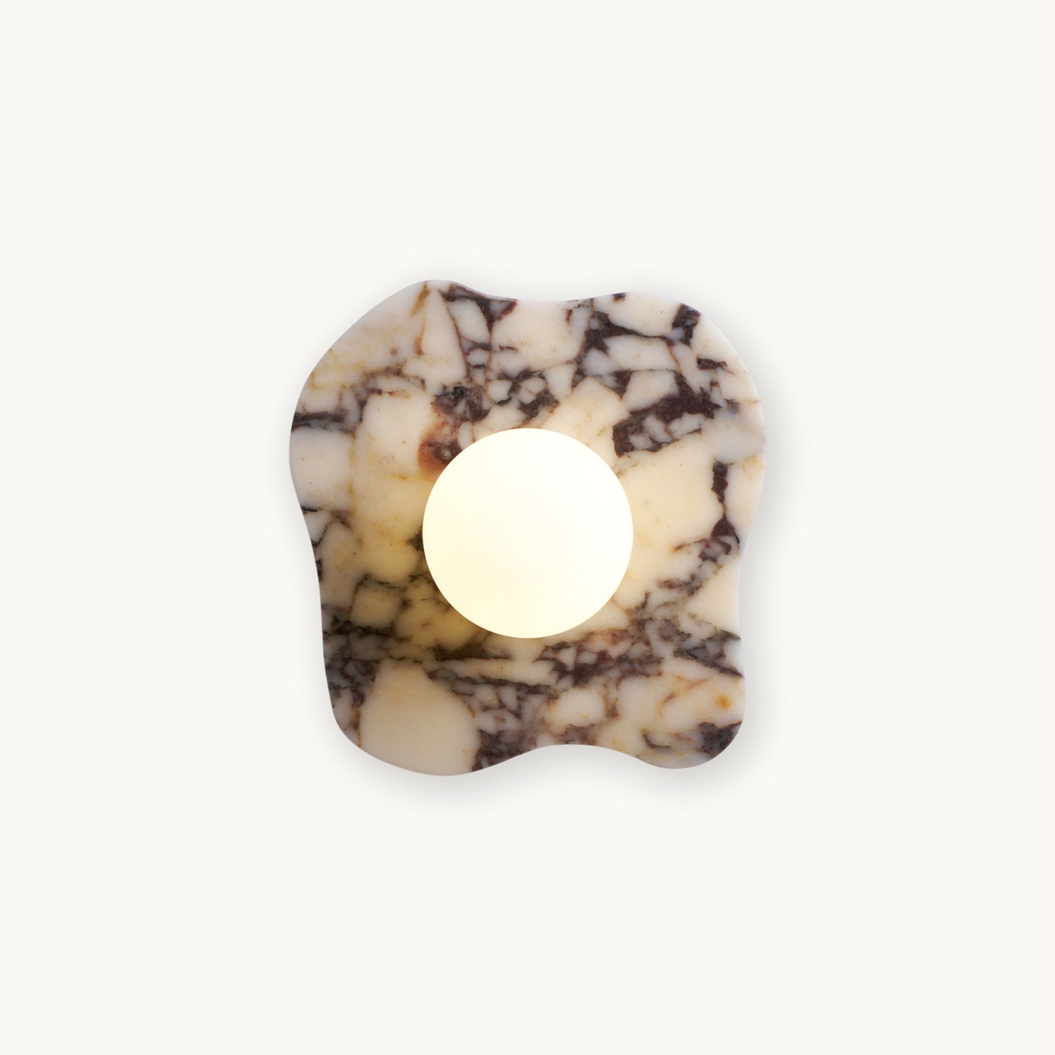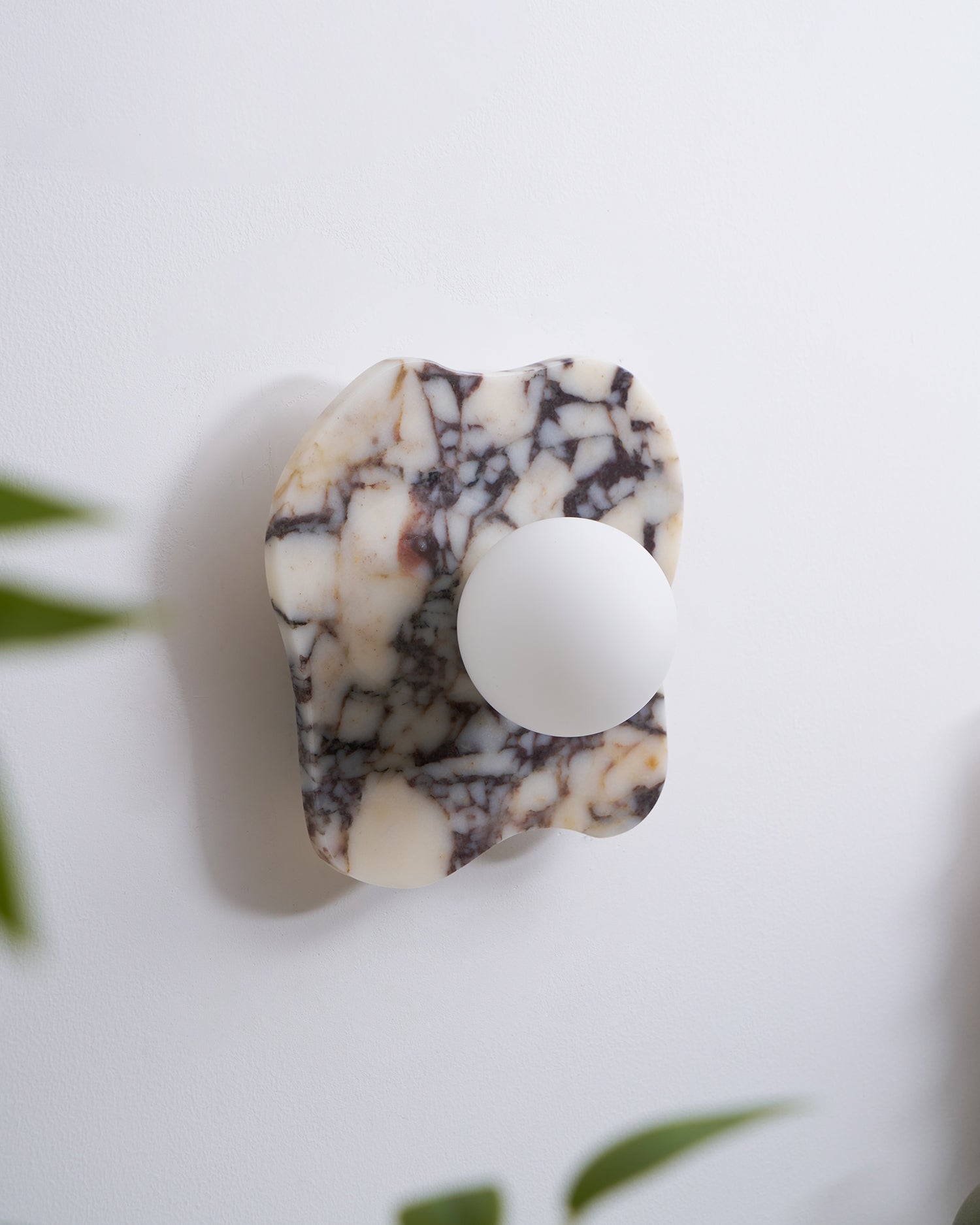 The Cristallo Wall Lamp by Mooijane showcases a striking asymmetrical form, blending natural artistry with contemporary design. Crafted from Bulgari purple iron marble, each piece reveals unique purple-brown veining across a milky white stone base—like a painting shaped by nature. A central circular light source softly illuminates the surface, casting warm, layered shadows. Both functional and sculptural, Cristallo is ideal for entryways, hallways, bedsides, or artful interiors seeking texture and elegance.
