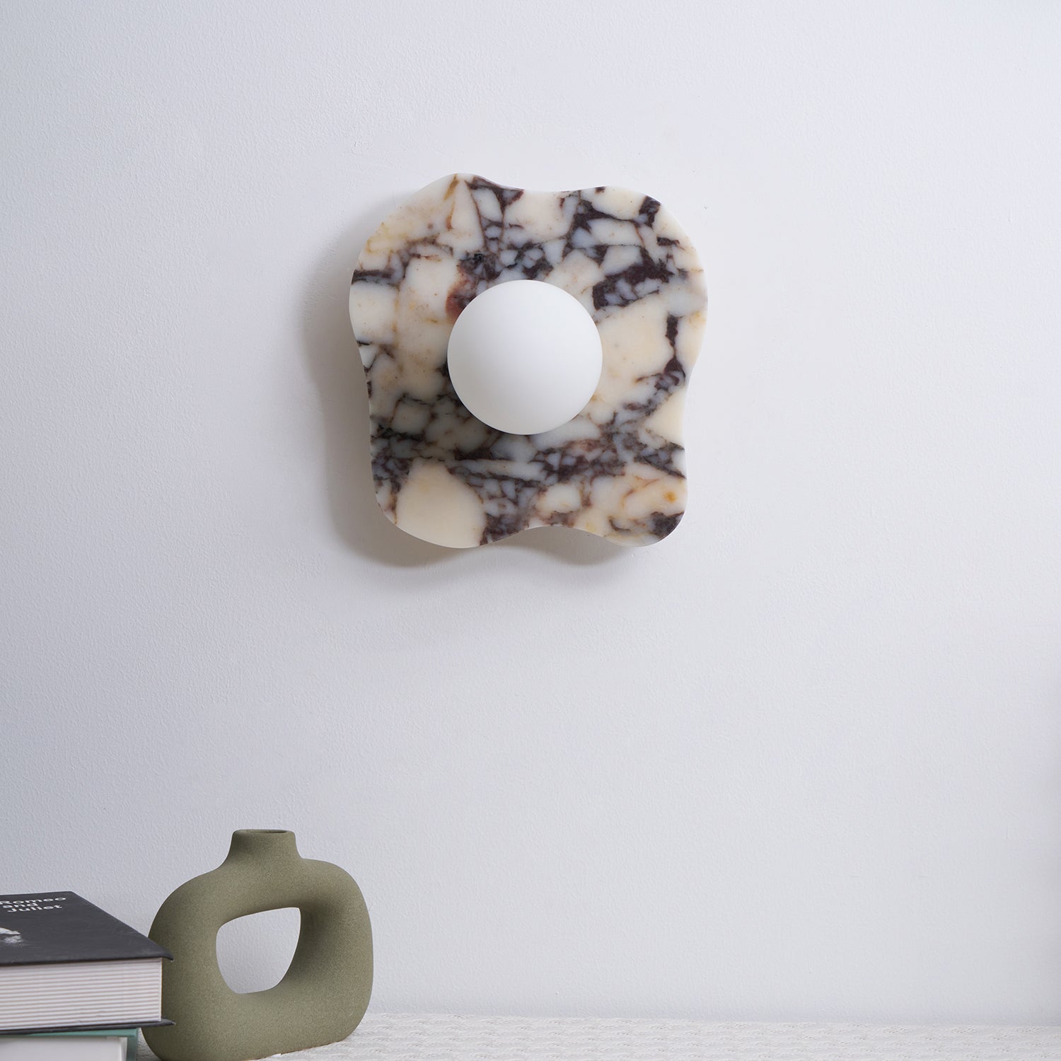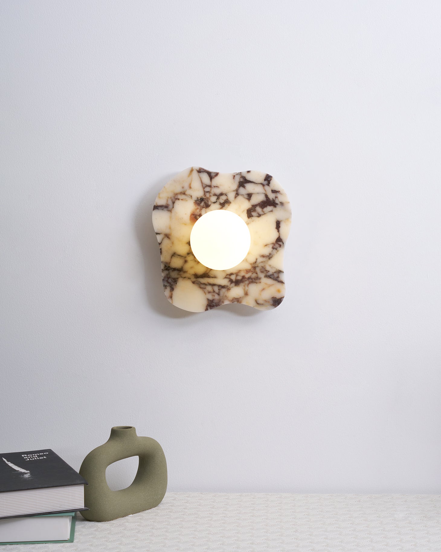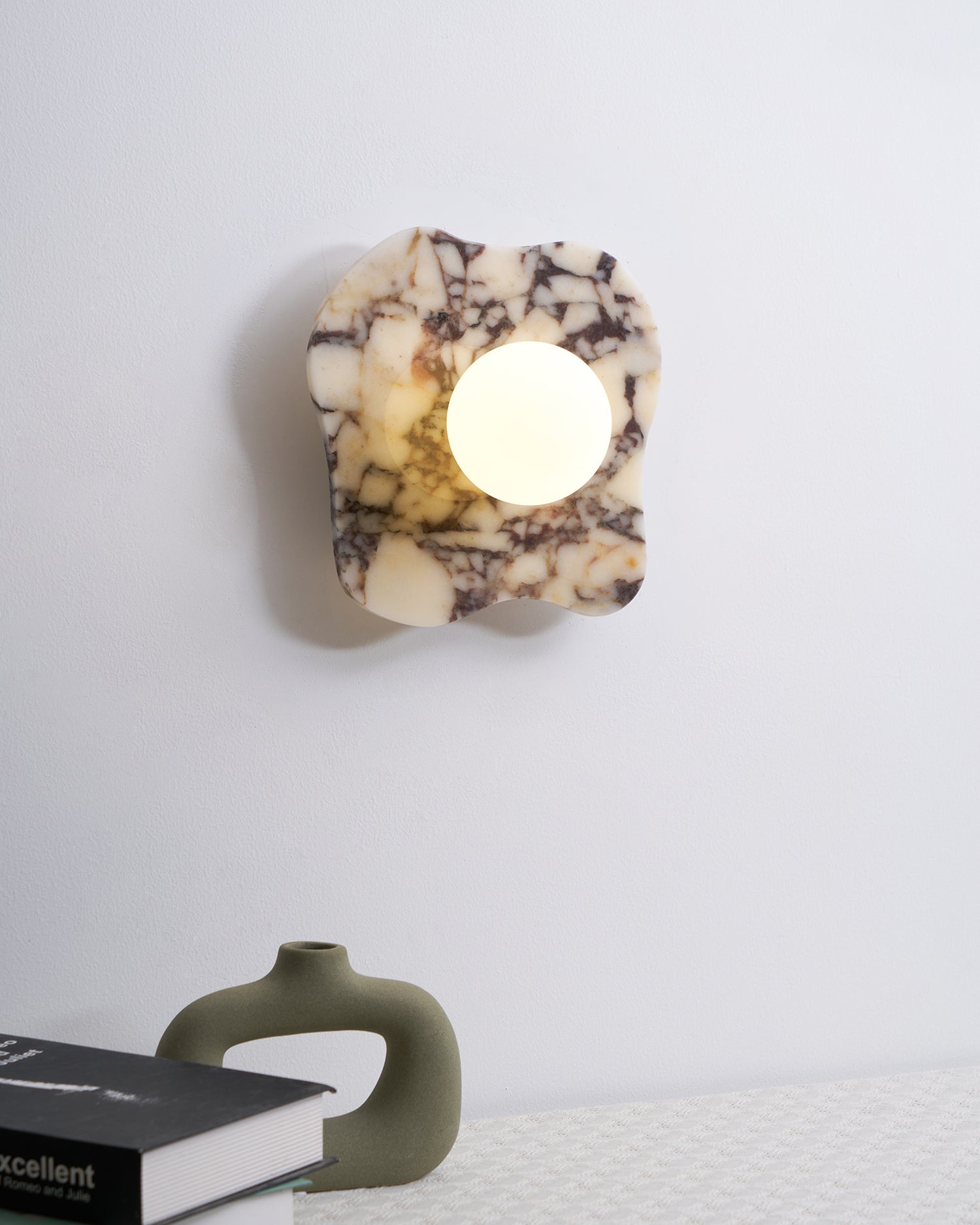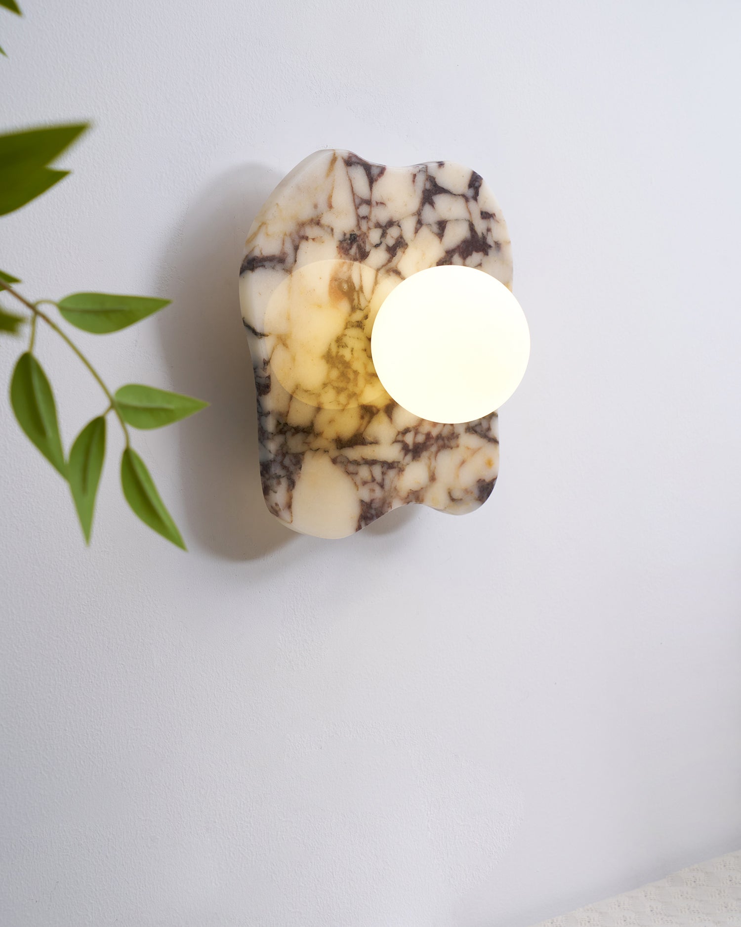 The Cristallo Wall Lamp by Mooijane showcases a striking asymmetrical form, blending natural artistry with contemporary design. Crafted from Bulgari purple iron marble, each piece reveals unique purple-brown veining across a milky white stone base—like a painting shaped by nature. A central circular light source softly illuminates the surface, casting warm, layered shadows. Both functional and sculptural, Cristallo is ideal for entryways, hallways, bedsides, or artful interiors seeking texture and elegance.