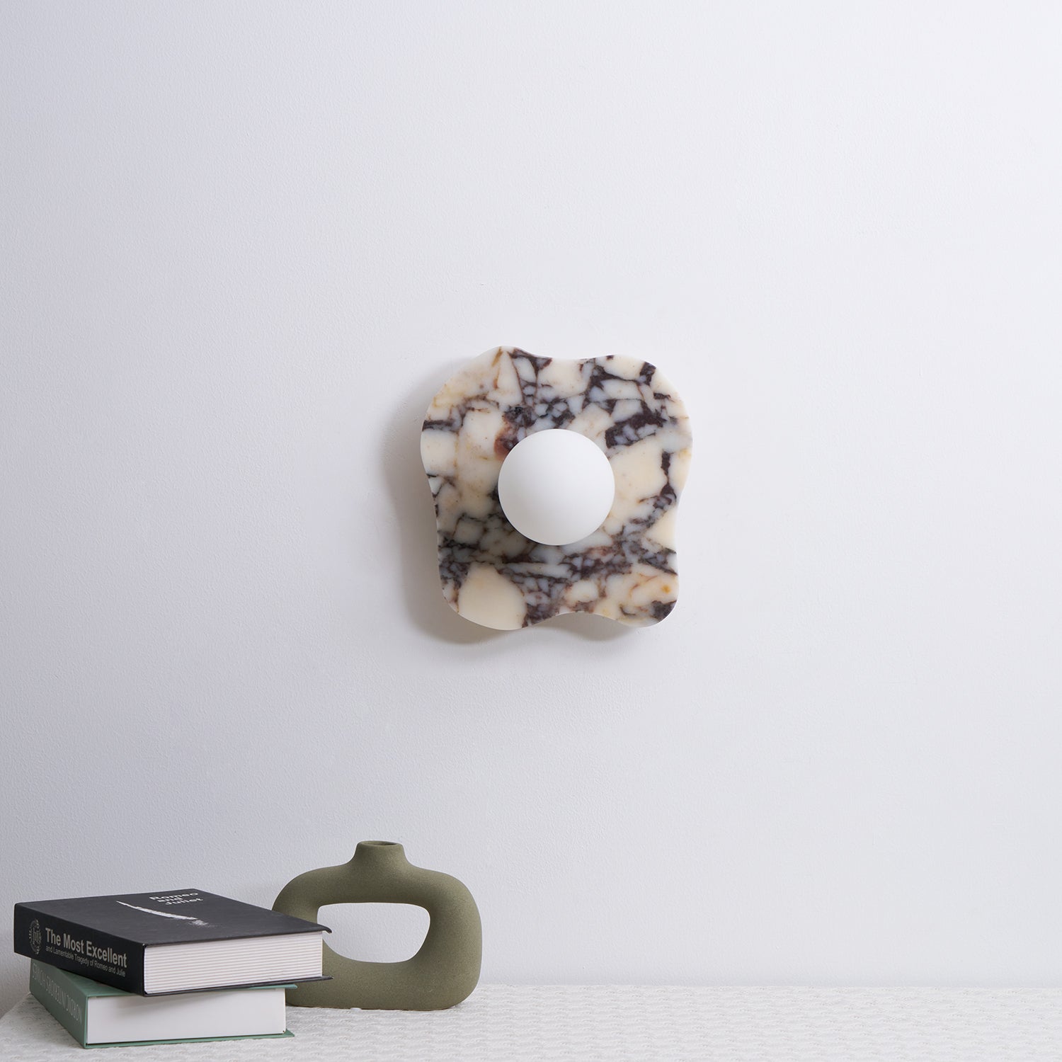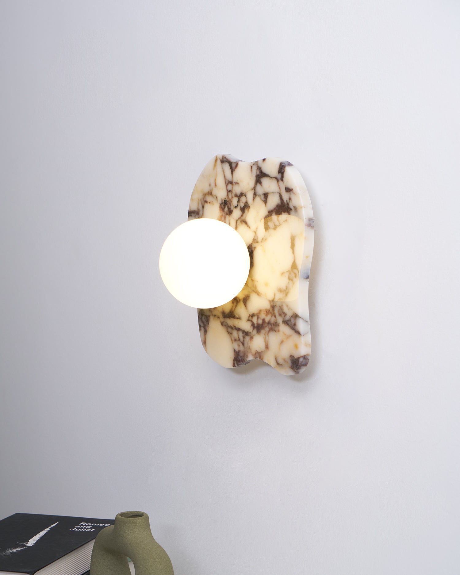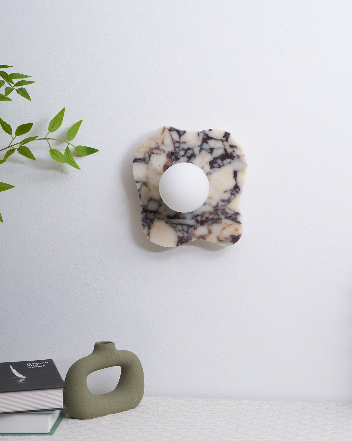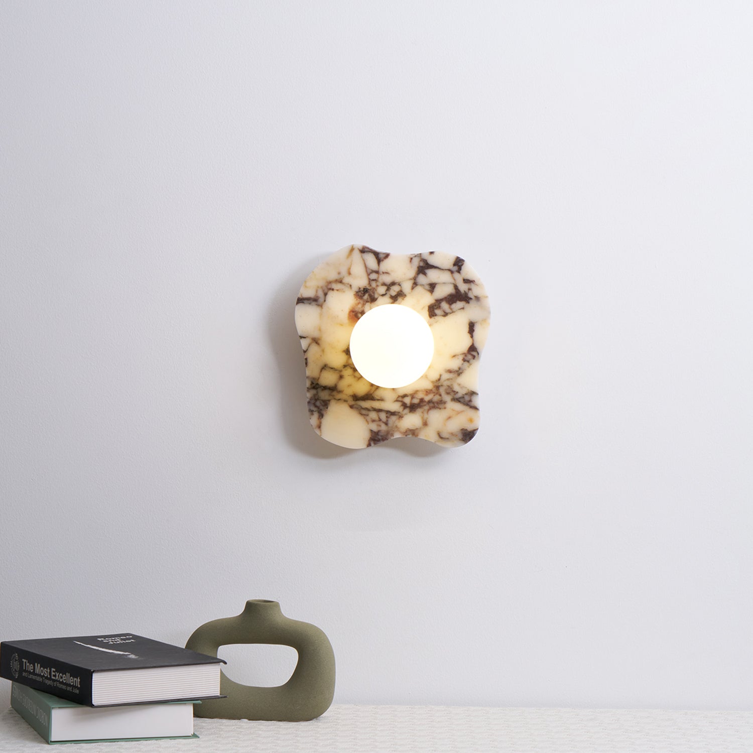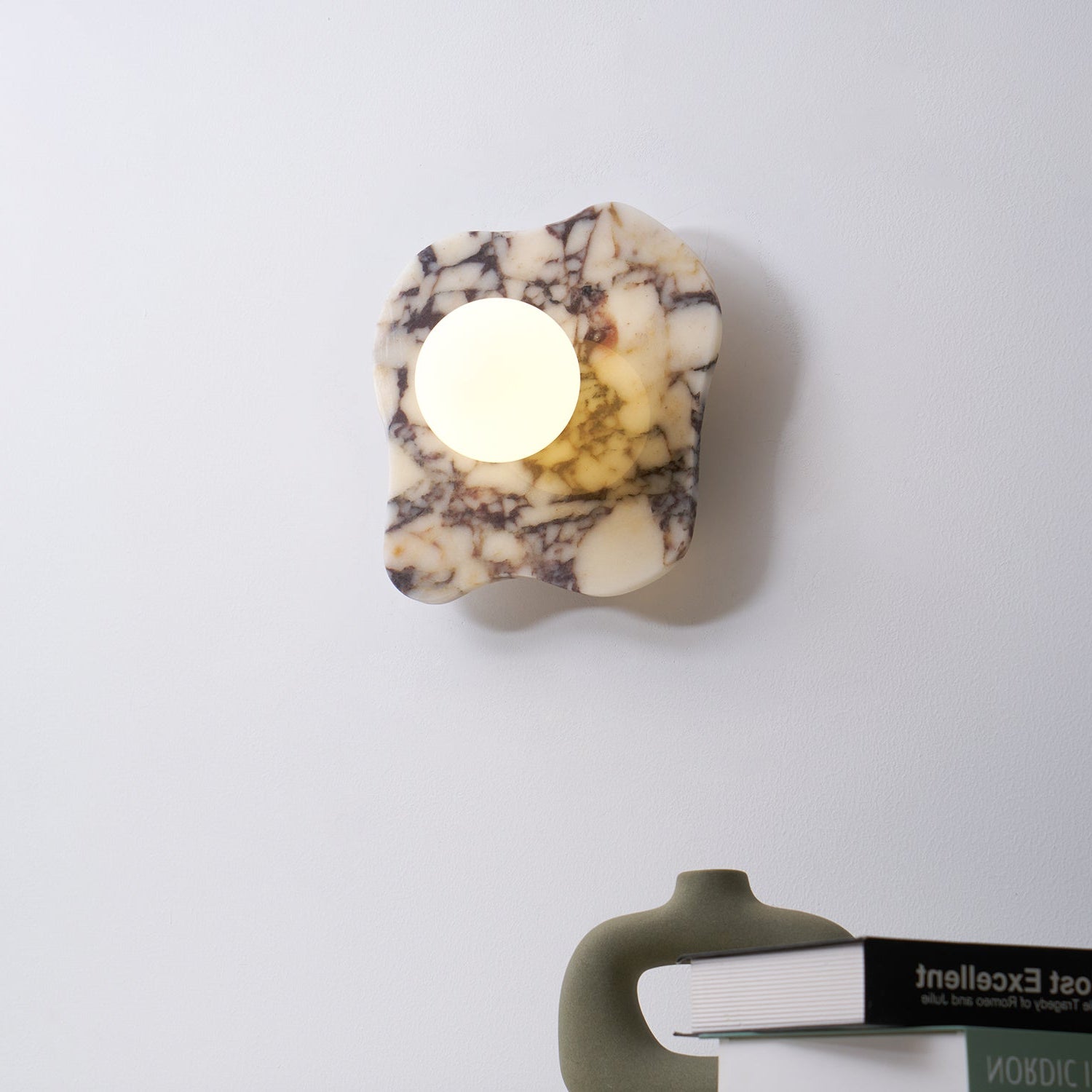 The Cristallo Wall Lamp by Mooijane showcases a striking asymmetrical form, blending natural artistry with contemporary design. Crafted from Bulgari purple iron marble, each piece reveals unique purple-brown veining across a milky white stone base—like a painting shaped by nature. A central circular light source softly illuminates the surface, casting warm, layered shadows. Both functional and sculptural, Cristallo is ideal for entryways, hallways, bedsides, or artful interiors seeking texture and elegance.