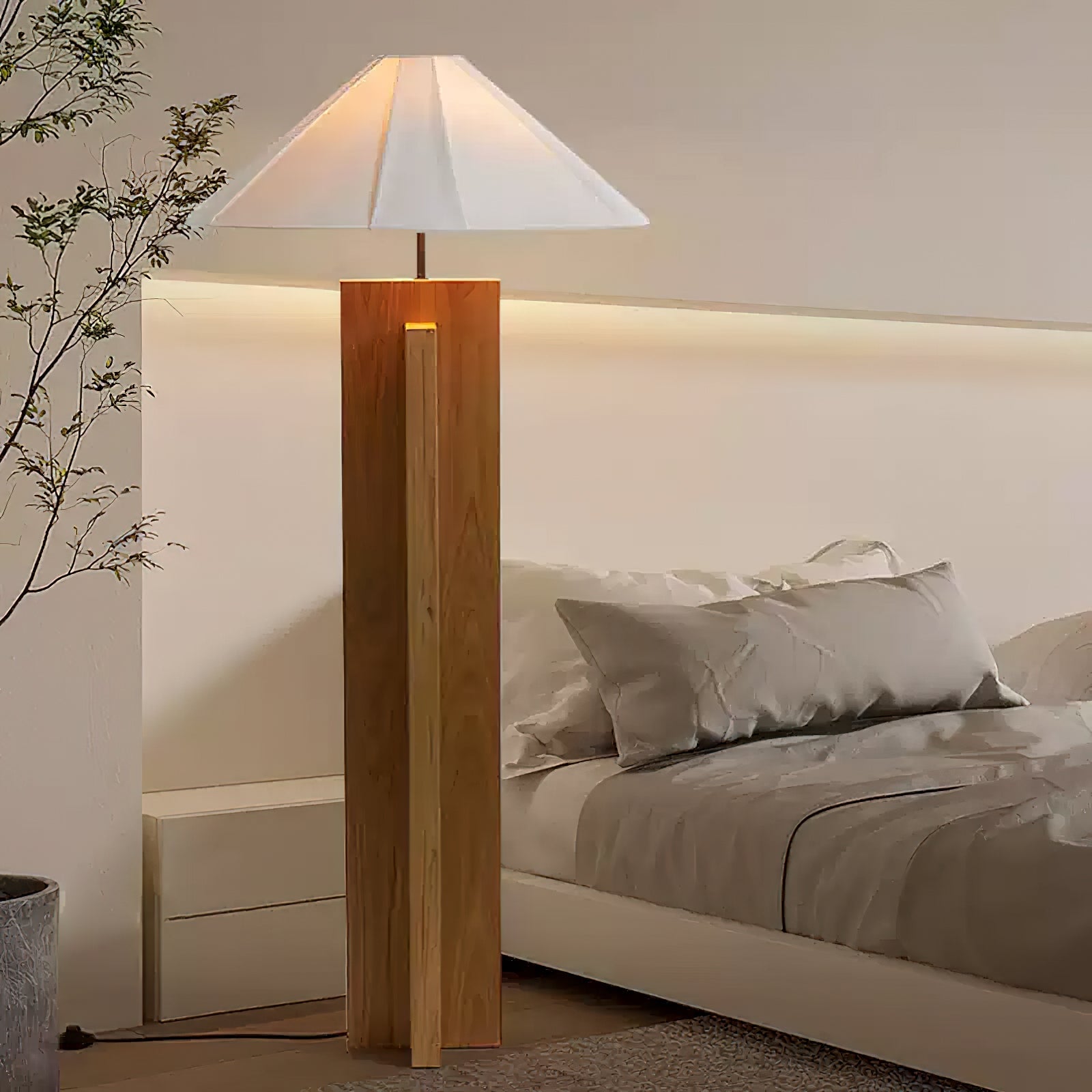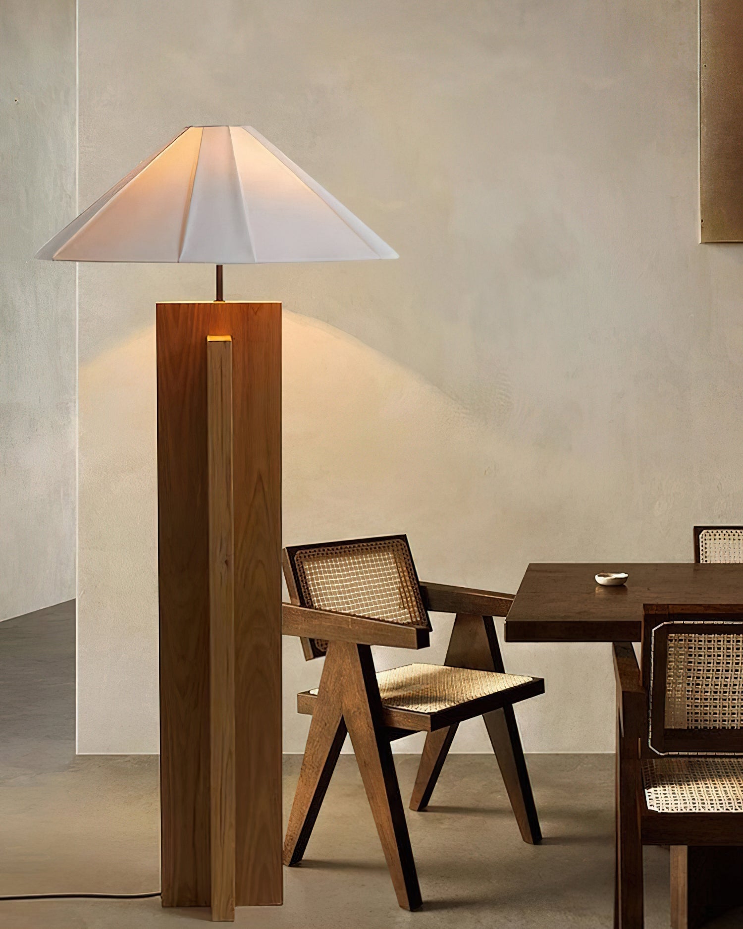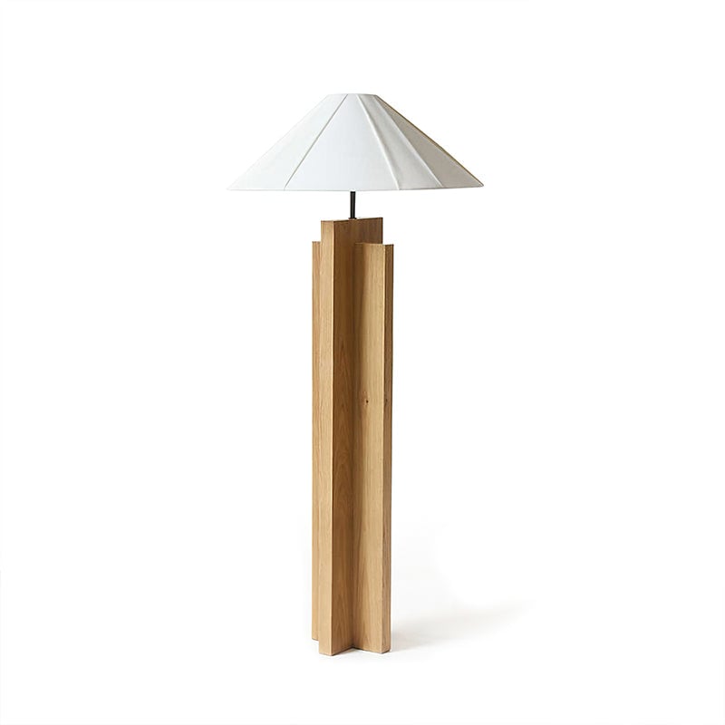 Elevate your interior design with the Crossbase Wooden Floor Lamp from Mooijane. Crafted with natural wood, sturdy metal, and soft fabric, this minimalist masterpiece boasts a geometric crossbase for a sleek and modern touch. The clean white lampshade beautifully diffuses light, creating a warm and cozy atmosphere in any room.