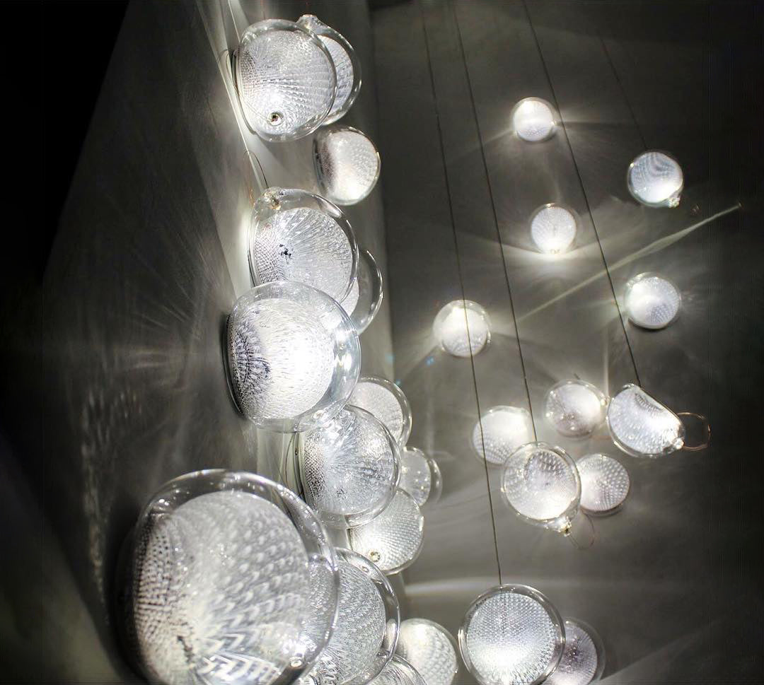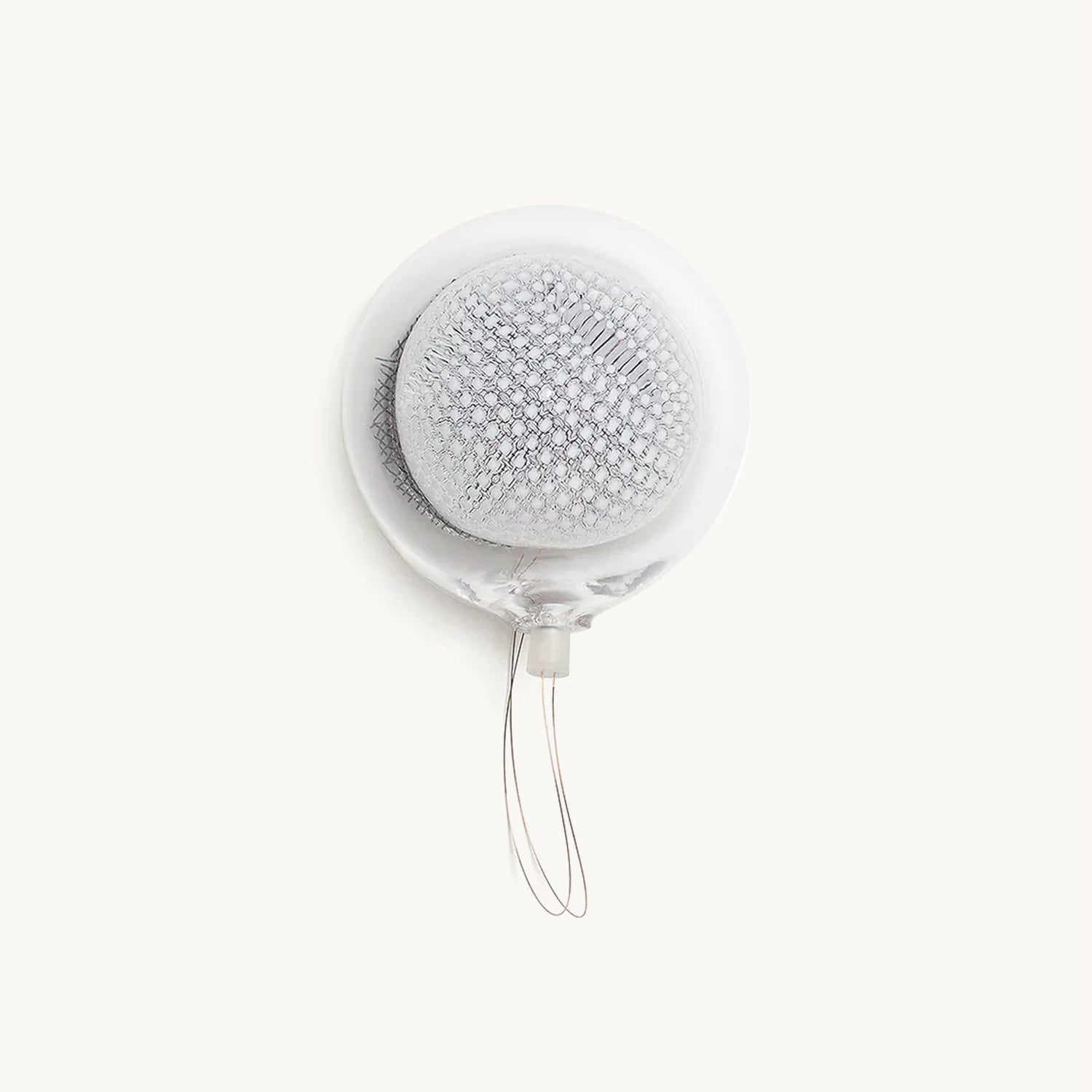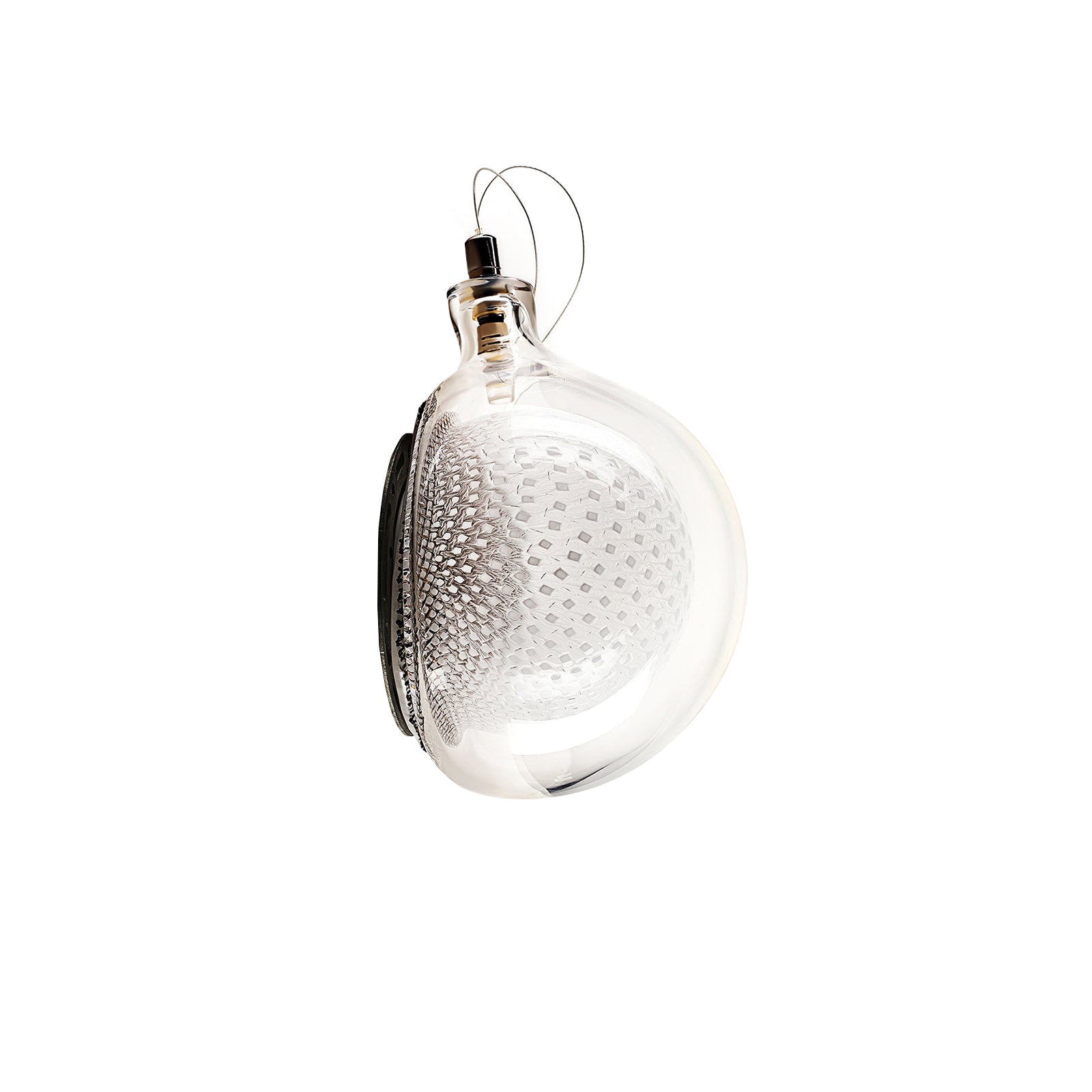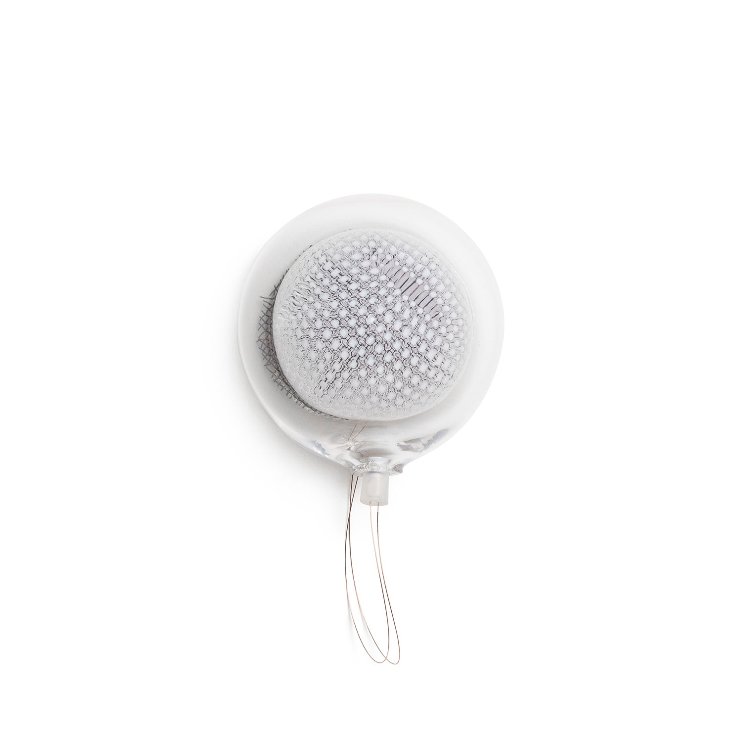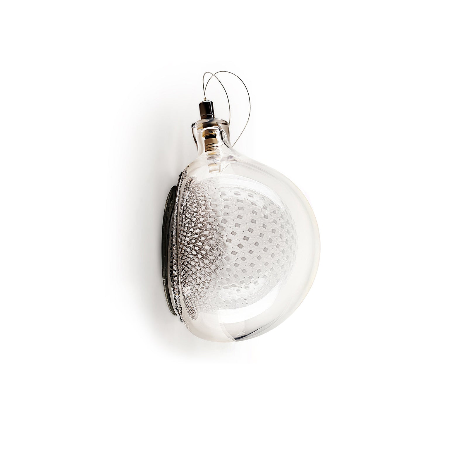 This low-voltage wall- or ceiling-mounted light is a blown glass pendant that houses a 1-watt LED lamp. Please note that the copper mesh used within may be affected by heat and oxidization during the glass-blowing process. These small oxidized edges can sometimes separate within the pendant; this is a natural characteristic of the metal and is seen as an evolution of the piece as it ages.