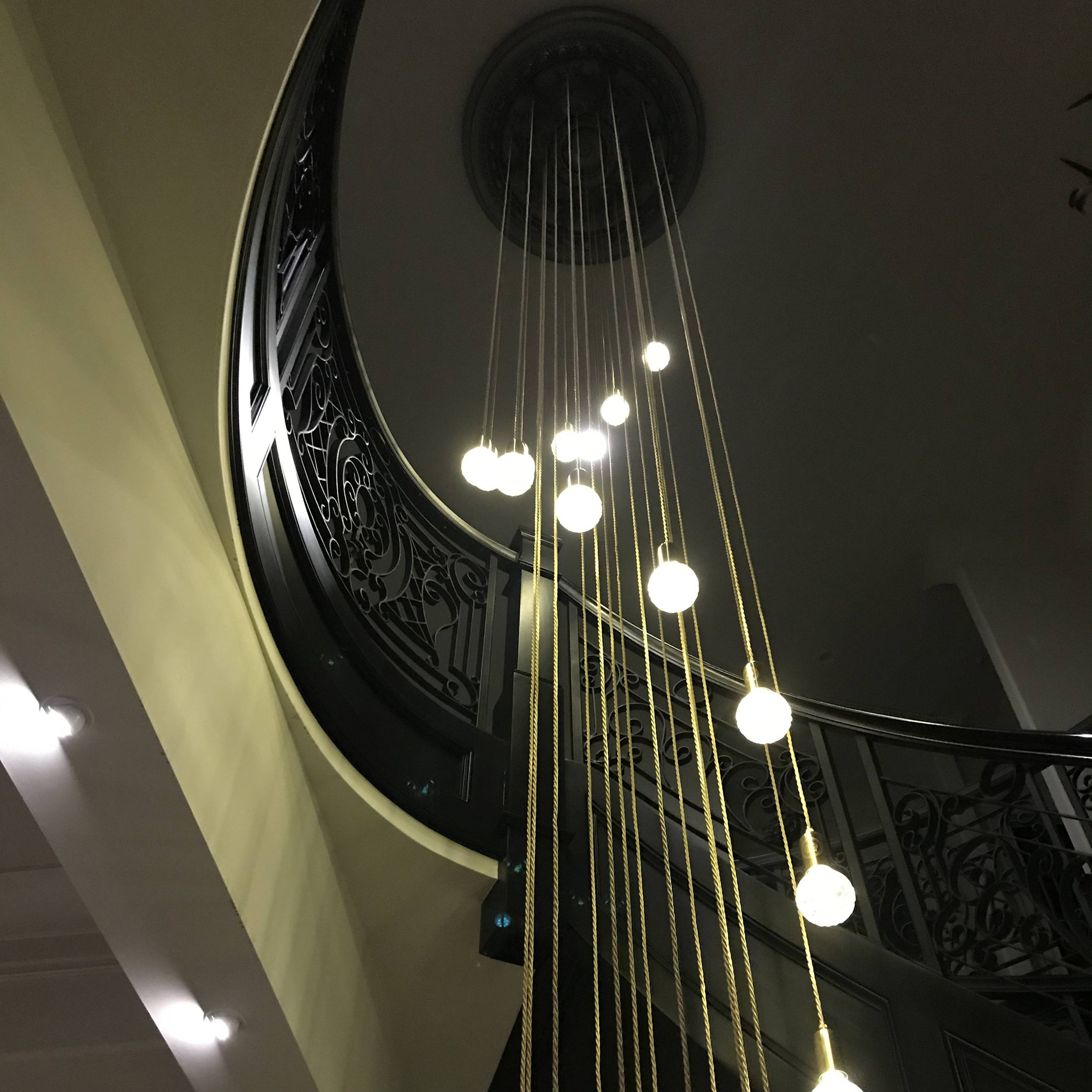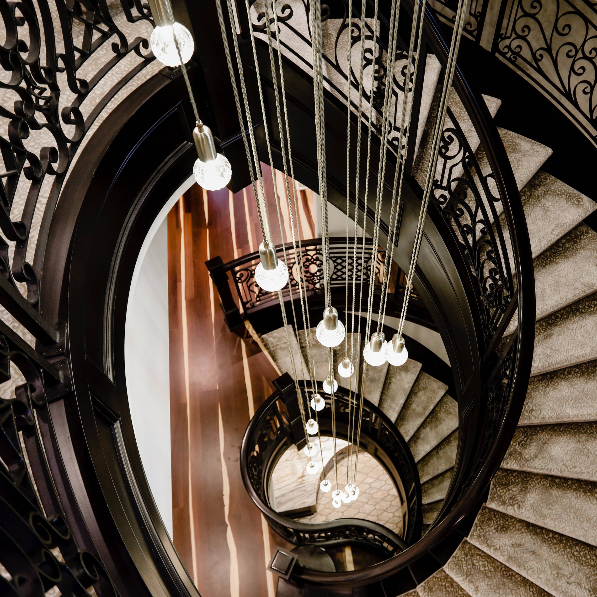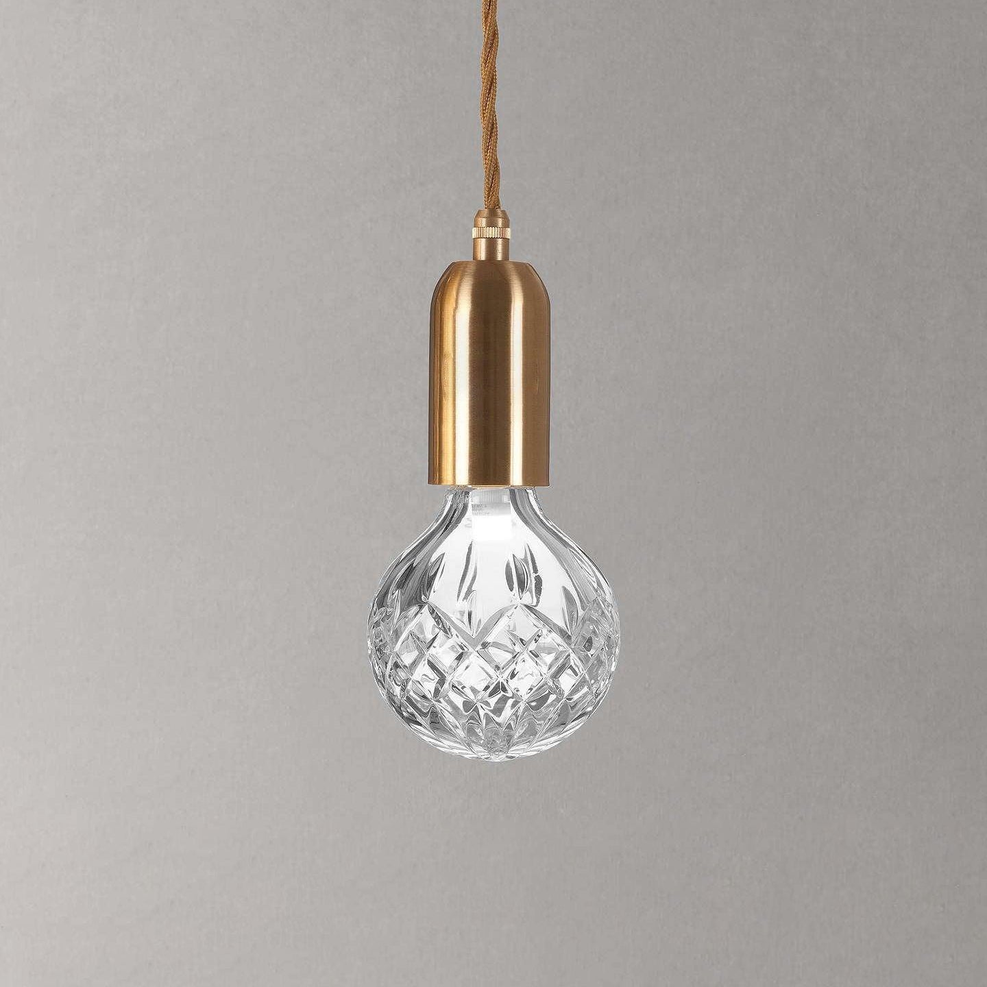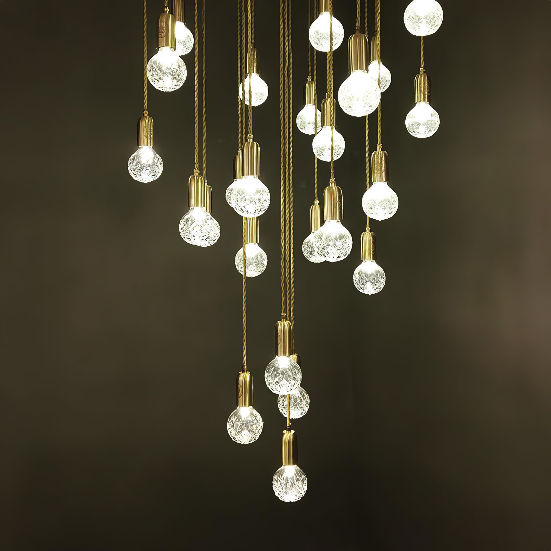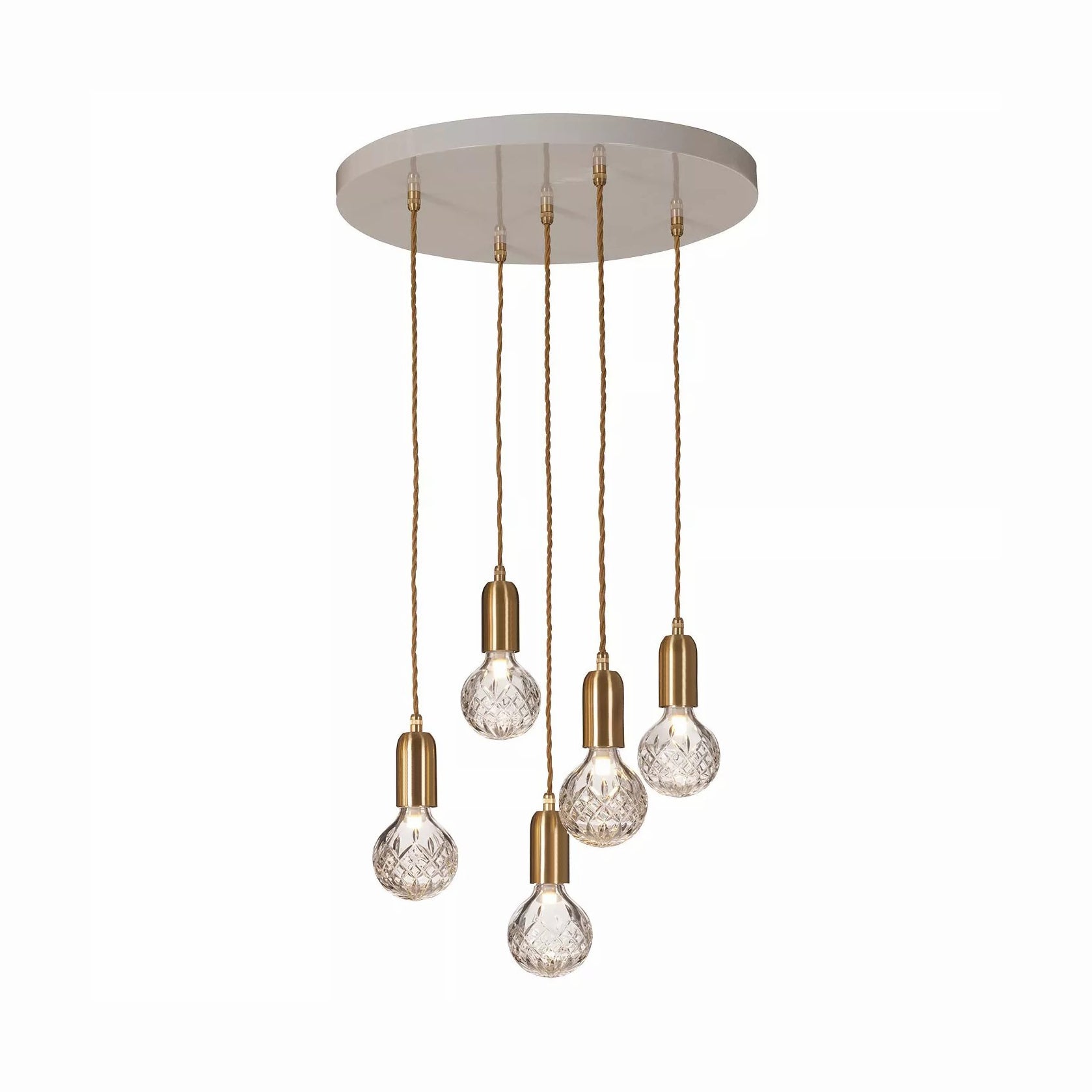 The Crystal Bulb LED Multi-Light Pendant, Takes inspiration from the exquisite and meticulous process of crystal cutting, commonly seen in traditional whiskey glasses and decanters. A grouping of spherical crystal shades suspends in an elegant composition, highlighted by their sophisticated hand-cut design. LED lighting diffused by the shades culminates into a clean ambient glow that accentuates the engraved ornamental logo on each of the Steel lamp holders.