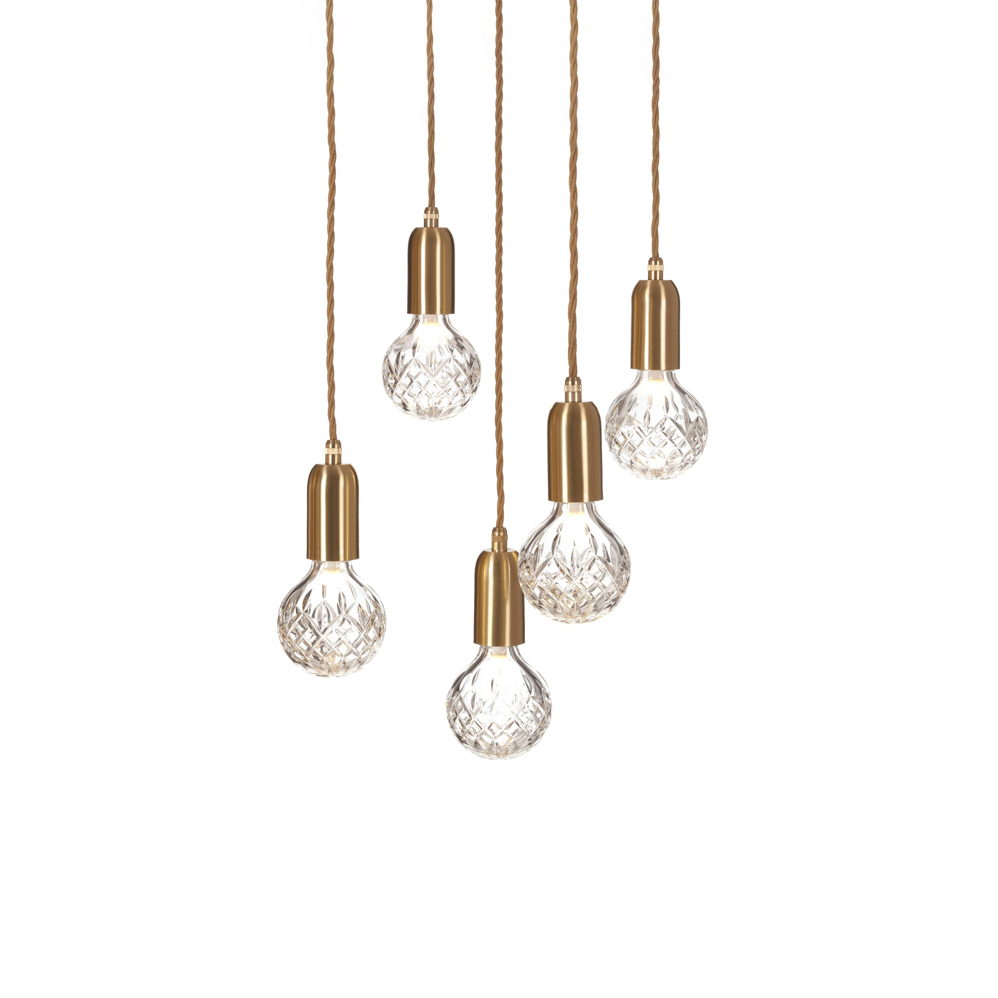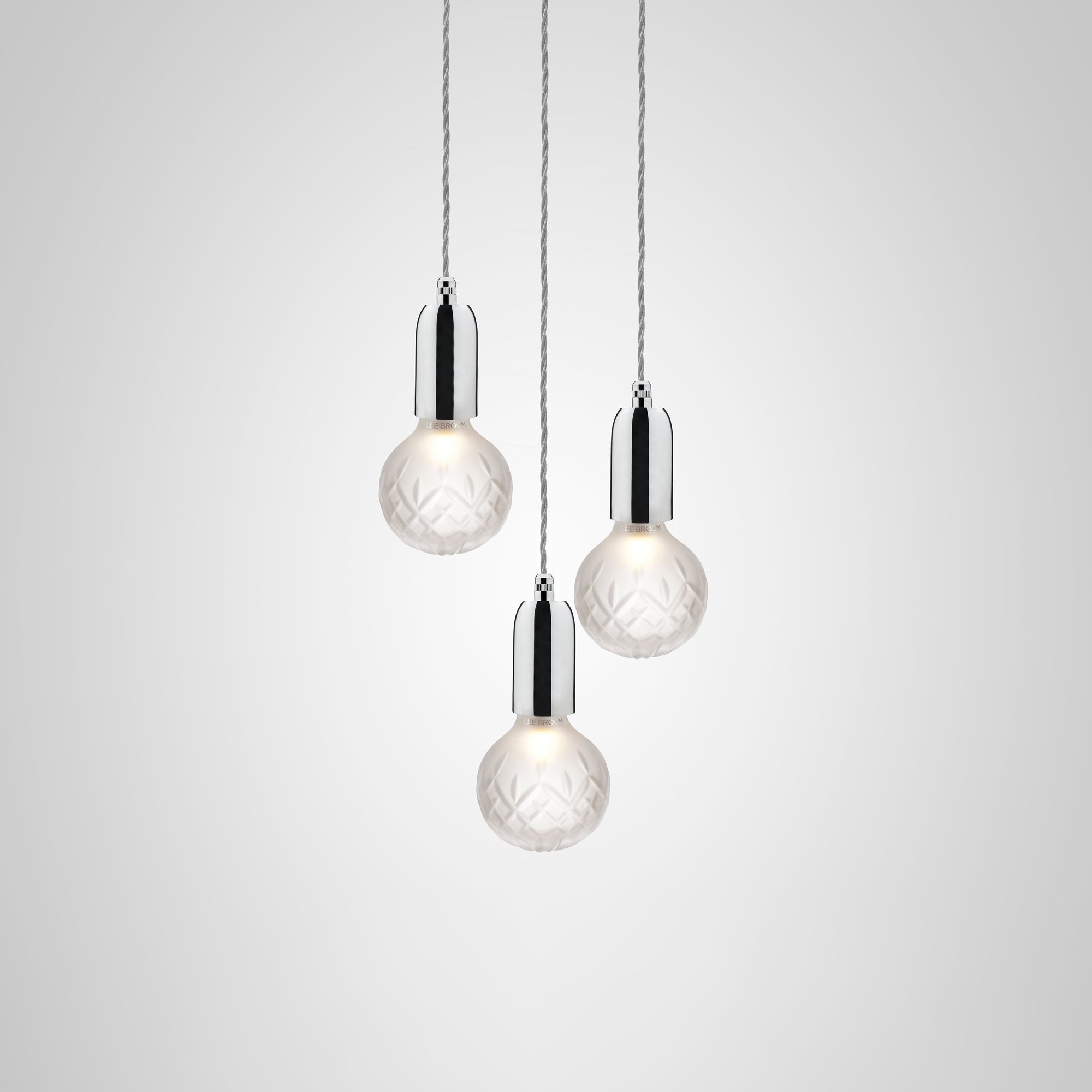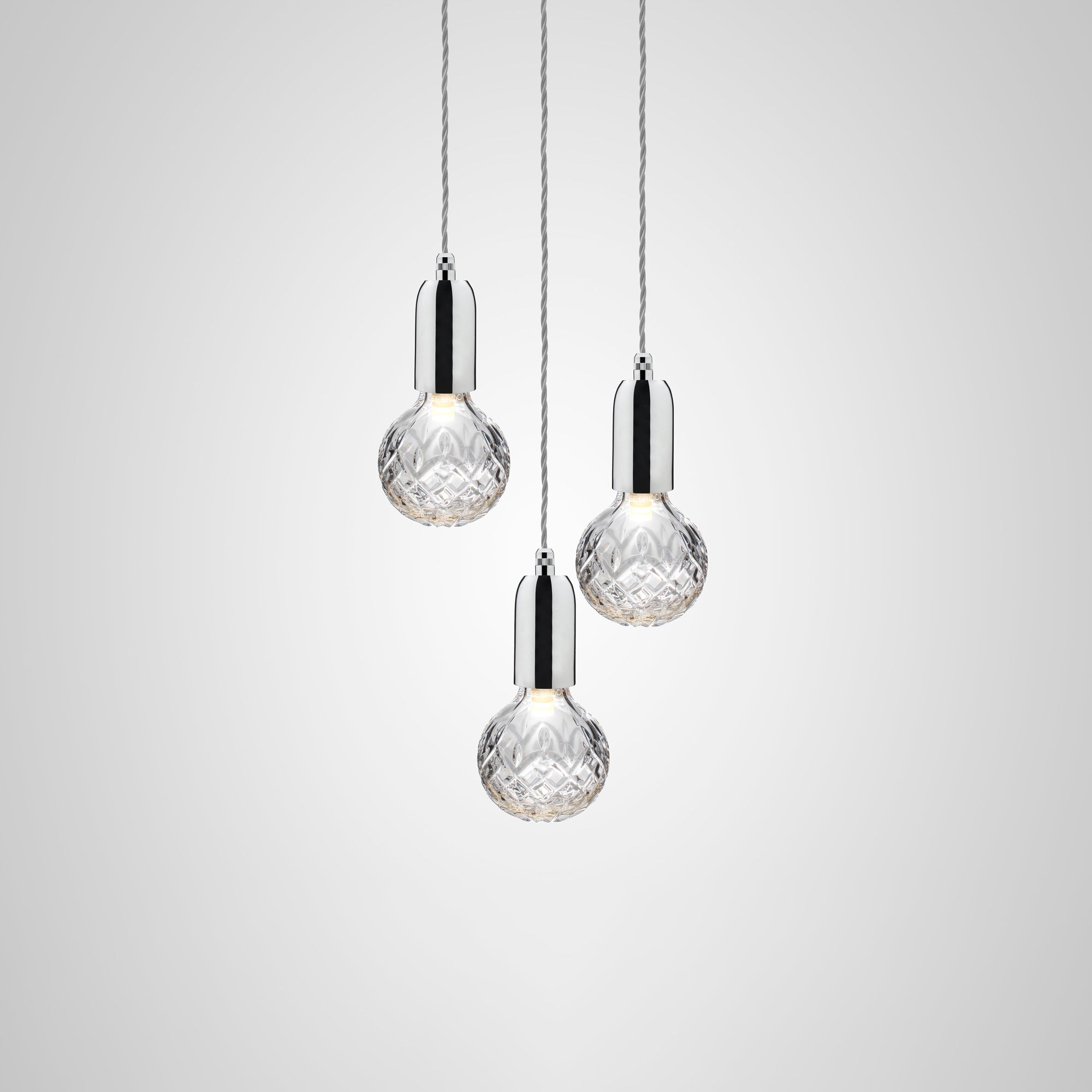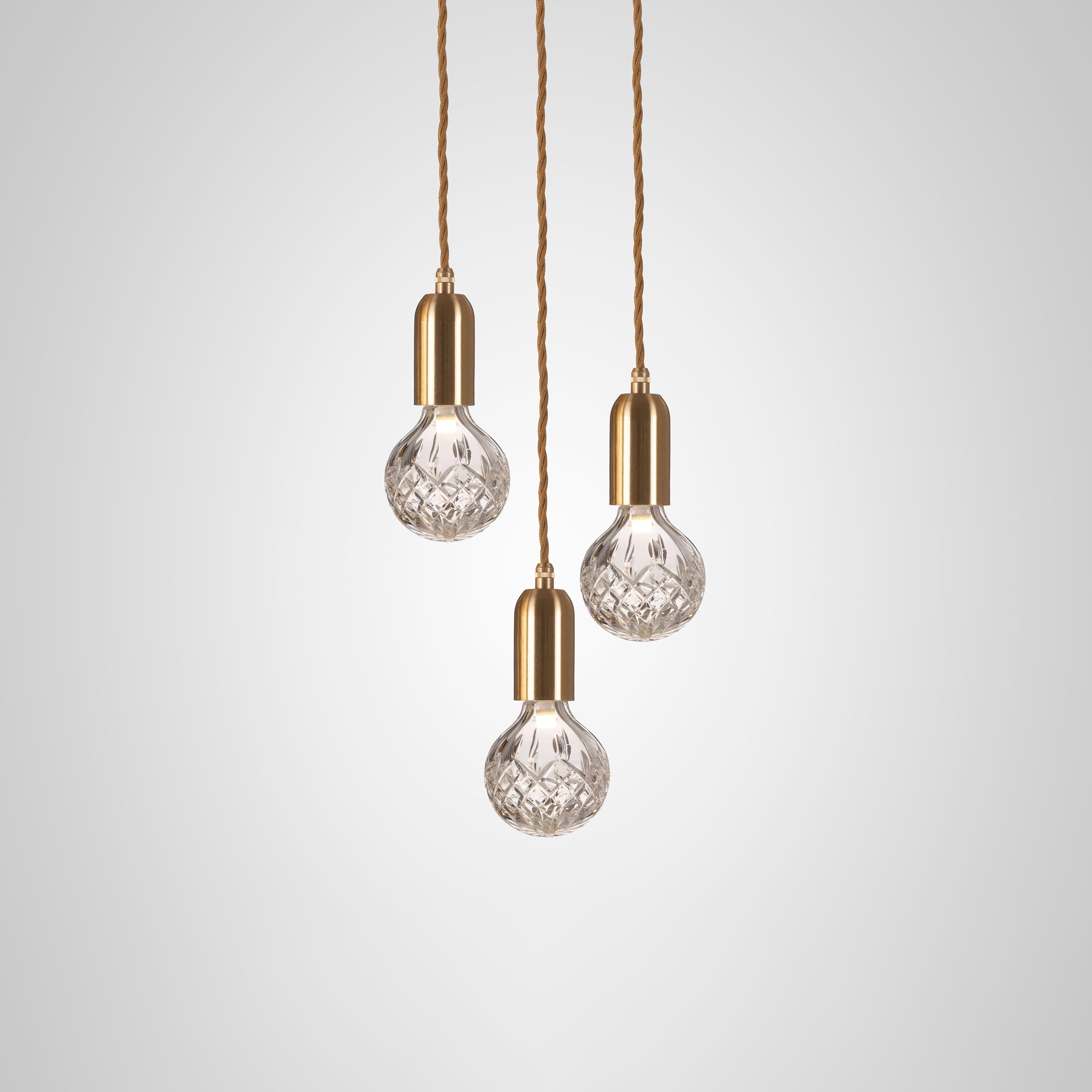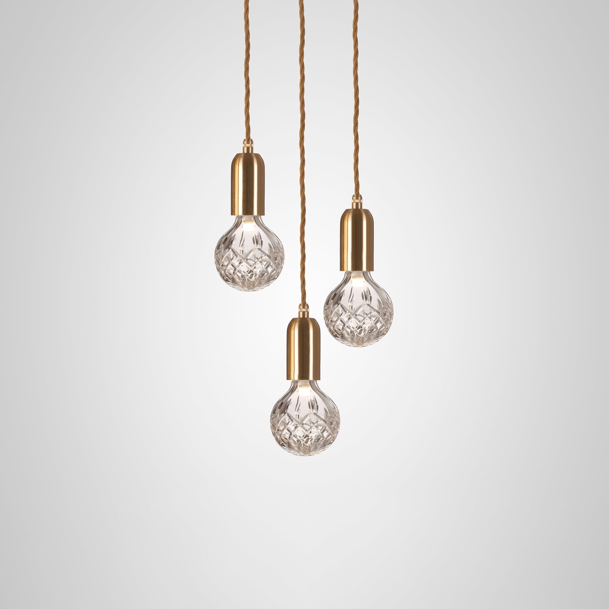 Individual pendants are suspended at graduated lengths from a satin white ceiling plate in a masterstroke of luxe luminosity. Like his initial single Crystal Bulb, the lights are handcrafted using traditional techniques, each hand cut with a crystal pattern inspired by those found on vintage whiskey glasses and decanters.