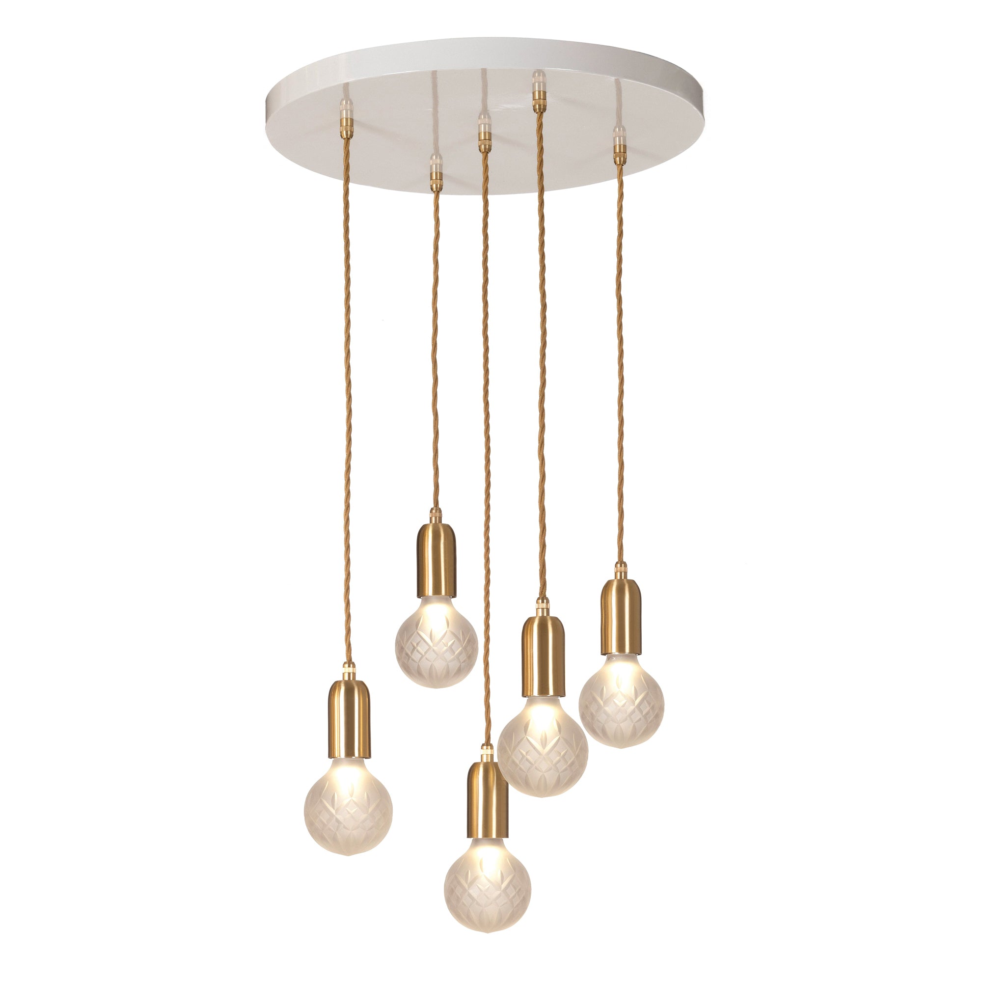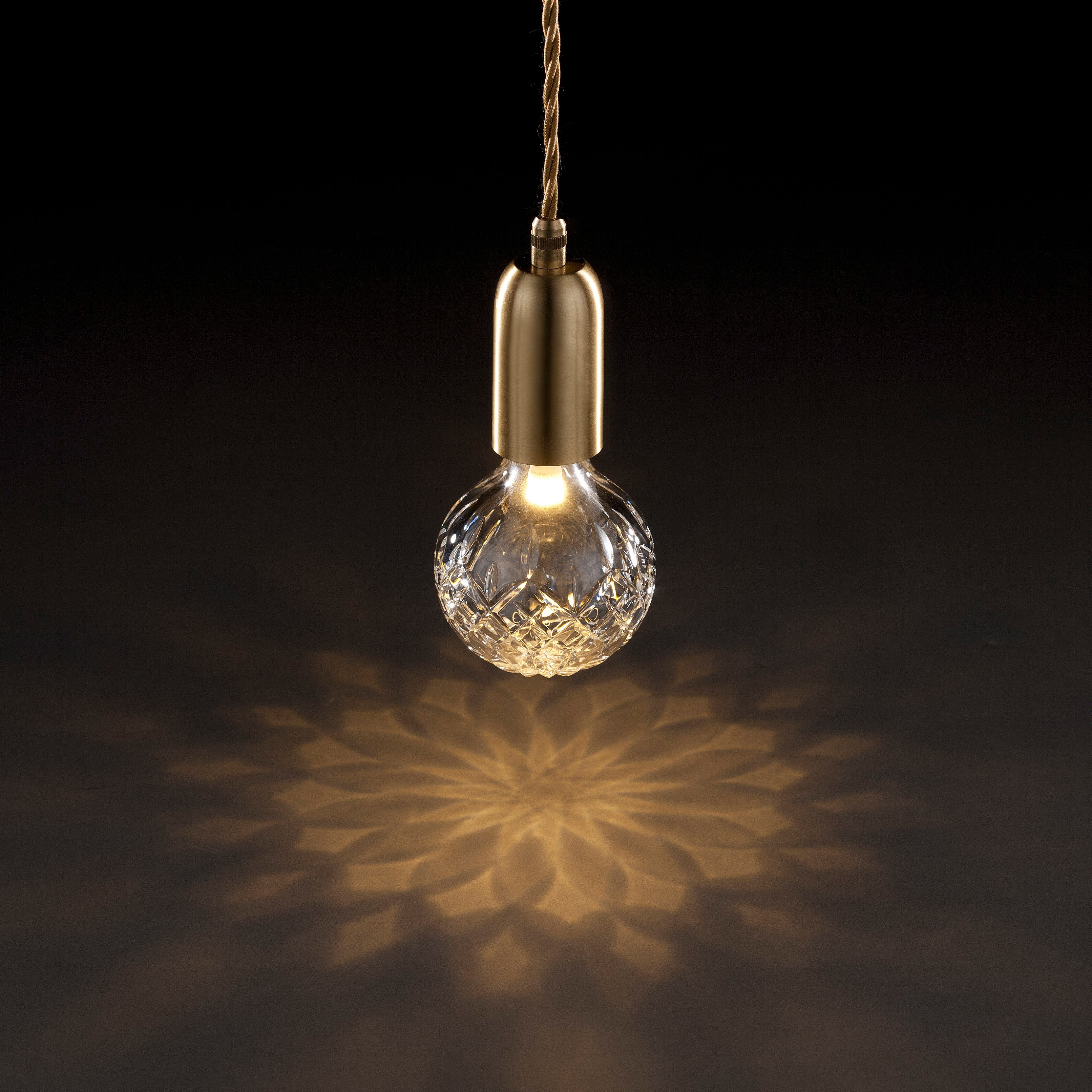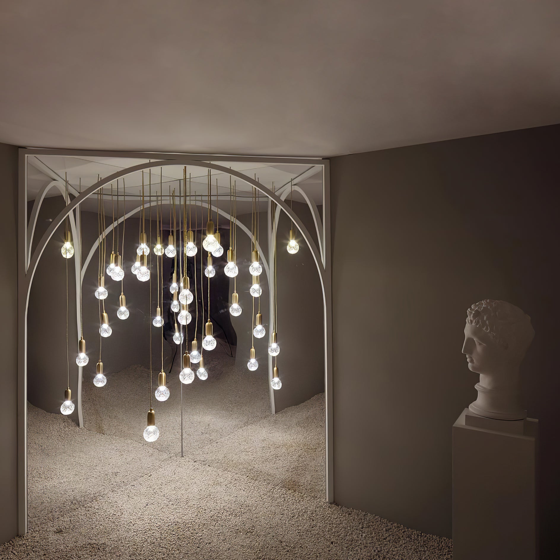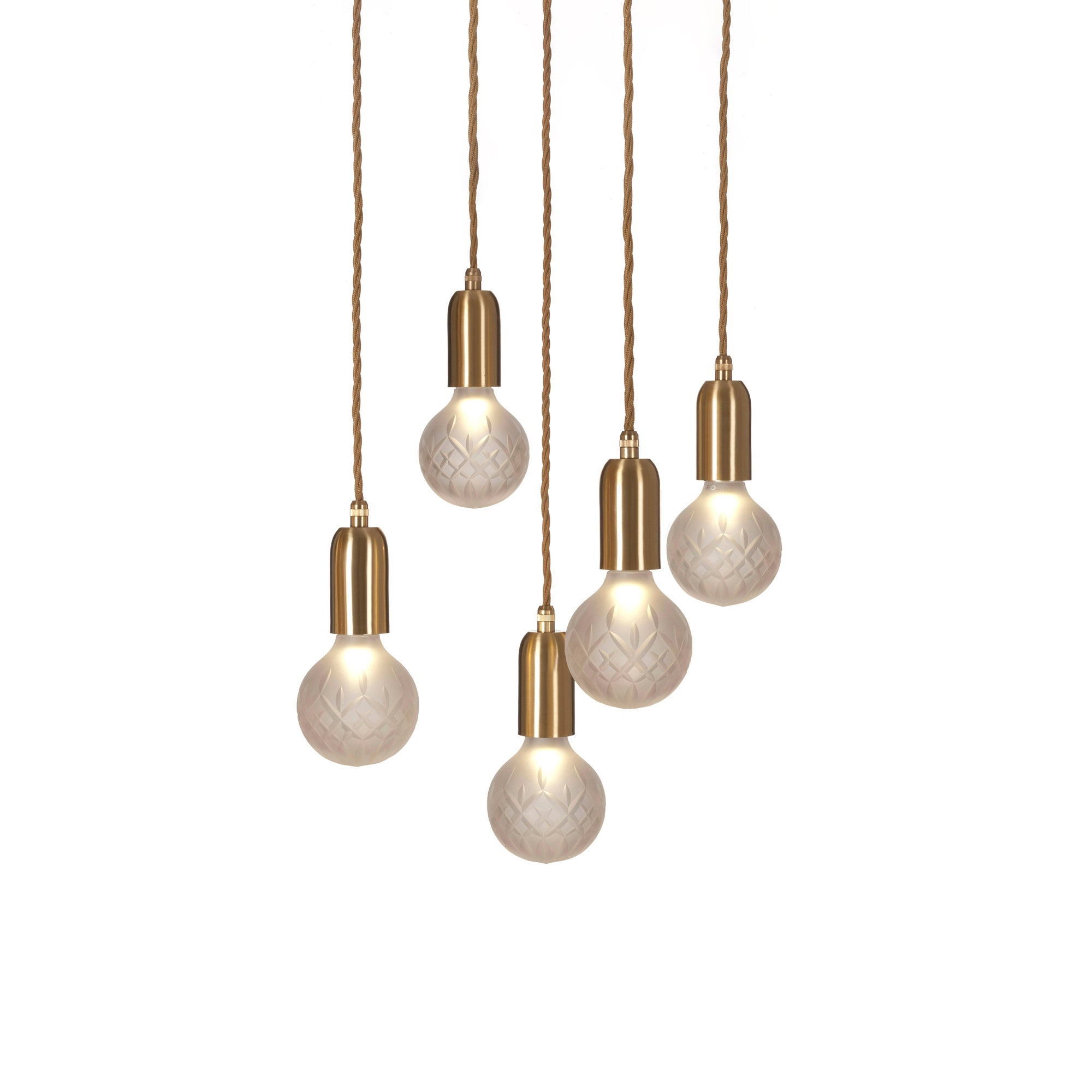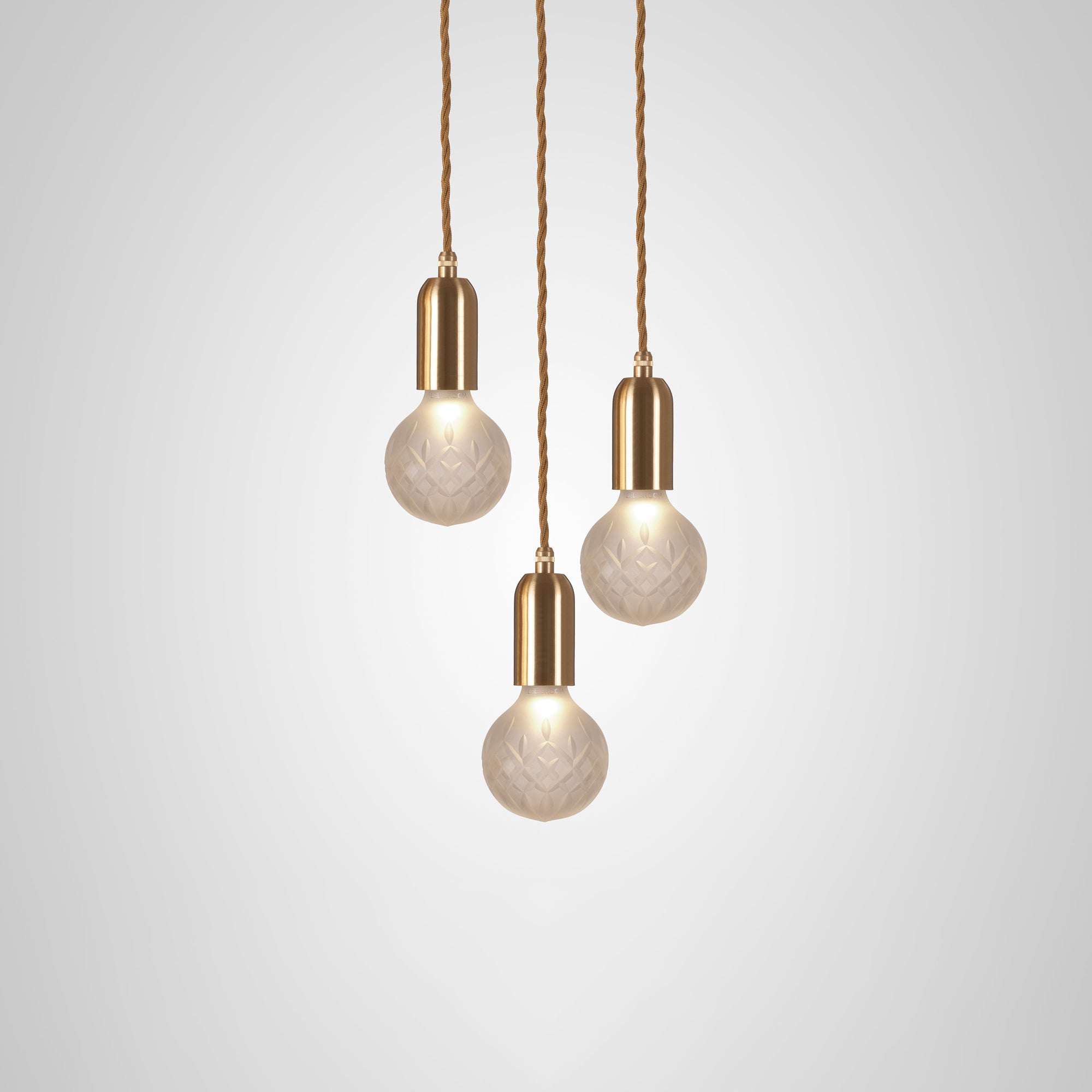 Individual pendants are suspended at graduated lengths from a satin white ceiling plate in a masterstroke of luxe luminosity. Like his initial single Crystal Bulb, the lights are handcrafted using traditional techniques, each hand cut with a crystal pattern inspired by those found on vintage whiskey glasses and decanters.