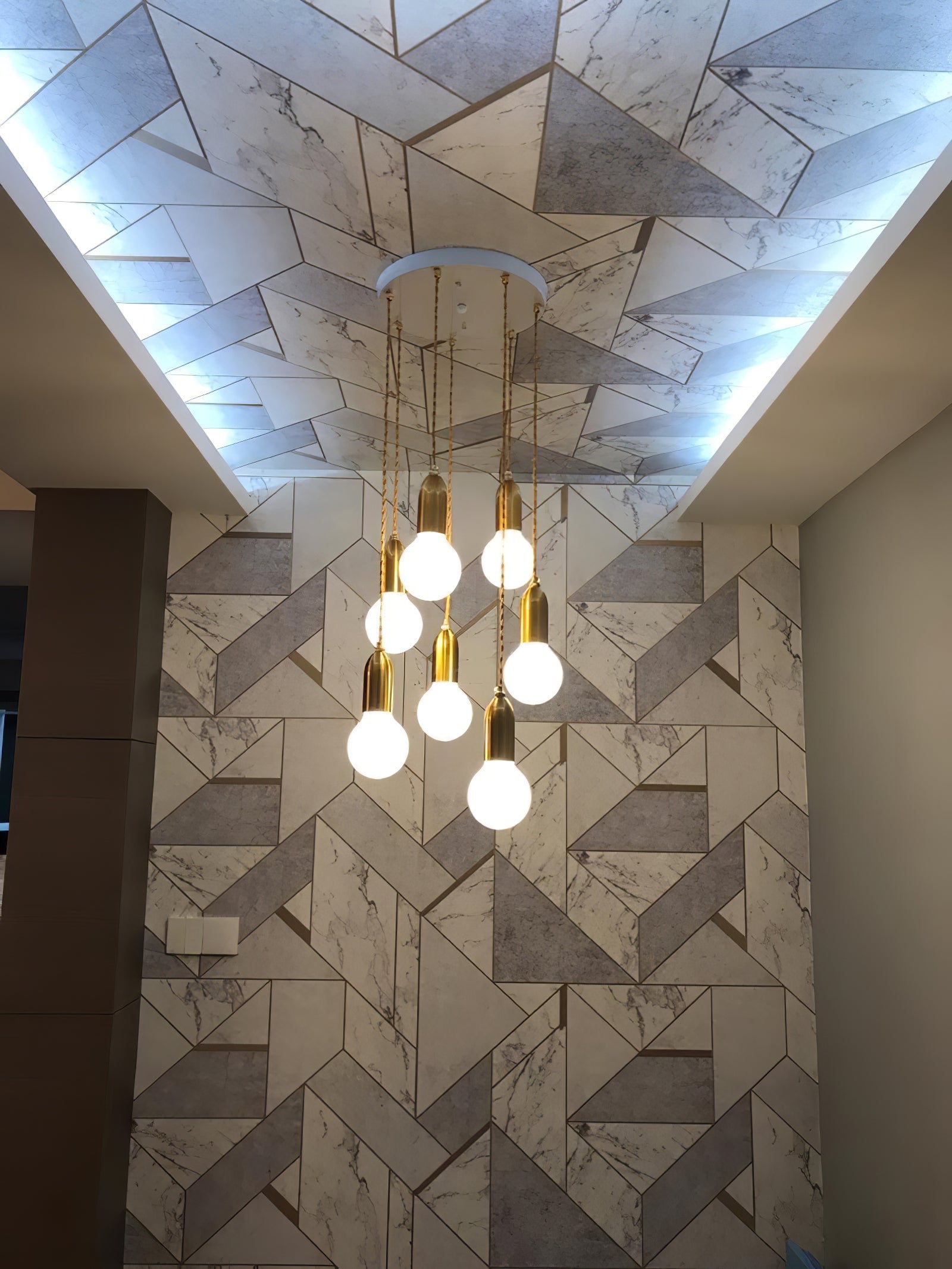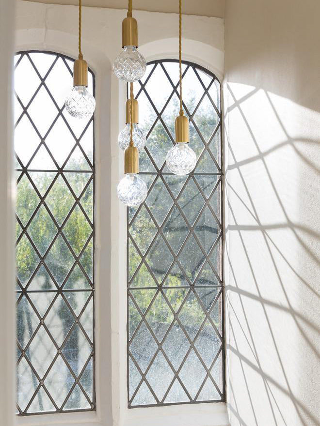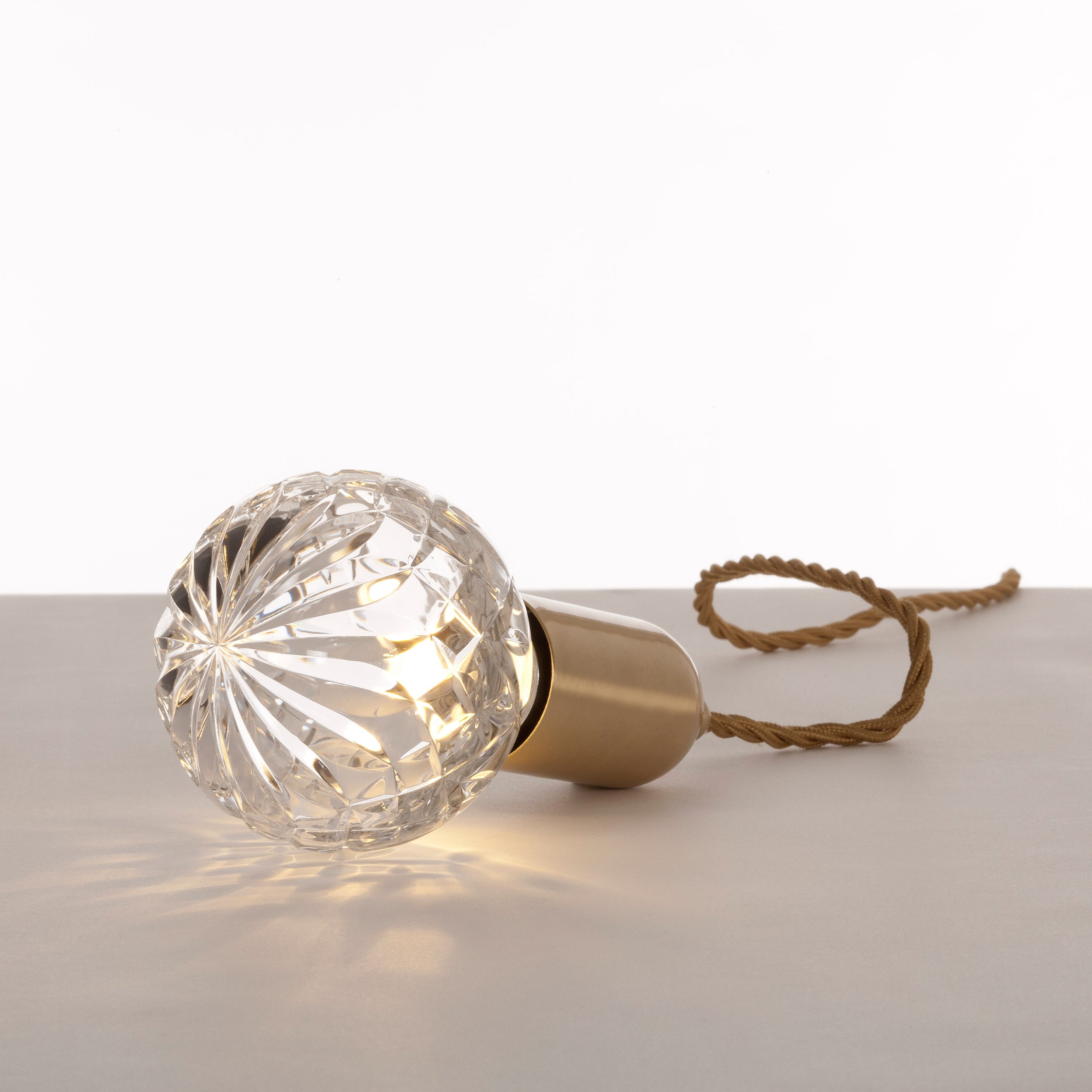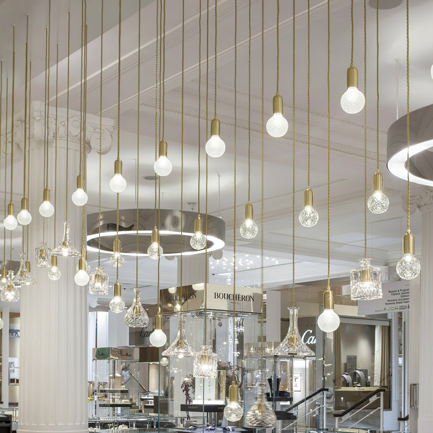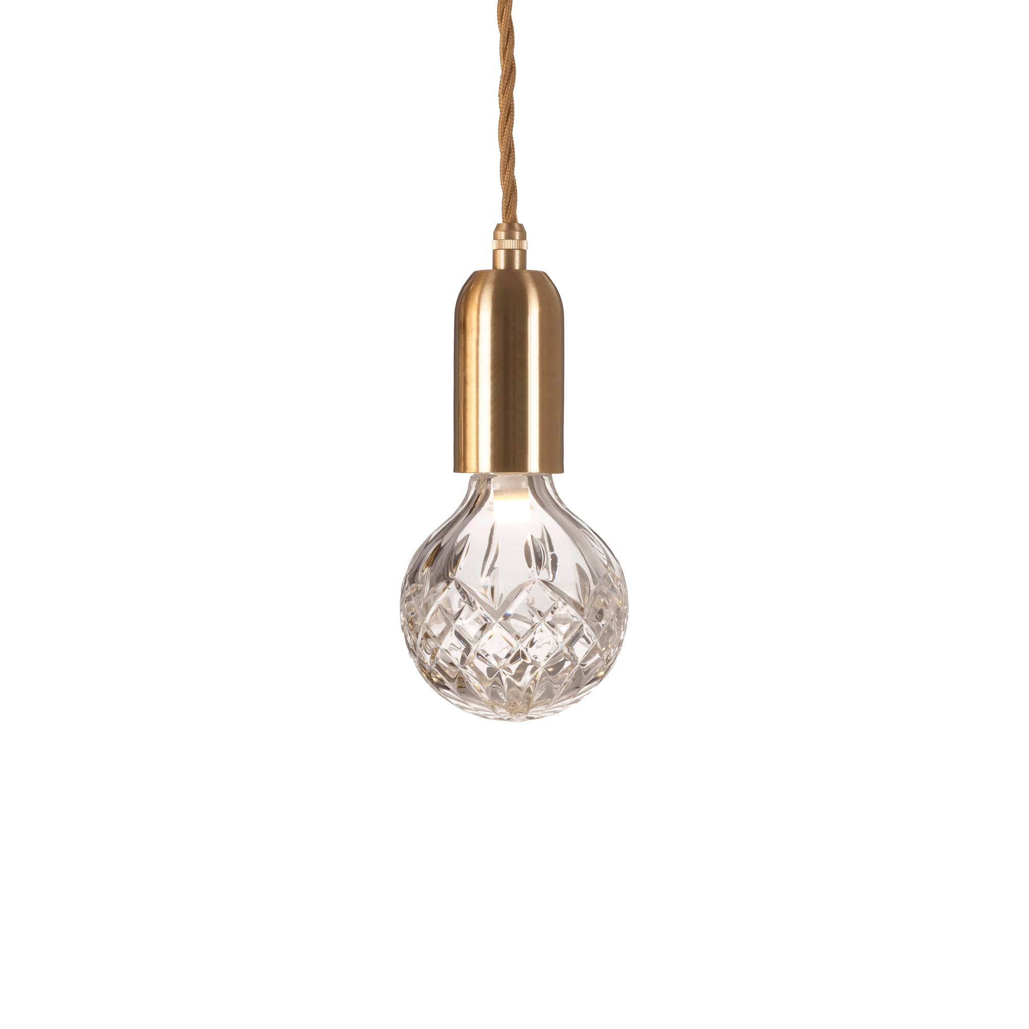 Individual pendants are suspended at graduated lengths from a satin white ceiling plate in a masterstroke of luxe luminosity. Like his initial single Crystal Bulb, the lights are handcrafted using traditional techniques, each hand cut with a crystal pattern inspired by those found on vintage whiskey glasses and decanters.