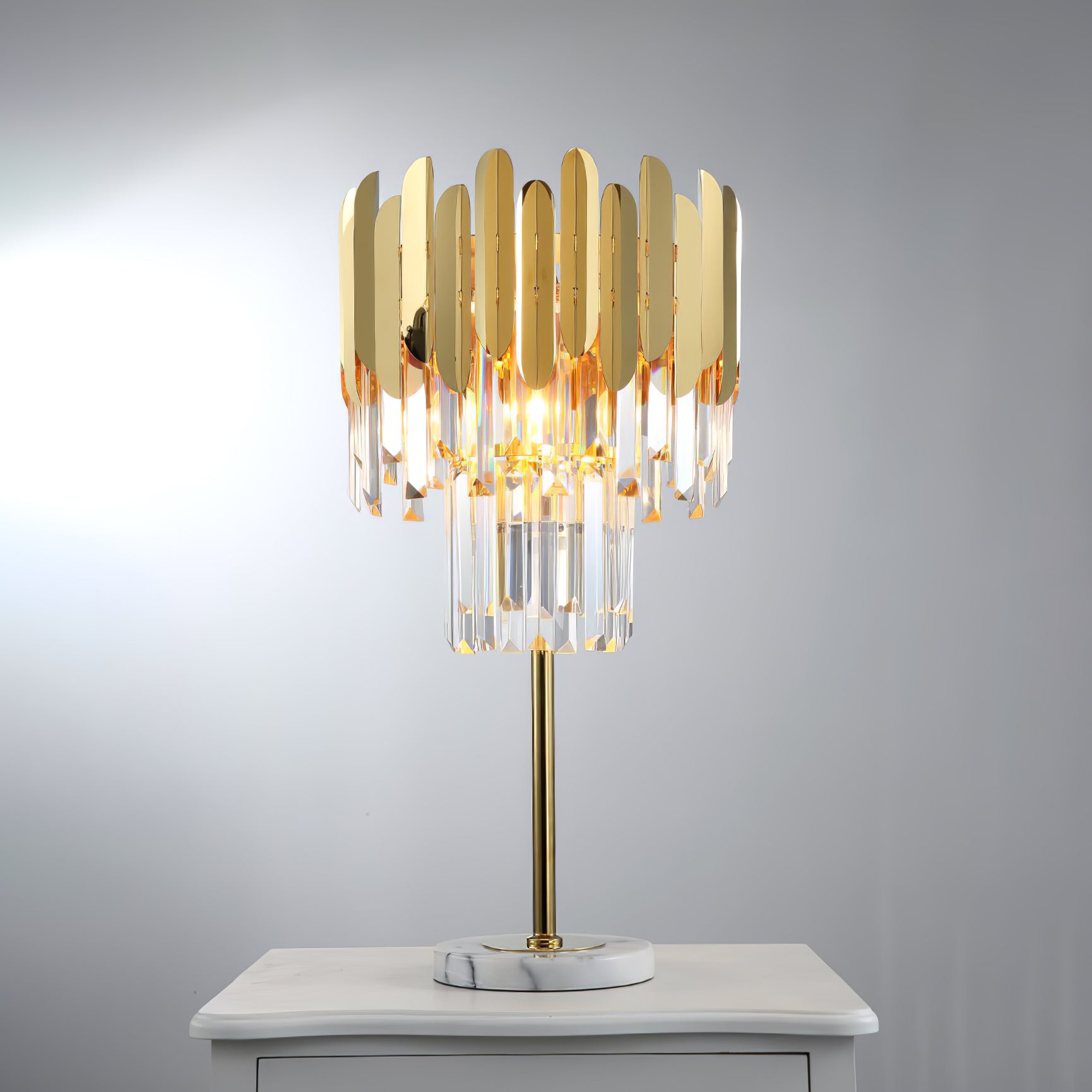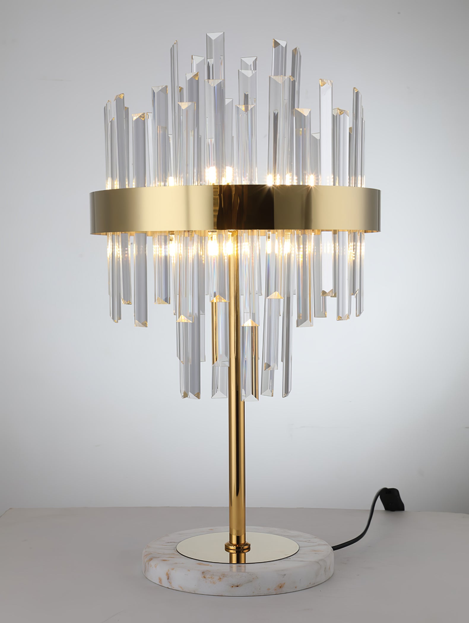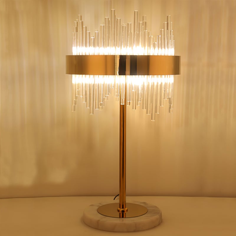 Bring a touch of luxury and unique charisma to your indoor living area with this table lamp of crystal bars. Adorned with a brass-plated stainless plate on the exterior, this fixture is creatively designed with clear crystal bars suspended inside, which boasts excellent transmittance and can produce impressive lighting effects.