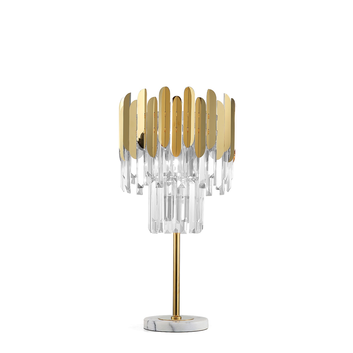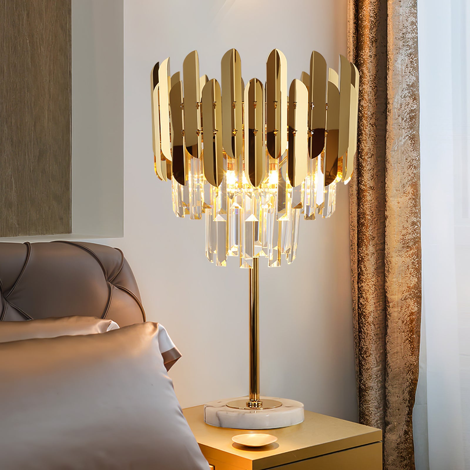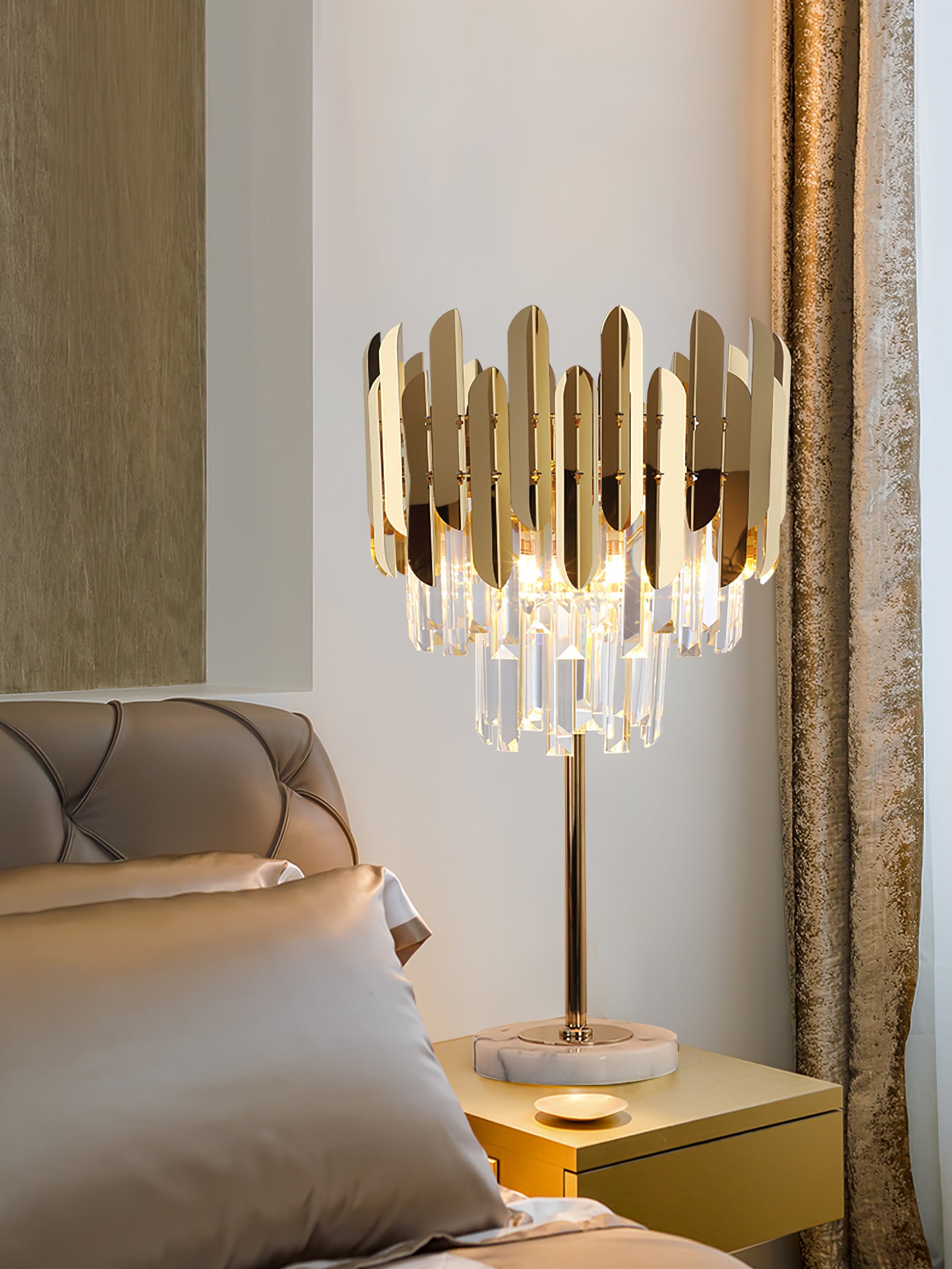 Stainless steel and K9 crystal lamp body: Hand-processed K9 crystal lamp body, crystal clear, plus the effect of golden stainless steel, immediately full of quality. Marble base, smooth texture, stylish and generous, and durable. Modern style creative metal table lamp, fine workmanship, exquisite decoration, energy saving, and durability.