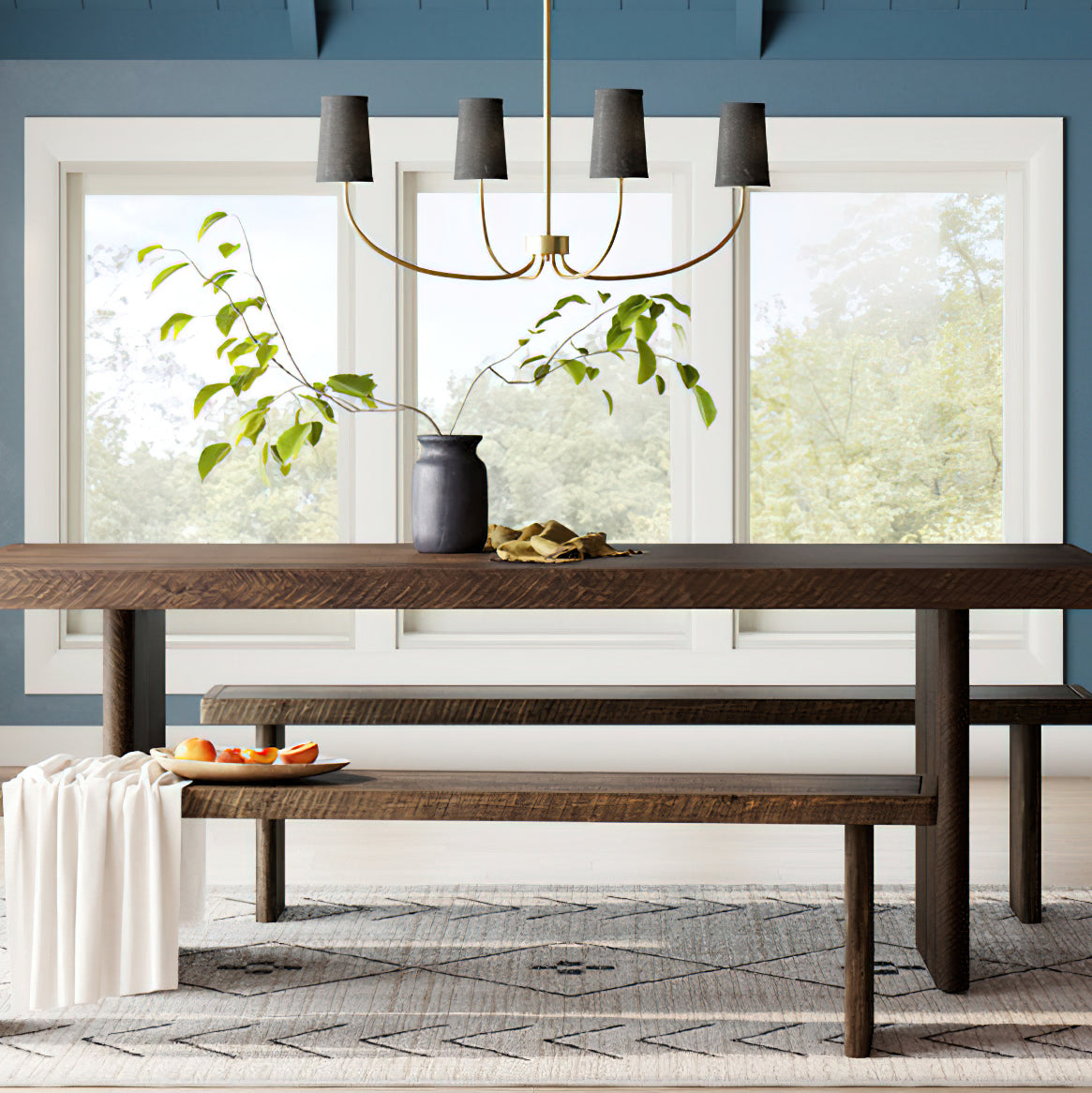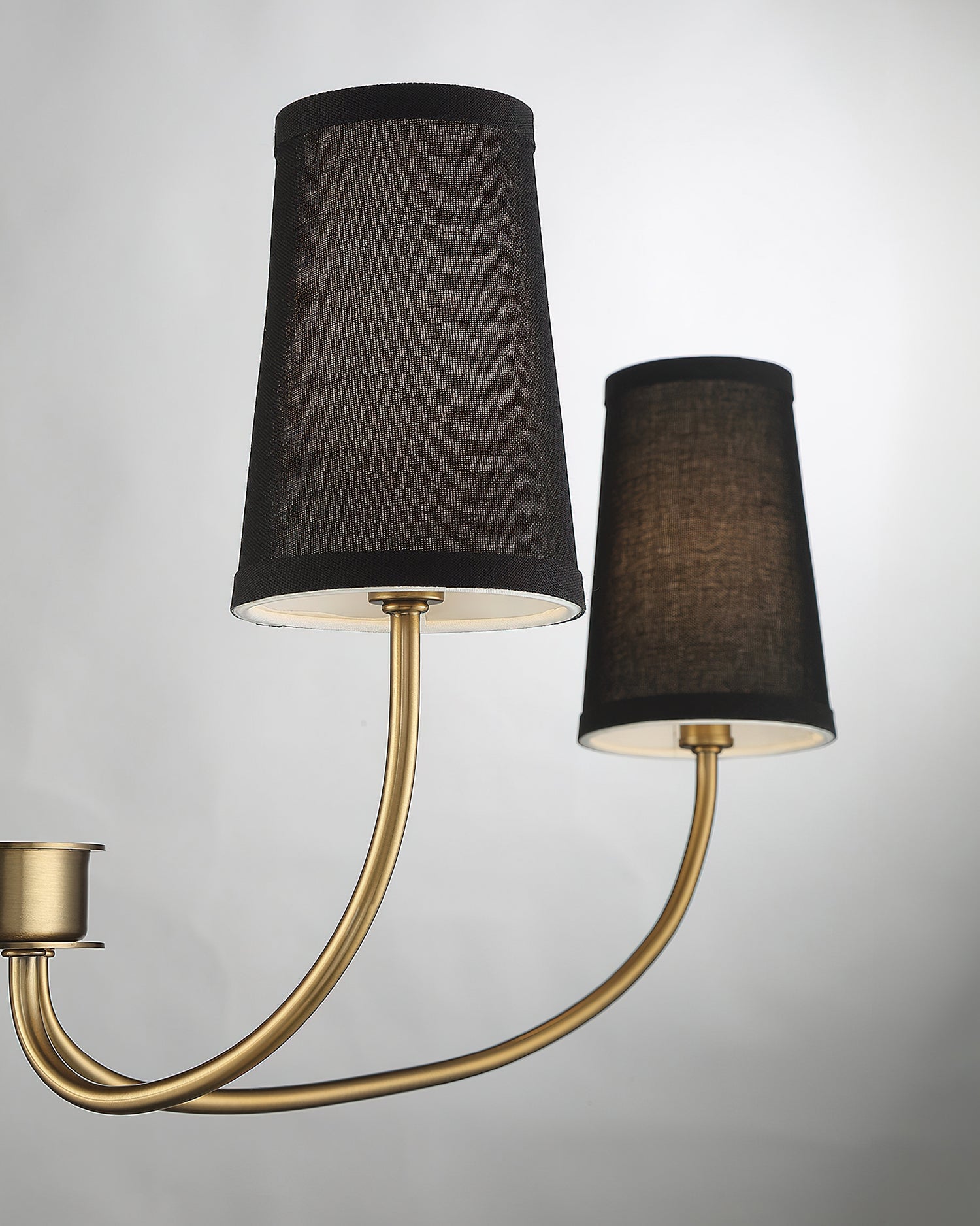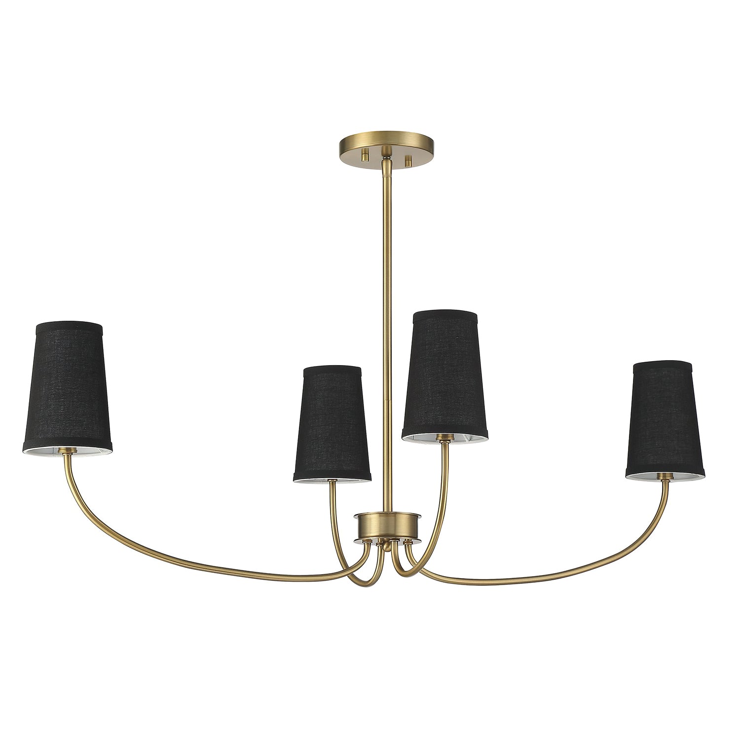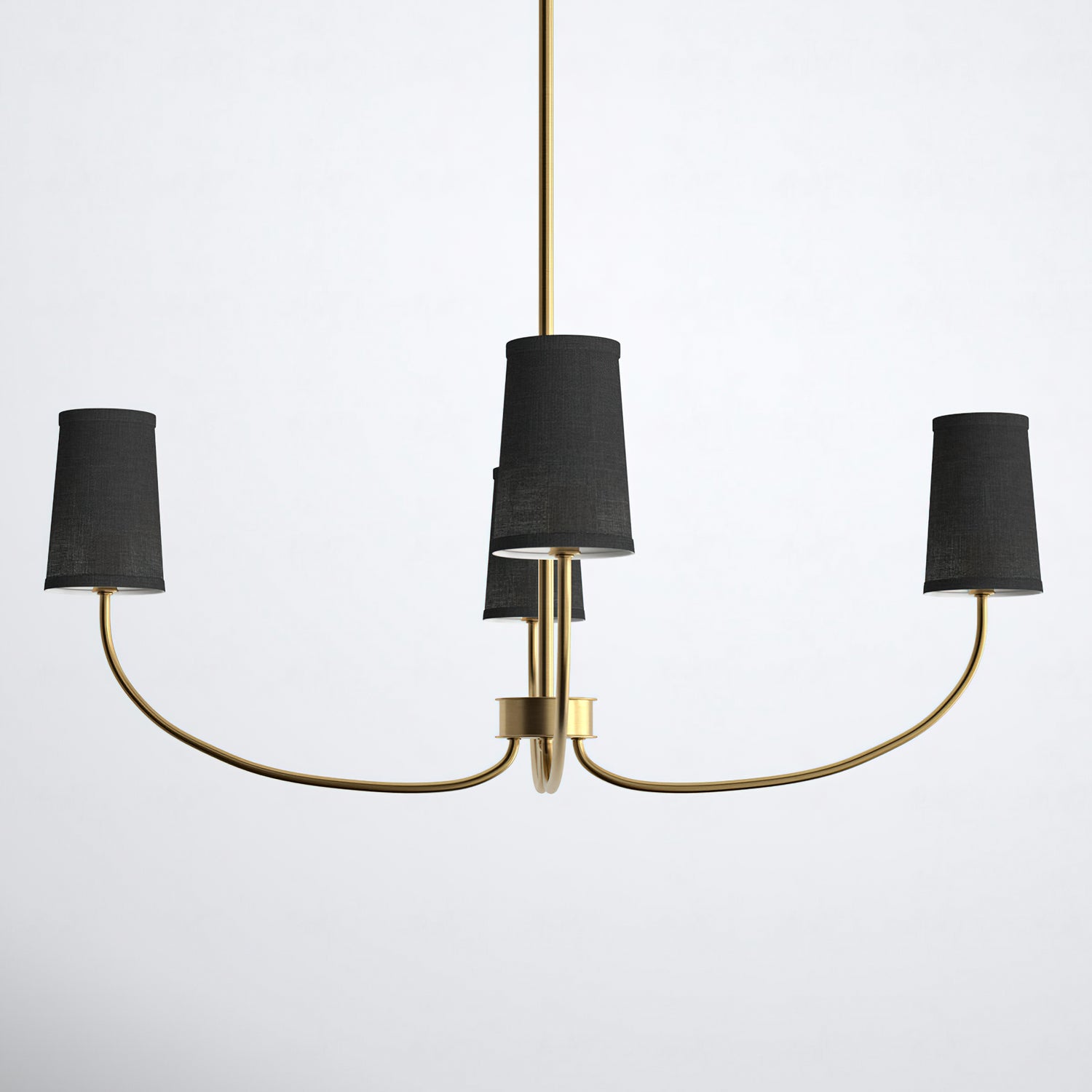 The four-light Dainolite Chandelier by Mooijane, crafted from natural brass, brings mid-century modern style to life. The curved arms contrast with the bold black fabric tapered shade, creating a sophisticated two-tone aesthetic. This makes it a versatile addition to any dining room, living room, or any area that needs a finishing touch that balances elegance and practicality.